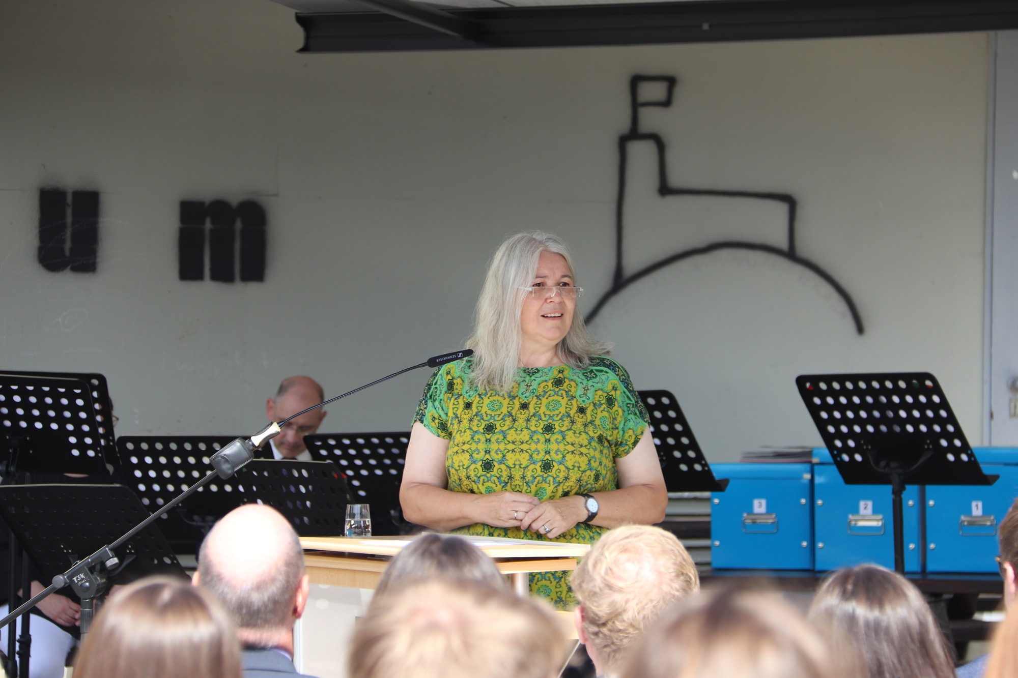 Frau Kremmelbein als Vertreterin der Lehrkräfte nahm in ihrer emotionalen Rede ein Zitat des schottischen Schriftstellers Robert Louis Stevenson als Ausgangspunkt: „Keine Pflicht wird so sehr vernachlässigt, wie die Pflicht, glücklich und zufrieden zu sein.” Sie lud die Zuhörer*innen ein, wie sie es in ihrem Englisch-Leistungskurs viele Male tat, die tiefere Bedeutung des Zitats zu erkunden: „Dive deeper.“ Das Wort „Pflicht“ nahm sie zum Anlass, über die Pflichten der Absolvent*innen zu sinnieren, etwa die Pflicht, den Eltern ein gutes Kind zu sein, für Freunde da zu sein und gute schulische Leistungen zu erbringen. Diese Pflichten mussten sie erfüllen, und dies trotz der Herausforderungen der vergangenen Jahre – nicht zuletzt Corona mit mehrfachen Lockdowns und den damit verbundenen technischen und logistischen Hürden. Diese Zeit habe den Schüler*innen ein hohes Maß an Selbstständigkeit abverlangt, was bei „normalen“ Jahrgängen weniger ausgeprägt gewesen sei. Und Frau Kremmelbein betonte, dass der zweite Teil des Zitats ab nun besondere Beachtung verdiene: Nach dem großen Leistungsdruck, dem sich viele ausgesetzt hätten, sei es nun an der Zeit, sich von dem Druck zu lösen und herauszufinden, was wirklich glücklich mache. „Seid mutig! Traut euch, vom Weg abzukommen, denn ihr habt durch die letzten acht Jahre gelernt, mit Unwegsamkeiten zurecht zu kommen und am Ende wieder einen Weg zu finden – wenn auch vielleicht nicht den, an den ihr im Ursprung gedacht hattet.“ Sie schloss mit ein paar wertvollen Ratschlägen und dem Wunsch, die Abiturient*innen in Zukunft wieder zu sehen – ganz gleich ob als Ärztinnen, Manager oder Eltern, aber ganz bestimmt glücklich.