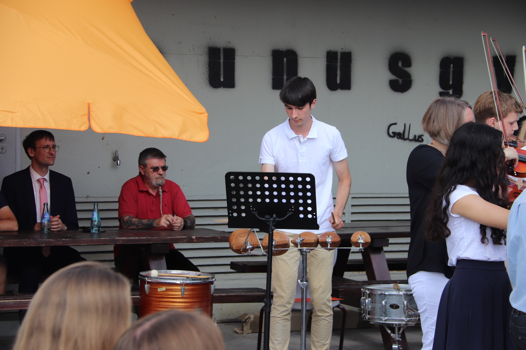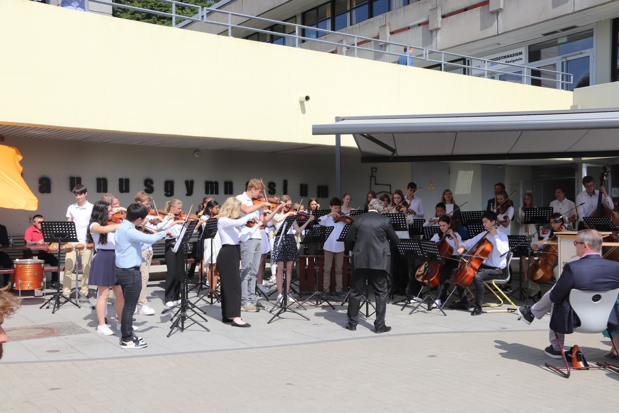 Das Orchester füllte den Schulhof mit den erhabenen Klängen von Richard Wagners „Einzug der Gäste“ aus „Tannhäuser“, bevor Herr Klempert, Vertreter des Fördervereins der Ehemaligen und Förderer des Taunusgymnasiums (BEFT), sein Grußwort an die Abiturient*innen richtete.