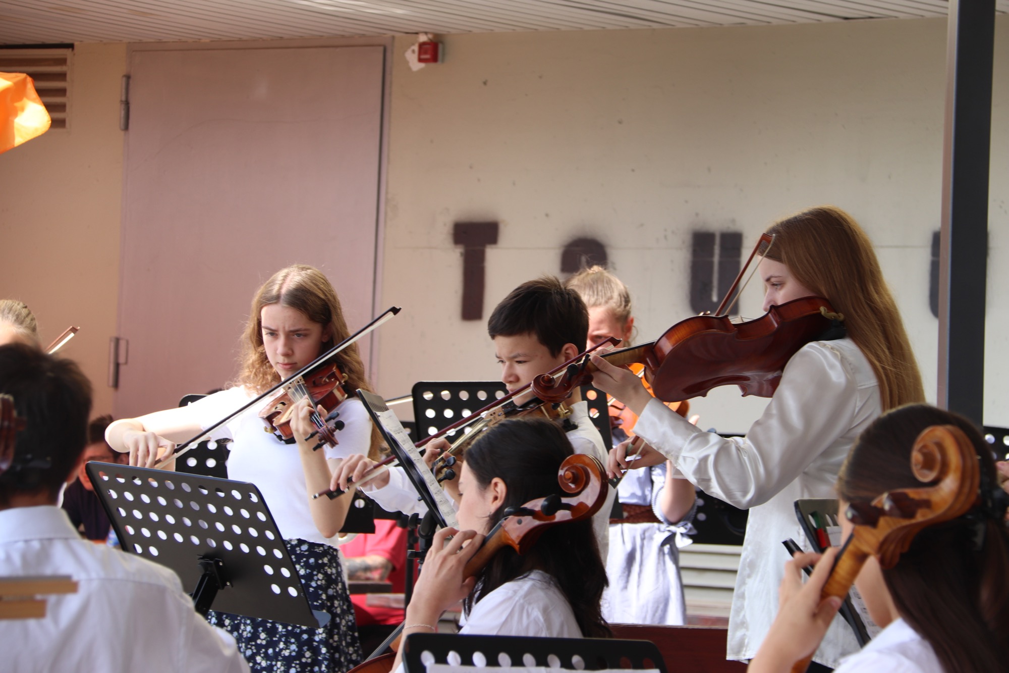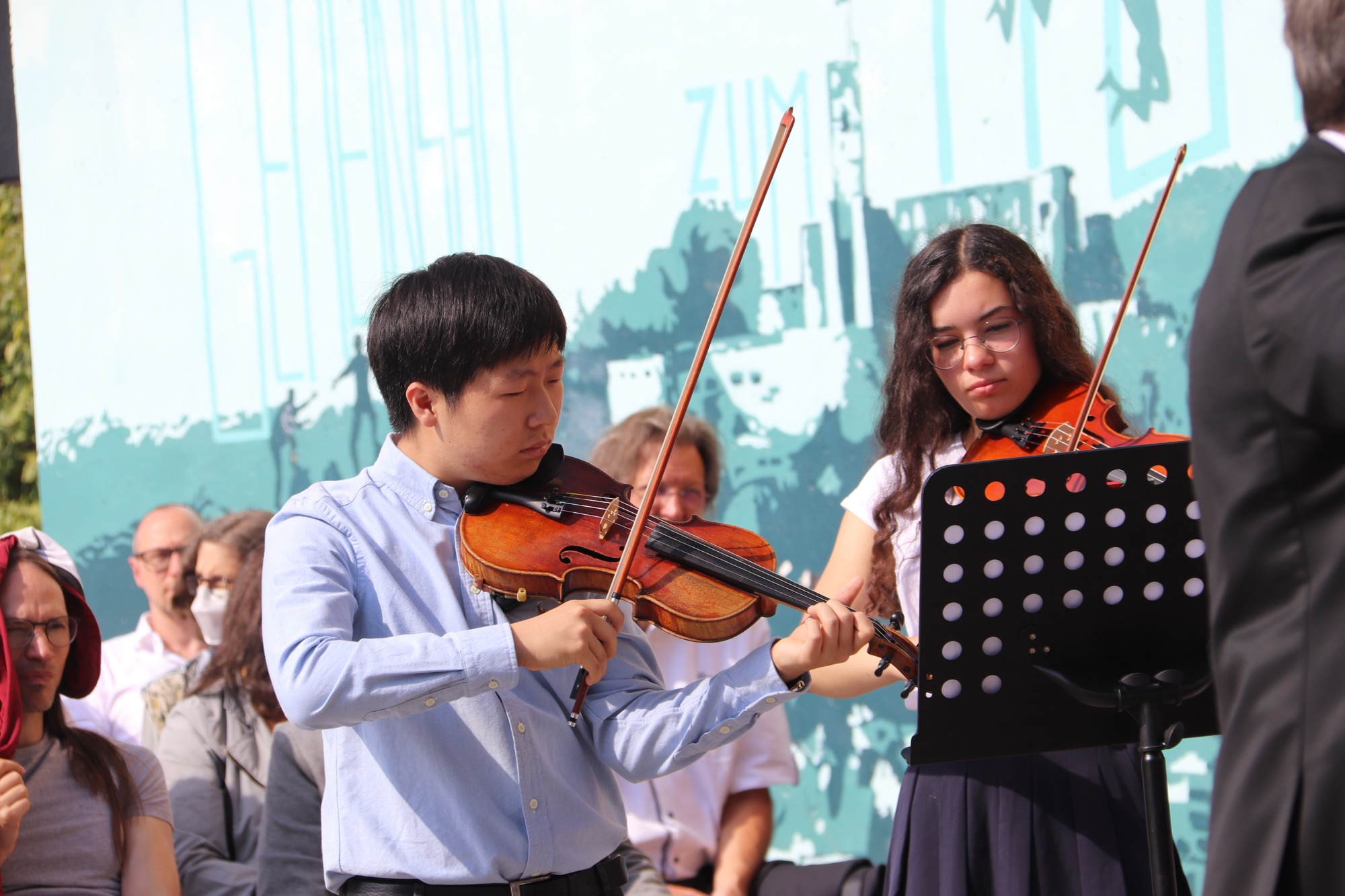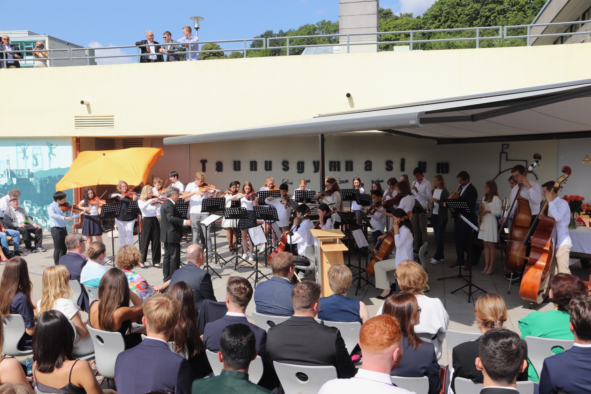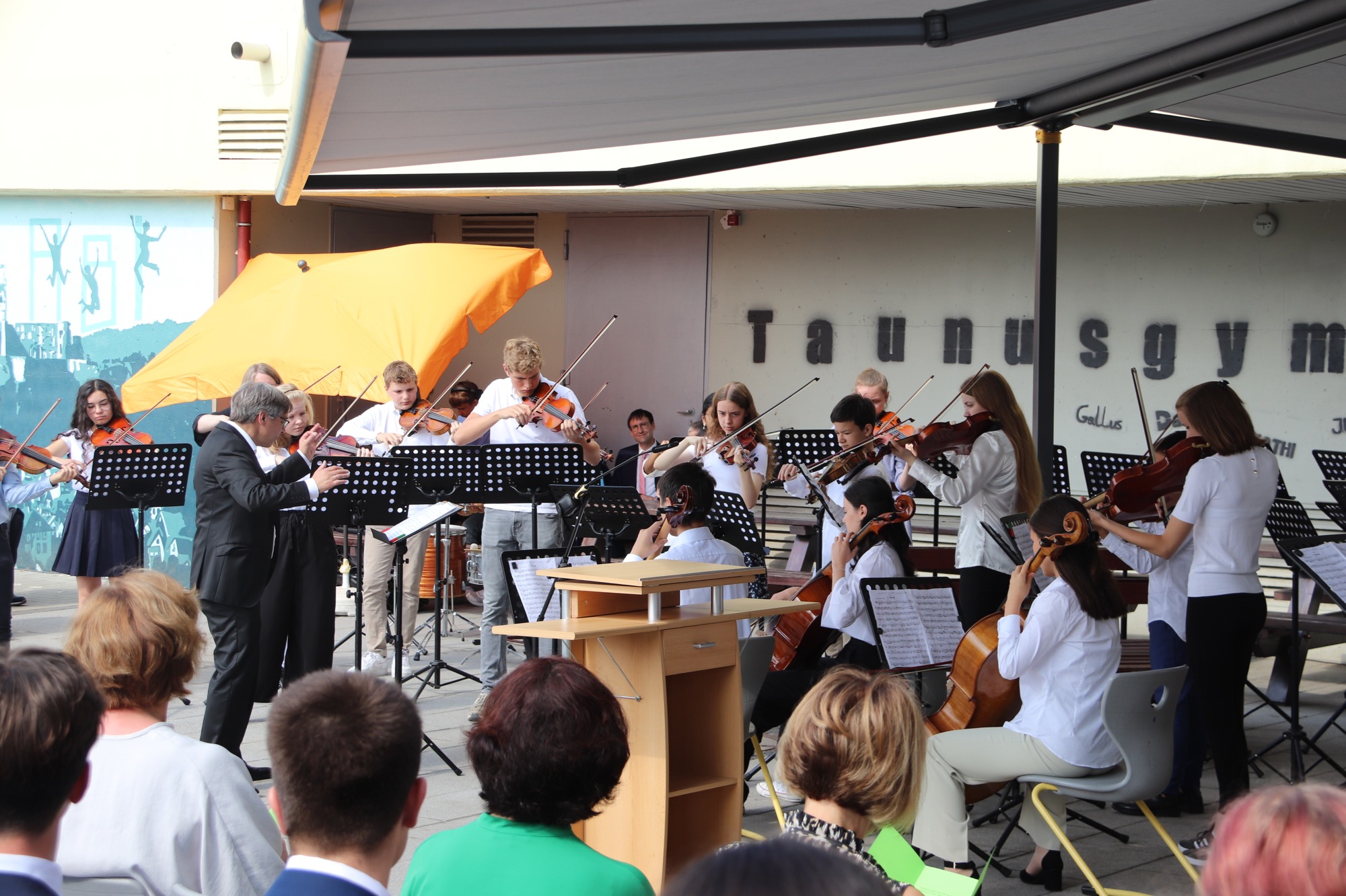 Für den musikalischen Rahmen sorgte das Orchester des Taunusgymnasiums, das seit kurzem wieder probt und dem Festakt mit schwelgerischen Klängen akustische Glanzpunkte verlieh – zu Beginn mit dem 4. Satz aus der „Serenade for String Orchestra” von Norman Leyden.