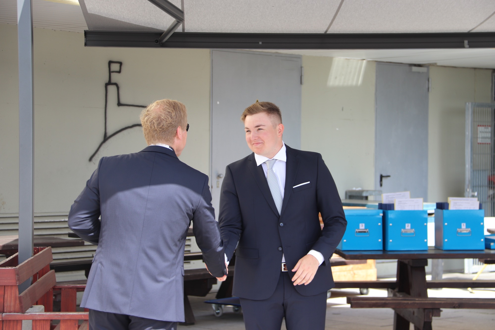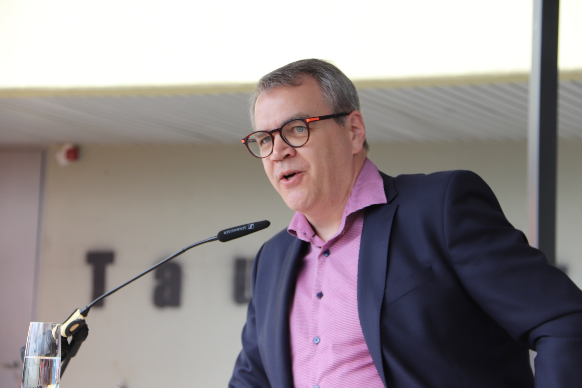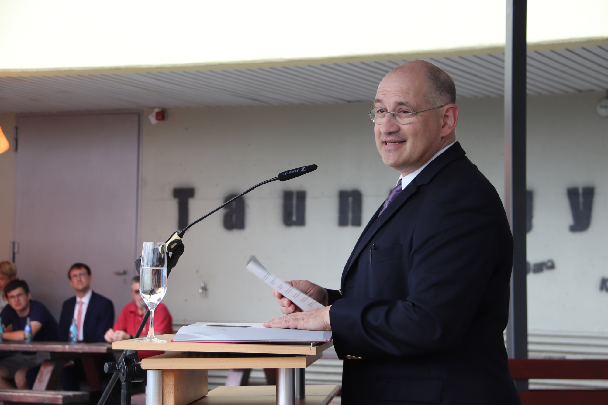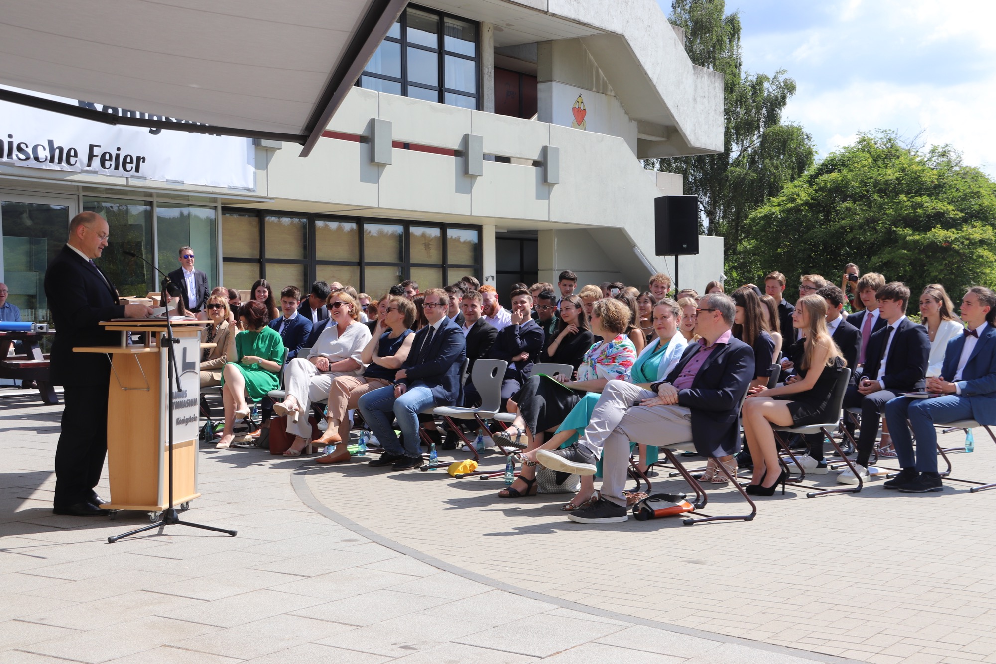 In seiner Ansprache brillierte Herr Veltjens, Studienleiter des Taunusgymnasiums, mit fußballerischen Anspielungen und Metaphern – hatte er doch den Schüler*innen des Jahrgangs versprochen, im Nachgang des sensationellen Eintracht-Erfolgs eine „Fußball-Rede“ zu halten.