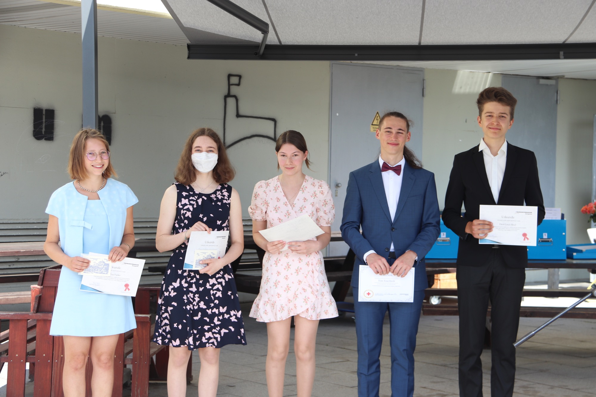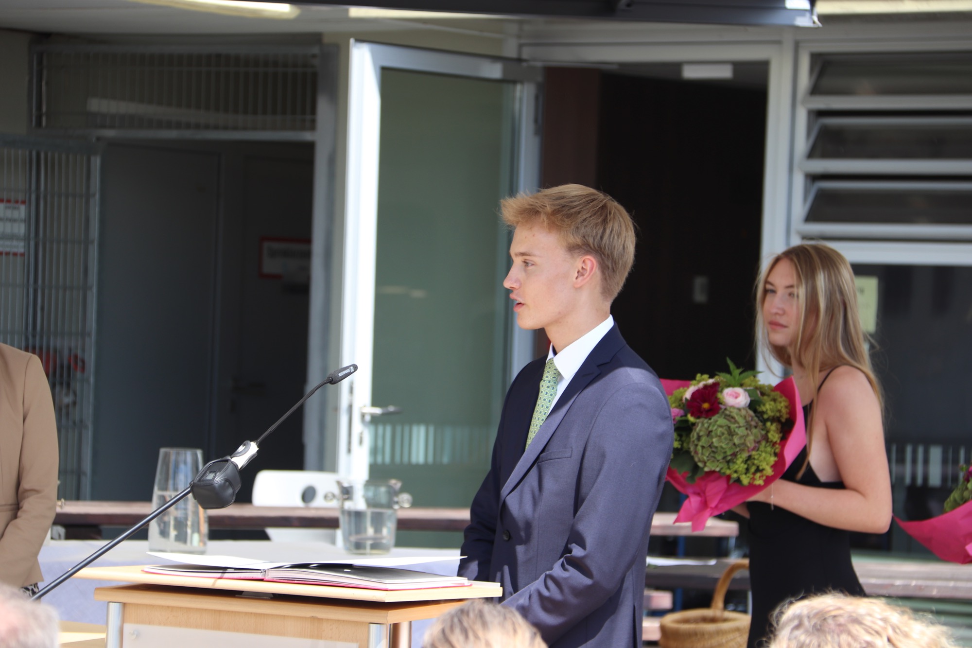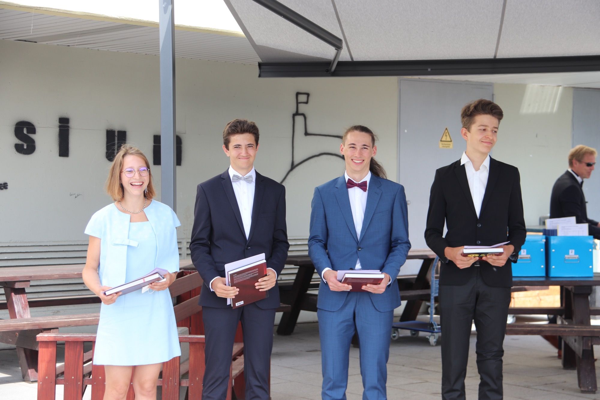 Anschließend wurden sozial engagierte Schüler*innen gewürdigt, die beim Entwicklungshilfeprojekt Amguri, in der Lehrmittel-Bücherei und beim Sanitätsdienst mitwirkten. Der alljährliche Dieter-Behrend-Preis für gesellschaftliches und politisches Engagement ging an Basel Arif, der sich durch sein kritisches Denken und sein verlässliches Engagement auszeichnete. Und auch besondere akademische Leistungen wurden gewürdigt. Drei des kleinen Jahrgangs erreichten die Traumnote 1,0: Éua Funke, Helena von Hörsten und Tom Eiserbeck. Sie erhielten eine besondere Ehrung und einen hochverdienten Applaus.