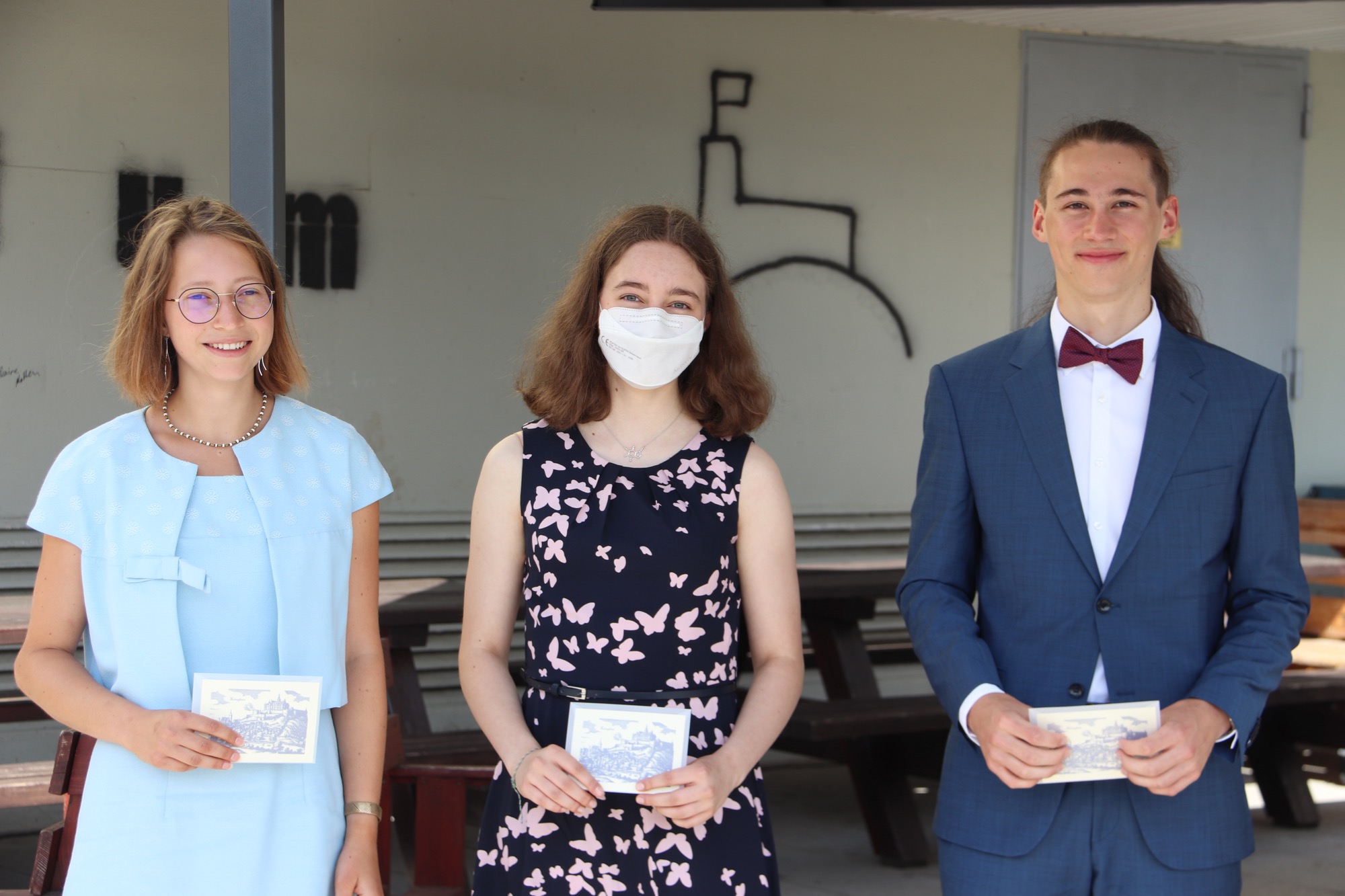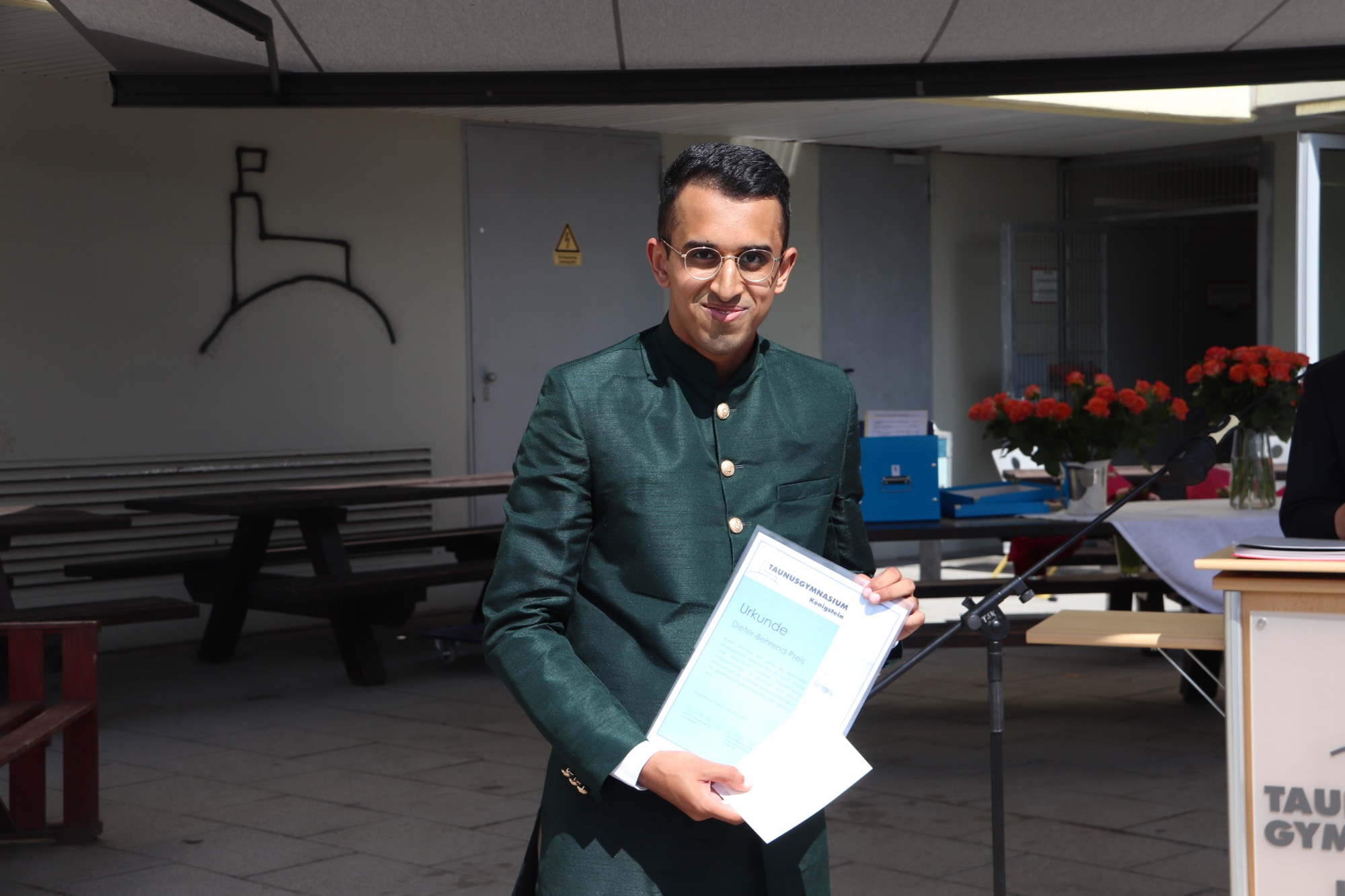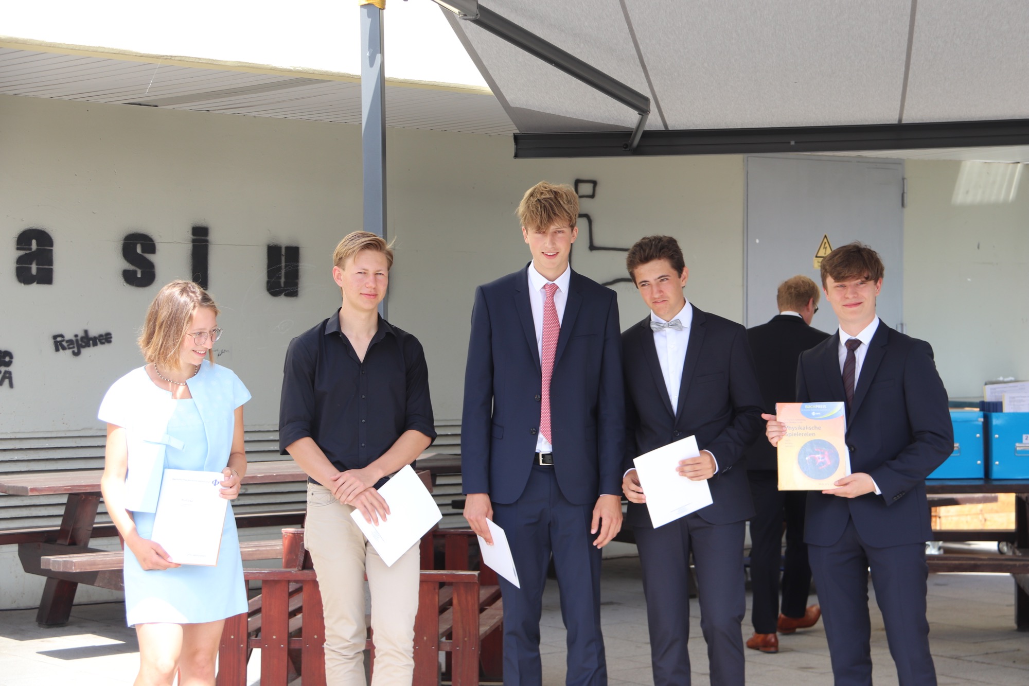 Und dann ging es an die Ehrungen. Als MINT-Schule ist das Taunusgymnasium stolz auf seine Leistungen in den Naturwissenschaften. Und so wurden herausragende Abiturient*innen auf diesem Gebiet ausgezeichnet – mit dem Preis der Deutschen Mathematischen Vereinigung, dem Preis der Gesellschaft deutscher Chemiker und dem Preis der Deutschen Physikalischen Gesellschaft.