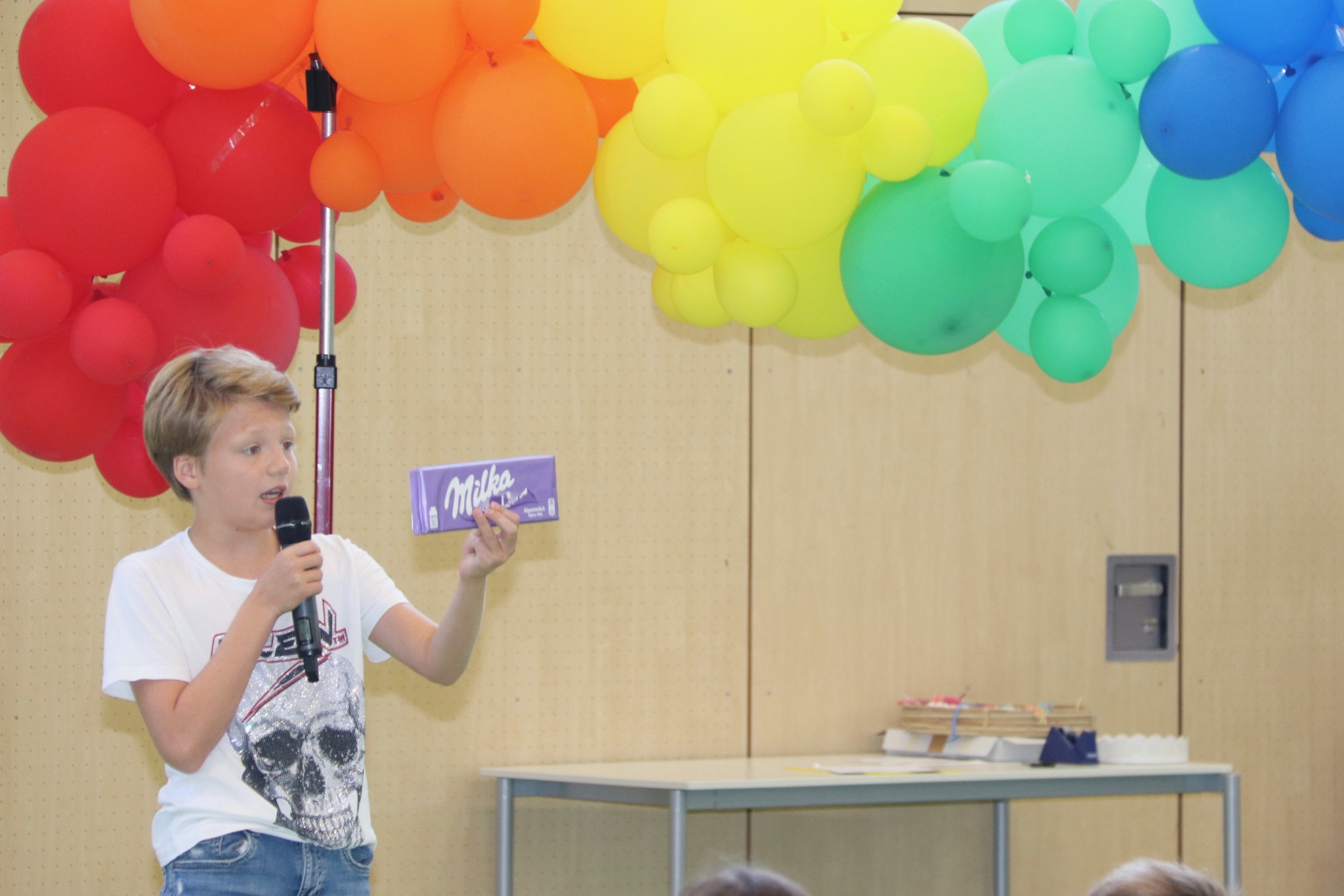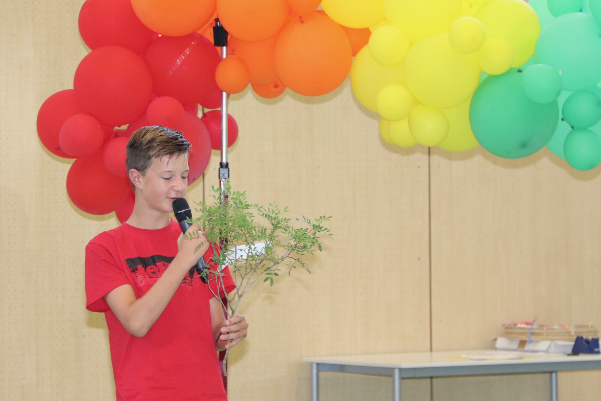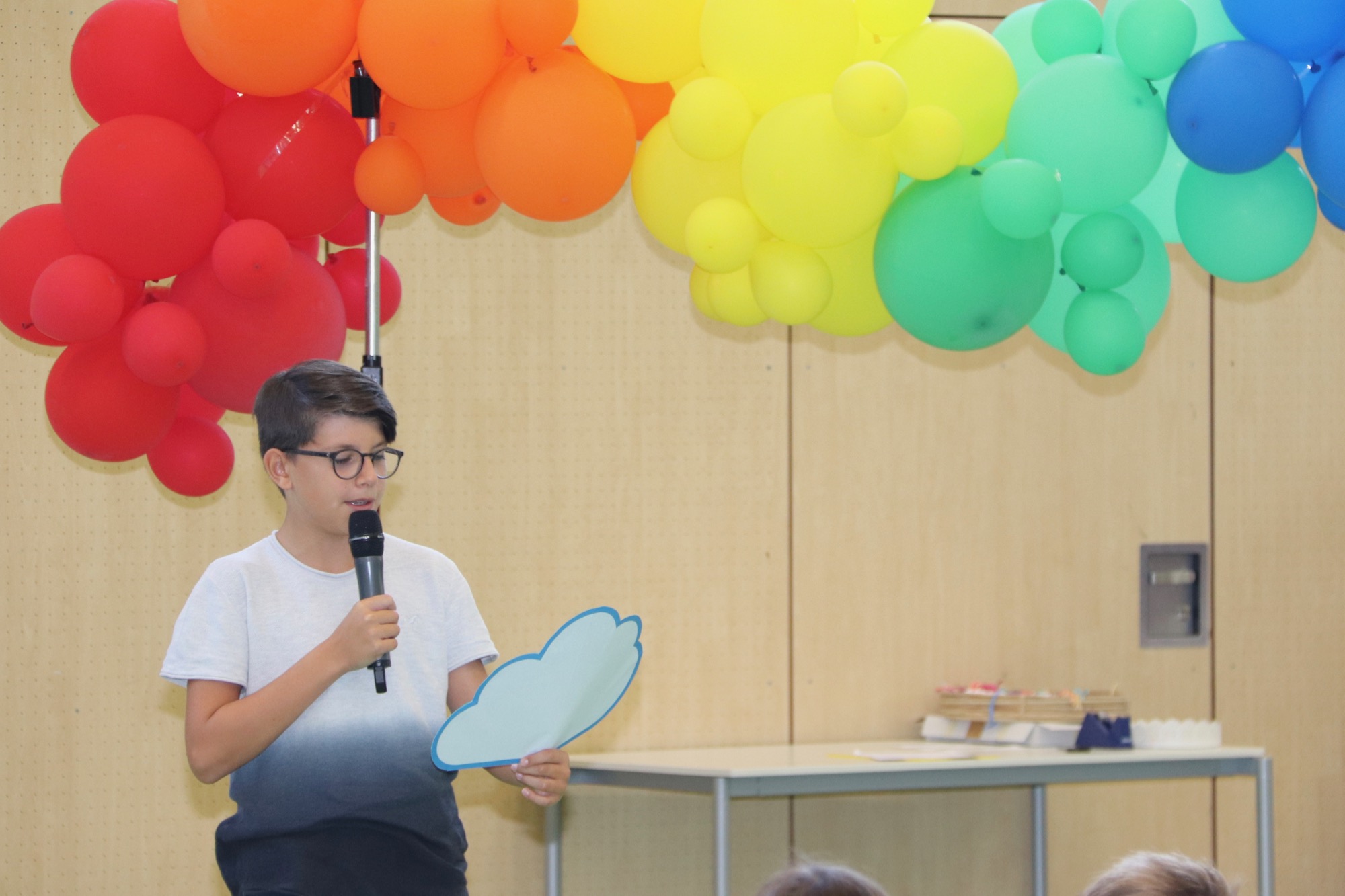 Beim ökumenischen Gottesdienst, der von Herrn Weckler geleitet und zusammen mit Frau Antony vorbereitet worden war, stand das Symbol des Regenbogens im Mittelpunkt. Die Vielfalt der Menschen am Gymnasium wurde dabei besonders betont. Bei der Lesung kam zudem Noah zur Sprache, an dessen Bund mit Gott ein Regenbogen erinnern soll. Die Farben des Regenbogens erweckten Sechstklässler in Bezug auf die Schule zum Leben – etwa mit dem Symbol eines dunkelblauen Bandes, das für die neuen Freundschaften stehe, die die Kinder in Kürze schließen werden. Gerahmt wurde der Gottesdienst von Sänger*innen und Musiker*innen aus Chor und Orchester unter der Leitung von Frau Büttner; gemeinsam mit den anwesenden Kindern, Eltern und Lehrkräften wurden die Lieder „Unser Leben sei ein Fest“, „Regenbogen, Hoffnungszeichen“ und „Herr, wir bitten: Komm und segne uns“ gesungen. Herr Weckler schloss mit einem herzlichen Segen, in dem er den Fünftklässler*innen viel Kraft im neuen Schuljahr, viel Freude und nette neue Freunde wünschte – und dass Gott immer bei ihnen sei, in schönen wie auch schweren Zeiten. Als Erinnerung an den feierlichen Gottesdienst erhielten die Kinder Regenbogen-Kärtchen von Frau Antony, die von E-Phasen-Schüler*innen mit handgeschriebenen guten Wünschen versehen worden waren.
