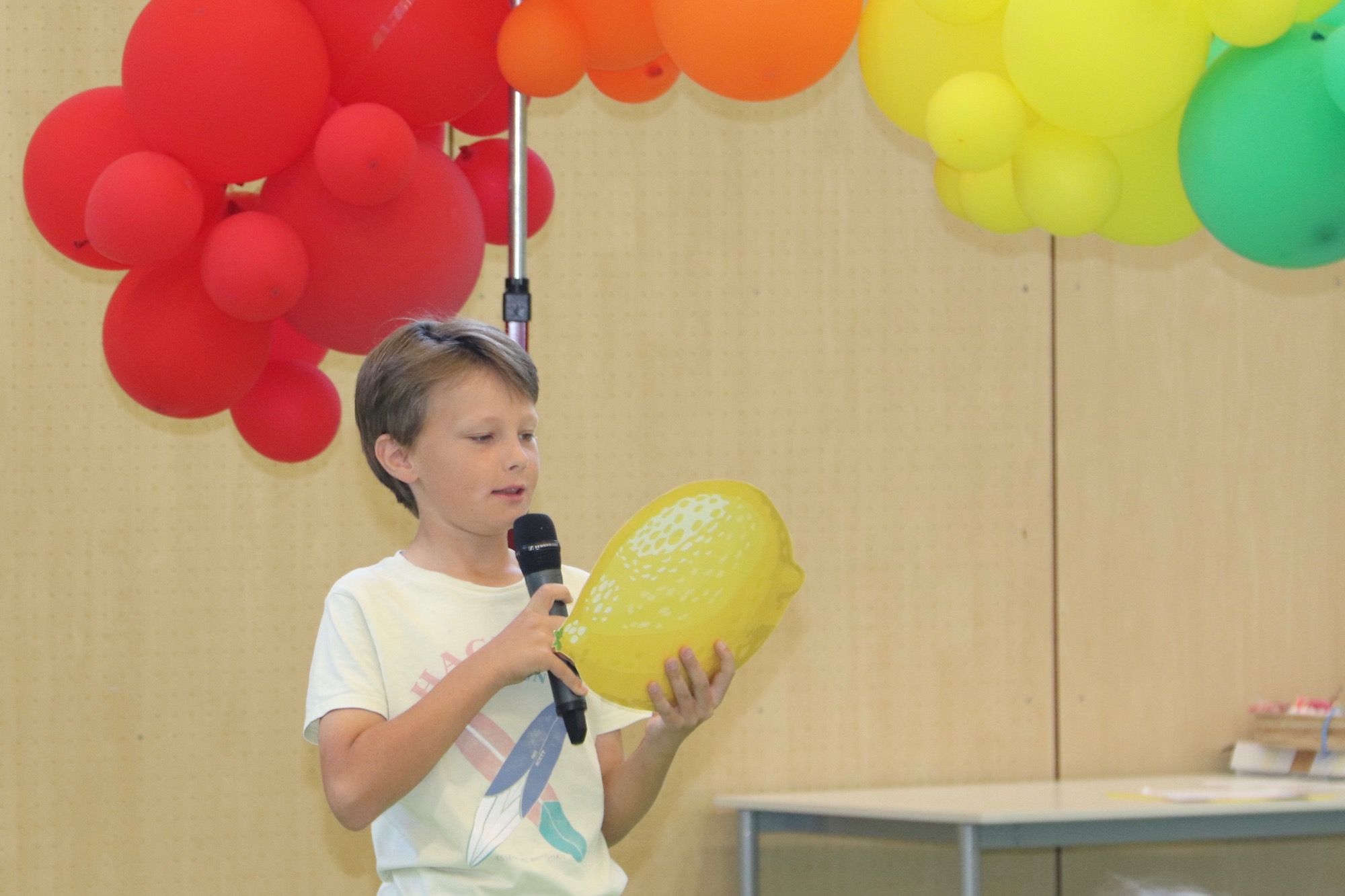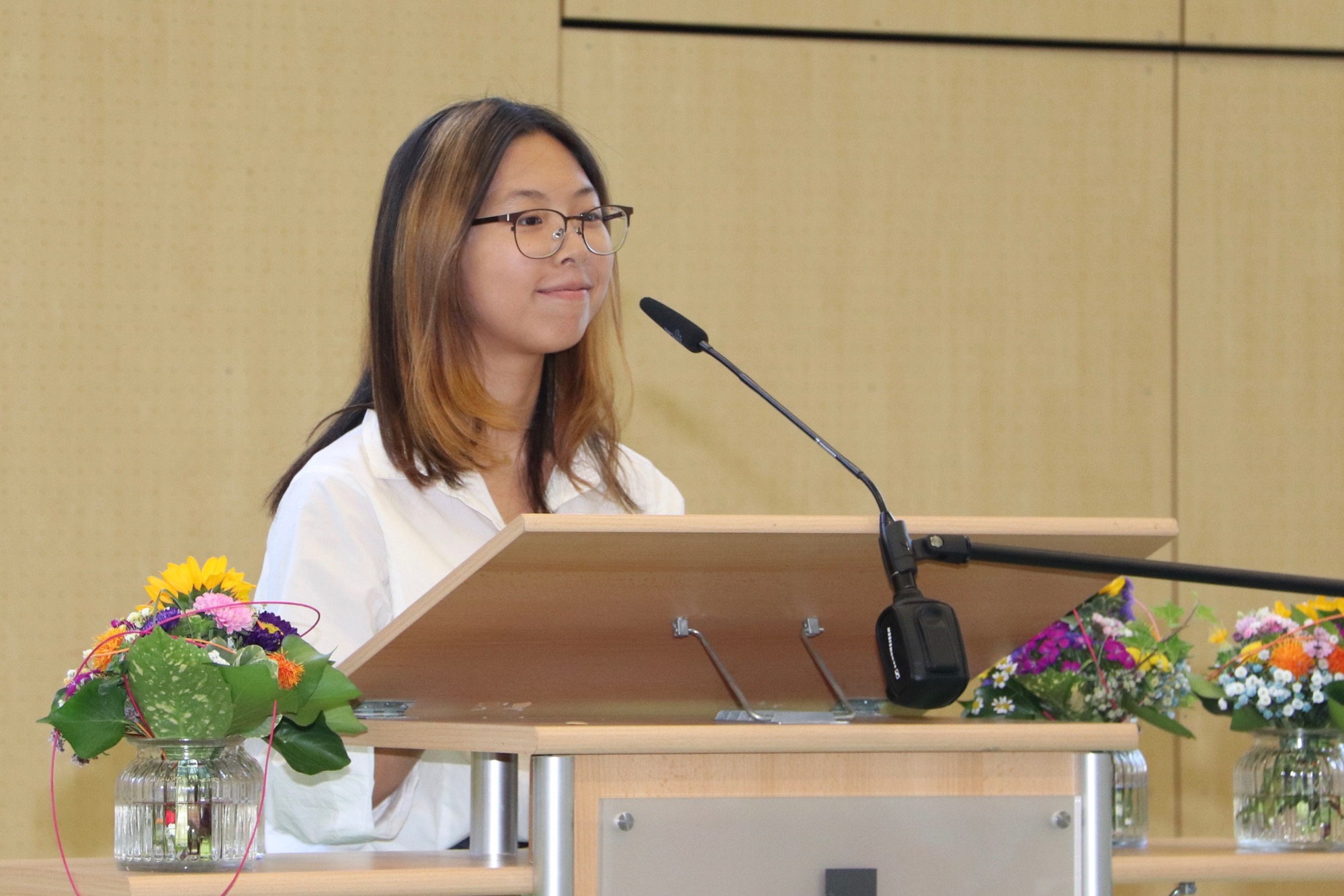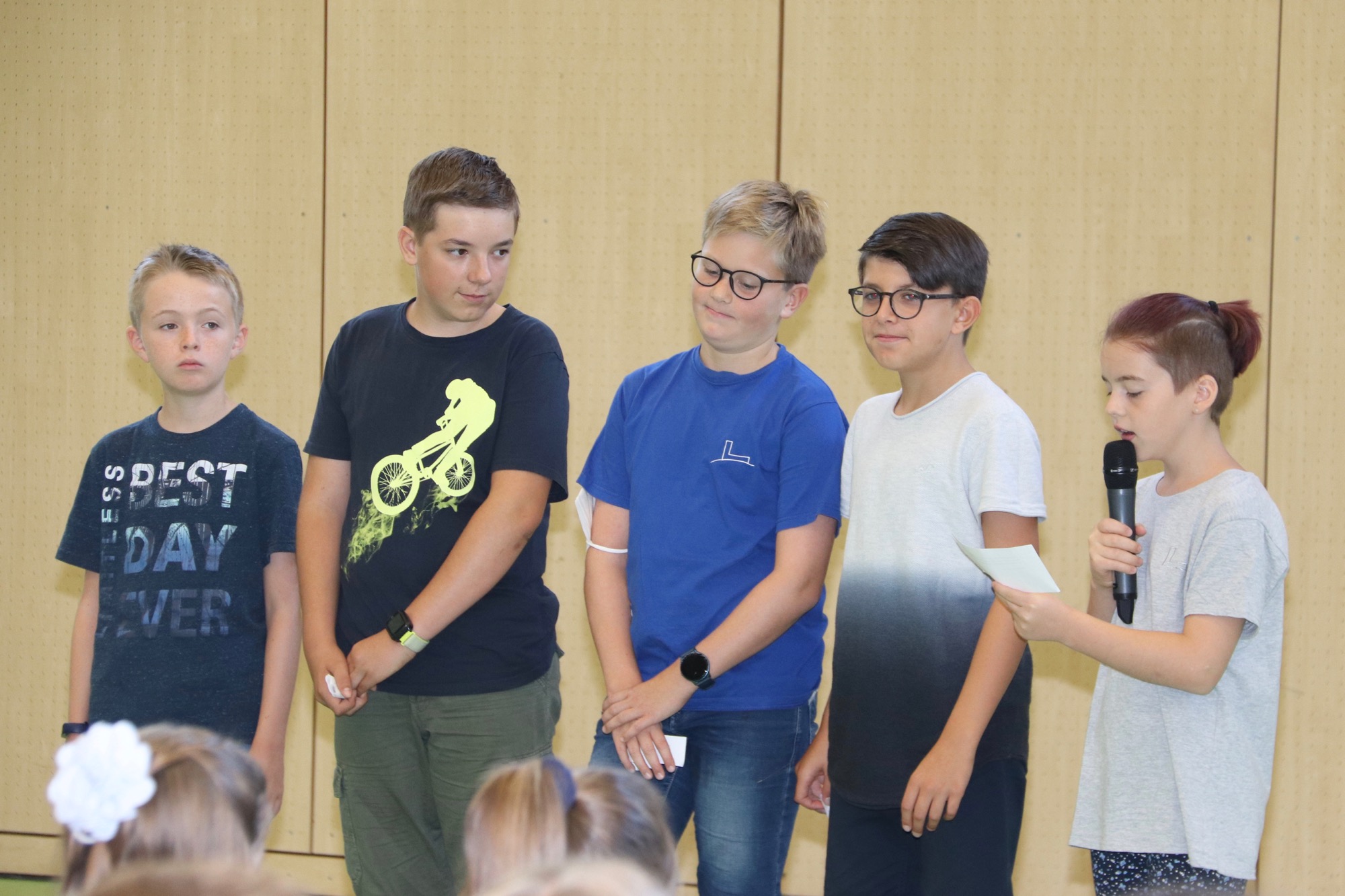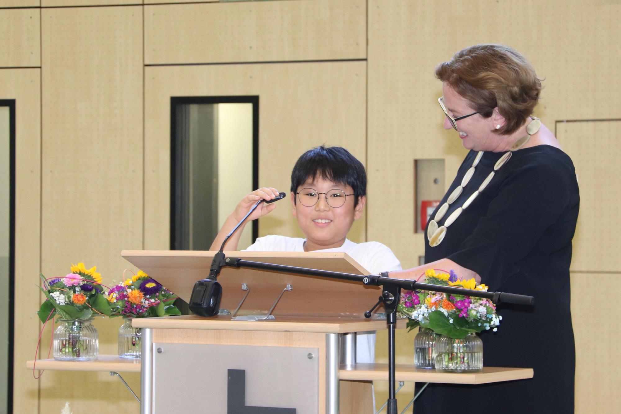 Die Schulsprecherin Ajin Jeong und ihr Vertreter Luka Mudrinic richteten ebenfalls motivierende Worte an die neuen Fünftklässler*innen. Luka schilderte, wie gut er bei seinem Wechsel aufs Taunusgymnasium aufgenommen wurde, und beruhigte die Eltern, dass sie sich um ihre Kinder keine Sorgen machen müssten. Tim und Frederik aus der E-Phase begrüßten im Namen der Pat*innen ihre Schützlinge und erklärten ihnen, auf was sie sich beim Patenprojekt freuen können – nämlich konkrete Hilfe im Schulalltag und gemeinsame Unternehmungen wie etwa die Fünftklässer*innen-Übernachtung in der Schule.
