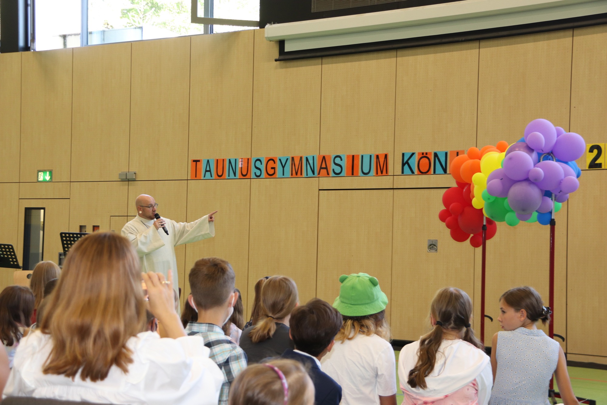 Das hatte es lange nicht gegeben: Die neuen Fünftklässler*innen wurden wie zuletzt vor der Pandemie nicht nur mit einer stimmungsvollen Aufnahmefeier am Taunusgymnasium willkommen geheißen, sondern auch zuvor mit einem ökumenischen Gottesdienst. Die Turnhalle des Taunusgymnasiums war Schauplatz dieses groß angelegten Events, bei dem wie zuletzt vor drei Jahren alle neuen Füntklässler*innen gemeinsam eingeschult wurden. Und natürlich waren auch die Eltern der Neuankömmlinge bei diesem feierlichen Anlass dabei.