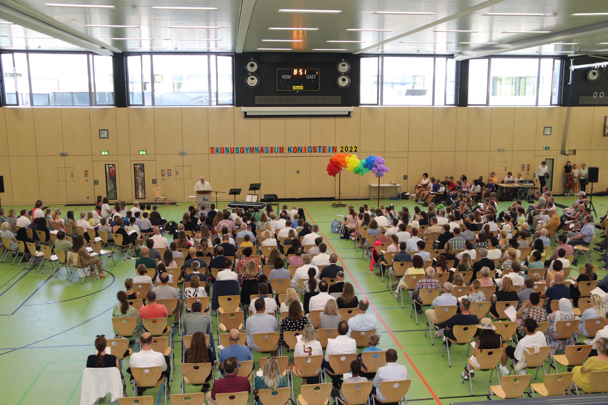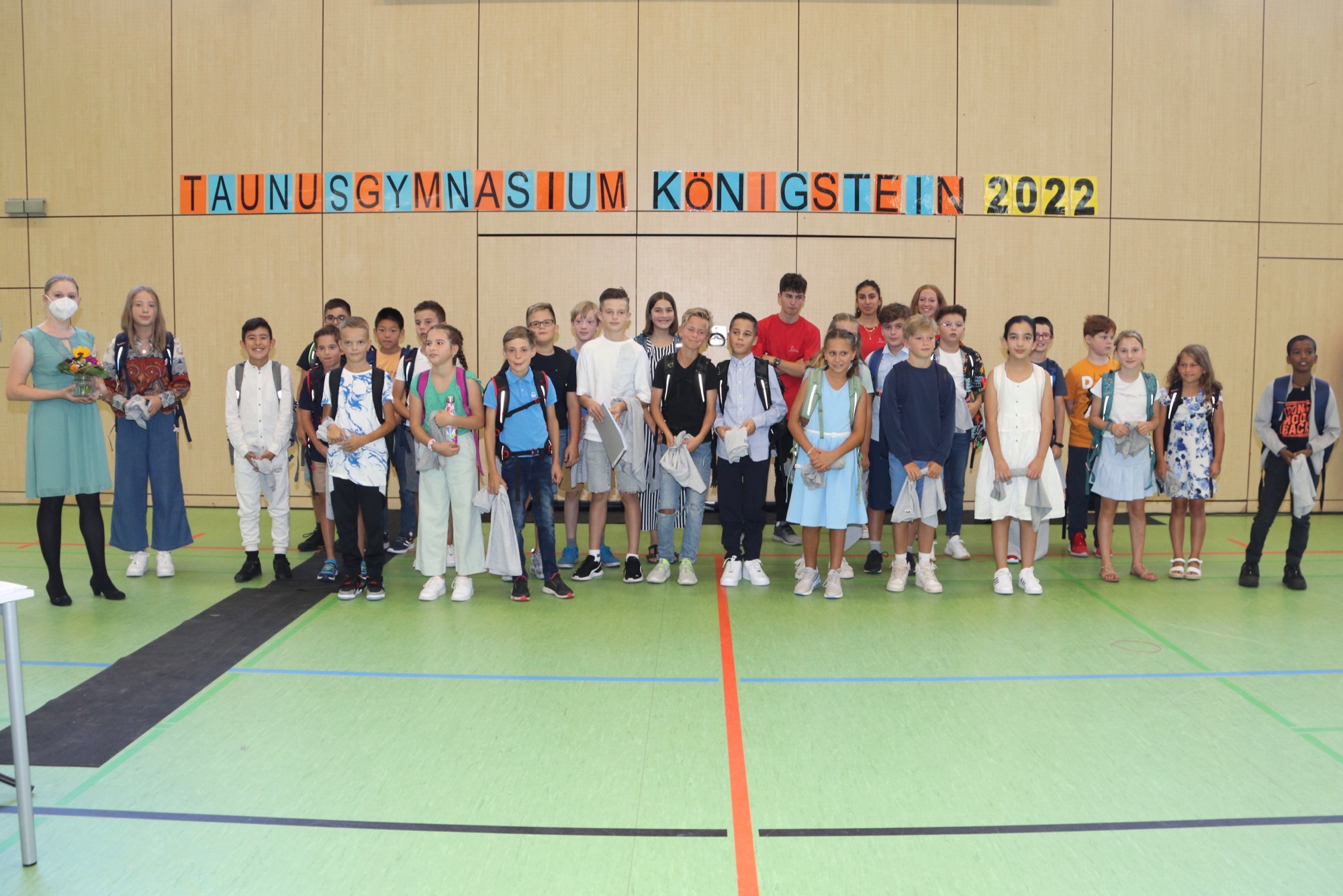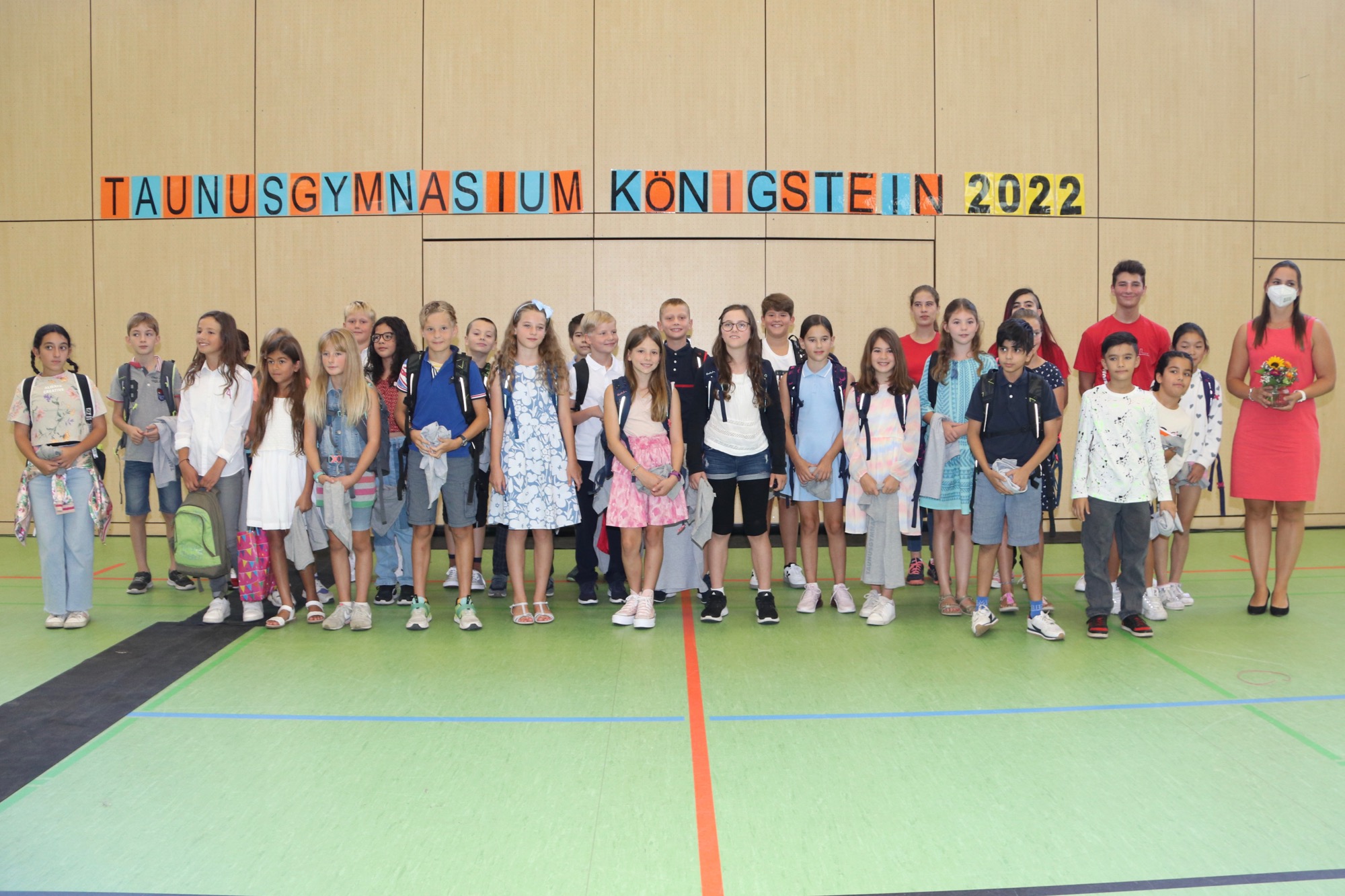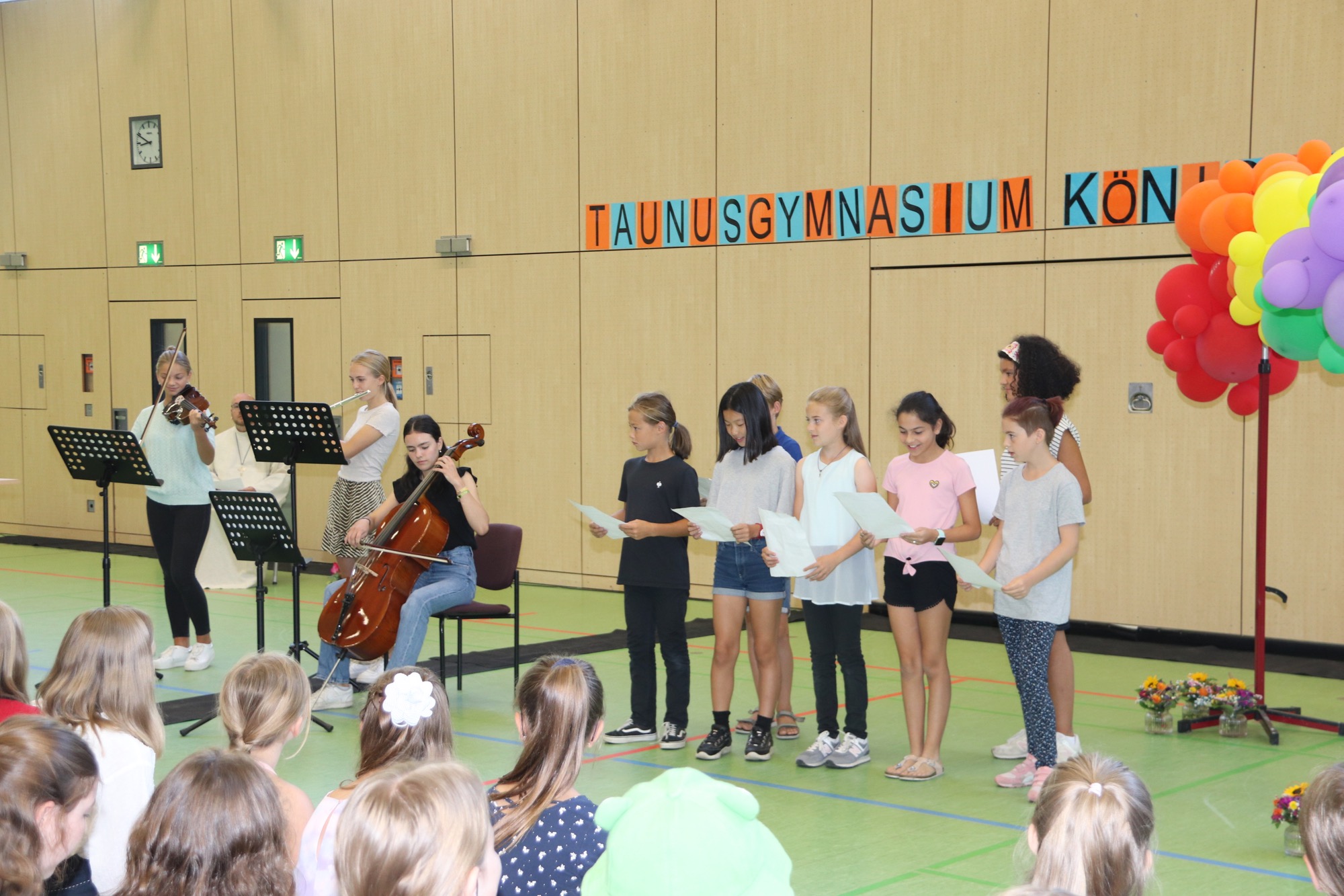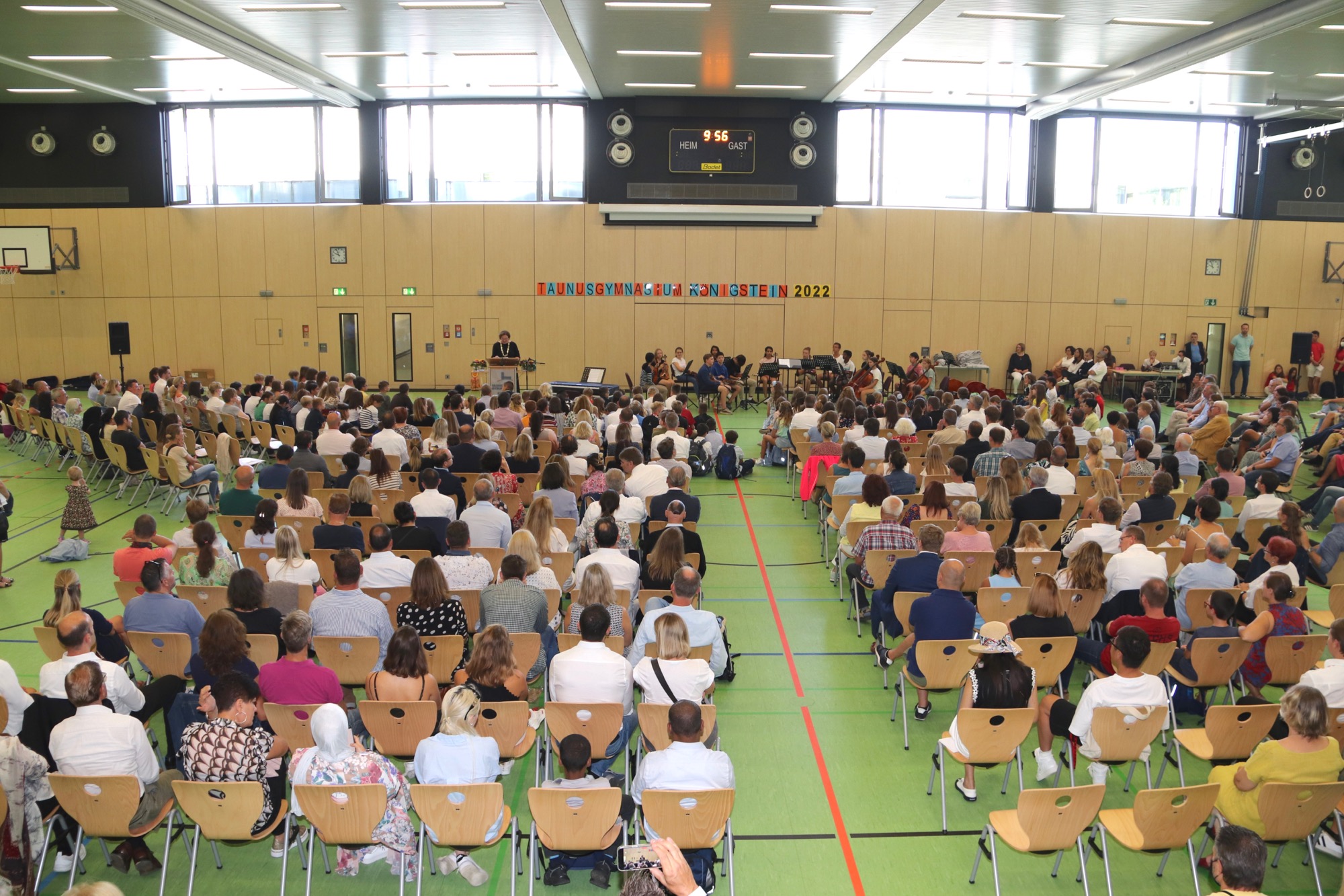 Nach einem weiteren musikalischen Glanzpunkt seitens des Orchesters kam für die Jüngsten des Taunusgymnasiums der große Moment: Sie lernten ihre Klassenkamerad*innen und ihre Klassenlehrer*innen kennen und gingen mit ihnen zu ihren Klassenzimmern. Die Eltern, die in der Sporthalle verblieben, wurden von Frau Herbst noch ausführlicher mit wichtigen Informationen zum Schulstart versorgt.