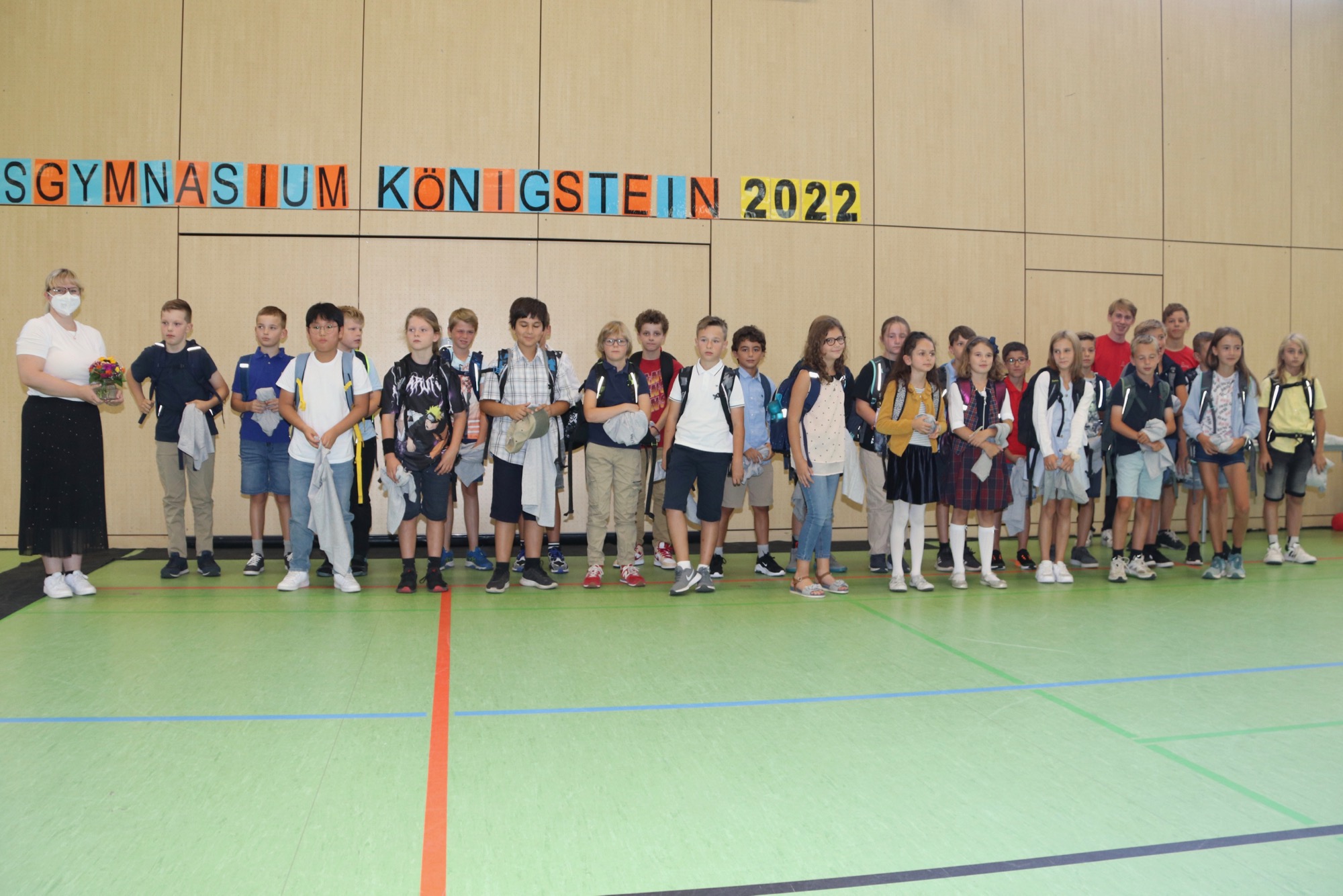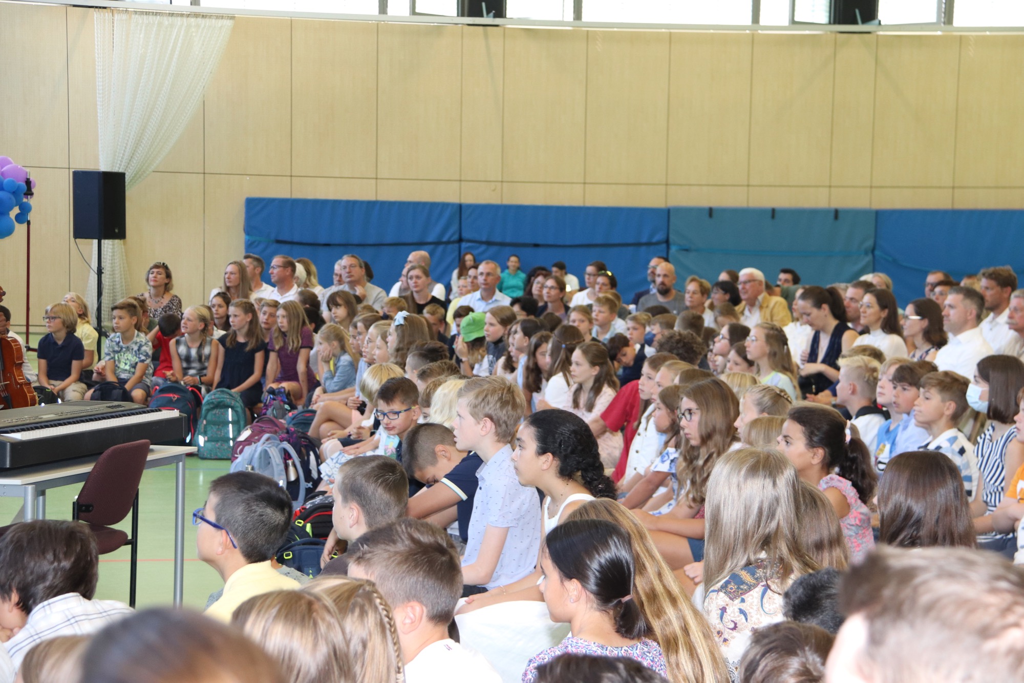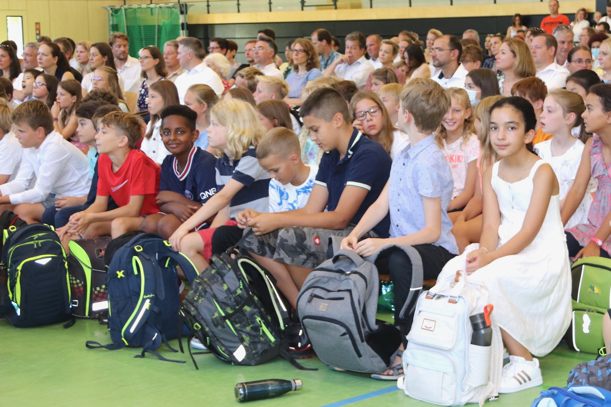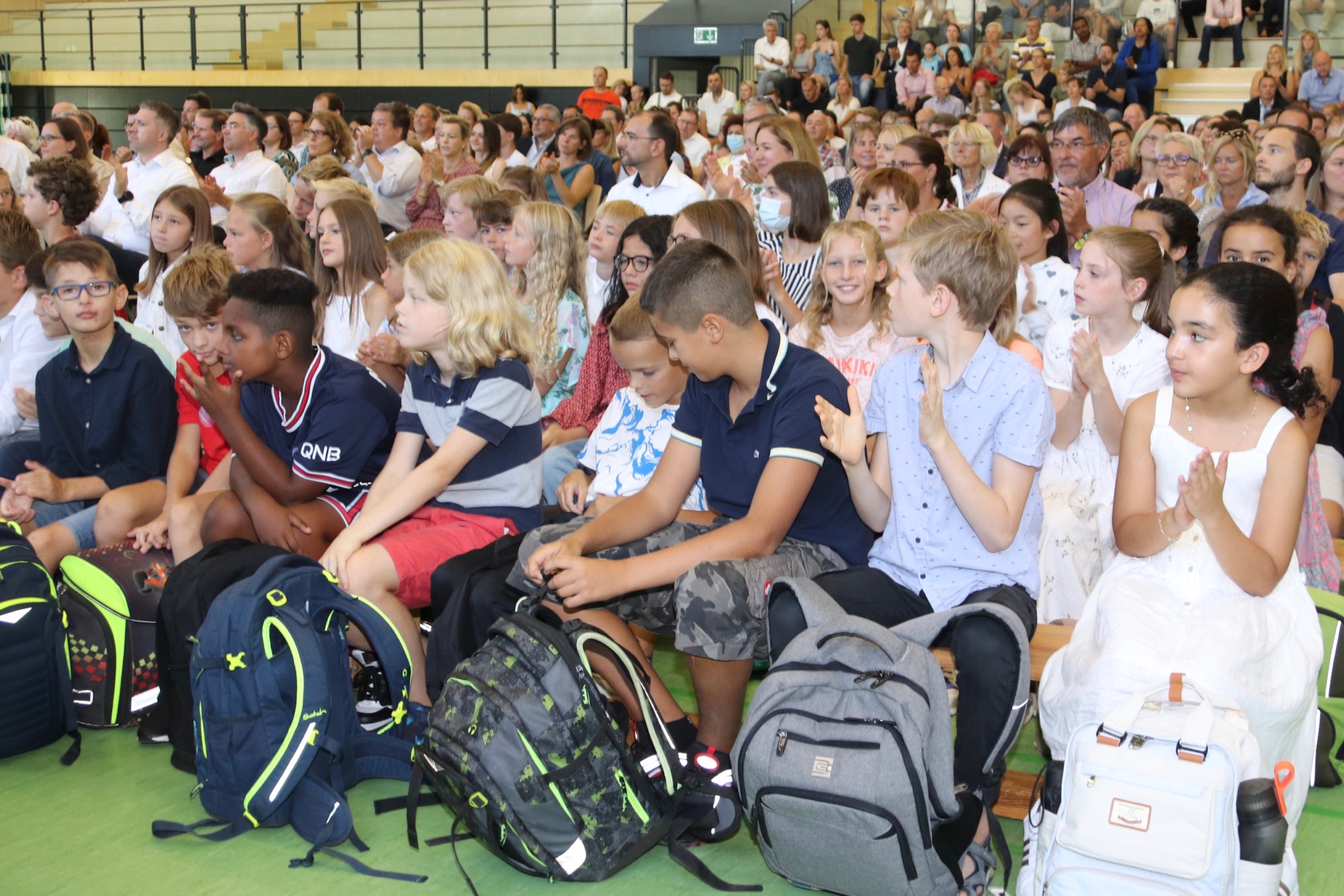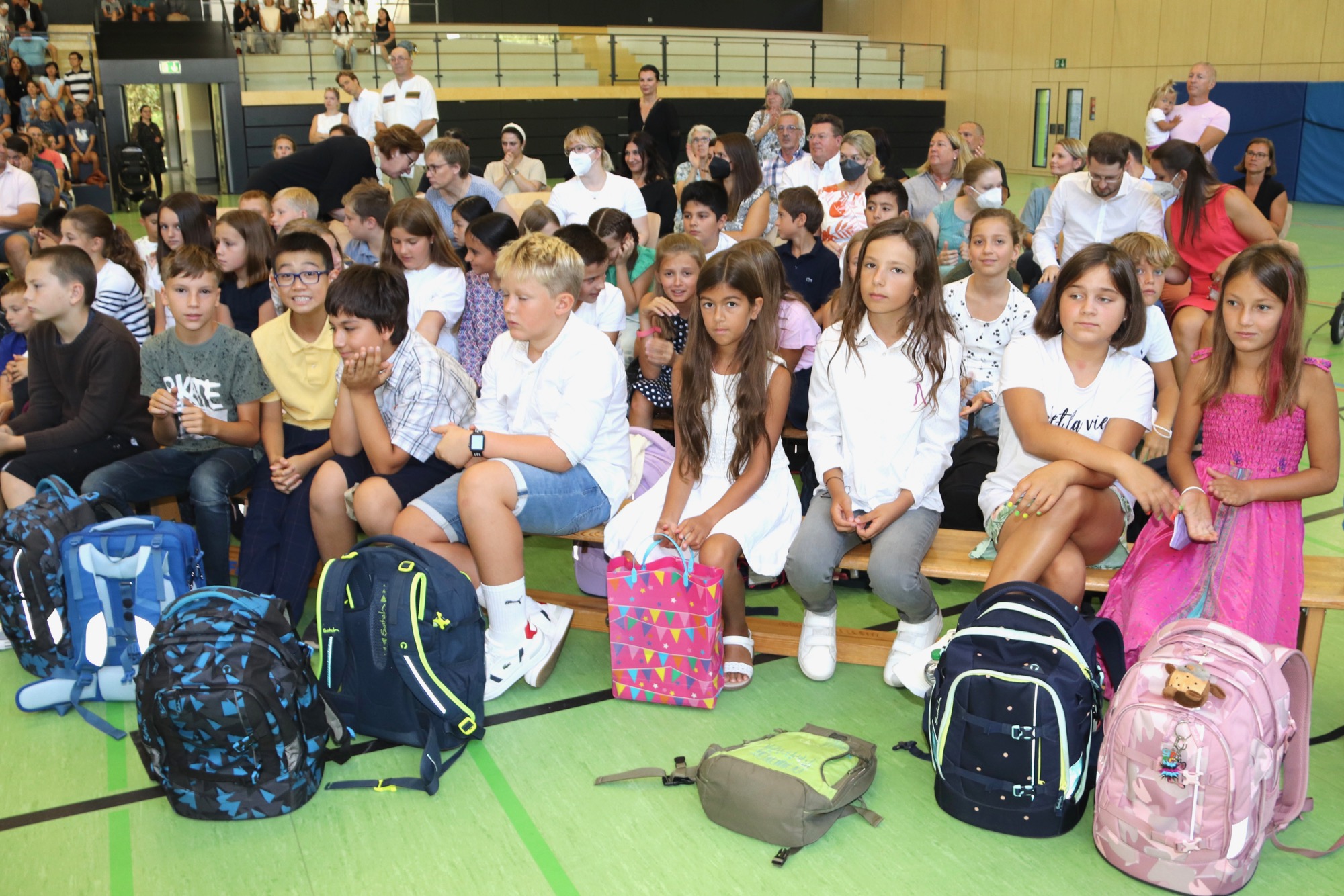 Nach einem weiteren musikalischen Glanzpunkt seitens des Orchesters kam für die Jüngsten des Taunusgymnasiums der große Moment: Sie lernten ihre Klassenkamerad*innen und ihre Klassenlehrer*innen kennen und gingen mit ihnen zu ihren Klassenzimmern. Die Eltern, die in der Sporthalle verblieben, wurden von Frau Herbst noch ausführlicher mit wichtigen Informationen zum Schulstart versorgt.
