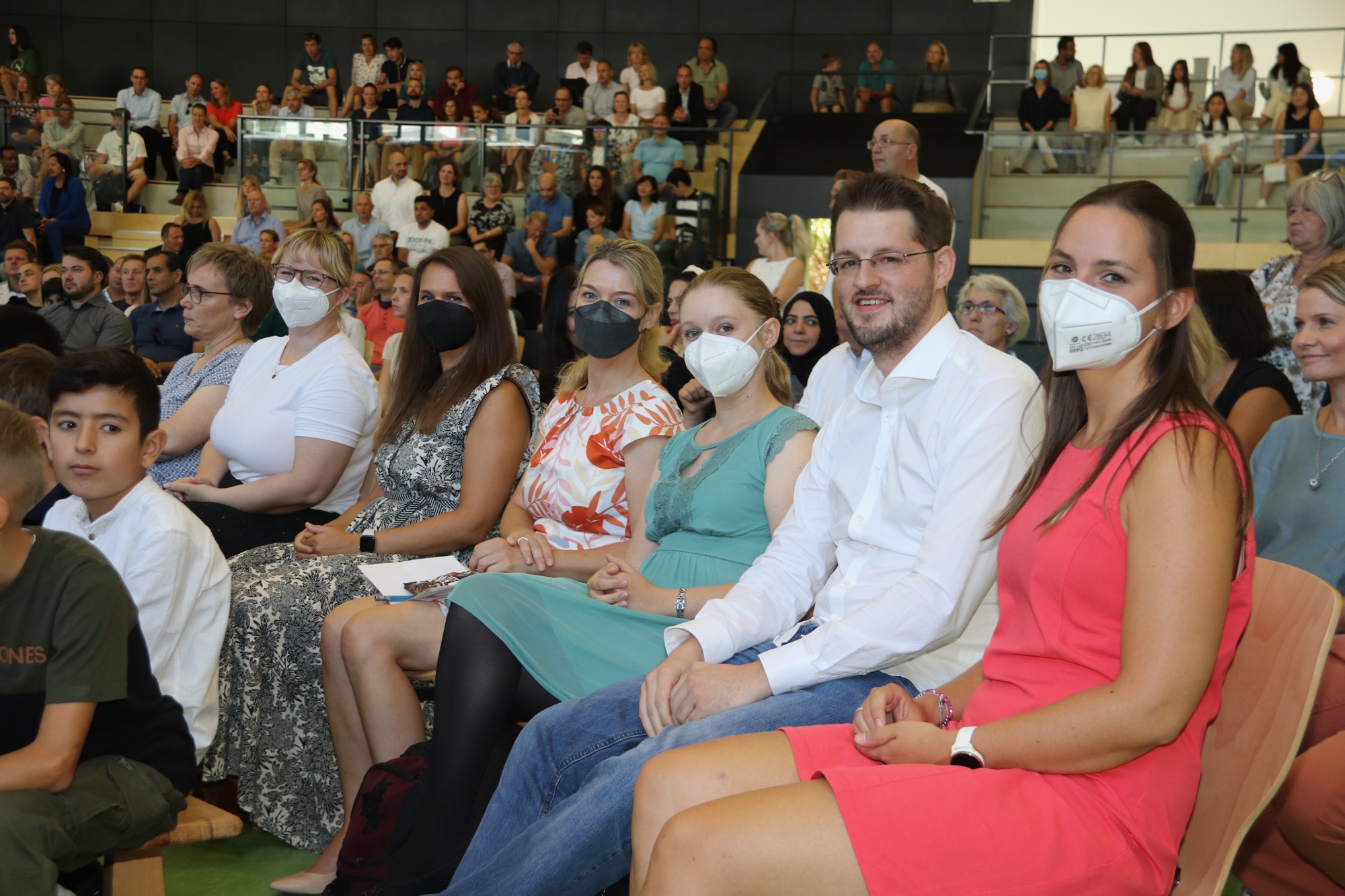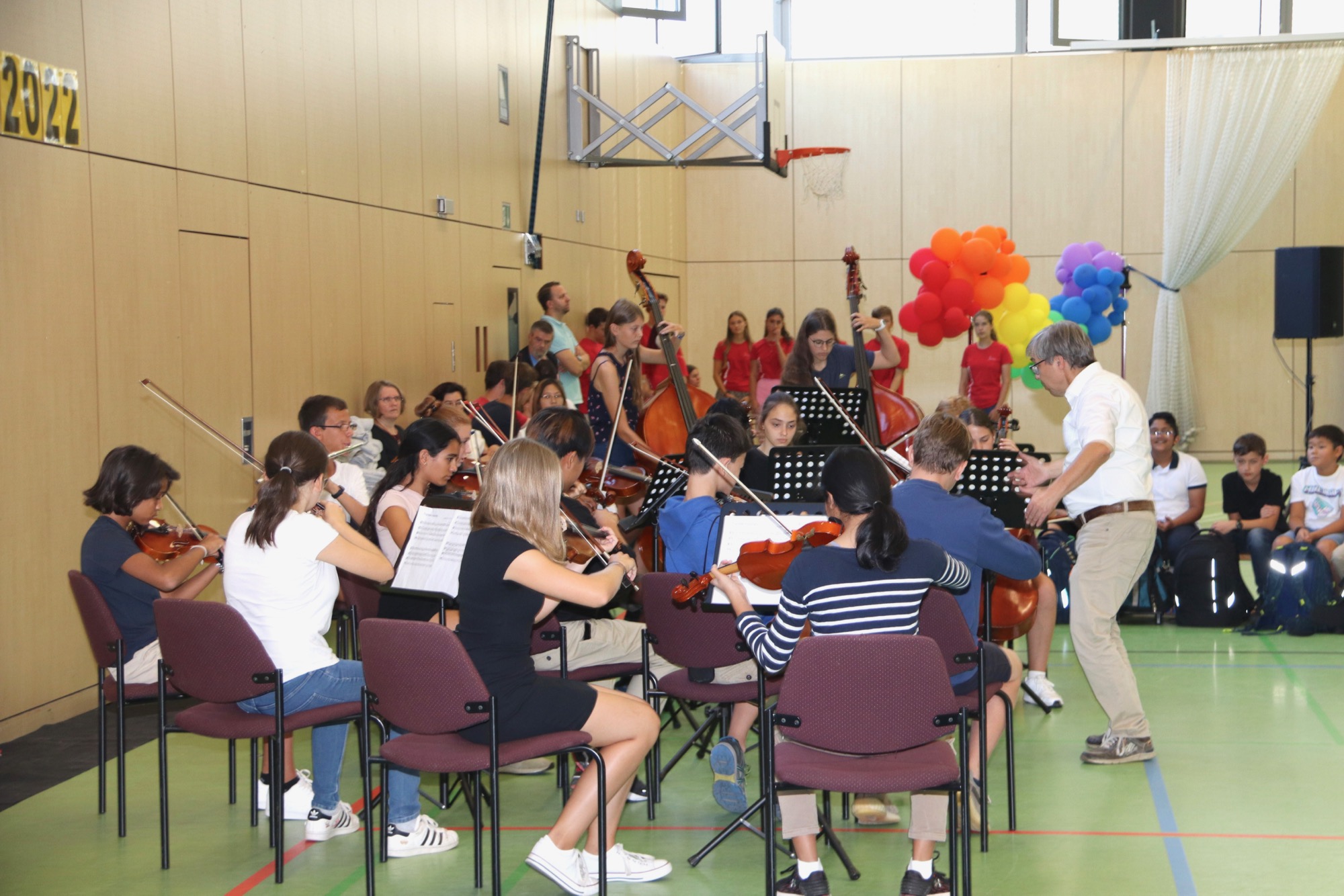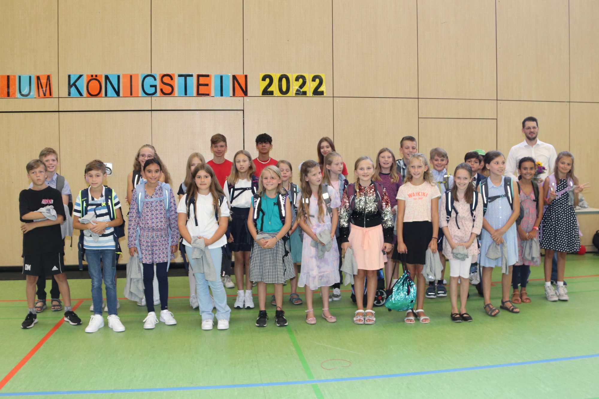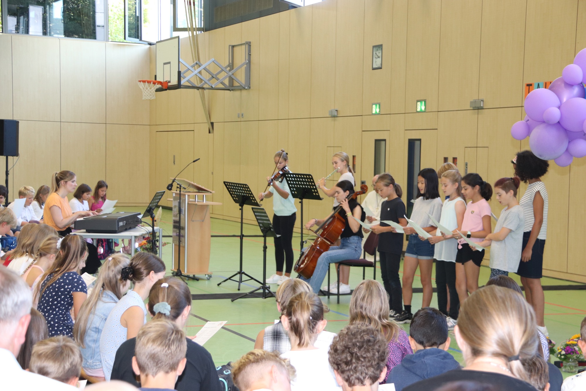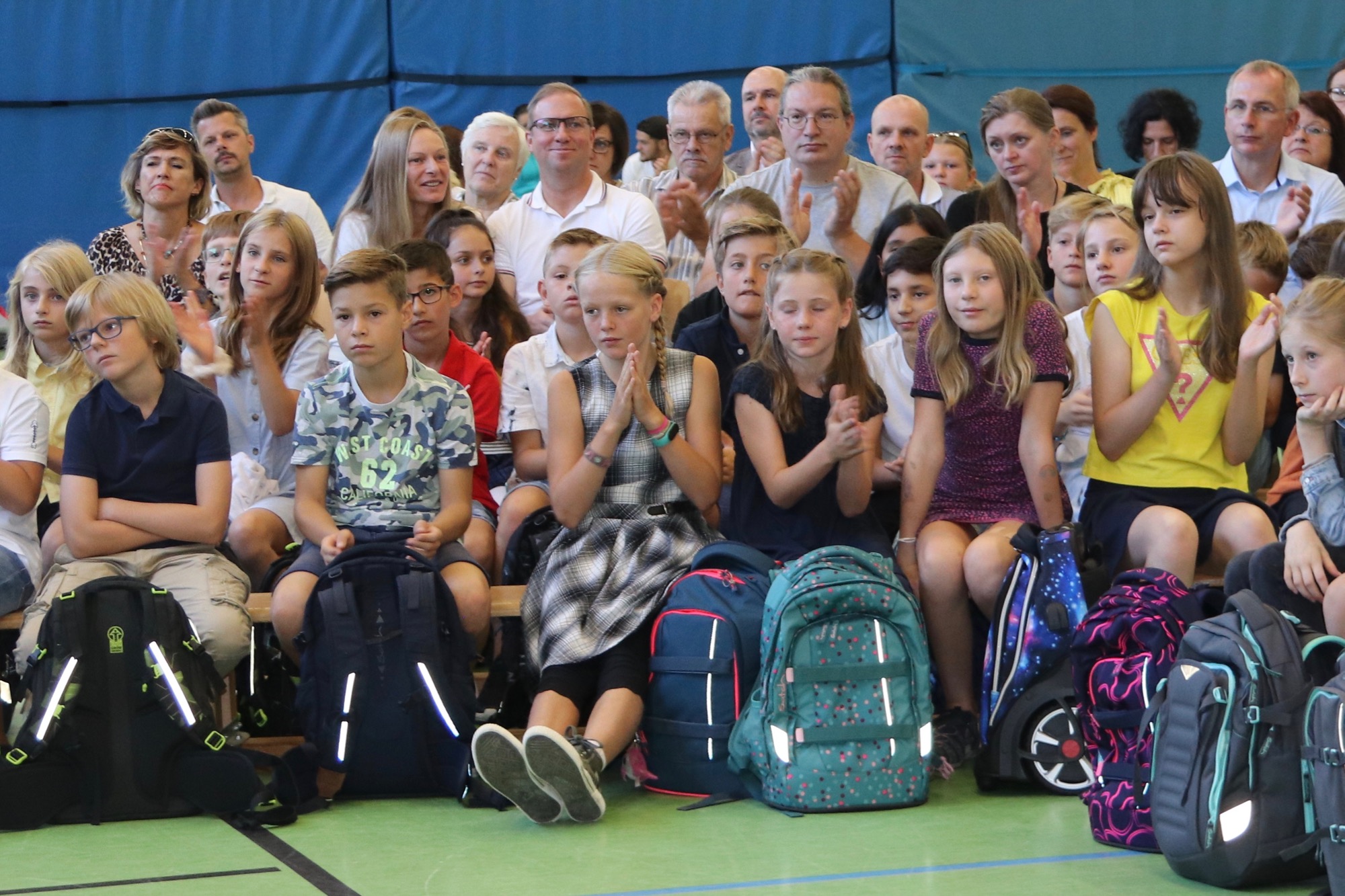 Nach einem weiteren musikalischen Glanzpunkt seitens des Orchesters kam für die Jüngsten des Taunusgymnasiums der große Moment: Sie lernten ihre Klassenkamerad*innen und ihre Klassenlehrer*innen kennen und gingen mit ihnen zu ihren Klassenzimmern. Die Eltern, die in der Sporthalle verblieben, wurden von Frau Herbst noch ausführlicher mit wichtigen Informationen zum Schulstart versorgt.