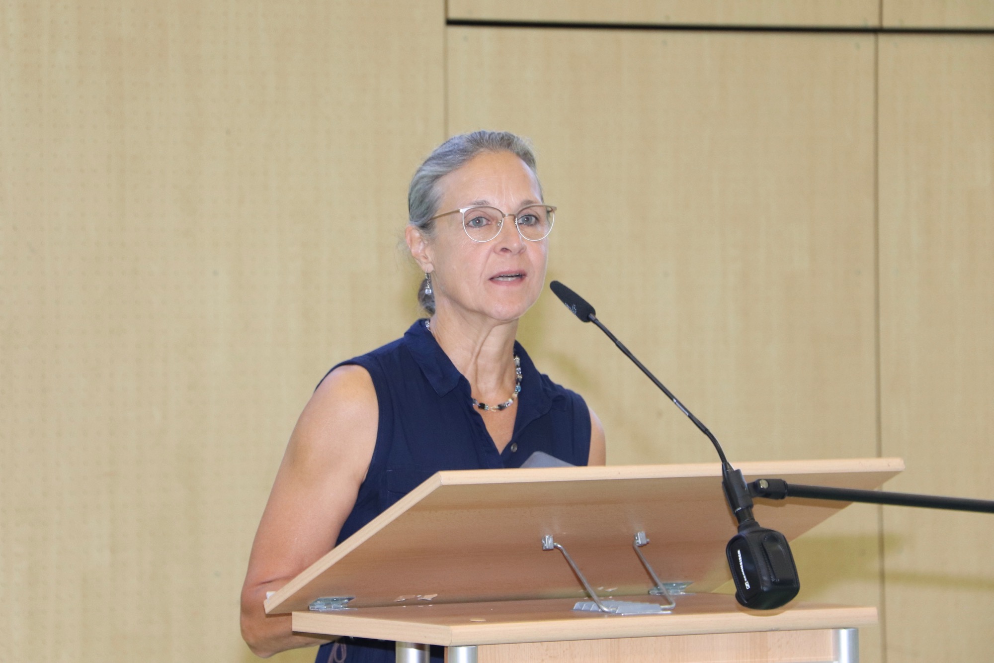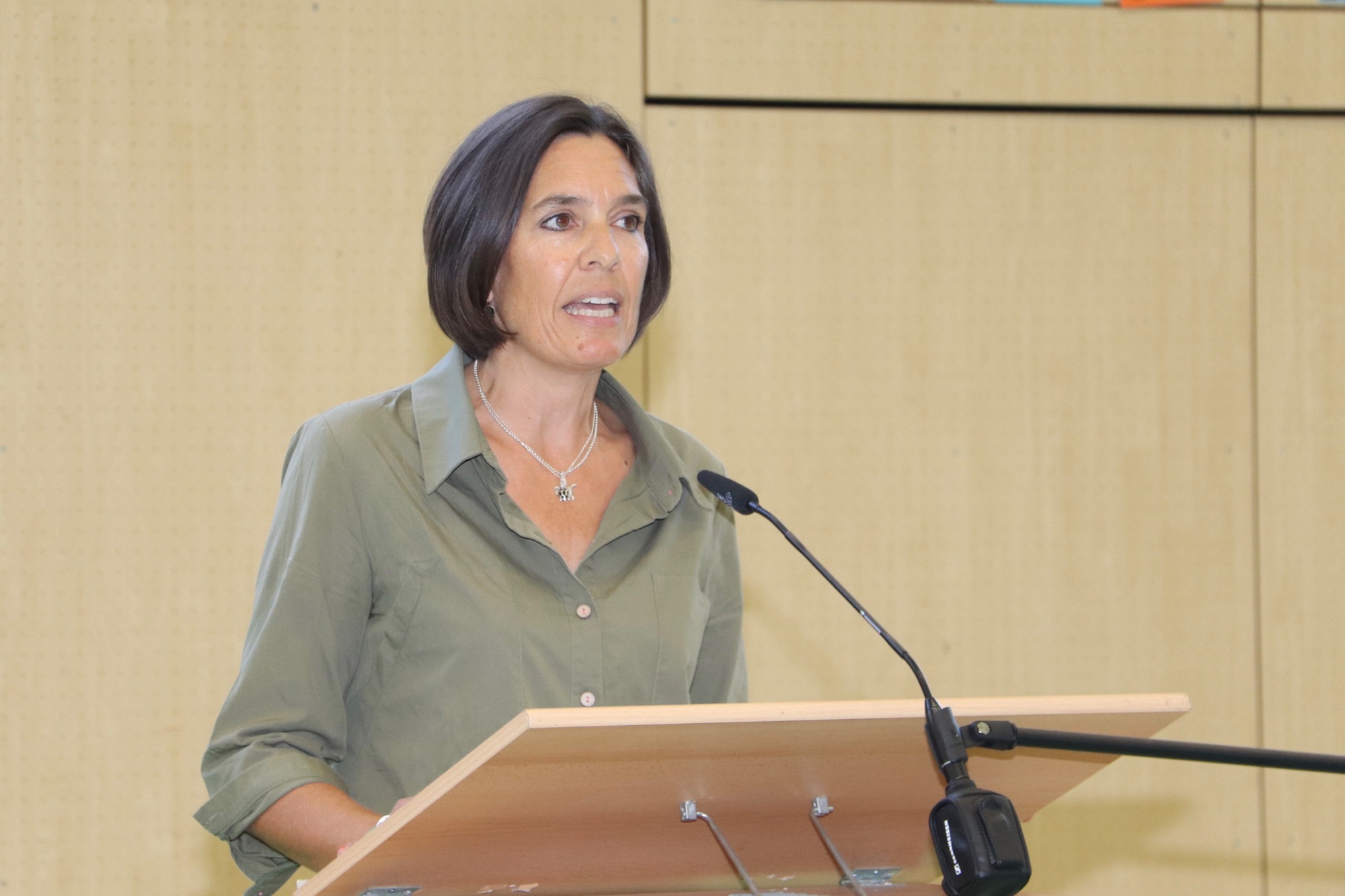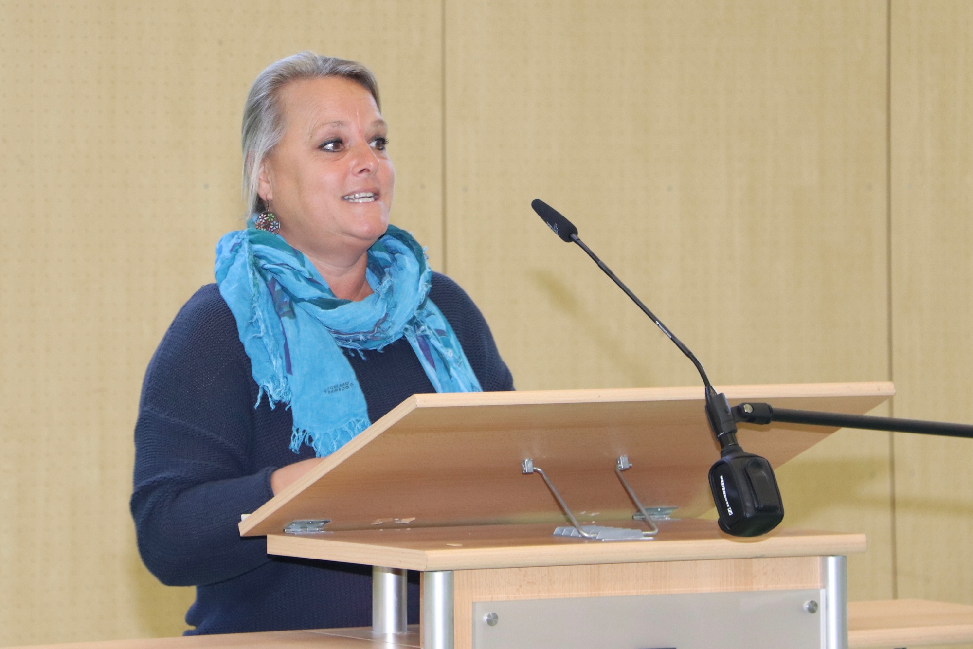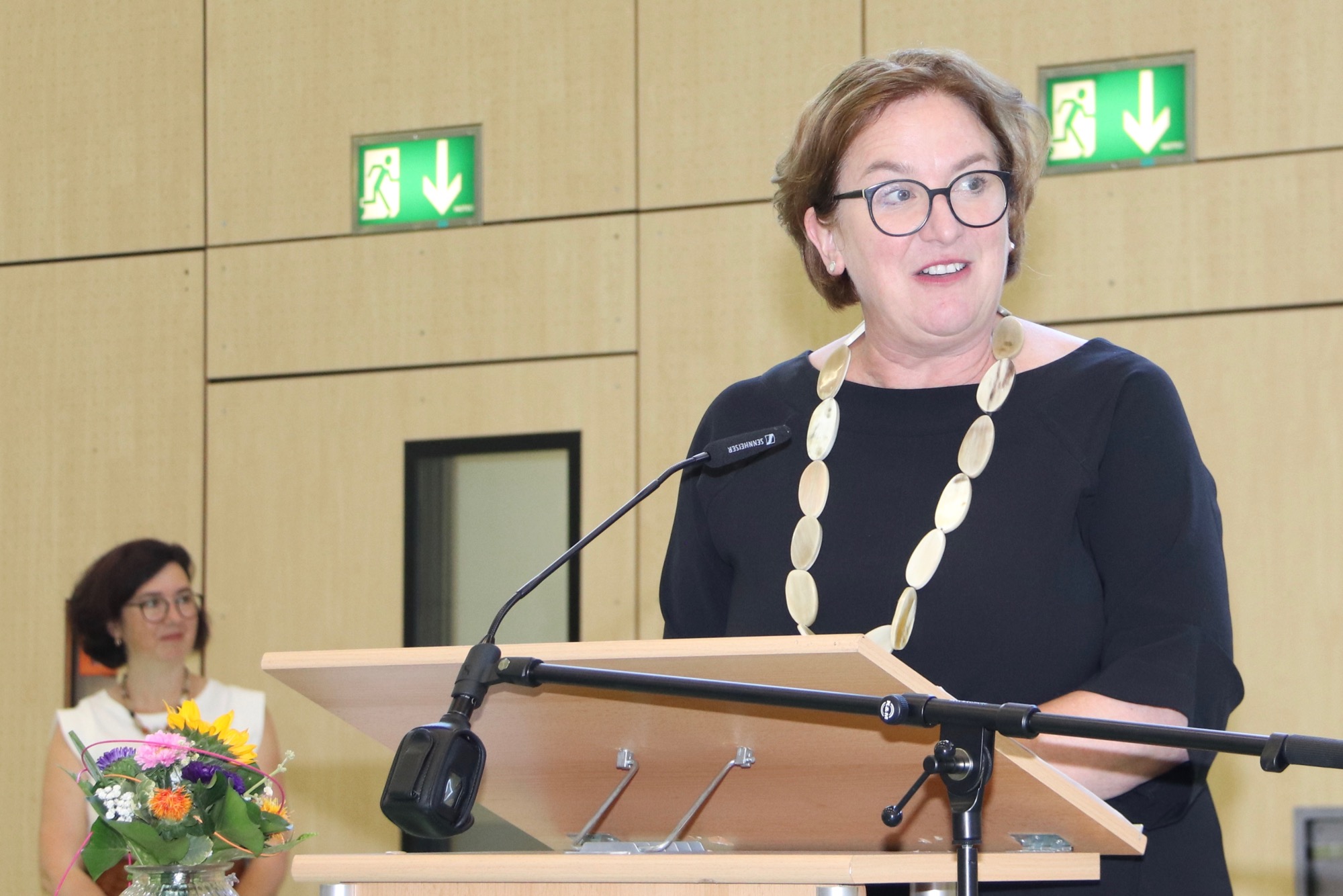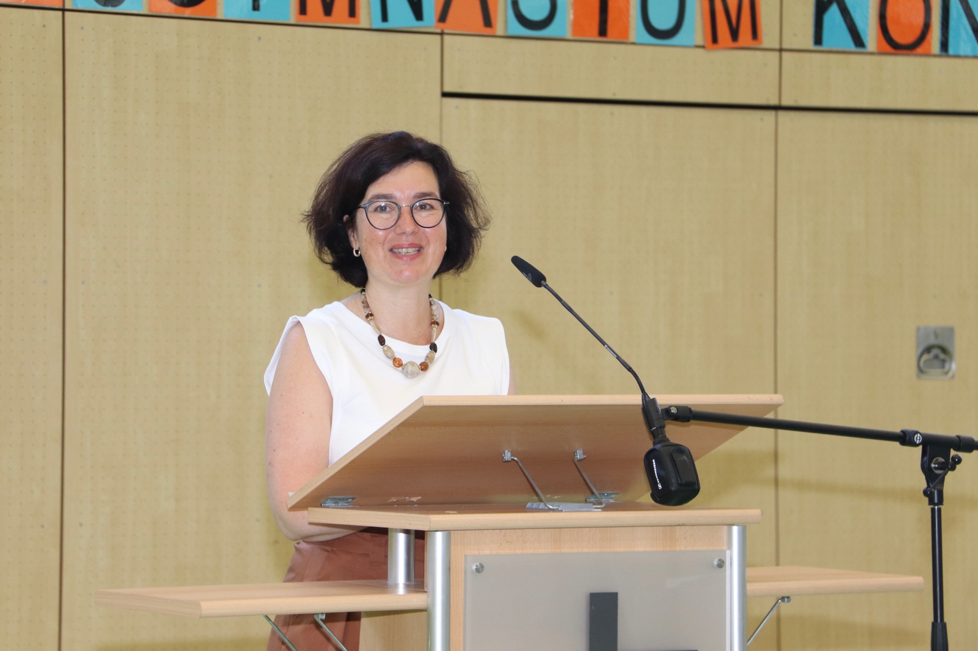 In ihrer Rede nahm Schulleiterin Frau Herbst Bezug auf die zwei großen „M“s des Lernens: die Motivation und das Miteinander. Sie bescheinigte den Kindern, dass sie sehr motiviert wirkten. Doch sei Lernen nicht immer nur angenehm, und manchmal müsse man sich dazu auch überwinden – hier zog sie eine Parallele zum Muskeltraining, zu dem man sich am besten motivieren könne, wenn man sich mit Freunden verabrede. Womit sie beim Begriff „Miteinander“ anlangte: Die Kinder seien nun Teil einer neuen, sehr großen Gemeinschaft und fragten sich, wie man sich in einer so großen Gemeinschaft wohl fühlen solle. Doch diese Sorge nahm ihnen Frau Herbst – eine Vielzahl von Akteuren am Taunusgymnasium sei darum bemüht, den Neulingen den Einstieg zu erleichtern; etwa die Pat*innen aus der E-Phase, die vor einigen Jahren ebenfalls als Fünftklässler*innen an derselben Stelle saßen. Alle hätten auf ihre eigene Weise einen Platz in der Gemeinschaft gefunden; und genauso werde dies den Kindern mit Hilfe ihrer Klassenlehrer*innen und ihrer Mitschüler*innen gelingen. Die Eltern ermunterte Frau Herbst, sich in der Schulgemeinschaft einzubringen, etwa in der Bibliothek, im Elternbeirat oder im WoB, das sich für die leibliche Stärkung der Schüler*innen in den Pausen einsetzt. Abschließend wünschte Frau Herbst den Kindern viel Motivation und viel Miteinander und hieß sie am Taunusgymnasium herzlichen willkommen.