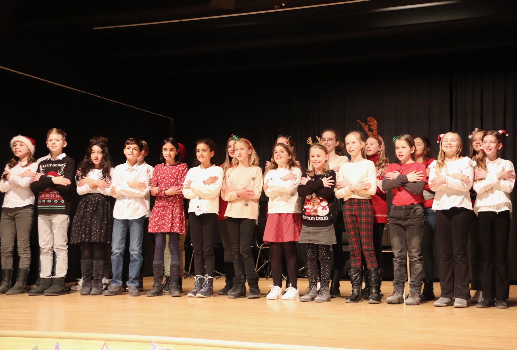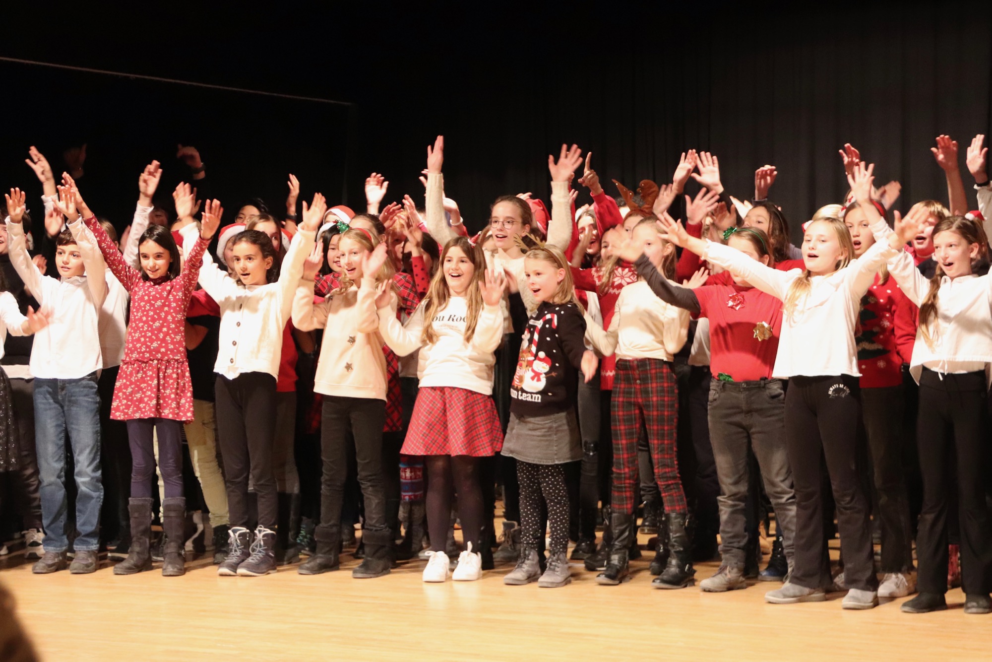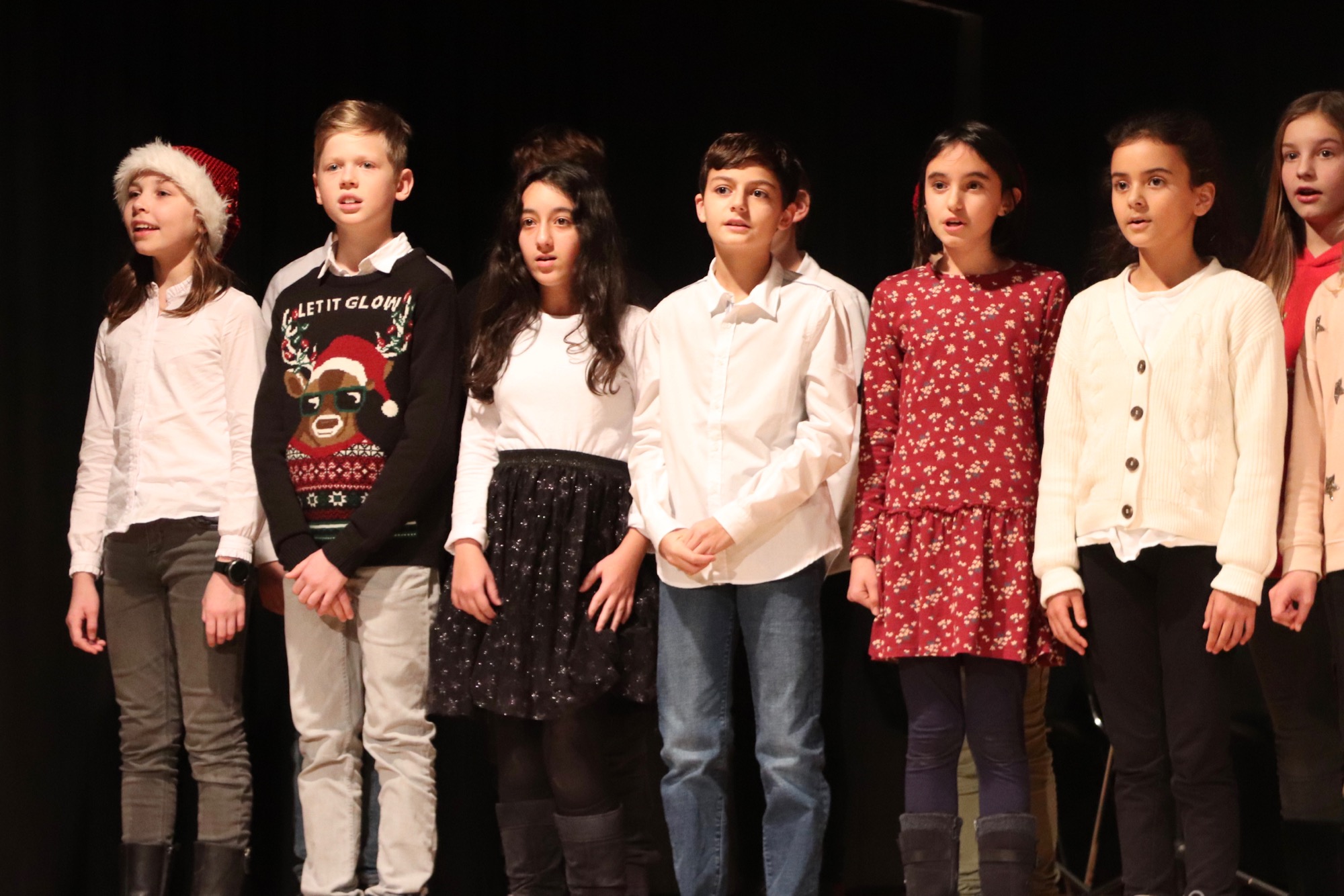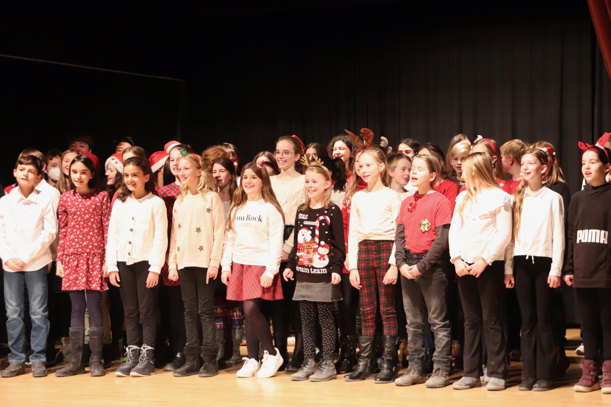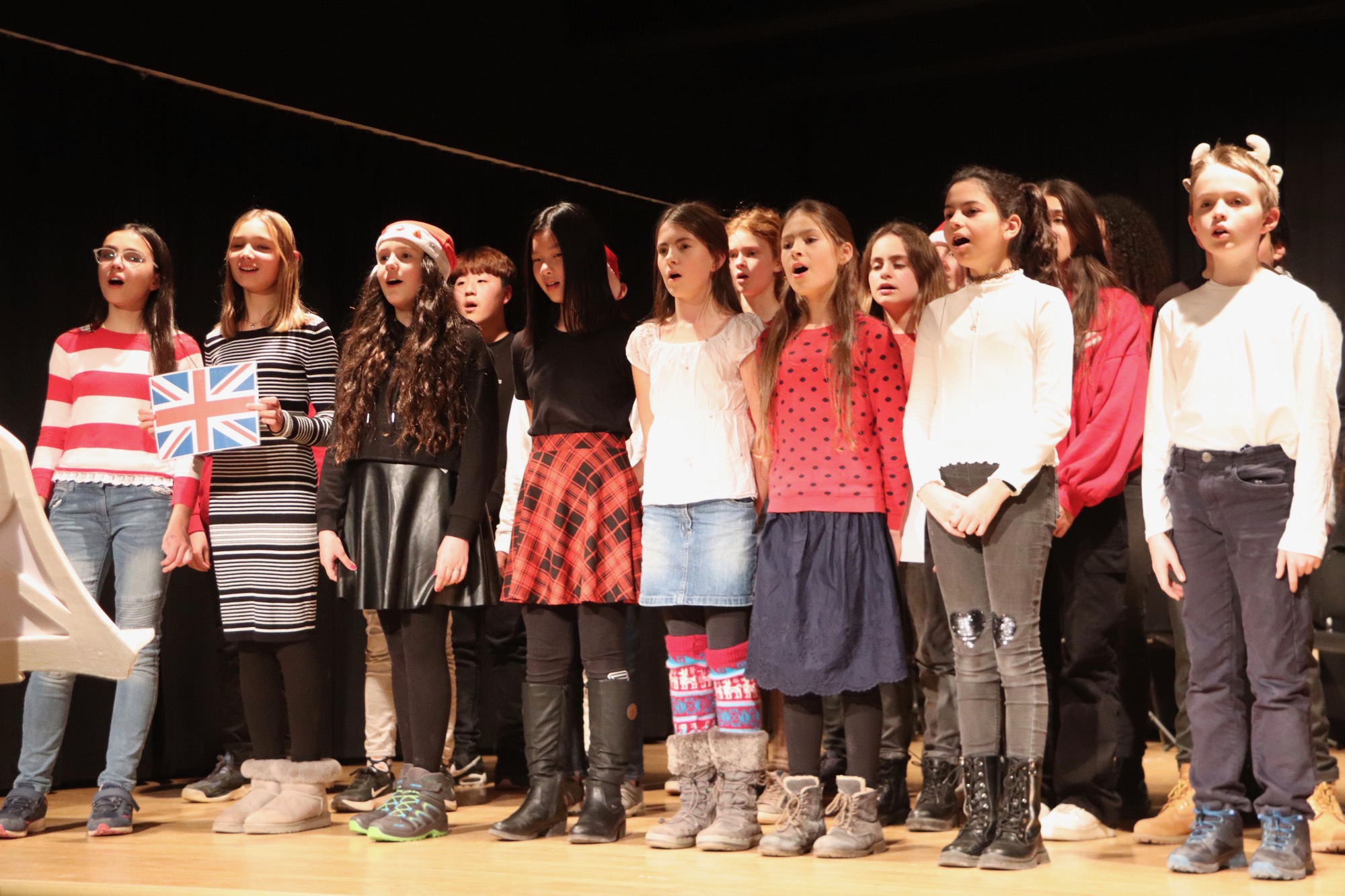 Die Gesangsgruppen unter Leitung von Frau Büttner begeisterten mit schwungvollen Weihnachtsliedern, zunächst "Rudolph the red nosed reindeer" und "Let it snow", gesungen von der Gesangsgruppe der 5. Klasse. Die Gesangsgruppe der 6. Klasse übernahm anschließend die Bühne und versetzte mit "Stille Nacht, heilige Nacht", gesungen in fünf Sprachen (darunter Ukrainisch) und "Santa Claus is Coming To Town" den Theatersaal endgültig in Weihnachtsstimmung. Als schließlich die Gesangsgruppen beider Jahrgangsstufen gemeinsam auf die Bühne traten und "Feliz Navidad" sangen, kannte die Begeisterung des Publikums keine Grenzen mehr. Als Zugabe füllte der spanische Klassiker sogar im Zusammenspiel zwischen Chor und Publikum den Saal mit weihnachtlichen Klängen. Die Chor-Darbietungen begleitete Lucio Ramírez del Prado Vetter (E1) gekonnt am Flügel.