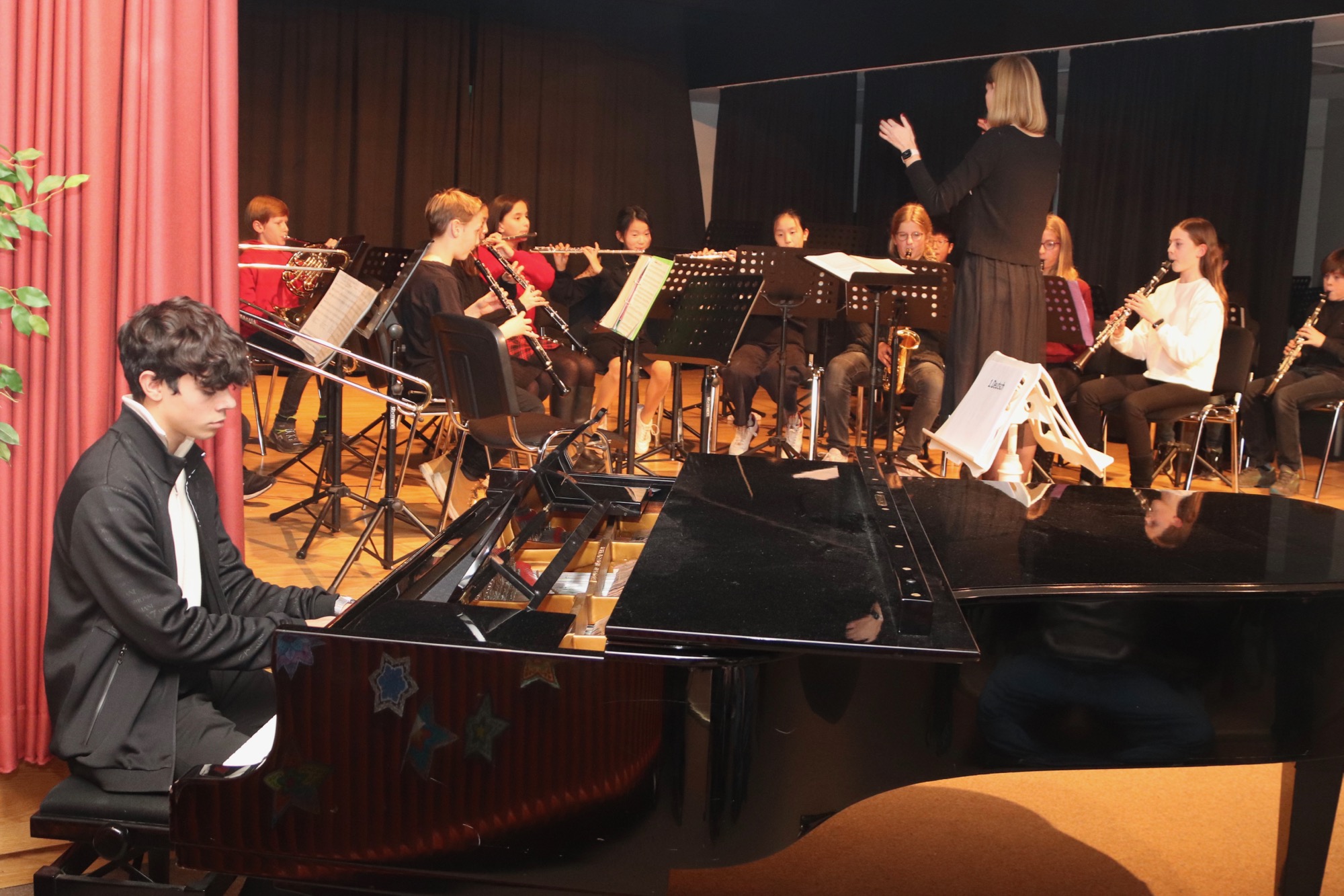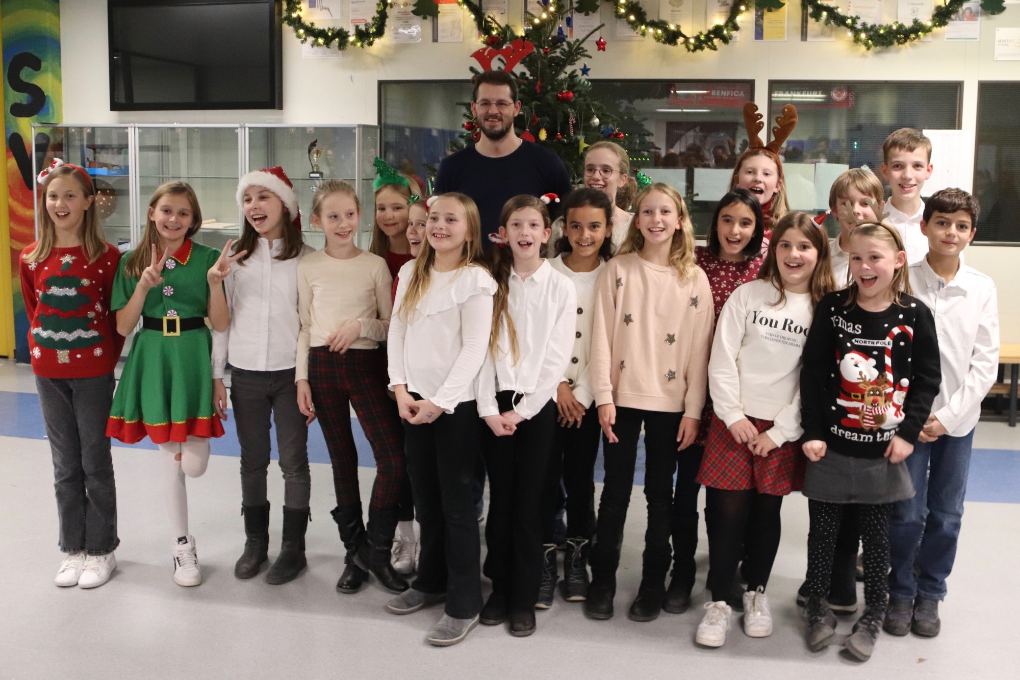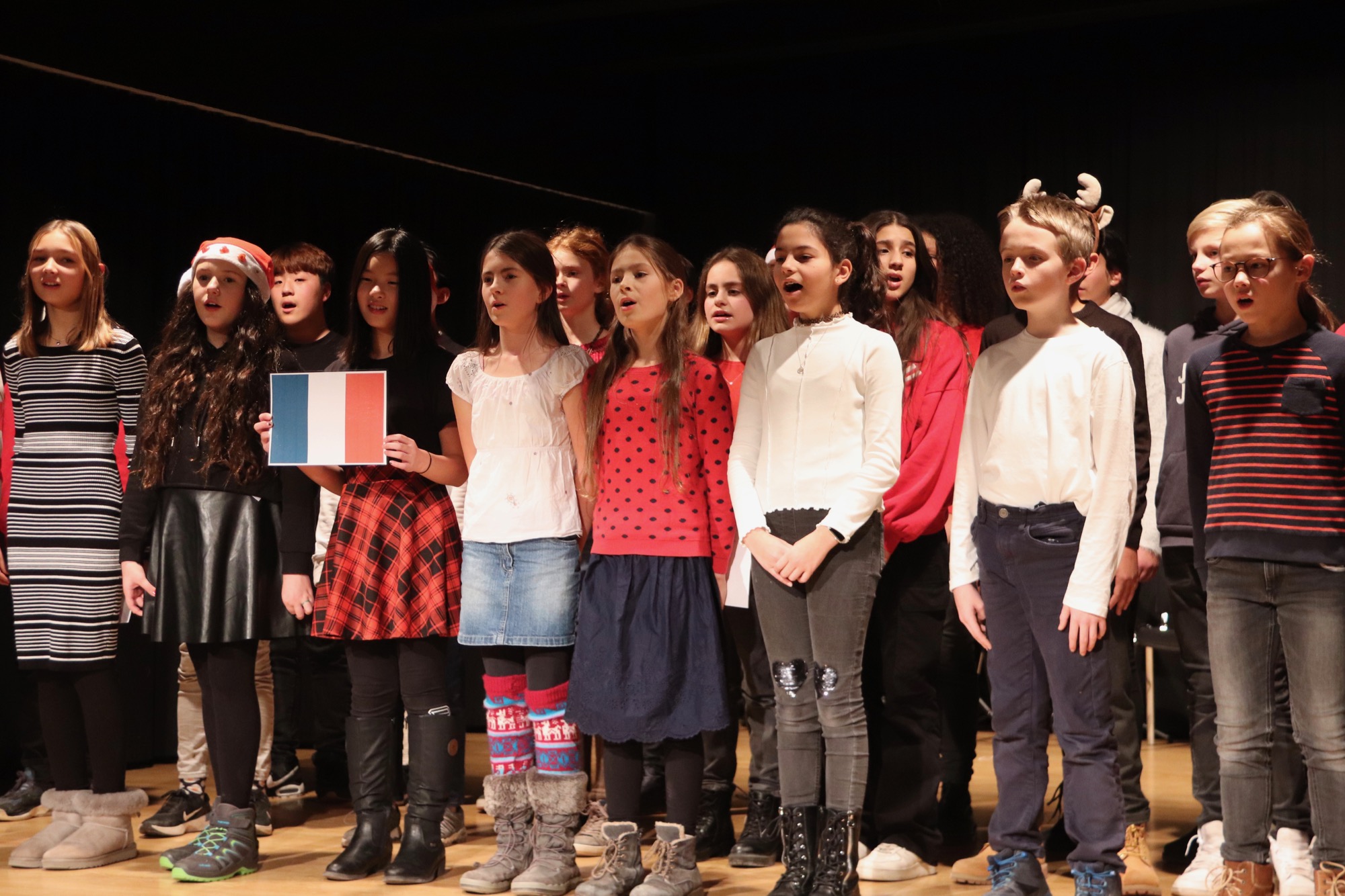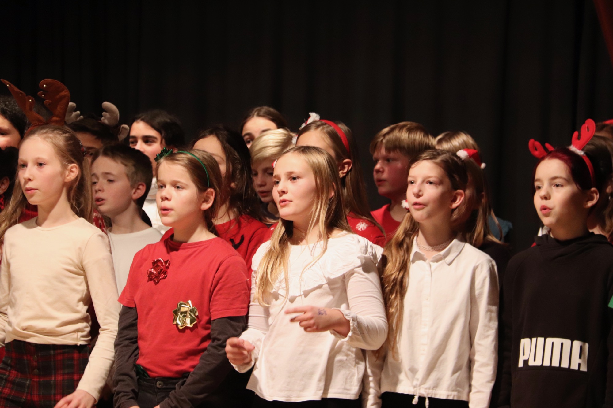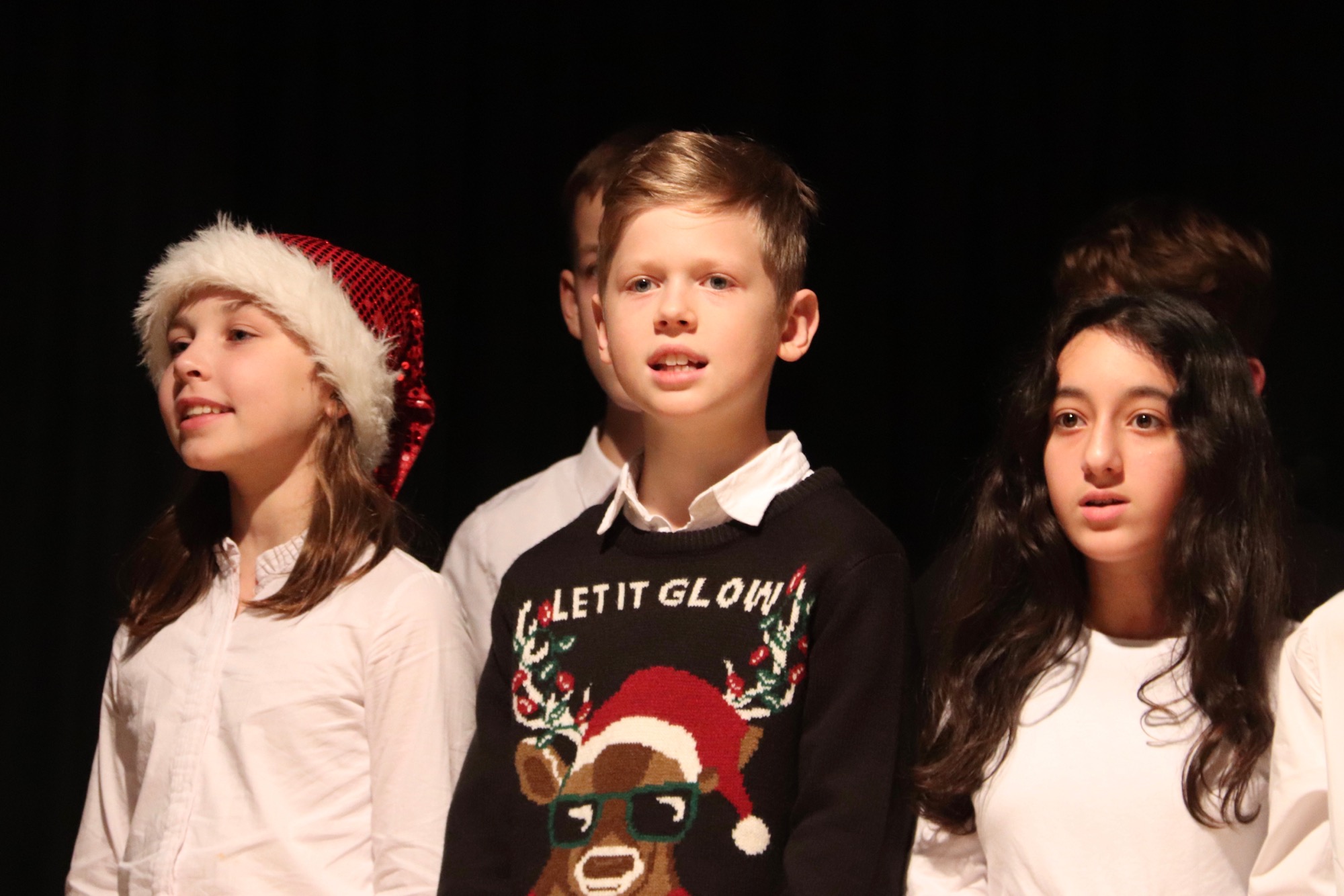 Die Gesangsgruppen unter Leitung von Frau Büttner begeisterten mit schwungvollen Weihnachtsliedern, zunächst "Rudolph the red nosed reindeer" und "Let it snow", gesungen von der Gesangsgruppe der 5. Klasse. Die Gesangsgruppe der 6. Klasse übernahm anschließend die Bühne und versetzte mit "Stille Nacht, heilige Nacht", gesungen in fünf Sprachen (darunter Ukrainisch) und "Santa Claus is Coming To Town" den Theatersaal endgültig in Weihnachtsstimmung. Als schließlich die Gesangsgruppen beider Jahrgangsstufen gemeinsam auf die Bühne traten und "Feliz Navidad" sangen, kannte die Begeisterung des Publikums keine Grenzen mehr. Als Zugabe füllte der spanische Klassiker sogar im Zusammenspiel zwischen Chor und Publikum den Saal mit weihnachtlichen Klängen. Die Chor-Darbietungen begleitete Lucio Ramírez del Prado Vetter (E1) gekonnt am Flügel.
