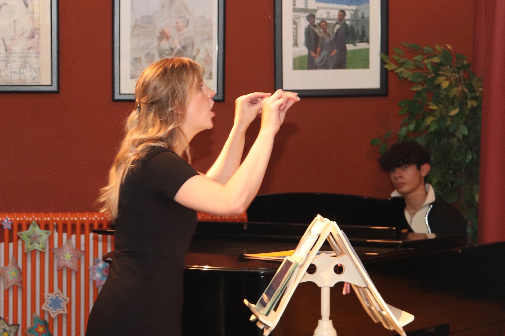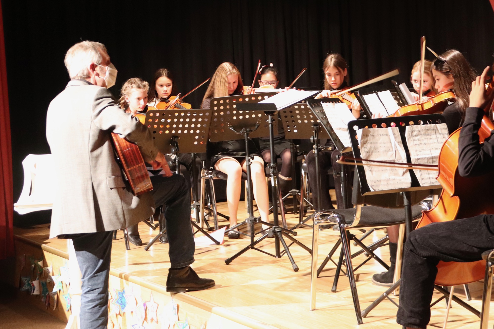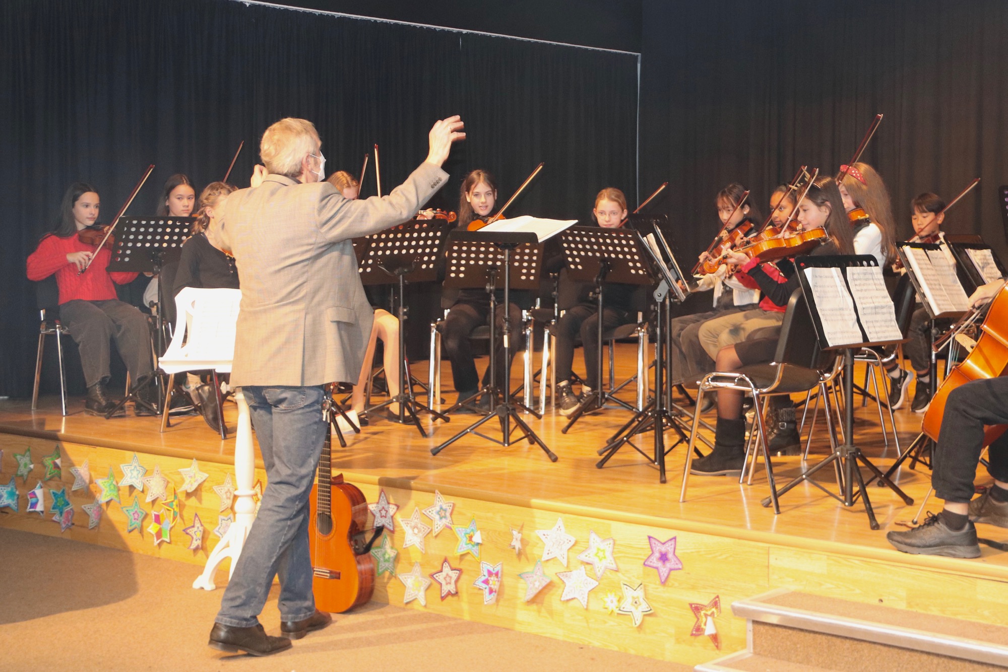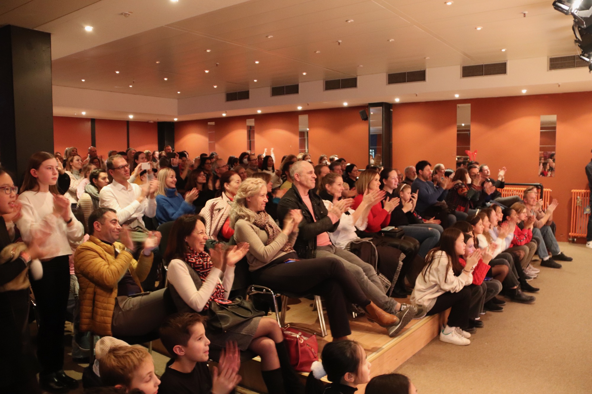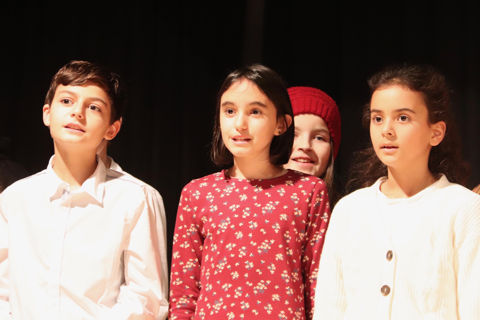 Die Gesangsgruppen unter Leitung von Frau Büttner begeisterten mit schwungvollen Weihnachtsliedern, zunächst "Rudolph the red nosed reindeer" und "Let it snow", gesungen von der Gesangsgruppe der 5. Klasse. Die Gesangsgruppe der 6. Klasse übernahm anschließend die Bühne und versetzte mit "Stille Nacht, heilige Nacht", gesungen in fünf Sprachen (darunter Ukrainisch) und "Santa Claus is Coming To Town" den Theatersaal endgültig in Weihnachtsstimmung. Als schließlich die Gesangsgruppen beider Jahrgangsstufen gemeinsam auf die Bühne traten und "Feliz Navidad" sangen, kannte die Begeisterung des Publikums keine Grenzen mehr. Als Zugabe füllte der spanische Klassiker sogar im Zusammenspiel zwischen Chor und Publikum den Saal mit weihnachtlichen Klängen. Die Chor-Darbietungen begleitete Lucio Ramírez del Prado Vetter (E1) gekonnt am Flügel.