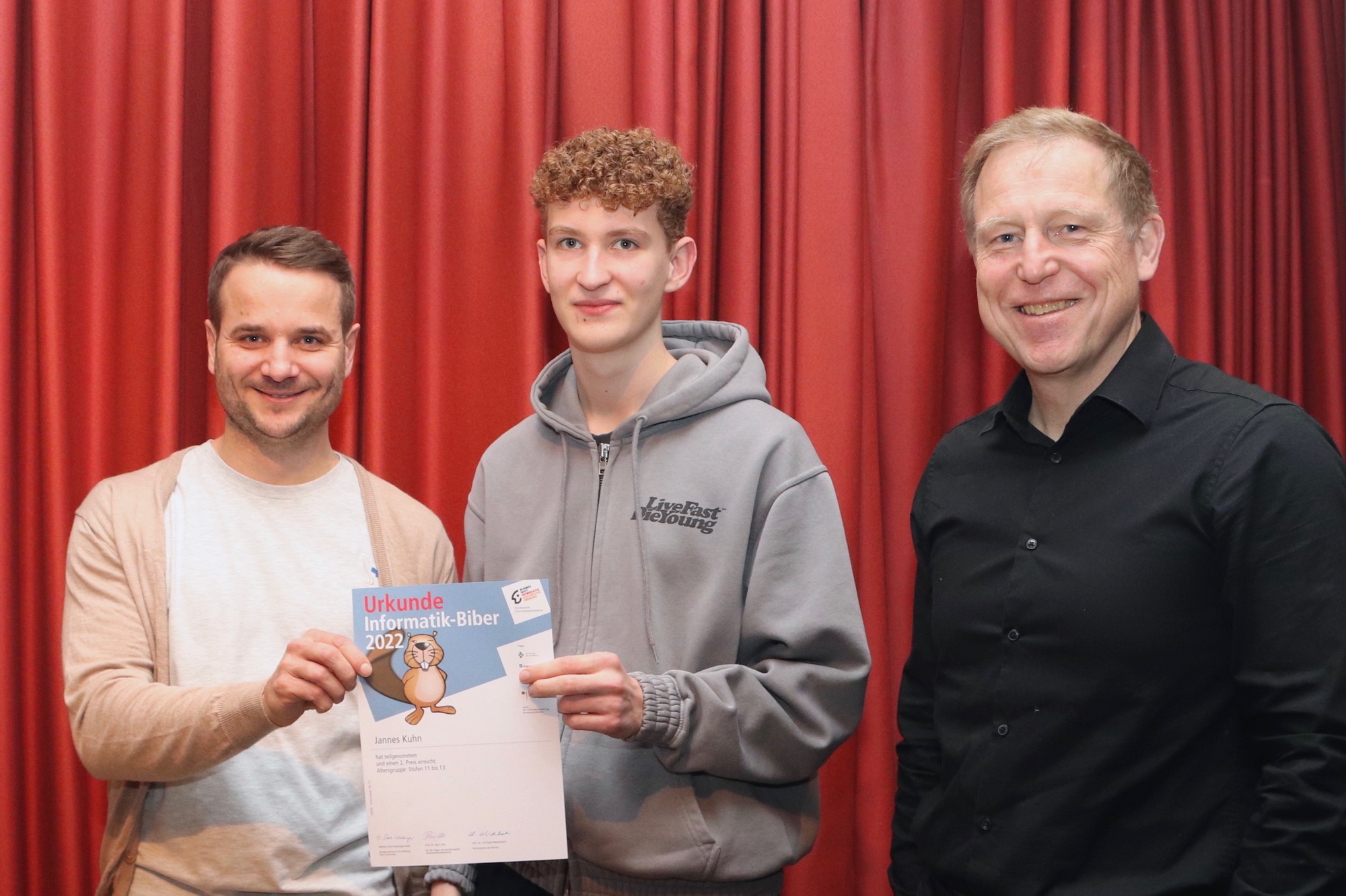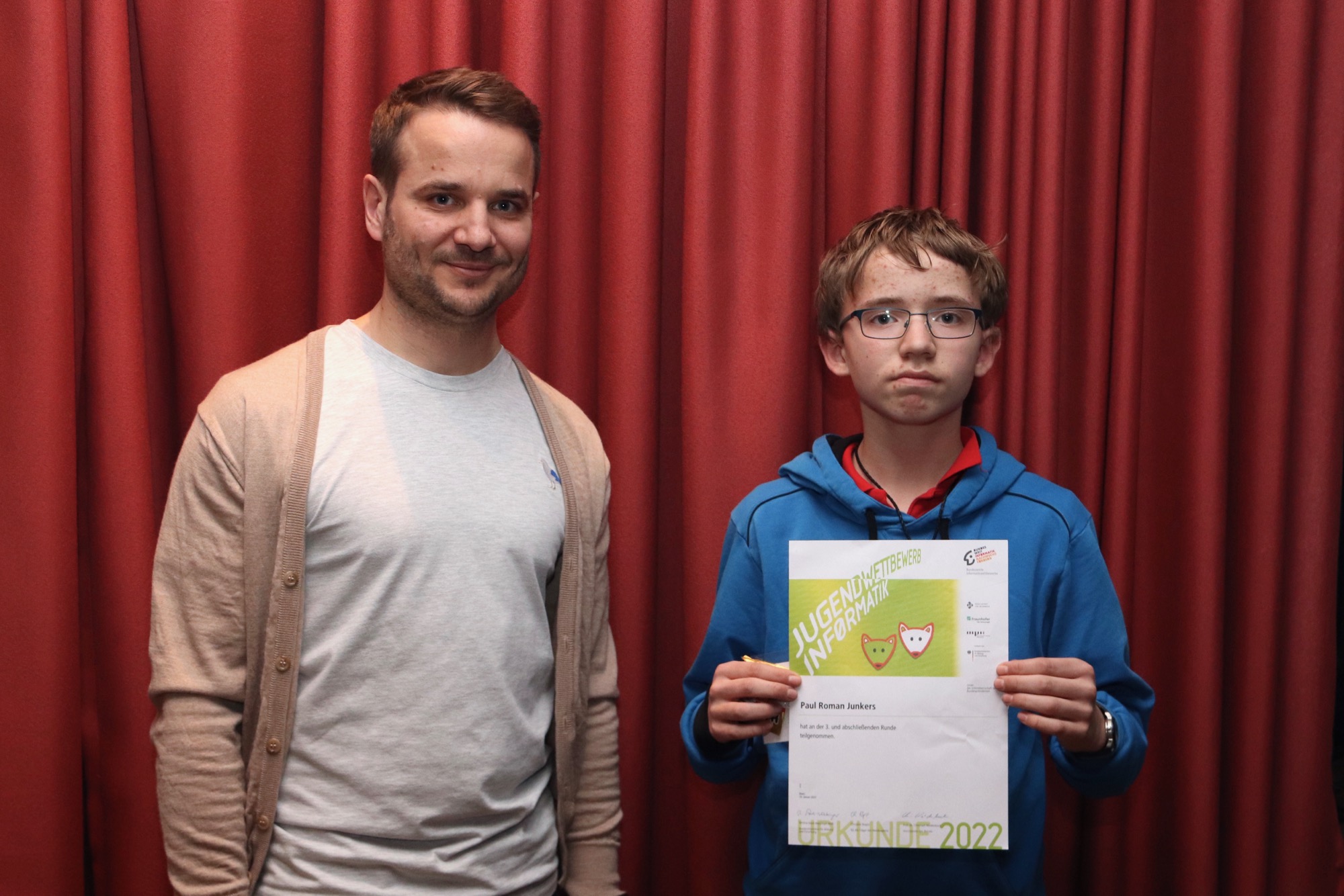 Bei dieser Gelegenheit wurde noch ein weiterer Preisträger geehrt: Paul Junkers hatte am Jugendwettbewerb Informatik teilgenommen und erreichte hierbei die 3. Runde.
