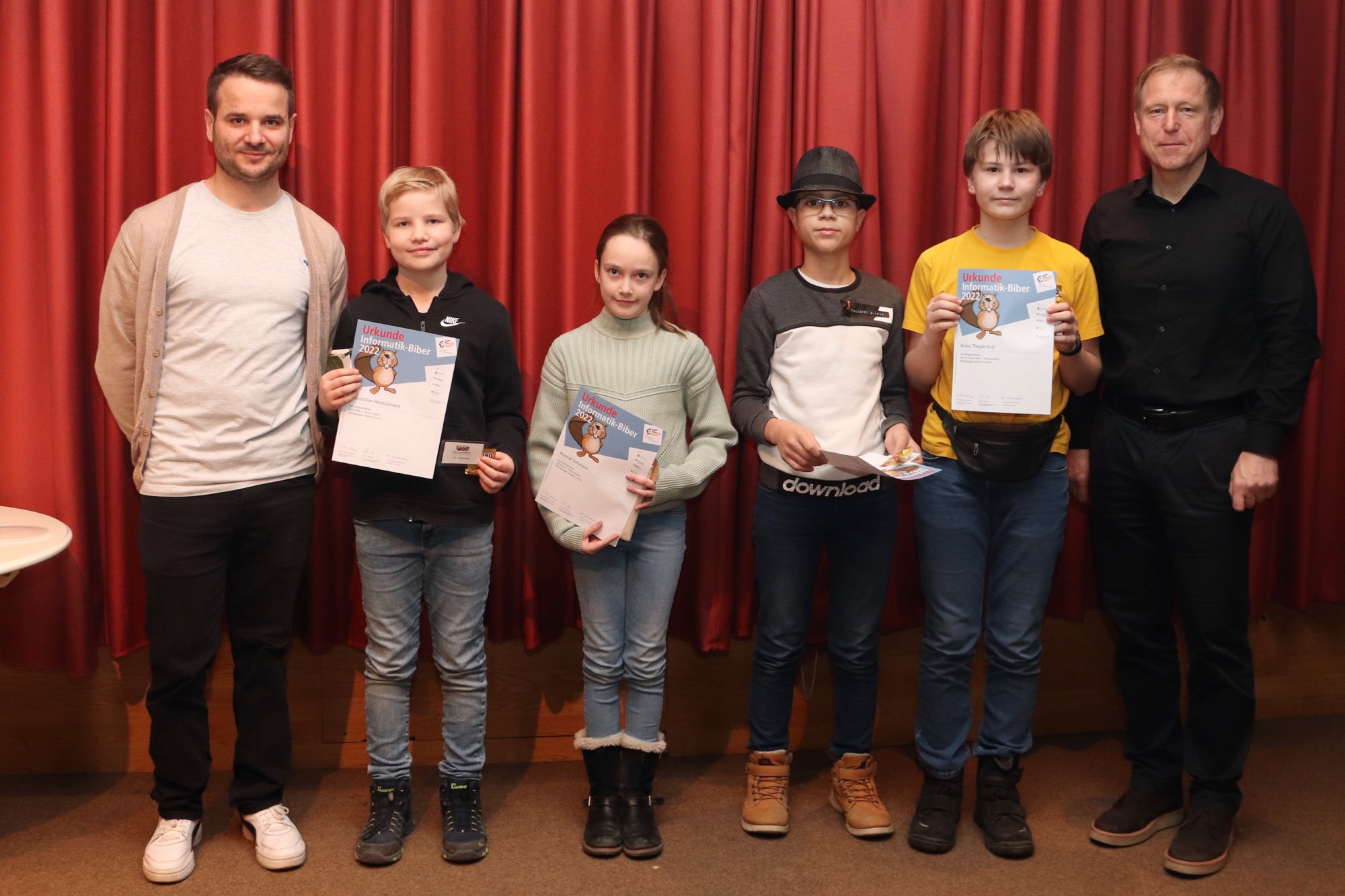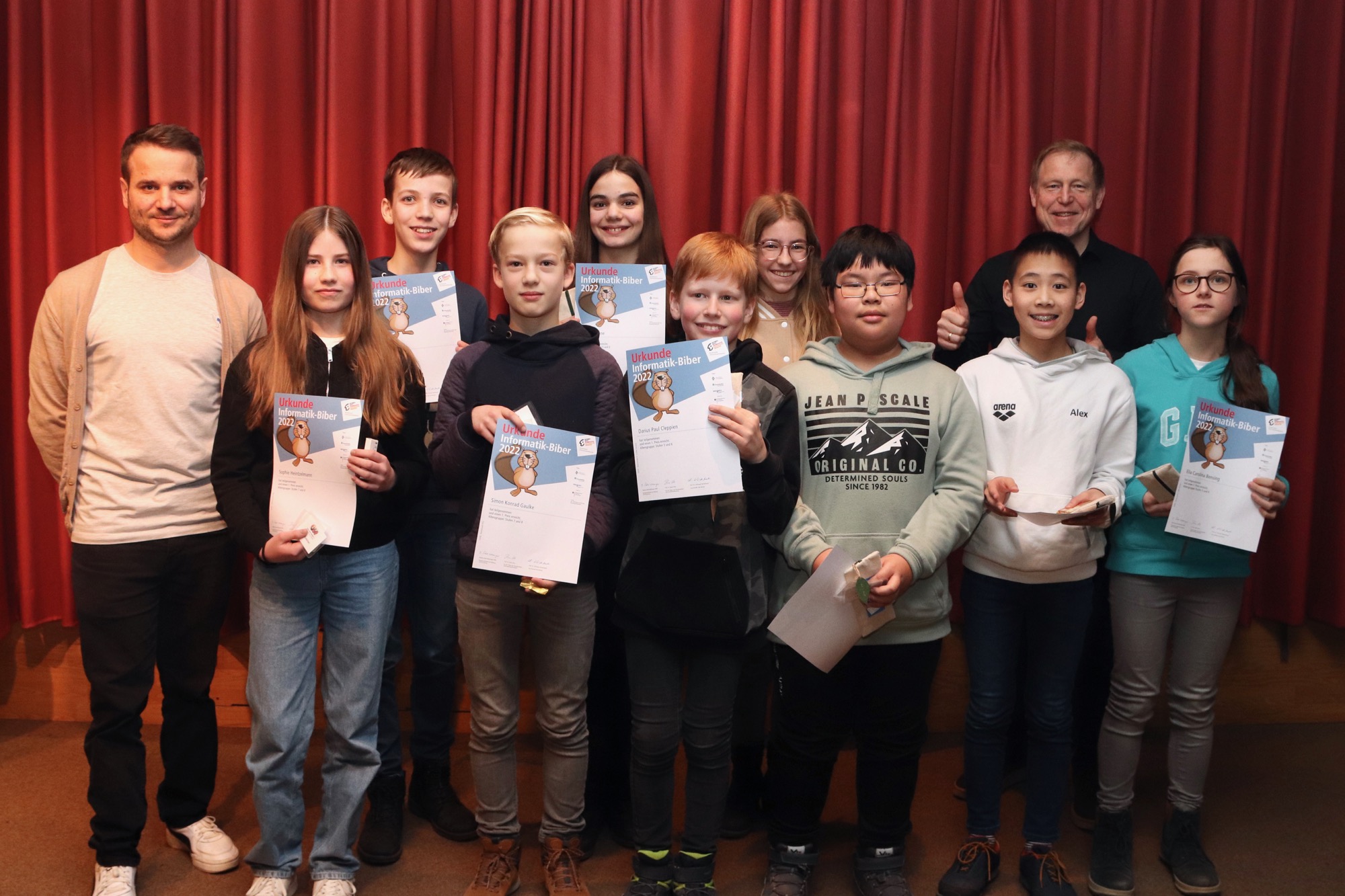 Die Preisverleihung fand nun im Theaterraum statt: Herr Linke und Herr Langner ehrten die erfolgreichsten Teilnehmer*innen, dabei wurden neben Urkunden auch Sachpreise vergeben. So erhielten die 2. Plätze einen Informatik-Biber-Kugelschreiber; die 1. Plätze der Jahrgangsstufen 5 und 6 nahmen ein hochwertiges Holz-Schreibset in Empfang, und die 1. Plätze ab Jahrgangsstufe 7 einen Informatik-Biber-USB-Stick. Weitere Preise stiftete das WoB – die Sieger erhielten jeweils Gutscheine für Leckereien des World of Breakfast.