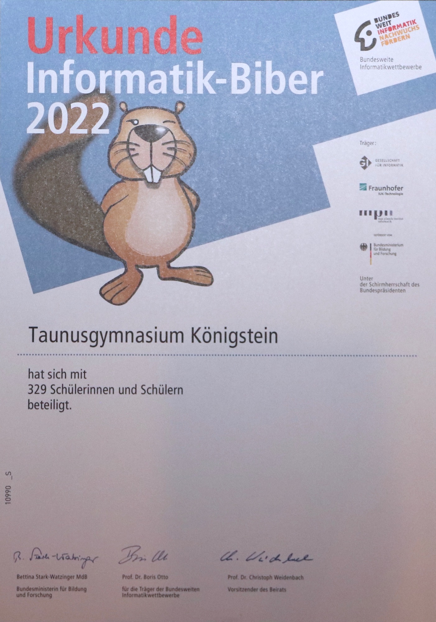 Mit insgesamt 329 Teilnehmer*innen aus allen Jahrgangsstufen des Taumnusgymnasiums erfuhr der bundesweite Wettbewerb „Informatik-Biber“ in diesem Schuljahr wieder regen Zuspruch. Vor allem in den Jahrgangsstufen 5 bis 7 entstand eine regelrechte Welle die Begeisterung, die die Durchführung des Wettbewerbs zu einem „Klassenevent“ werden ließ. Wie es bereits Tradition am Taunusgymnasium ist, organisierte der Informatik-LK der Q4 von Herrn Langner den Wettbewerb – nach 3 Jahren begeisterter Teilnahme und Unterstützung ein würdiger Abschluss.