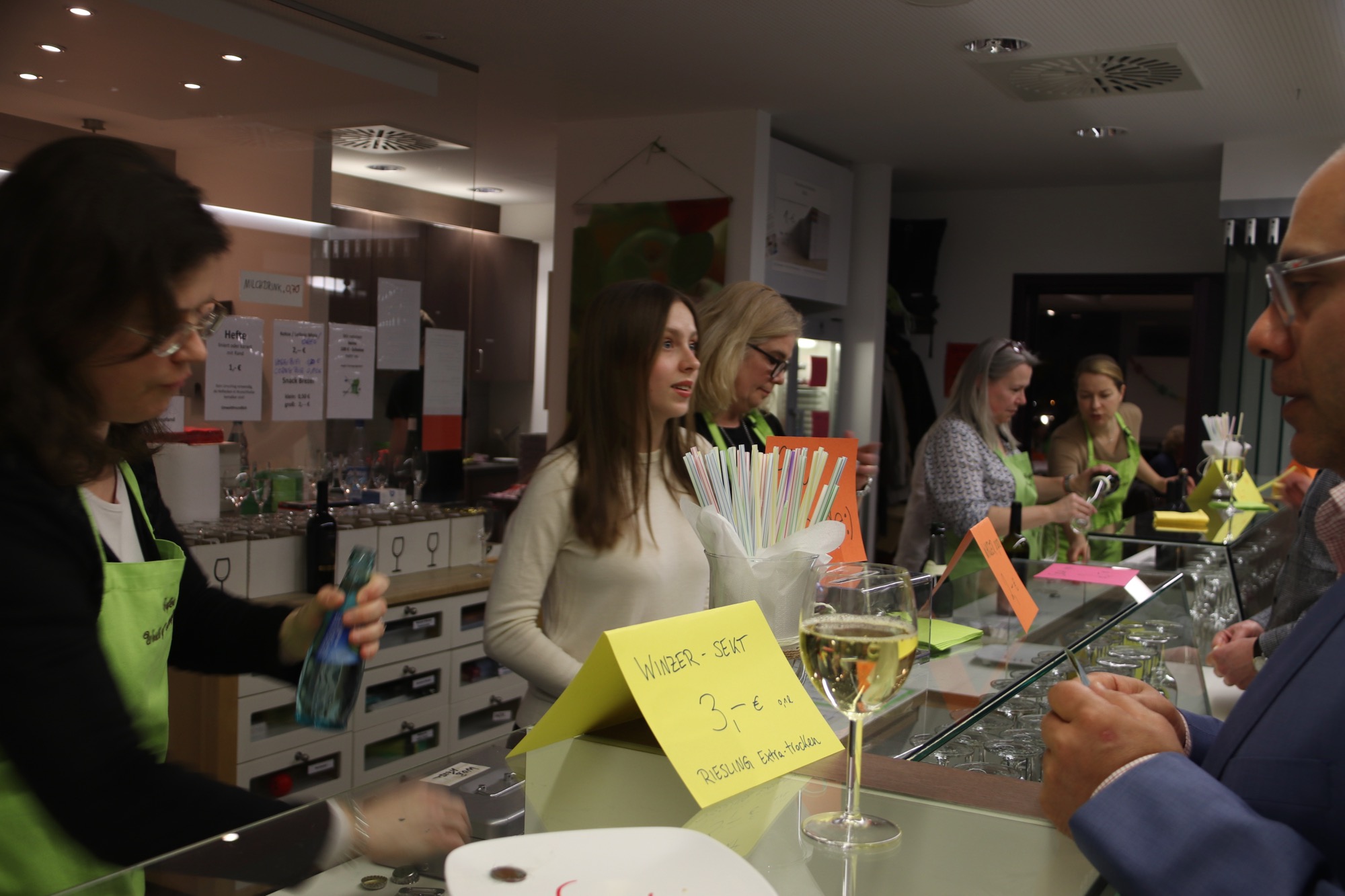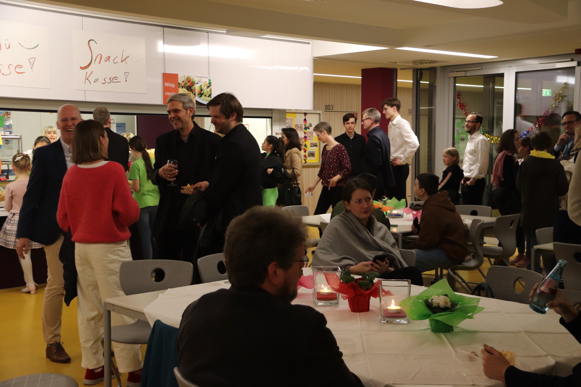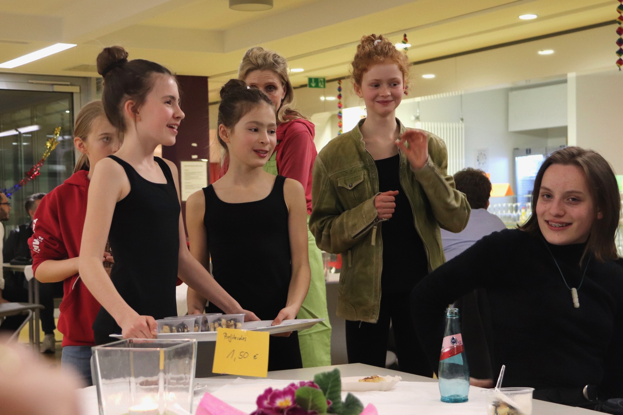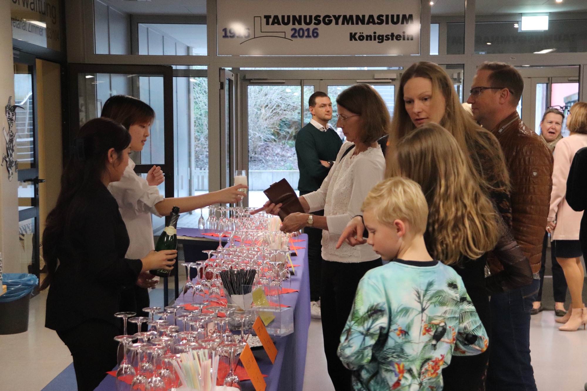 Nachdem Schulleiterin Frau Herbst den beiden Organisatoren Frau Antony und Herrn Rauschmayer für den gelungenen Abend gedankt hatte und Blumen sowie Champagner überreicht hatte, ging es ein Stockwerk tiefer weiter: Der kulinarische Teil des Abends konnte beginnen. Ein engagiertes Team von Schüler*innen-Müttern hatte, unterstützt von Schüler*innen des Abiturjahrgangs 2024, zahllose kleine Leckereien vorbereitet, die zu einer feinen Getränke-Auswahl genossen wurden. Auch ukrainische Mütter trugen landestypischen Spezialitäten zum reichhaltigen Büffet bei. Und so wurde in stimmungsvoller Atmosphäre noch lange über die zahlreichen Talente geplaudert, die das Taunusgymnasium immer wieder hervorbringt. Und die man nun gerne wieder regelmäßig jährlich live auf der Bühne bewundern möchte. (Rmy)