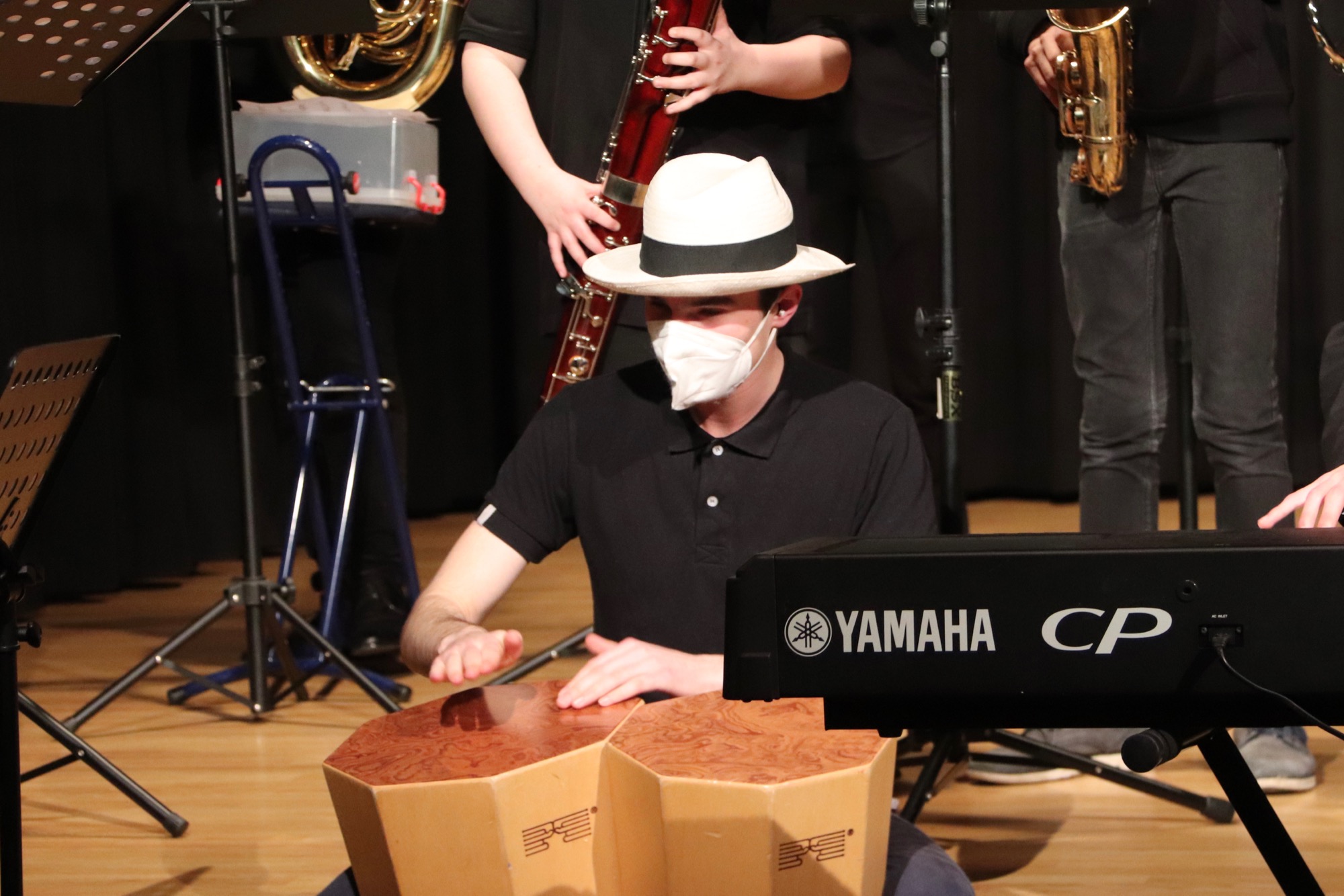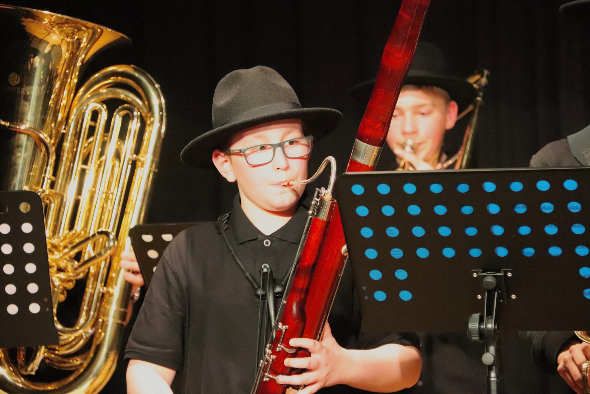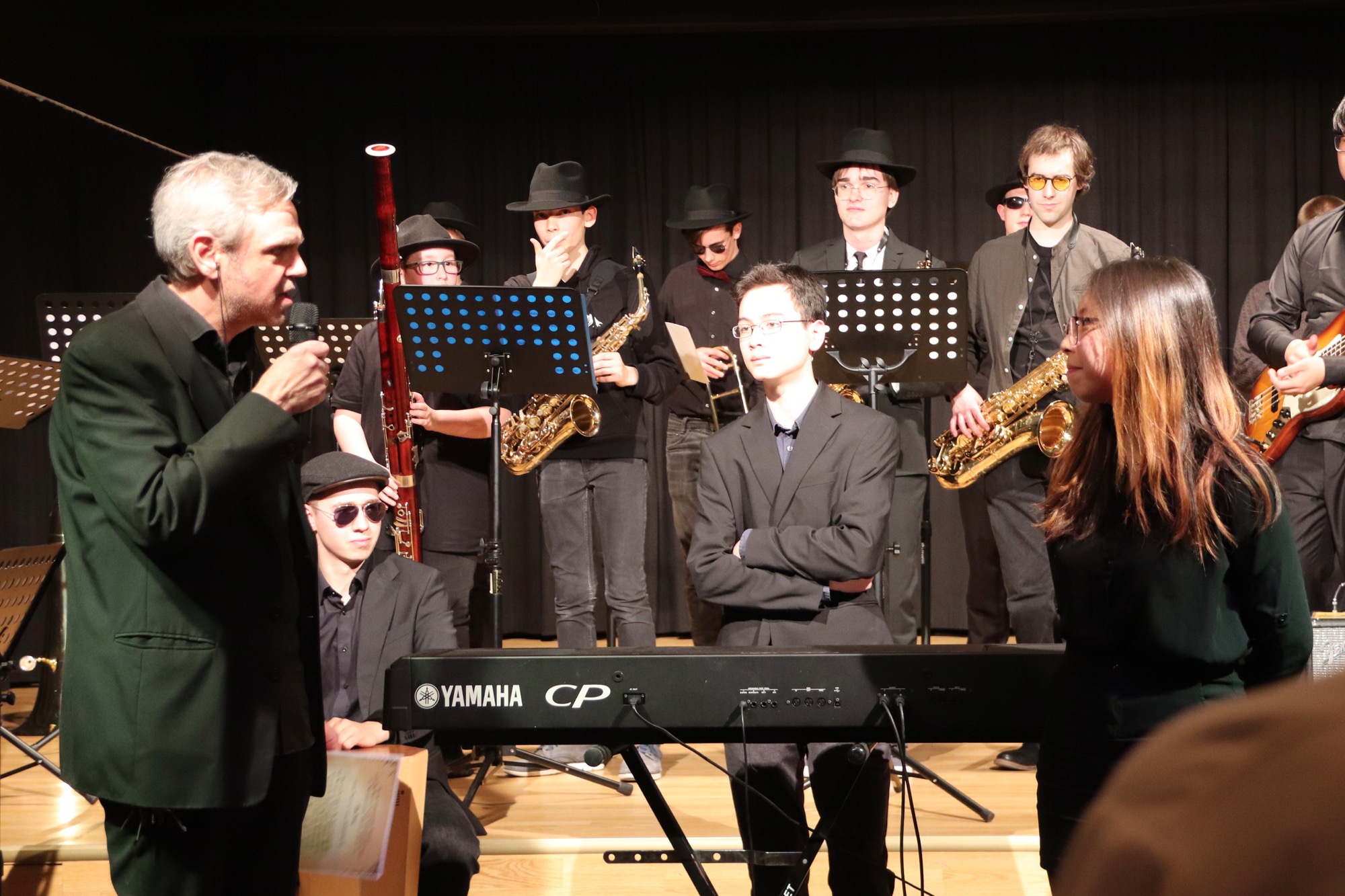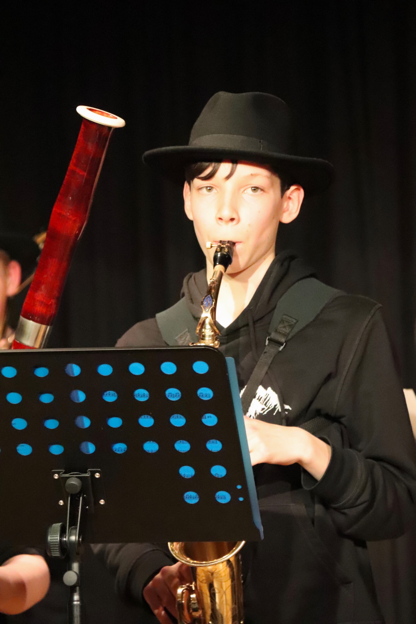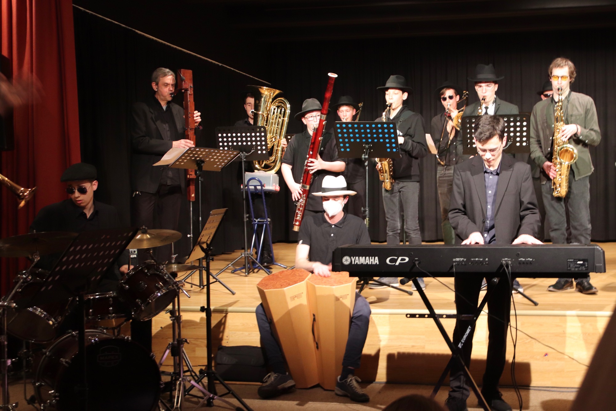 Zahlreich hatten sich die Kulturinteressierten eingefunden, einige genossen zuvor noch ein Glas Sekt im Foyer. Und dann ging es los: Wie es mittlerweile schon Tradition ist, startete die TGK-BigBand unter der Leitung von Herrn Kriegeskotte und Herrn Hublow. Mit den Stücken „Smoke on the Water“ in einem Hublow-Arrangement und „White dressed Rabbits“, die voller Intensität und Groove gespielt wurden, versetzte die BigBand den voll besetzten Theaterraum in Schwingung. Dass sich zur Besetzung der BigBand mit Noah Karls, Jani Laakso und Lukas Kieslich auch drei Ehemalige des Taunusgymnasiums gesellt hatten, war einmal mehr ein Zeichen für die verbindende Kraft der Musik. Für Aufsehen sorgte auch die elektrifizierte Kastenflöte, auf der Herr Hublow solierte.