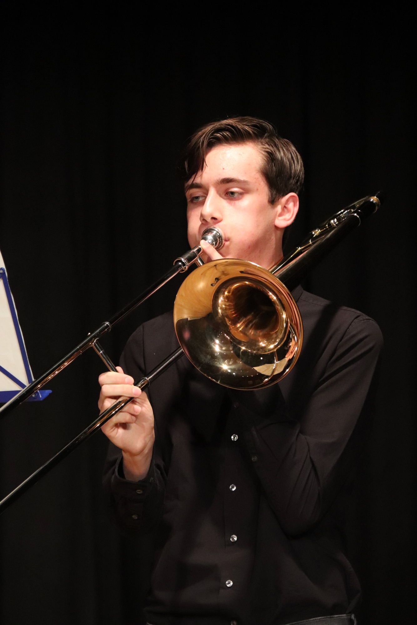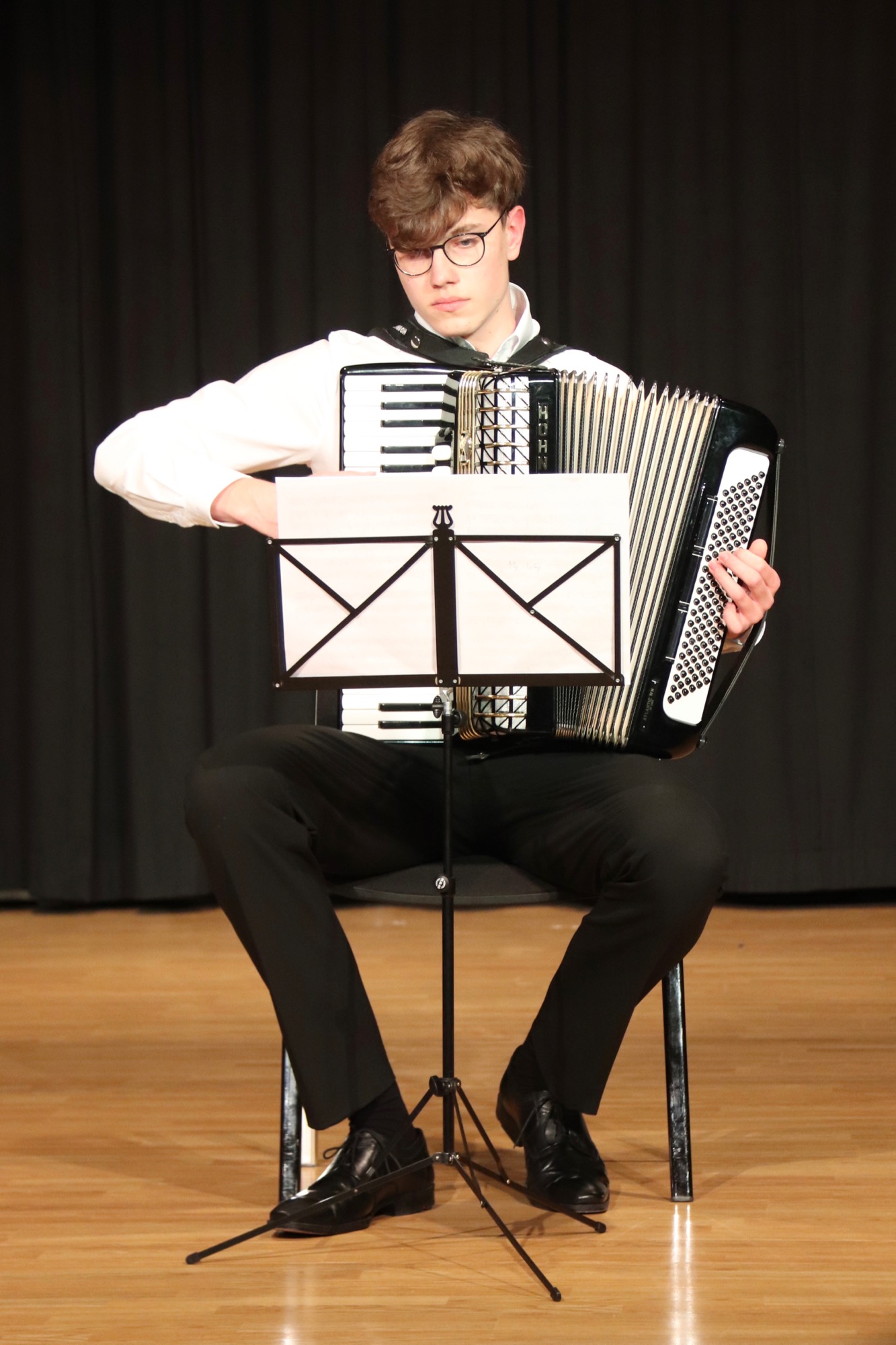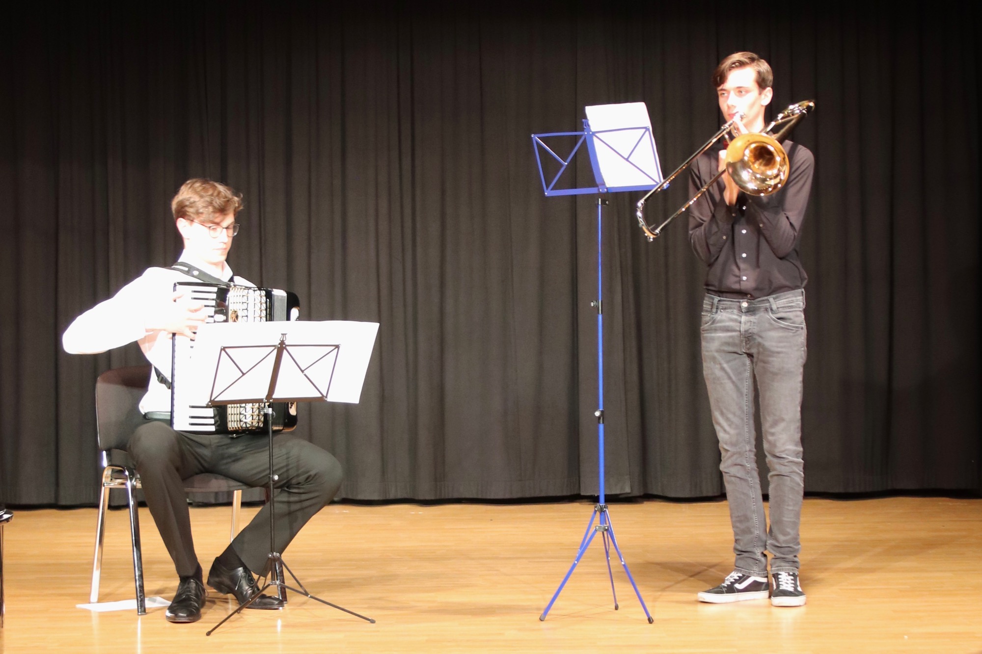 Ein eher selten zu hörendes Instrument brachte Sander Bock (Q2) zum Erklingen: Am Akkordeon spielte er die jüdische Volksweise „Klezmer-Champion“ und beeindruckte dabei mit seiner Fingerfertigkeit. Zu ihm gesellte sich daraufhin Felix Weiland (Q2) mit seiner Posaune; gemeinsam spielten sie das weltbekannte „My Way (Comme d’habitude)“, das im Arrangement von Sander und aufgrund der ungewöhnlichen Instrumentenkombination durchaus frisch und neuartig klang.
