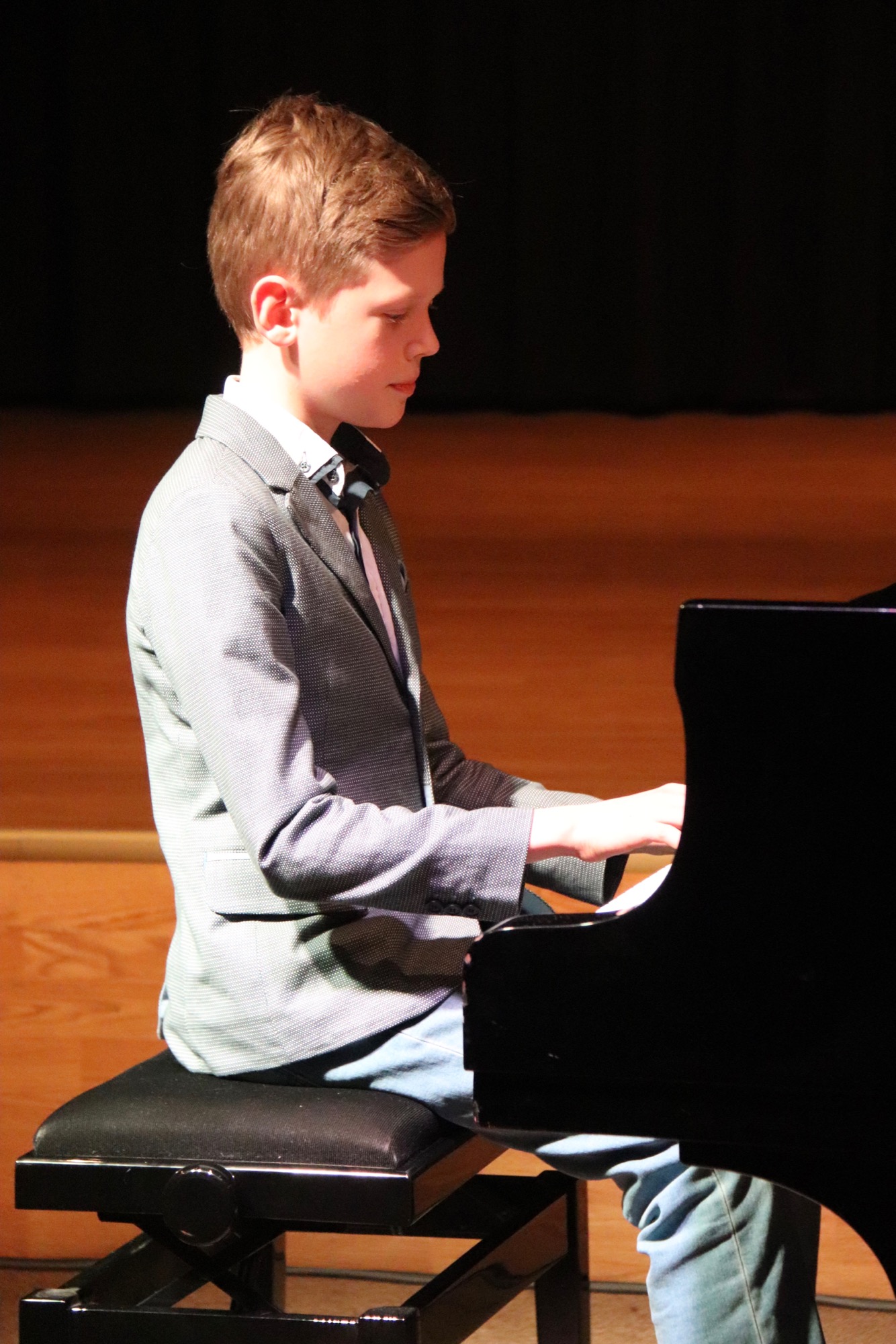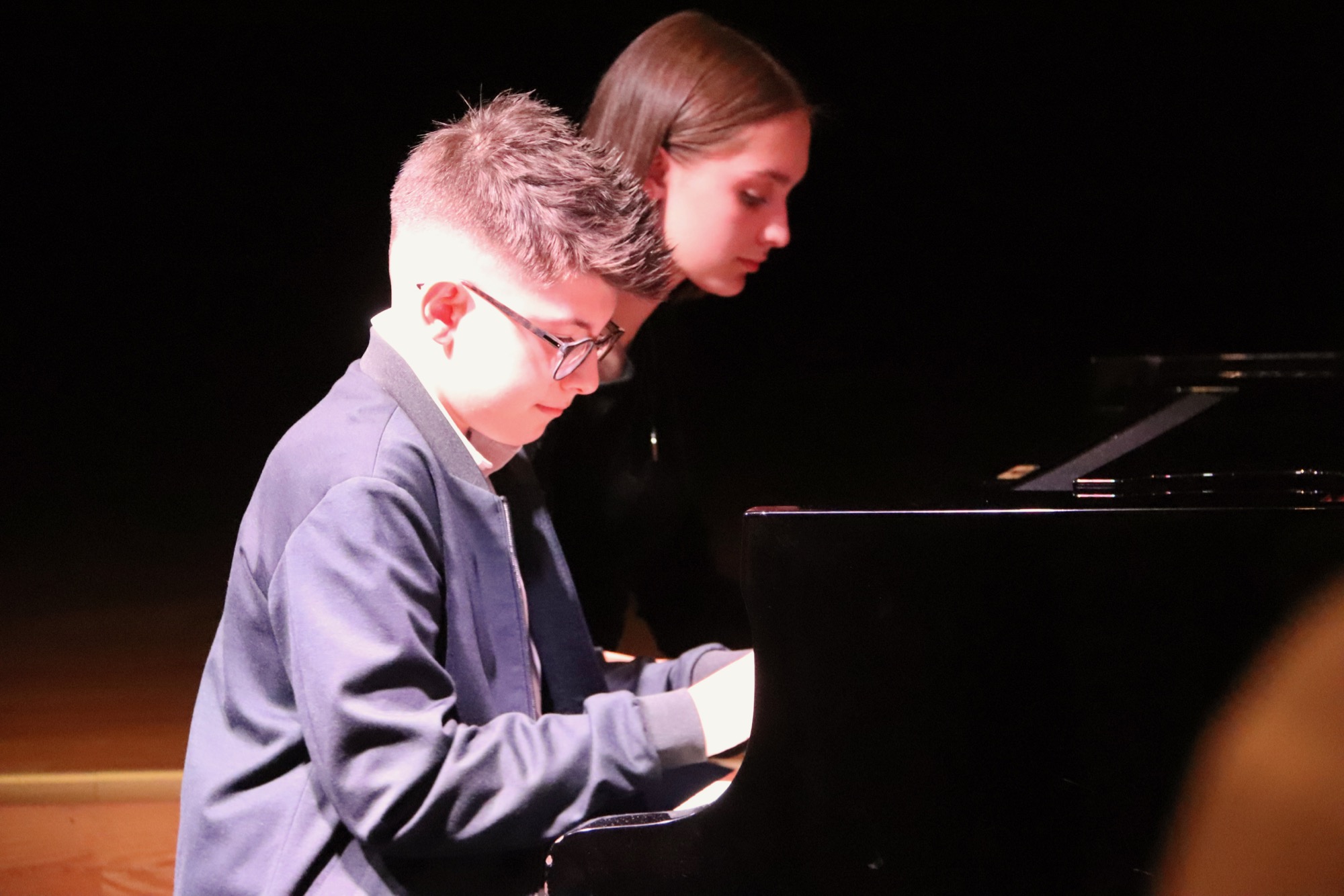 Mit Raphael Jähnig (5e) kam anschließend ein ganz neues, junges Klaviertalent auf die Bühne und verzückte das Publikum mit „Hedwig’s Theme“ von John Williams. Mit Mats Bielman (6a) und Alexandra Wenzler (9f) hatten sich zwei weitere Klavierbegeisterte zusammengetan, um vierhändig den Walzer Op. 39, No. 3 von Johannes Brahms darzubieten.