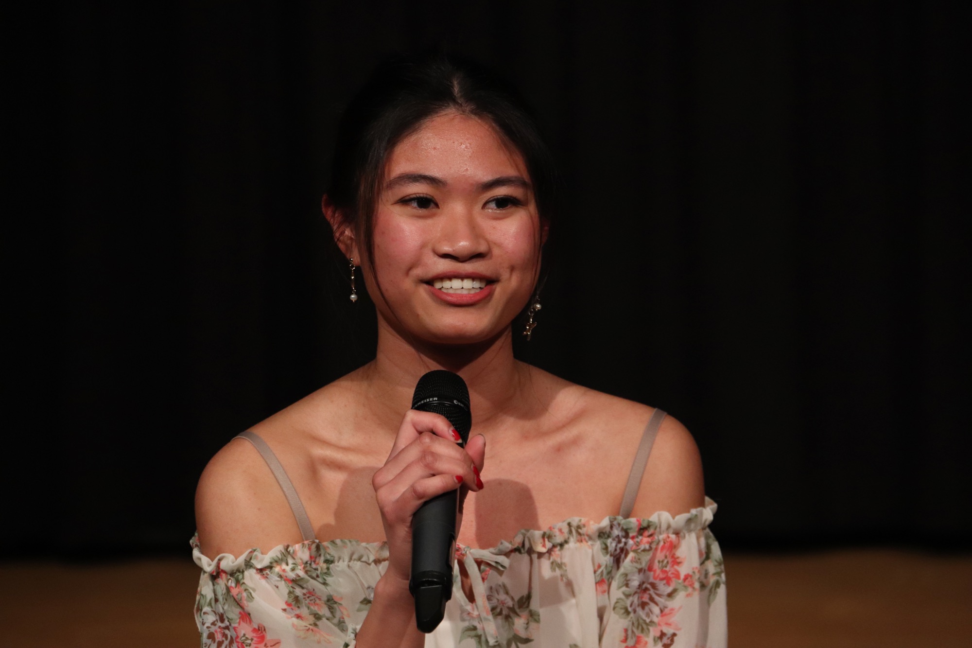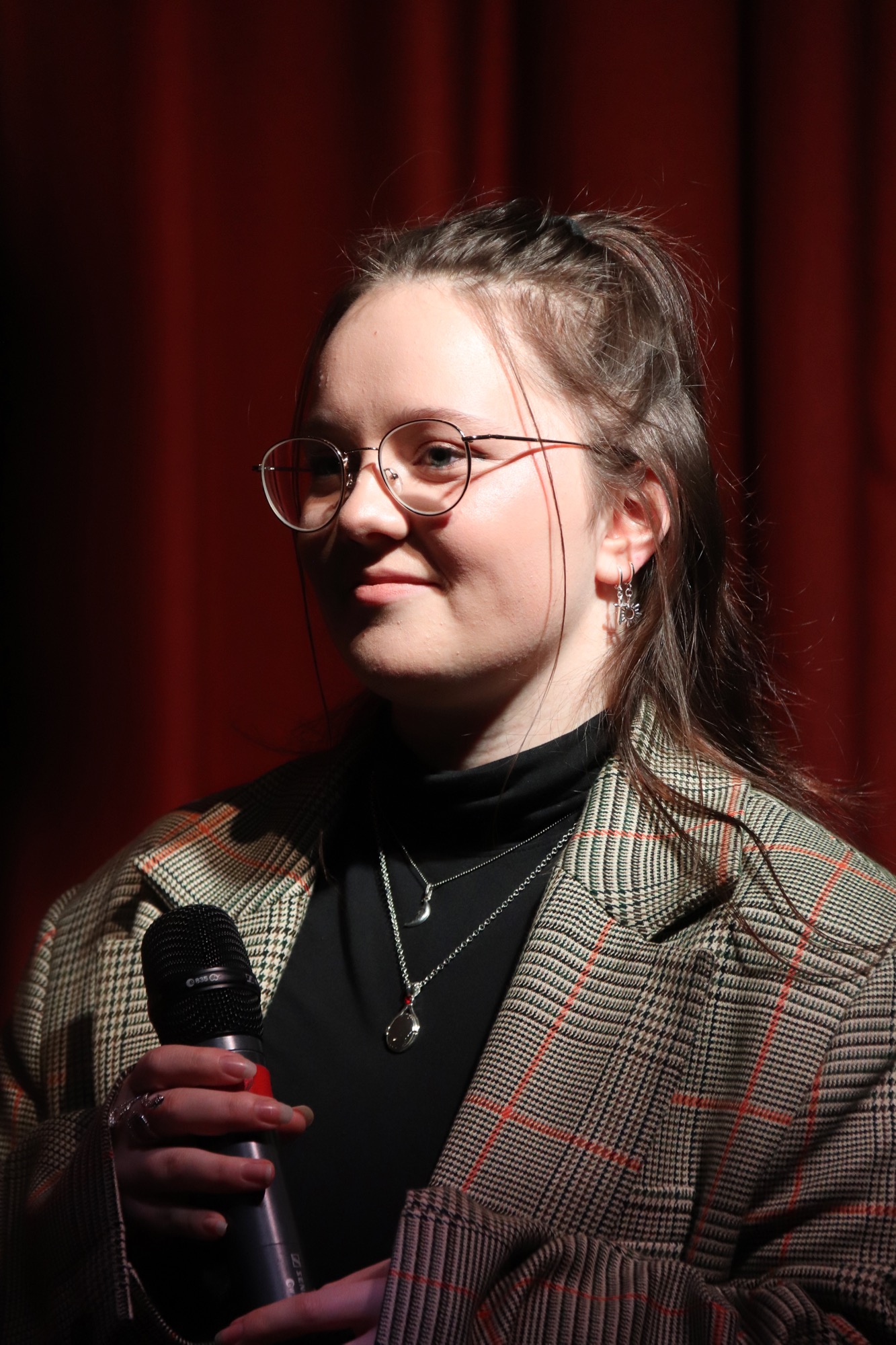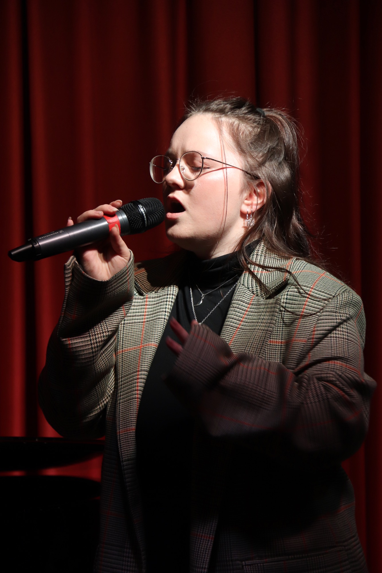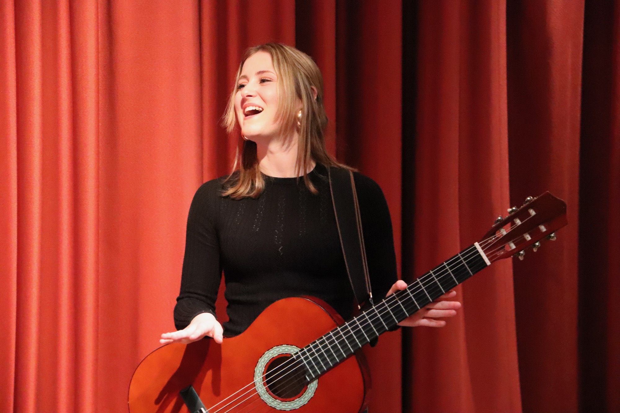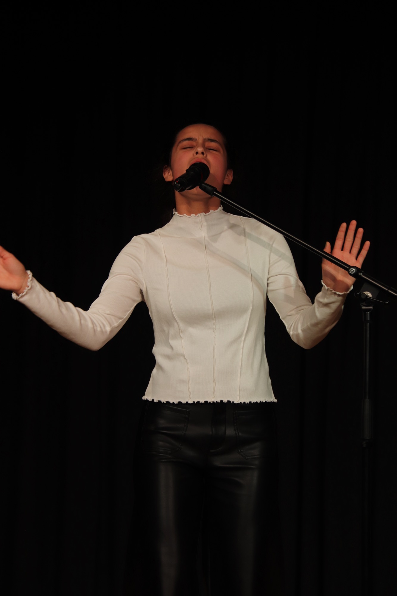 Die Singer-Songwriterin Laura Bachmann (Q4), ebenfalls eine langjährige Kulti-Mitwirkende, sang gefühlvoll den selbst geschriebenen und sehr eingängigen Popsong „Floating“ und begleitete sich dabei selbst auf der Gitarre. Lorena Wack (Q4) interpretierte überzeugend den anspruchsvollen Song „Million Dollar Man“ von Lana del Rey und wurde dabei von Frau Büttner souverän am Flügel begleitet.