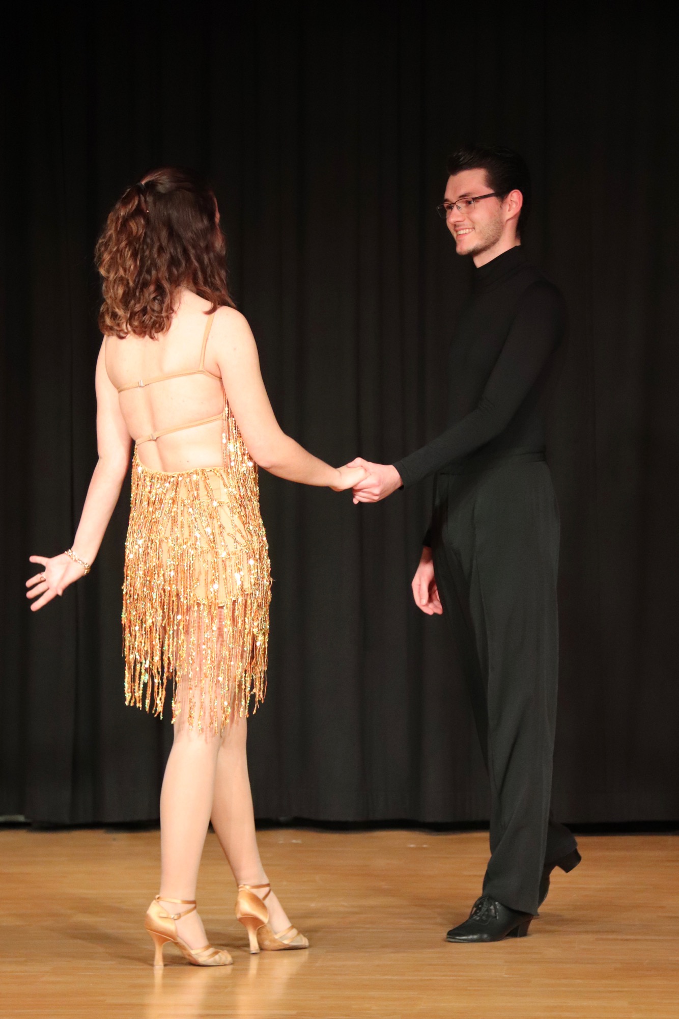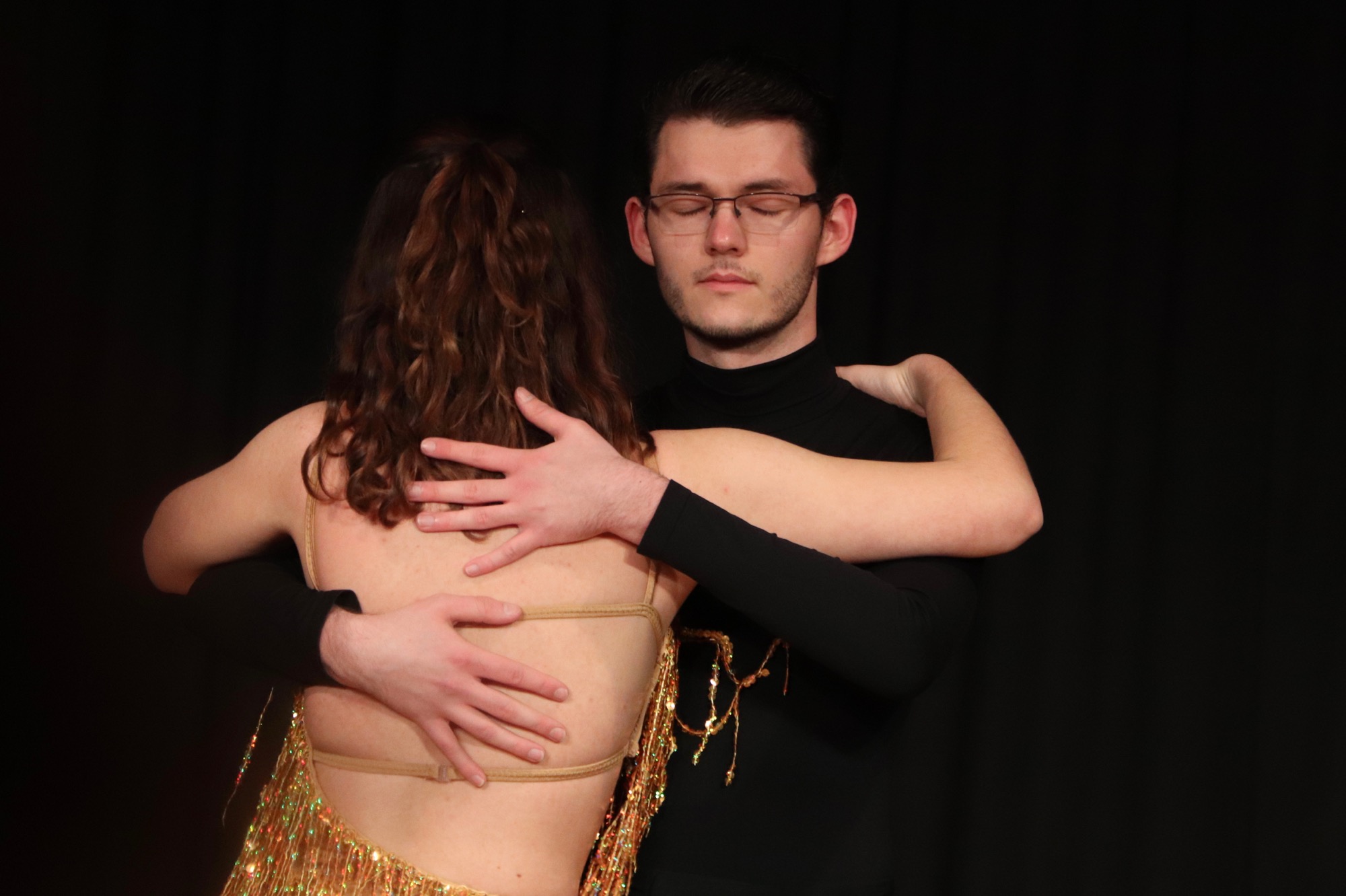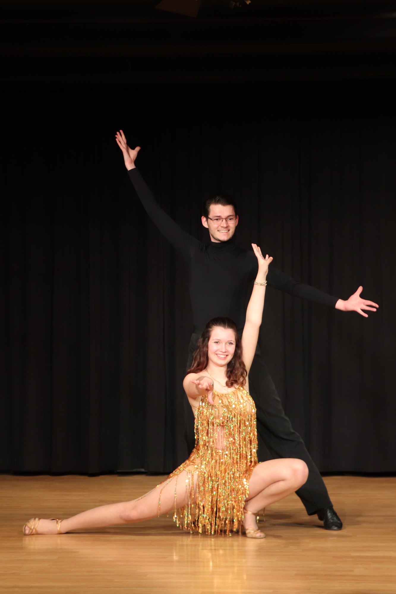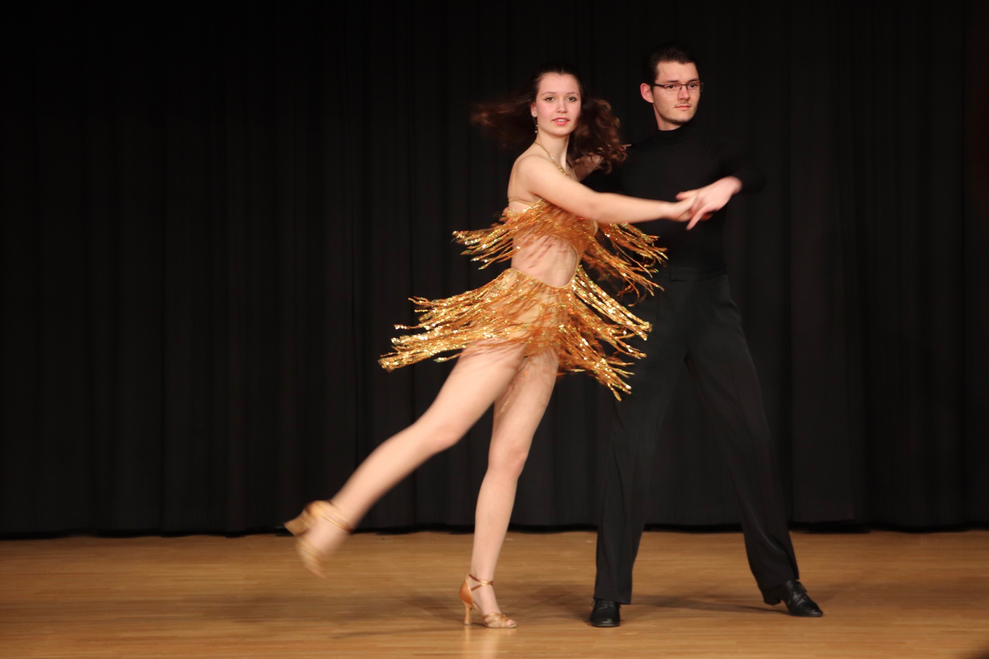 Auch Tanz ist immer wieder ein wichtiges Element des Kul(tur)inarischen Abends. Und unterschiedlicher konnten die Tanzstile der nun folgenden Künstler*innen kaum sein: Von Contemporary über Latin bis hin zu Hip-Hop entfaltete sich die Vielfalt dieser Kunstform auf der Bühne des Theaterraums. Zunächst führten die beiden Geschwisterpaare Hannah Diedrich (6d) und Nanni Diedrich (als Gast) sowie Anna und Kira Milke (6d) ihre selbst erarbeitete Choreographie „Aus der Spur“ auf und überzeugten mit ihrer anspruchsvollen und ausdrucksstarken Performance. Noah Quandt (7g), hessischer Vizemeister im Showtanz, brachte anschließend mit seinen wahrlich akrobatischen Hip-Hop-Tanzkünsten zum Song „Out Out“ den Theaterraum zum Beben. Hannah Toma (Q2) und der frühere Taunusgymnasiast Florian Menigat zeigten mit ihrer „Latin Ballroom Show“, wie anmutig und mitreißend moderner Paartanz aussehen kann.
