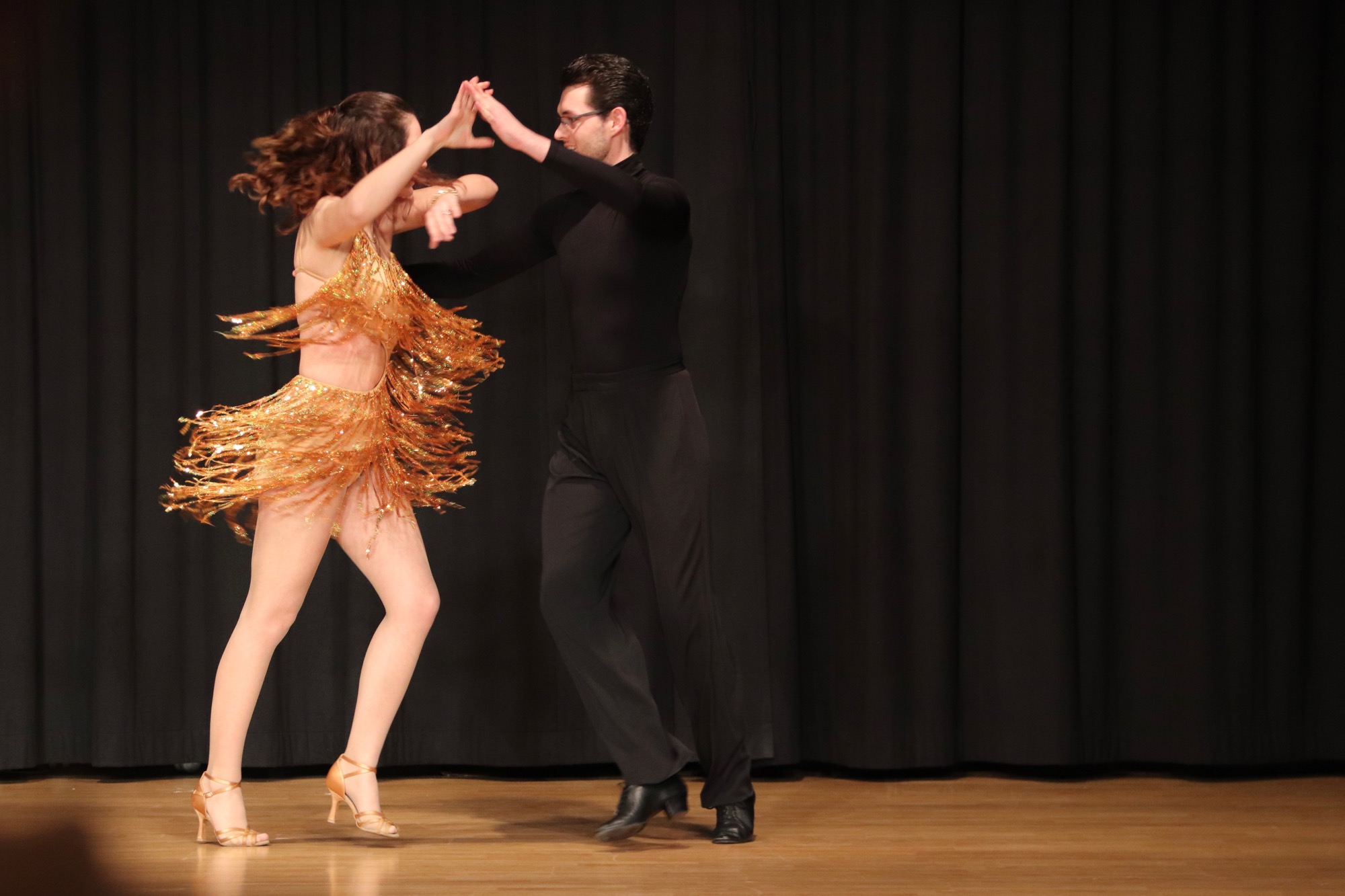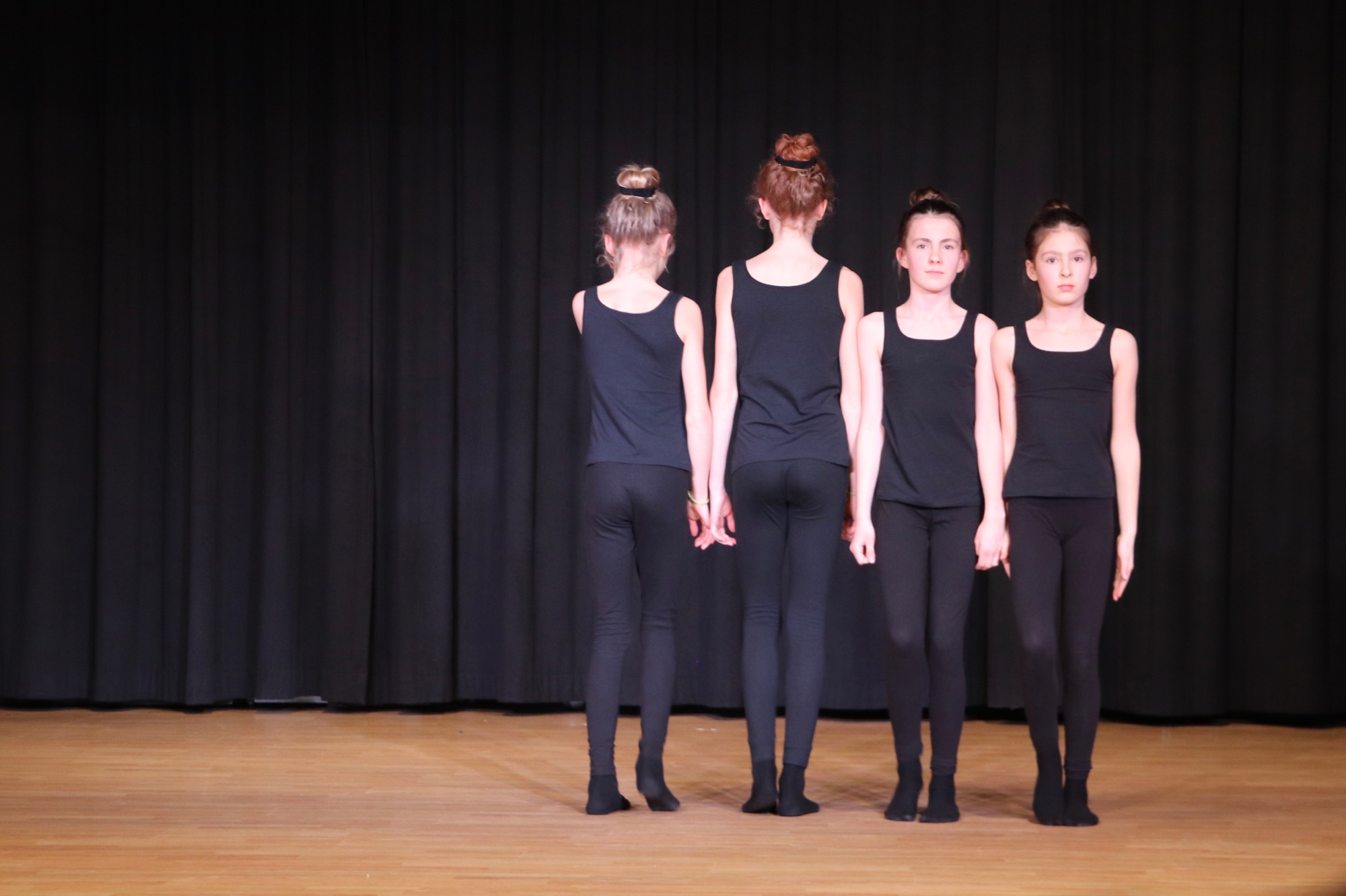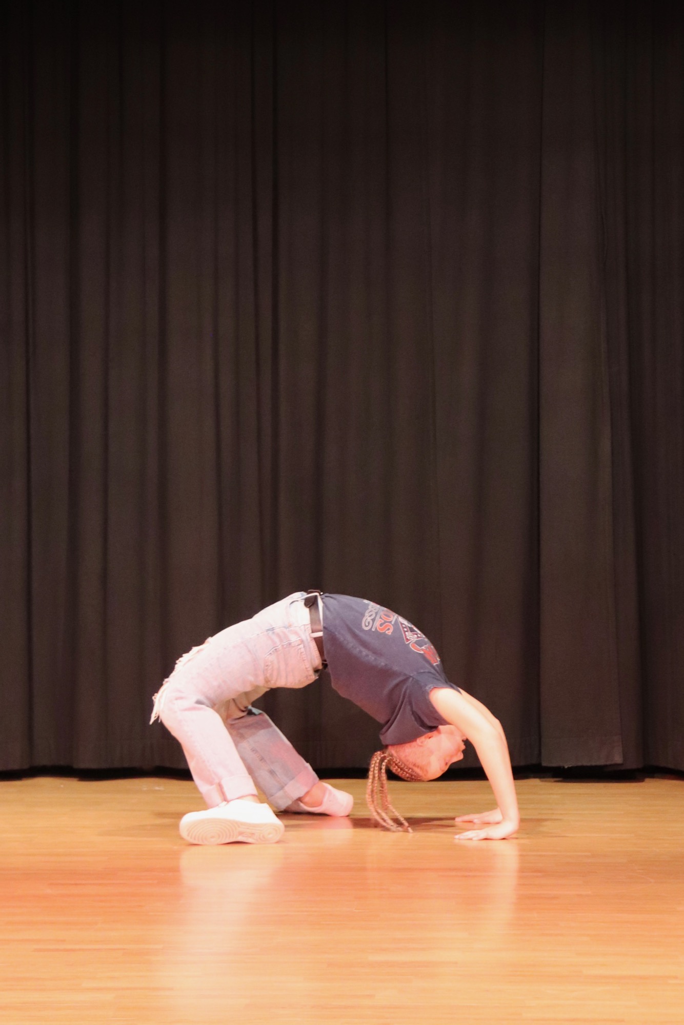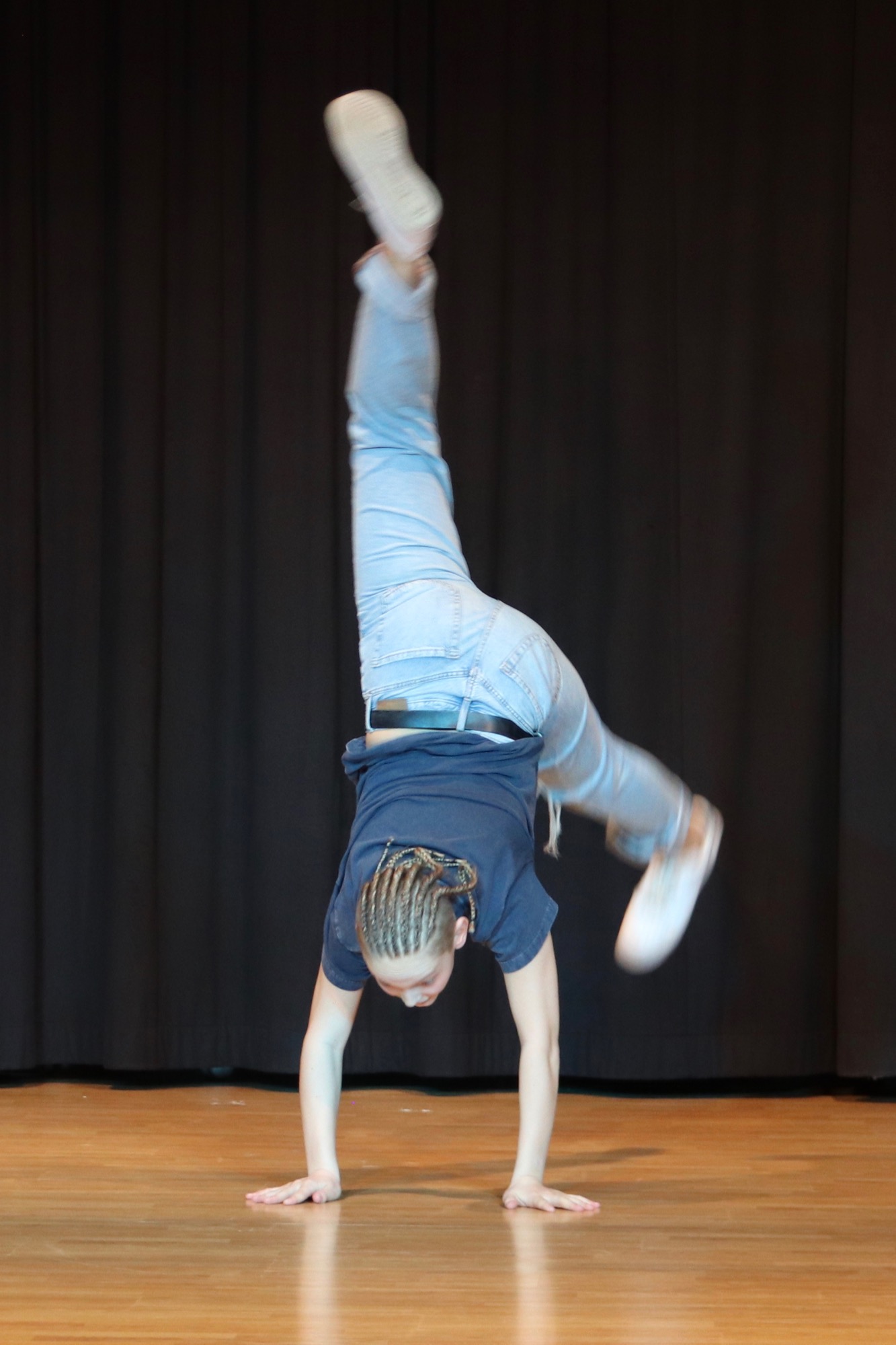 Auch Tanz ist immer wieder ein wichtiges Element des Kul(tur)inarischen Abends. Und unterschiedlicher konnten die Tanzstile der nun folgenden Künstler*innen kaum sein: Von Contemporary über Latin bis hin zu Hip-Hop entfaltete sich die Vielfalt dieser Kunstform auf der Bühne des Theaterraums. Zunächst führten die beiden Geschwisterpaare Hannah Diedrich (6d) und Nanni Diedrich (als Gast) sowie Anna und Kira Milke (6d) ihre selbst erarbeitete Choreographie „Aus der Spur“ auf und überzeugten mit ihrer anspruchsvollen und ausdrucksstarken Performance. Noah Quandt (7g), hessischer Vizemeister im Showtanz, brachte anschließend mit seinen wahrlich akrobatischen Hip-Hop-Tanzkünsten zum Song „Out Out“ den Theaterraum zum Beben. Hannah Toma (Q2) und der frühere Taunusgymnasiast Florian Menigat zeigten mit ihrer „Latin Ballroom Show“, wie anmutig und mitreißend moderner Paartanz aussehen kann.
