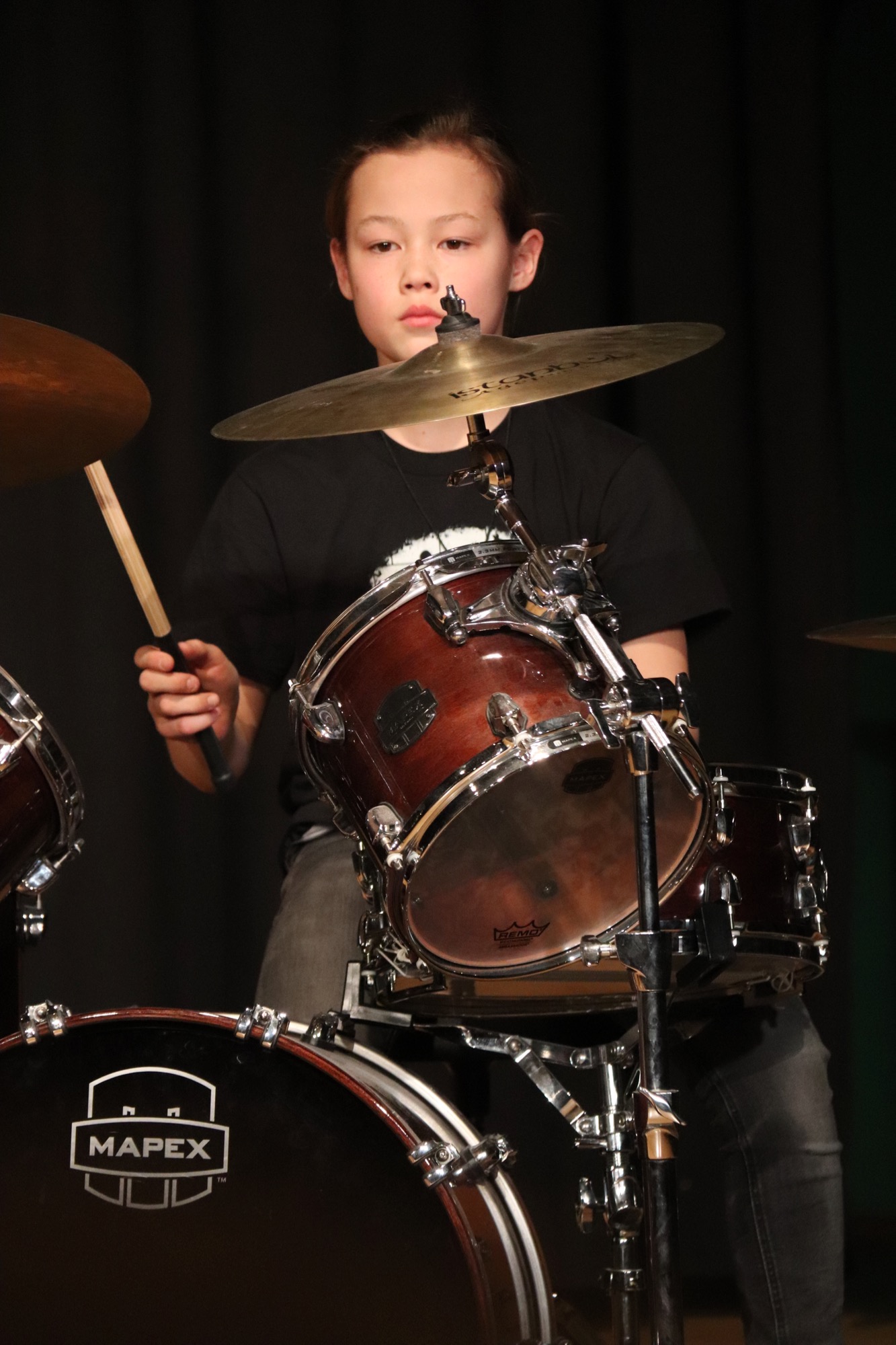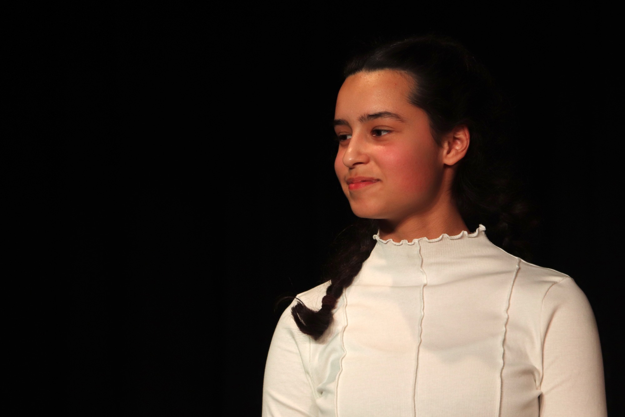 Eine ganz neue Formation hatte sich nun auf der Bühne eingefunden: Die Schüler*innen-Band, geleitet von Frau Strecker, trat zum ersten Mal auf und brachte den Song „Keeping me alive“ zu Gehör. Die Sängerin Soraya Wingenter (7f) zog das Publikum mit ihrem ausdrucksstarken Gesang in den Bann; begleitet wurde sie dabei von Linus Fujita (6d) am Schlagzeug, Lucio Ramírez del Prado Vetter (E2) am Flügel sowie – kurzfristig eingesprungen – Siar Yildiz an der Gitarre.