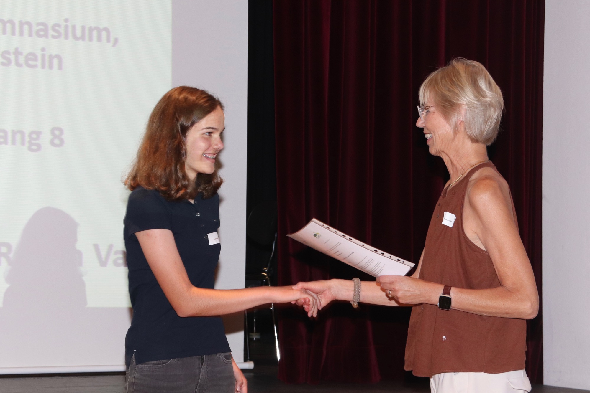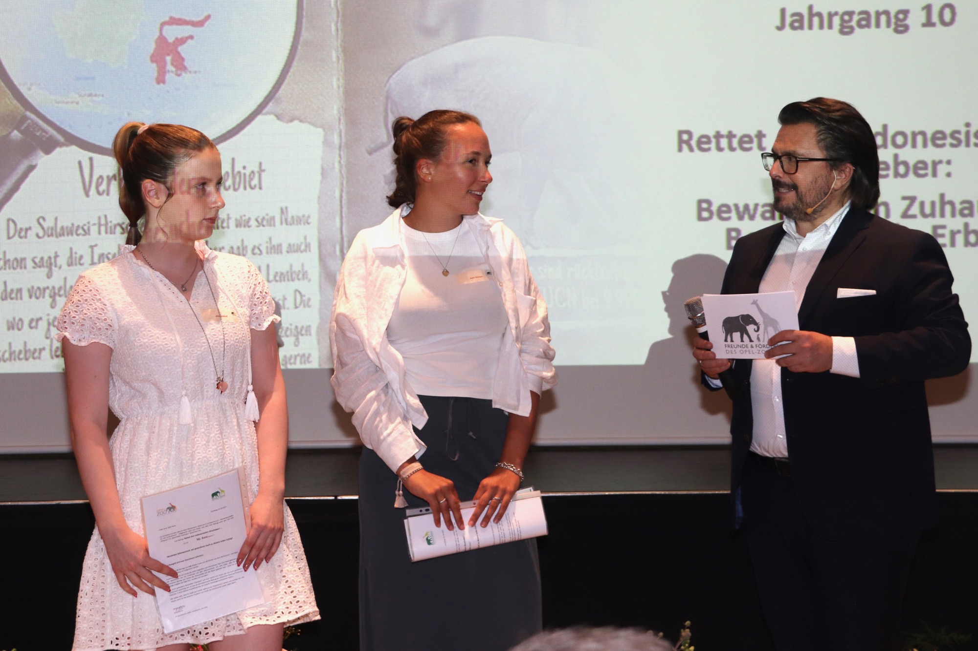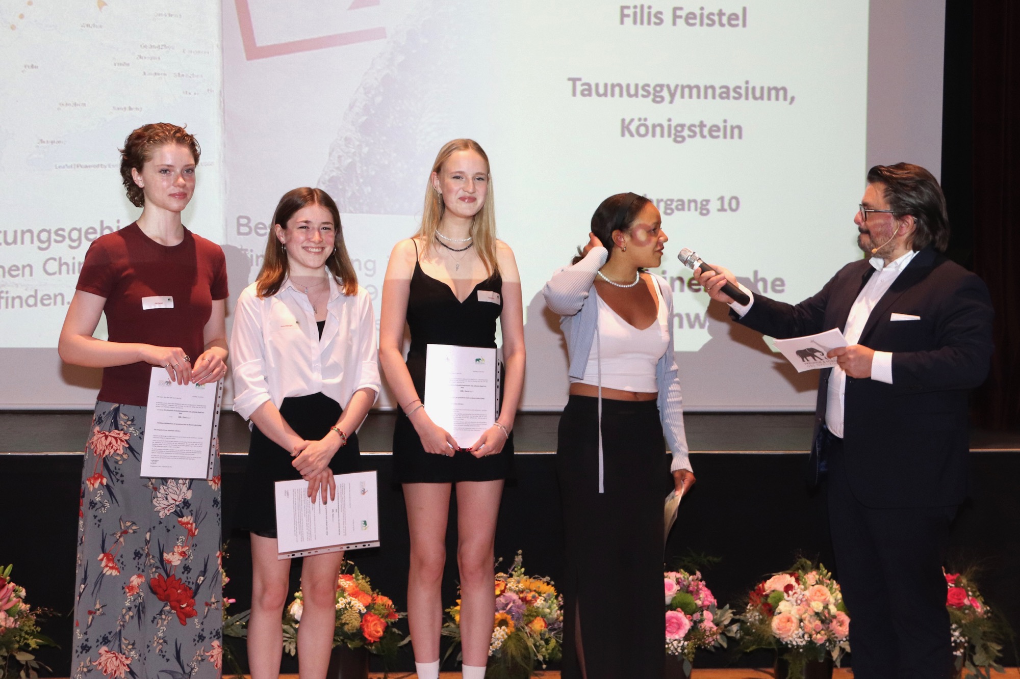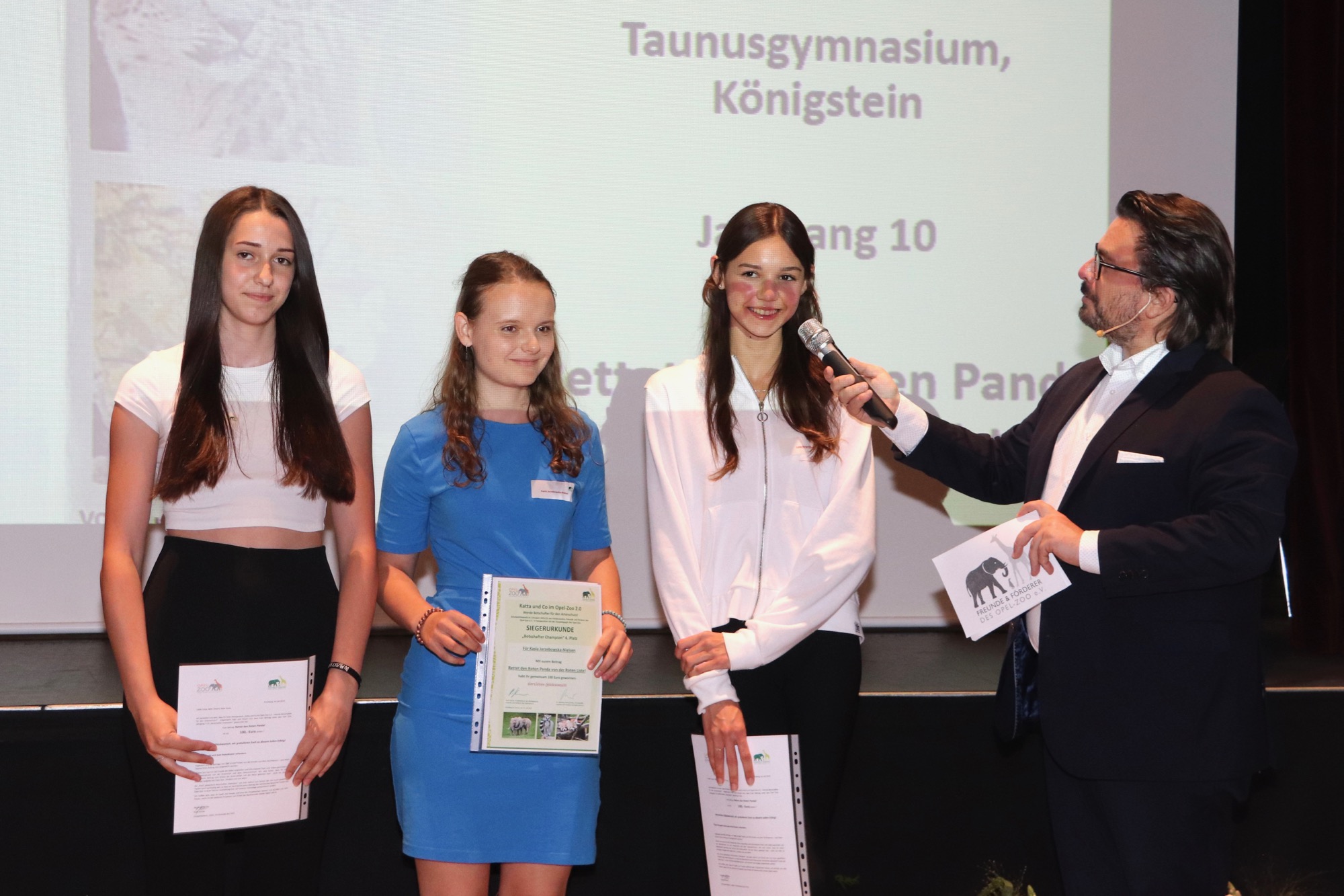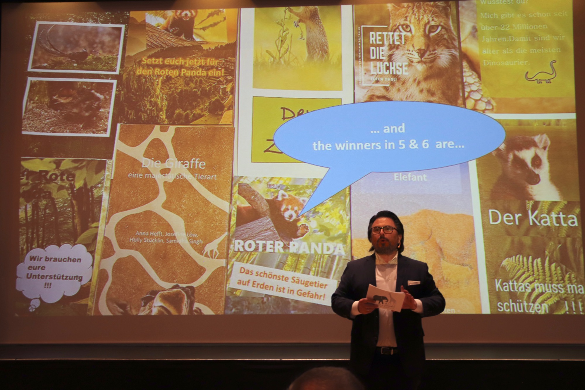 Schließlich wurden die zehn besten Wettbewerbsbeiträge in den beiden Altersklassen gekürt – zunächst in den Klassen 5-6, bei denen das Taunusgymnasium nicht zu den Preisträgern zählte; dann in den Klassen 7-10, bei denen das Taunusgymnasium die Hälfte der bestbewerteten Beiträge stellte. Auf Platz 8 landete die Kampagne zur Europäischen Sumpfschildkröte von Simon Gaulke (7. Klasse). Auf einen der beiden 6. Plätze kamen Jana Boeckhoff und Hana Weinert (9. Klasse) mit ihrer Kampagne zum Hirscheber. Auch der 5. Platz ging ans Taunusgymnasium: Sophie Bohr, Filis Feistel, Hanna Geis, Viona Niebergall (10. Klasse) hatten eine Kampagne über die Chinesische Krokodilschwanzechse erarbeitet. Den 4. Platz belegten Luisa Burgardt, Kasia Jarzebowska-Nielsen und Ostara Schulte mit ihrer Kampagne zum Roten Panda. Auf dem 1. Platz wurden zwei Beiträge prämiert – einer davon stammte von Juliane Meckenstock (8. Klasse) und widmete sich dem Roten Vari.