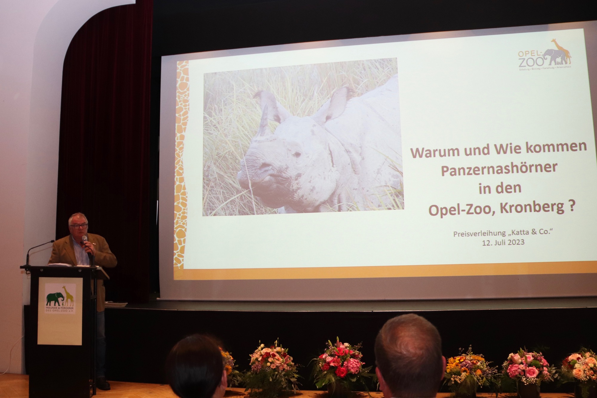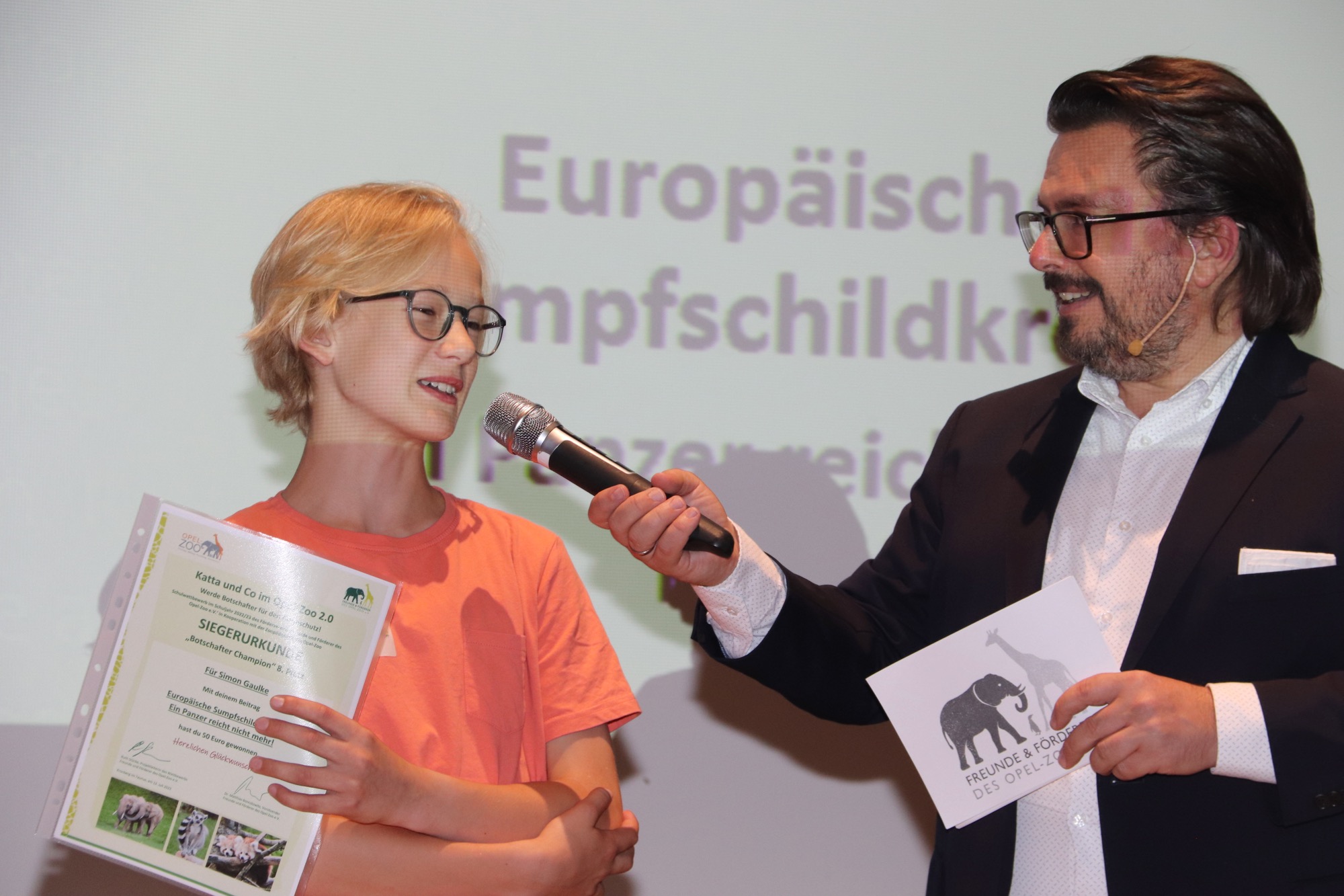 Der Abend wurde von einem abwechslungsreichen Programm gerahmt und von Stephan Hübner, Redakteur für Bildung und Wissenschaft beim Hessischen Rundfunk, kenntnisreich und humorvoll moderiert. Zum Auftakt spielte das Königsteiner Bläserensemble „Kingstruments“ thematisch passend Melodien aus dem Film „König der Löwen“. Anschließend zollten einige hochkarätige Redner den Teilnehmern ihren Respekt und erzählten kurzweilig aus ihrer Arbeit – so etwa Dr. Matthias Bonczkowitz, Vorsitzender des Fördervereins des Opel-Zoos, Gregor von Opel, Vorstandsvorsitzender der „von Opel Hessische Zoostiftung“ und Sohn des Zoo-Gründers Georg von Opel, Dr. Thomas Kauffels, Direktor des Opel-Zoos, sowie Rebecca Stecker, Referatsleiterin für Artenschutz, die den Schirmherrn des Wettbewerbs, Staatssekretär Oliver Conz, vertrat.