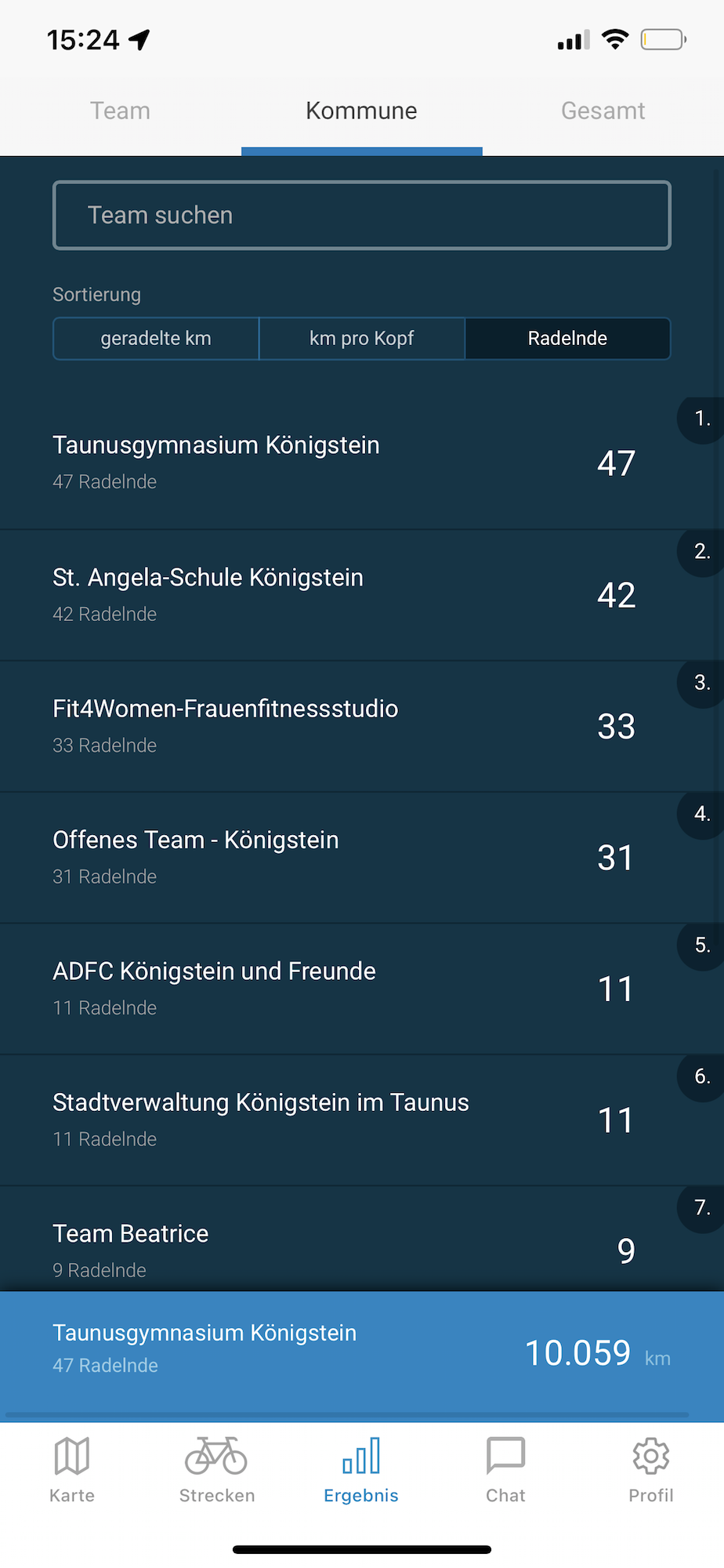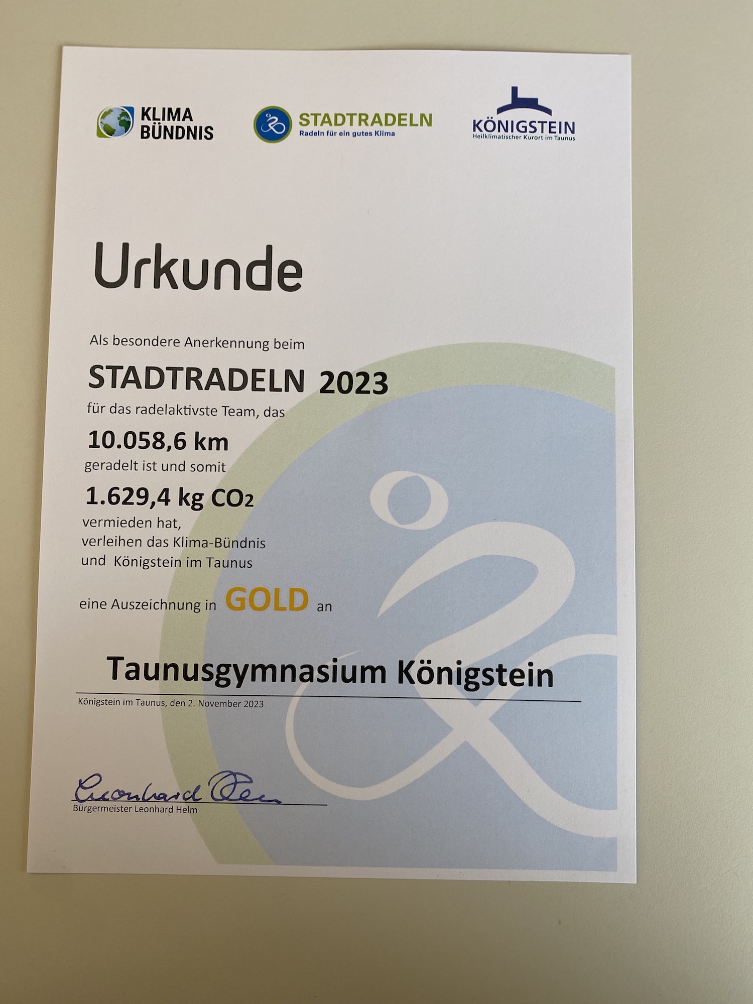 Beim Stadtradeln durfte sich das Tanusgymnasium diesmal über einen besonderen Erfolg freuen: Bei dem Wettbewerb erreichte das Gymnasium mit bahnbrechenden 47 Radelnden die sagenhafte Gesamtstrecke von 10.059 Kilometern. Dadurch wurden laut dem Veranstalter 1.629,4 kg CO2 vermieden – allein dies ist bereits ein Grund zur Freude. Dass das Taunusgymnasium damit sogar das radelaktivste Team in Königstein war, machte die Freude perfekt.