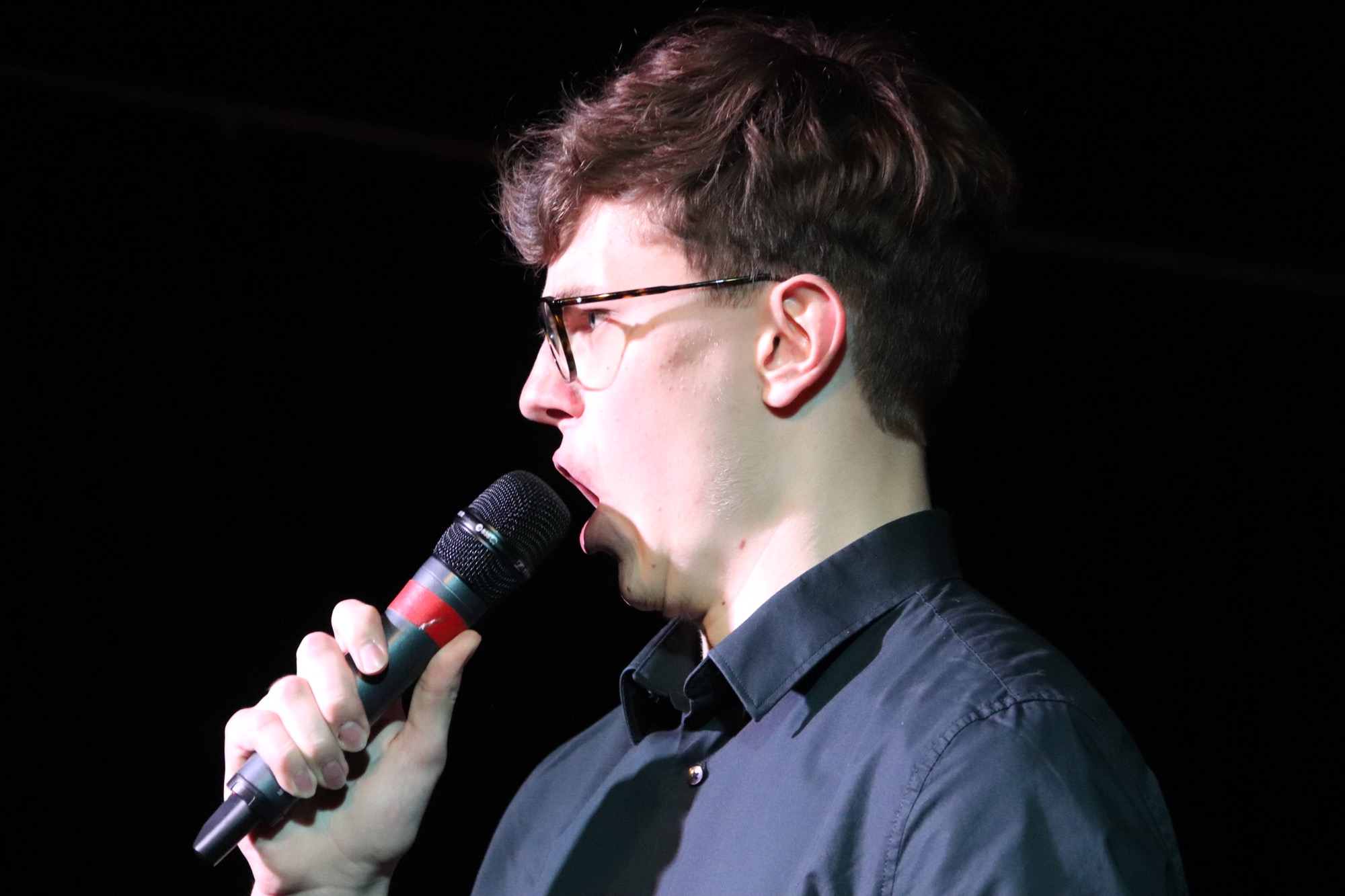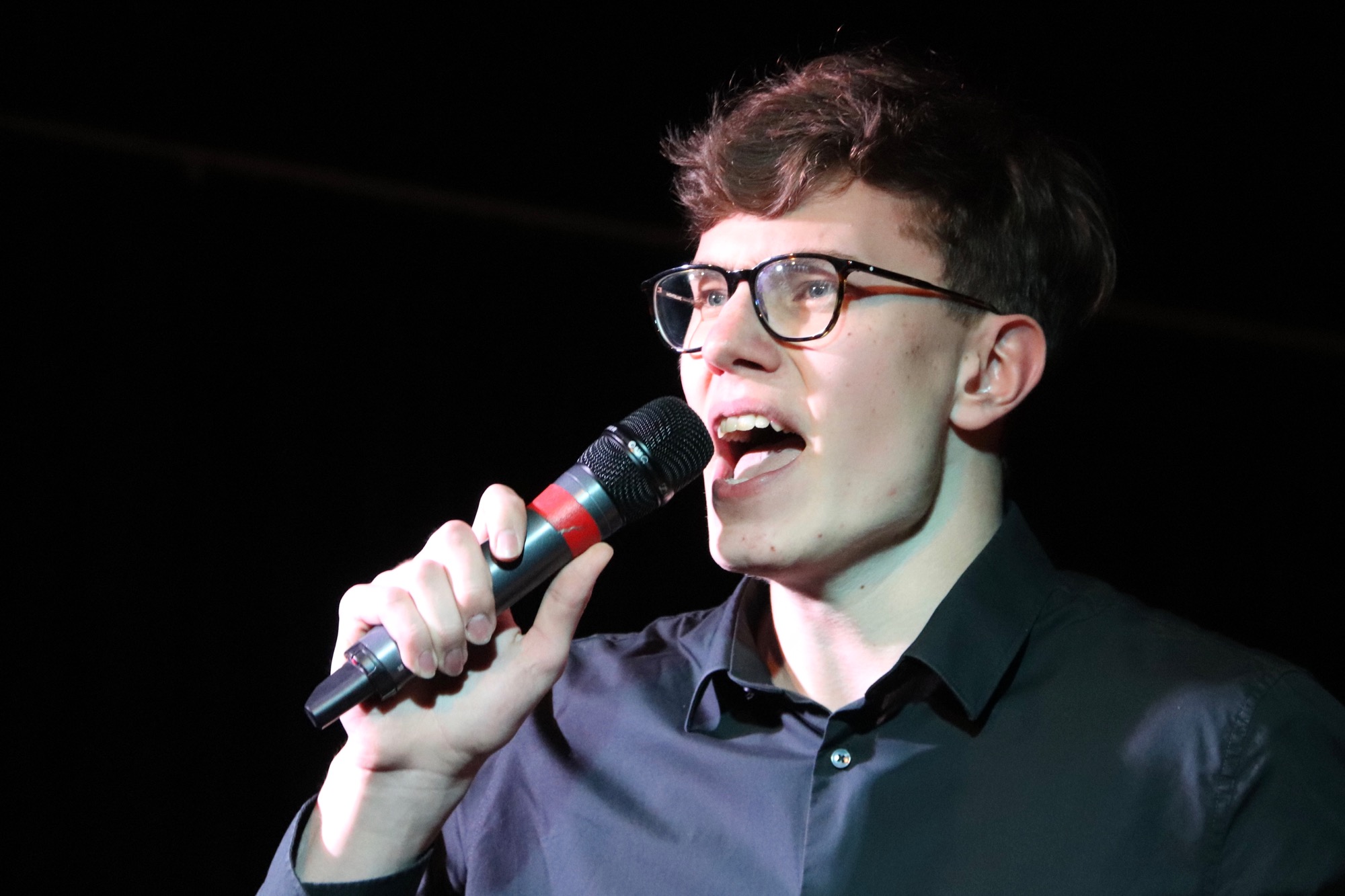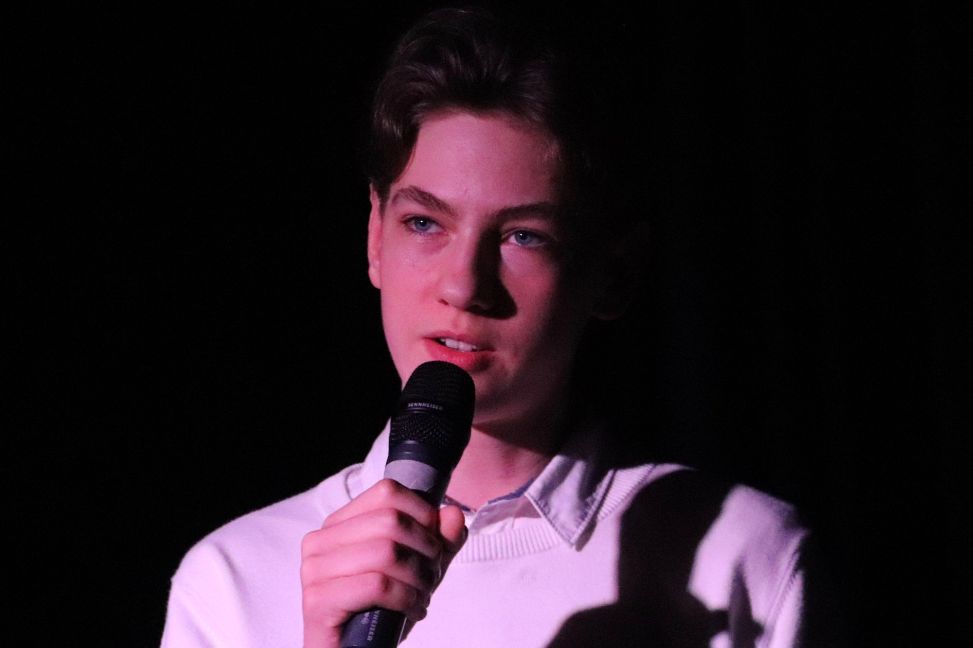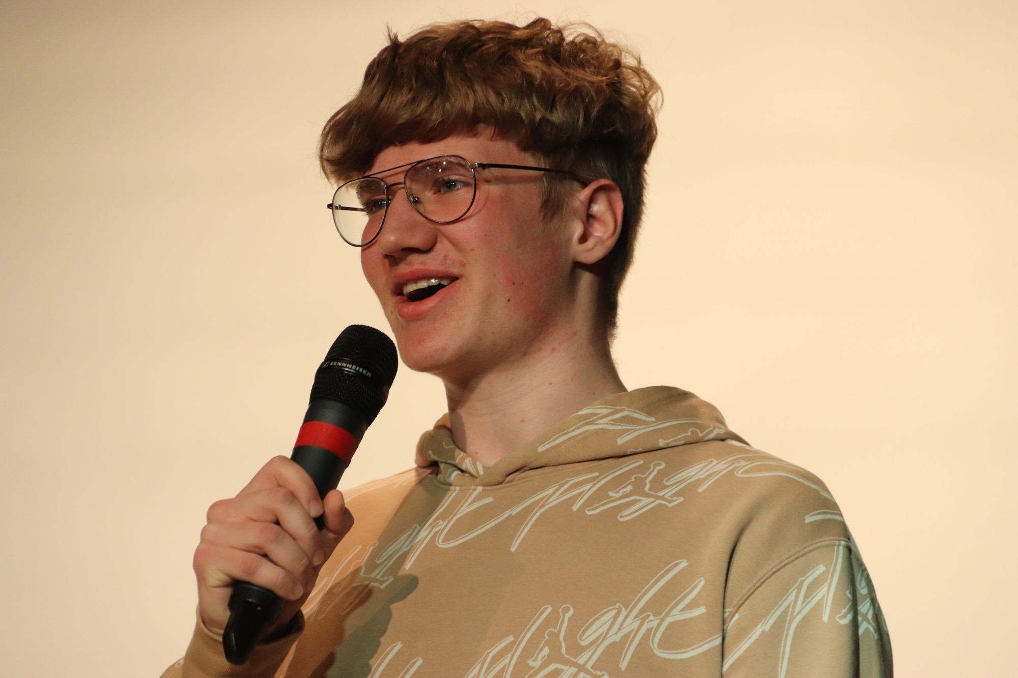 Jonathan Bellinghausen (8c), der Sieger des letztjährigen Poetry-Slam-Wettbewerbs am Tausgymnasium, trug seine selbst geschriebene und äußerst amüsante „Geschichte eines Golfballs“ vor – zahlreiche Lacher und großer Applaus waren ihm sicher.