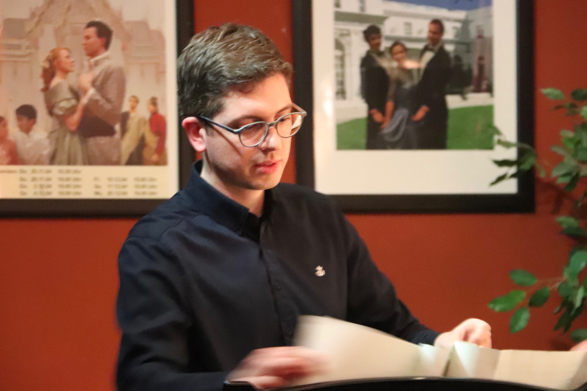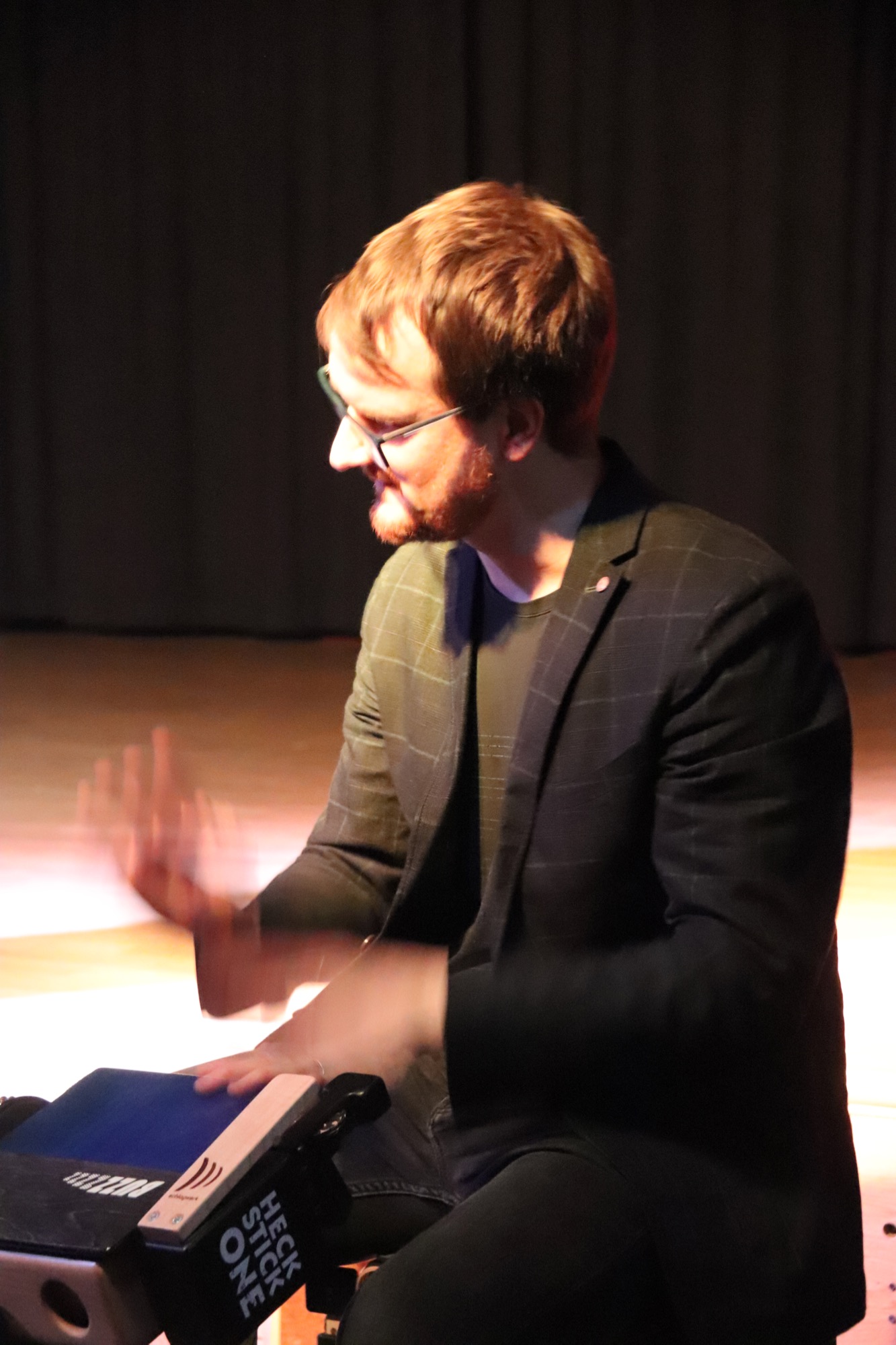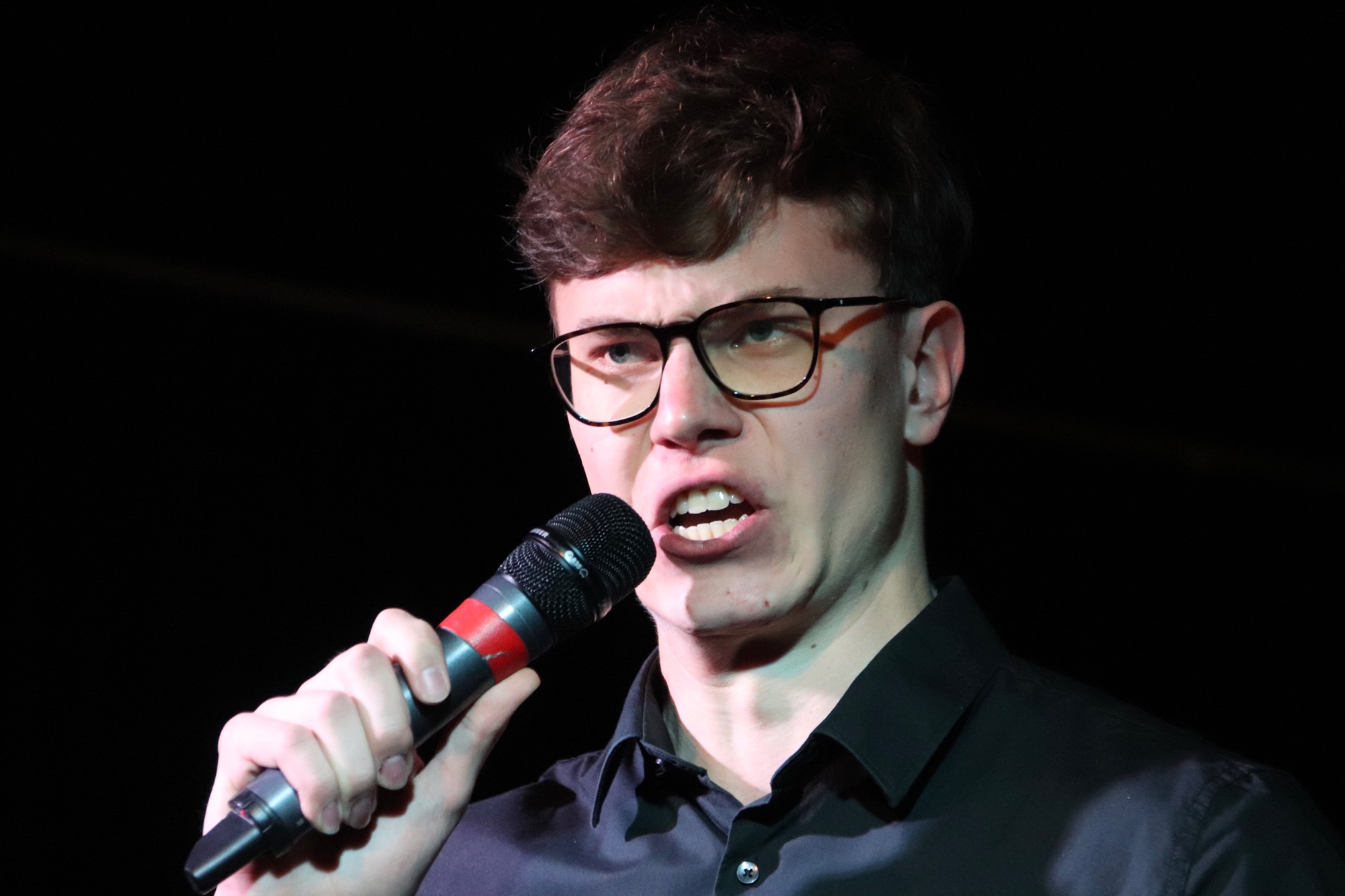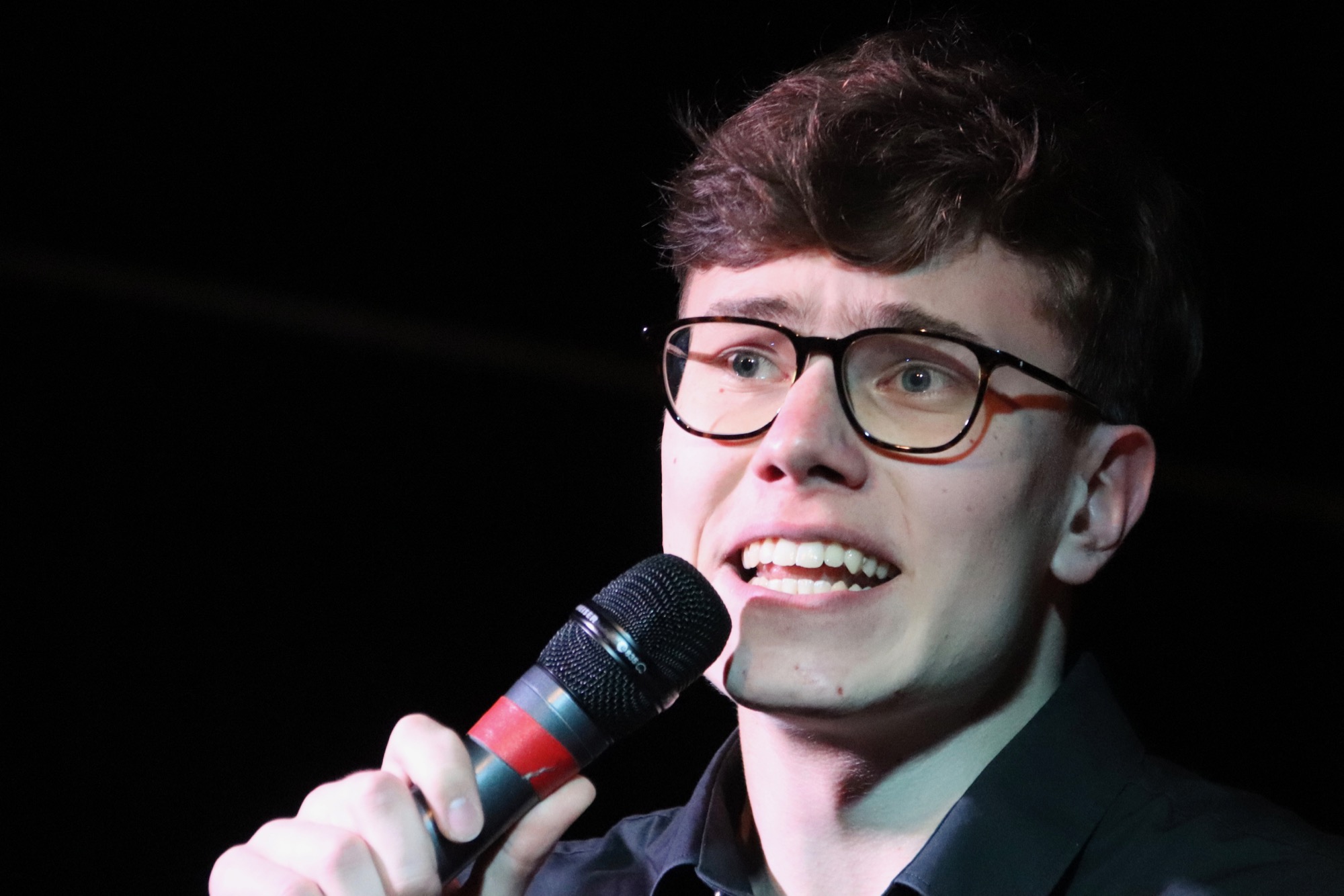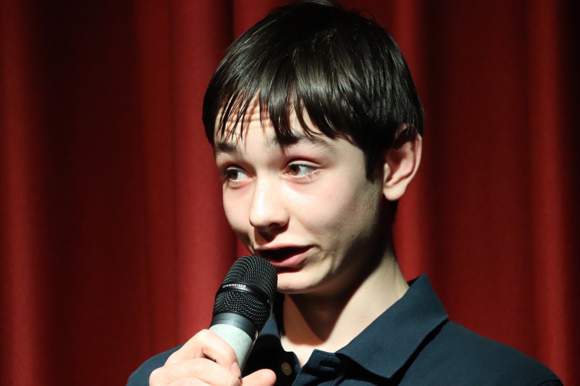 Jonathan Bellinghausen (8c), der Sieger des letztjährigen Poetry-Slam-Wettbewerbs am Tausgymnasium, trug seine selbst geschriebene und äußerst amüsante „Geschichte eines Golfballs“ vor – zahlreiche Lacher und großer Applaus waren ihm sicher.