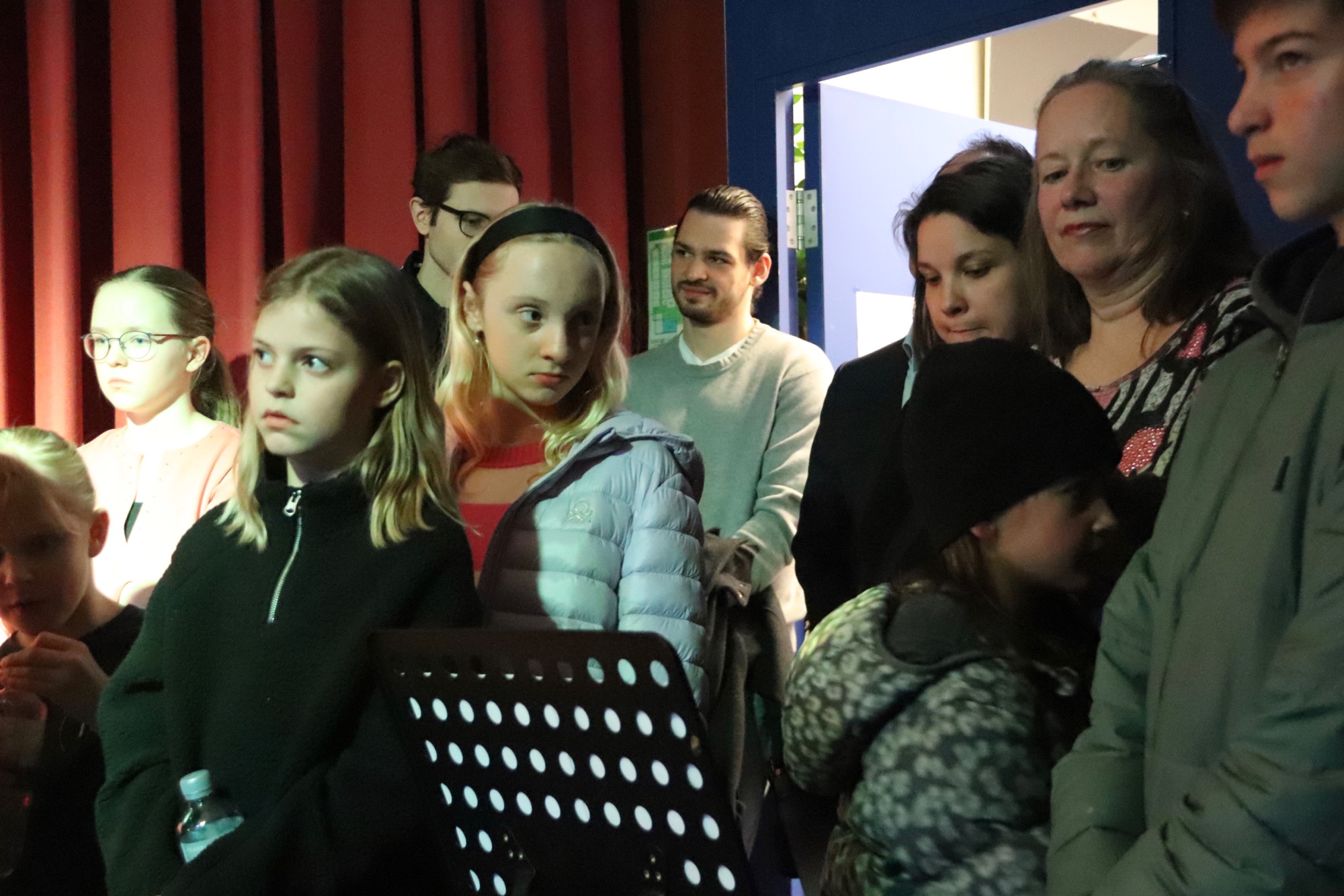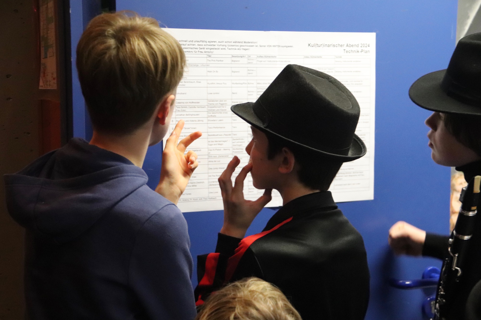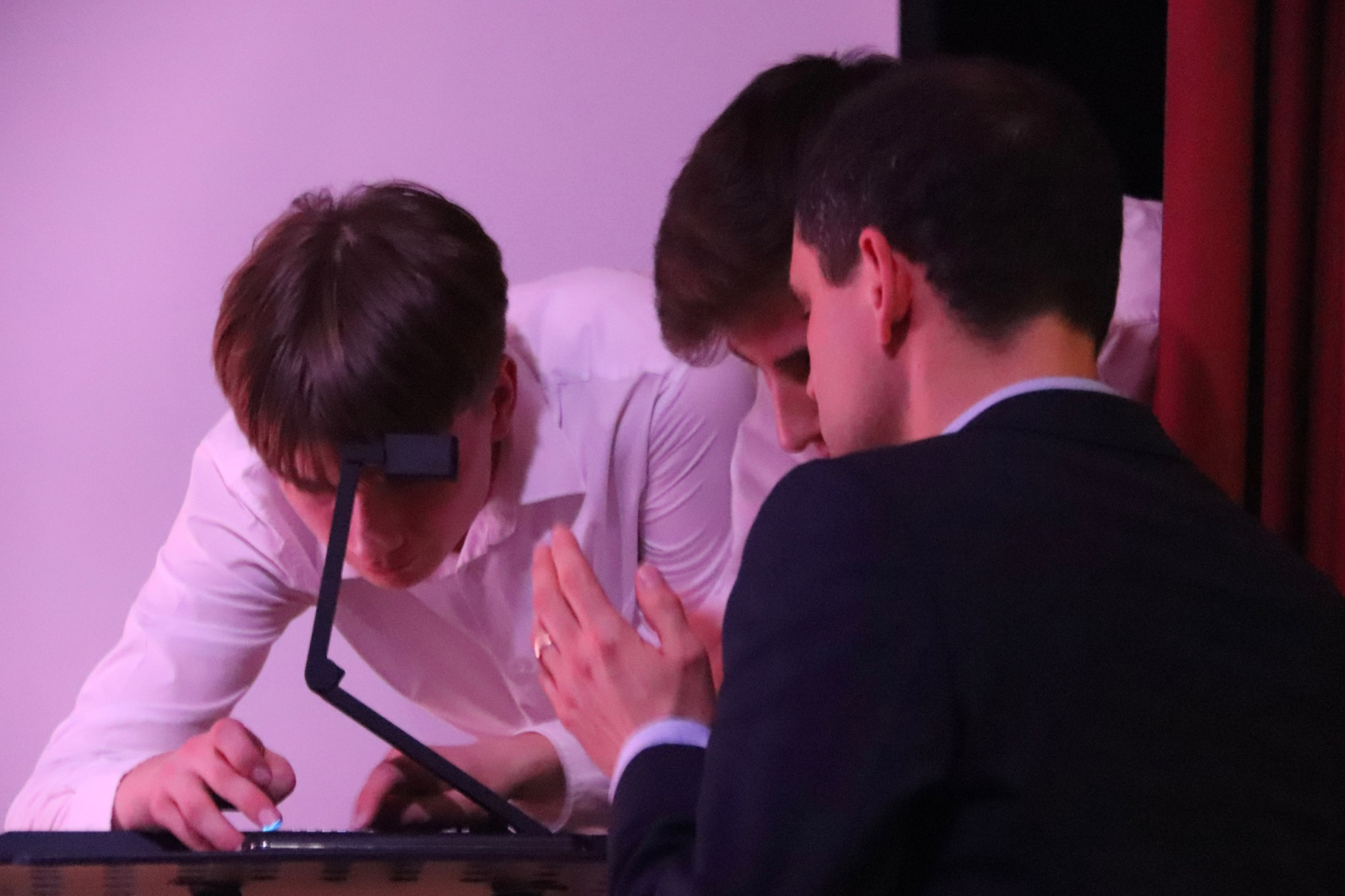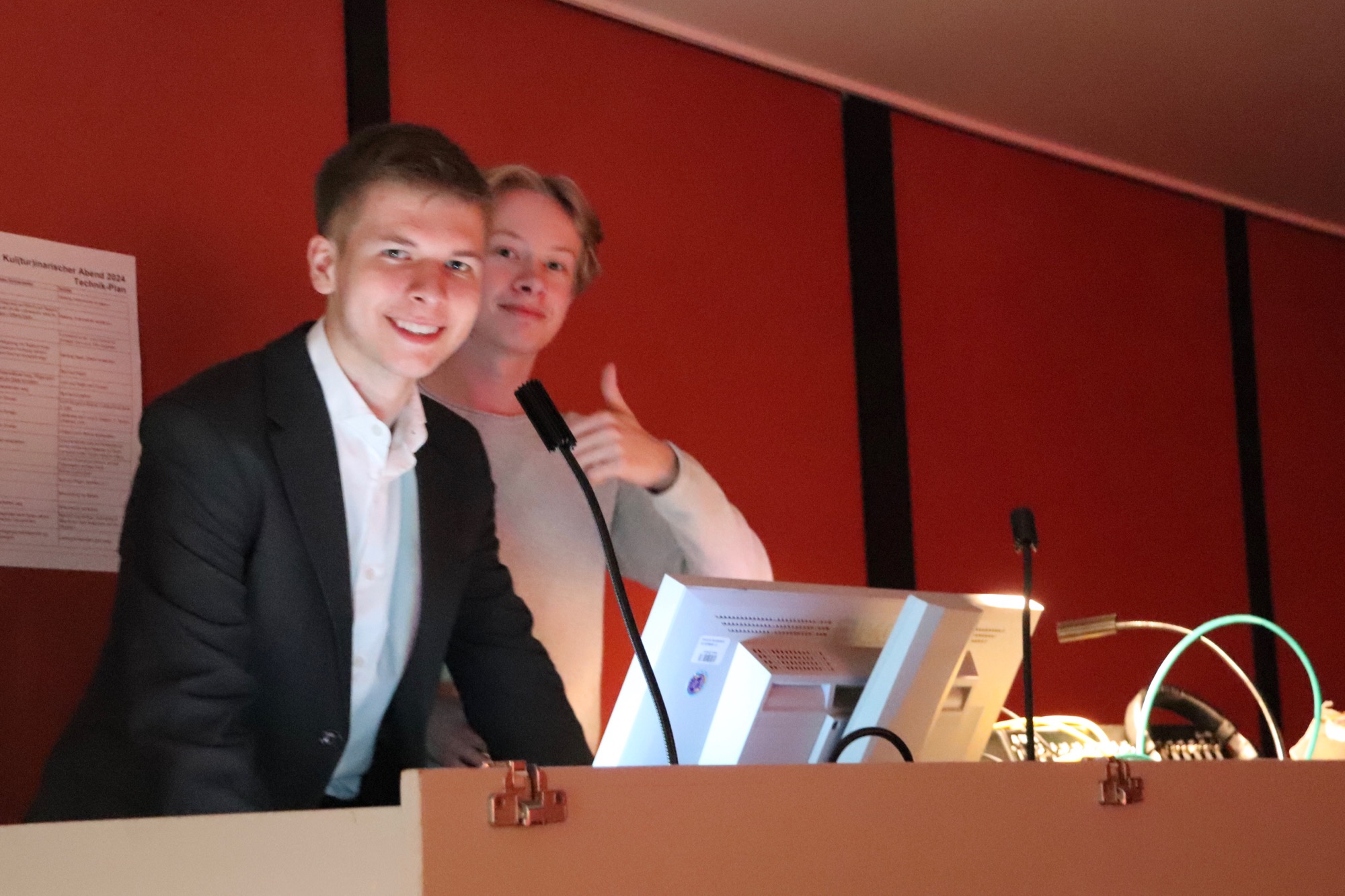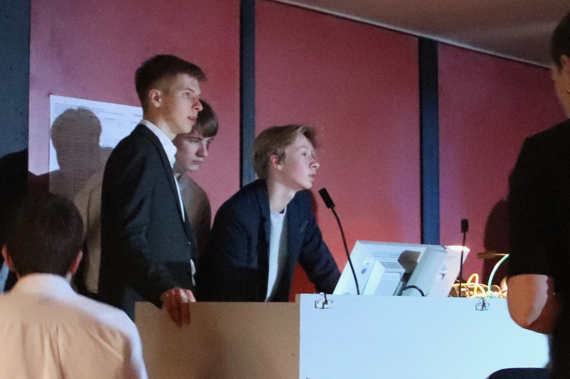 Vor den beiden letzten Darbietungen des Abends dankte Frau Antony der Technik-AG unter Leitung von Herrn Lego, ohne die der Abend nicht hätte stattfinden können. Justus Findeis (10a), Julius Hoener (10a), Richard Michels (Q4), Maximus Nolte (Q2) und Jan Widera (E2) unterstützten mit ihrem technischen Know-How und ihrer Zuverlässigkeit den Abend ganz erheblich. Auch die Bühnenassistenten Jakob Eichert, Clemens Philippi, Carl Puzicha, Bruno Quakernack (alle 10a), trugen zum reibungslosen Ablauf bei.