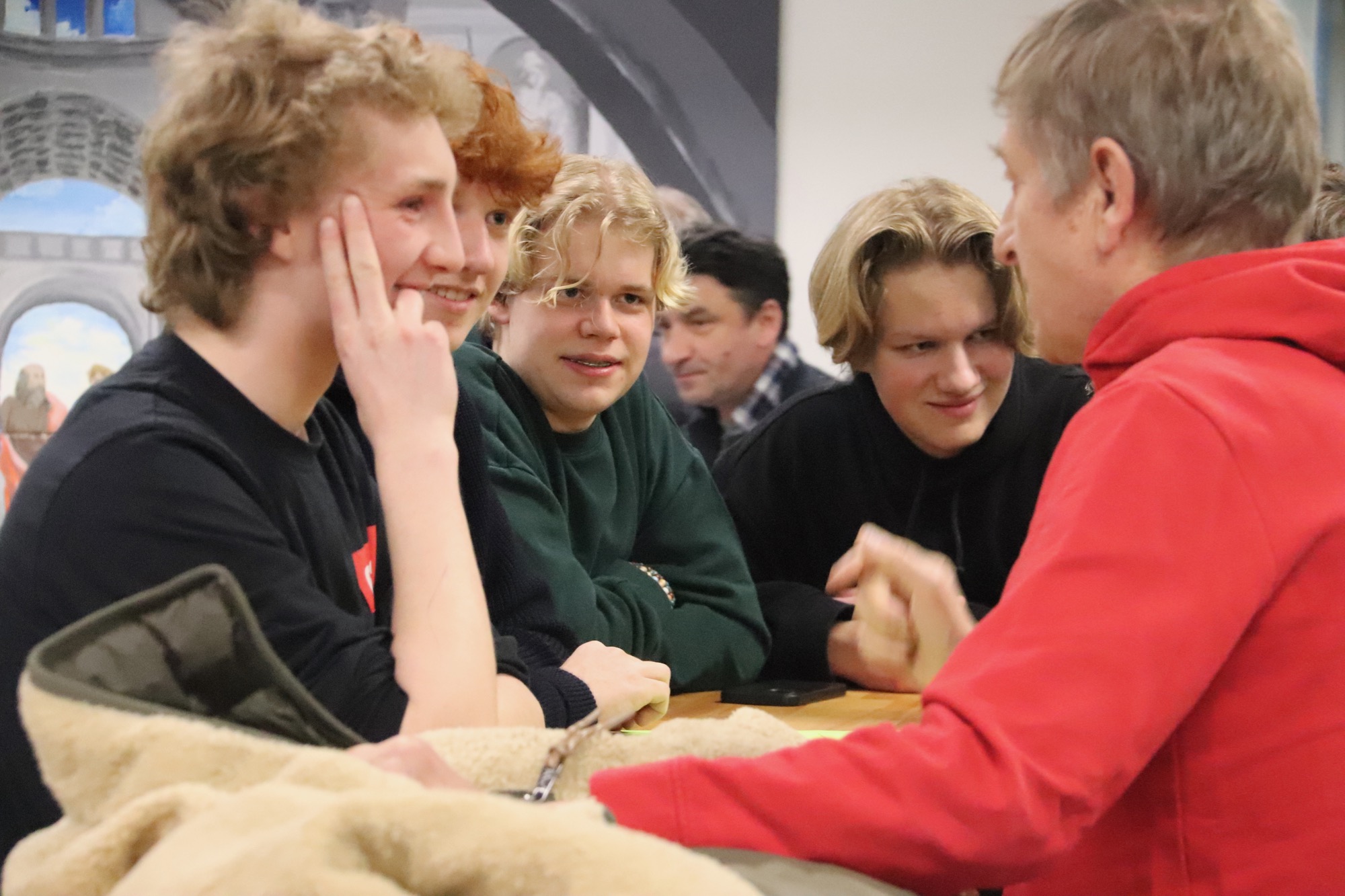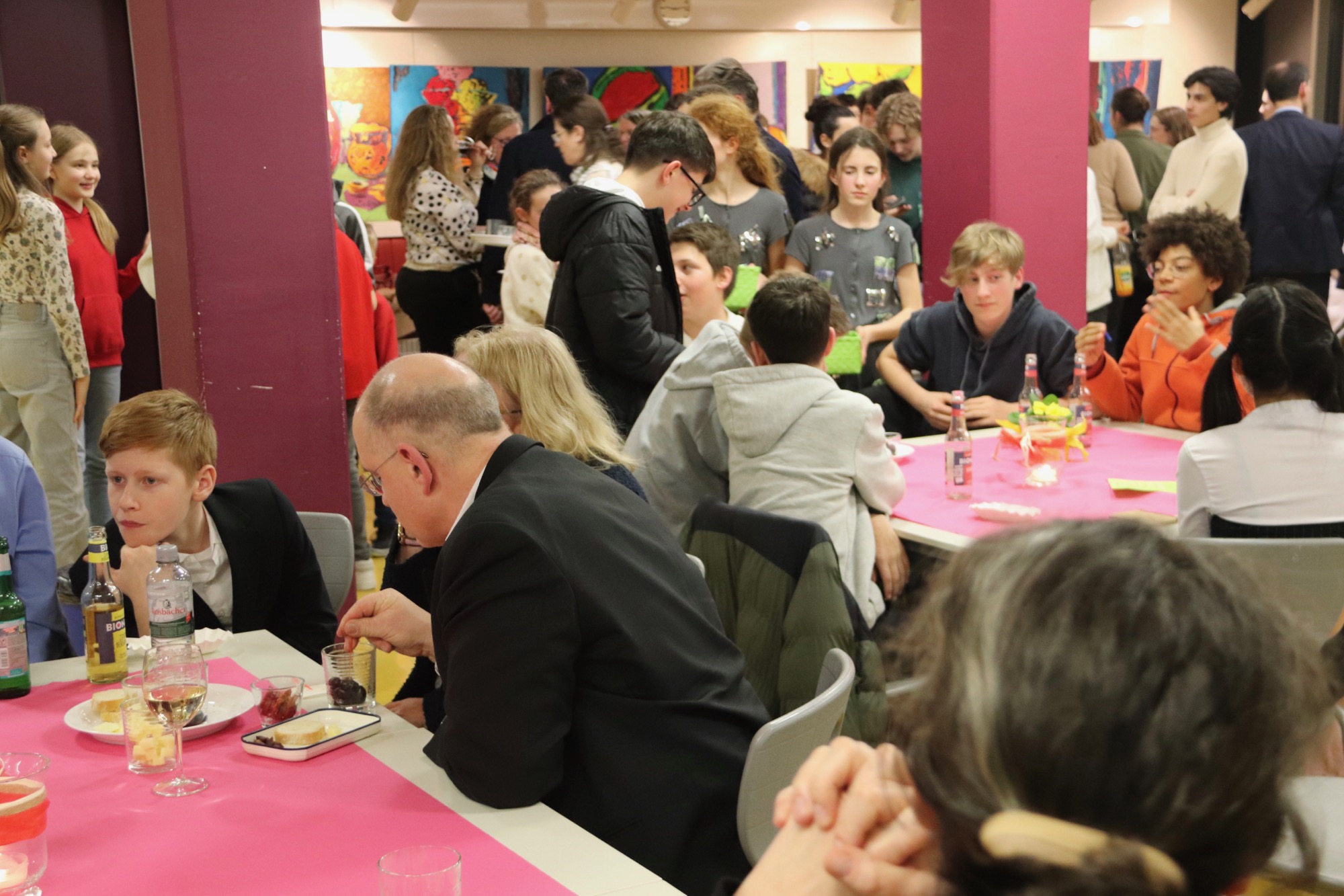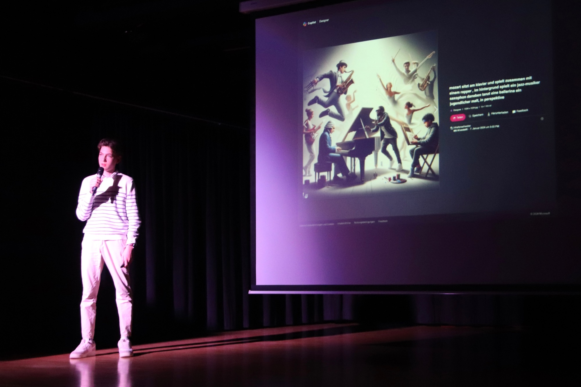 Eine Tradition des Kul(tur)inarischen Abends sieht vor, dass das Plakat jedes Jahr aufs Neue von einer Schülerin oder einem Schüler gestaltet wird. Das diesjährige beeindruckende Plakat kam von Dominique van Ingelandt-Fredriksen (9f), der sich die neuen Möglichkeiten der Bildgenerierung mittels Künstlicher Intelligenz zu Nutze gemacht hatte. In einem illustrierten Vortrag erläuterte er, wie er mittels verschiedener Software-Werkzeuge das mit einem gekonnten Prompt generierte Bild noch weiter verfeinert und optimiert hatte.