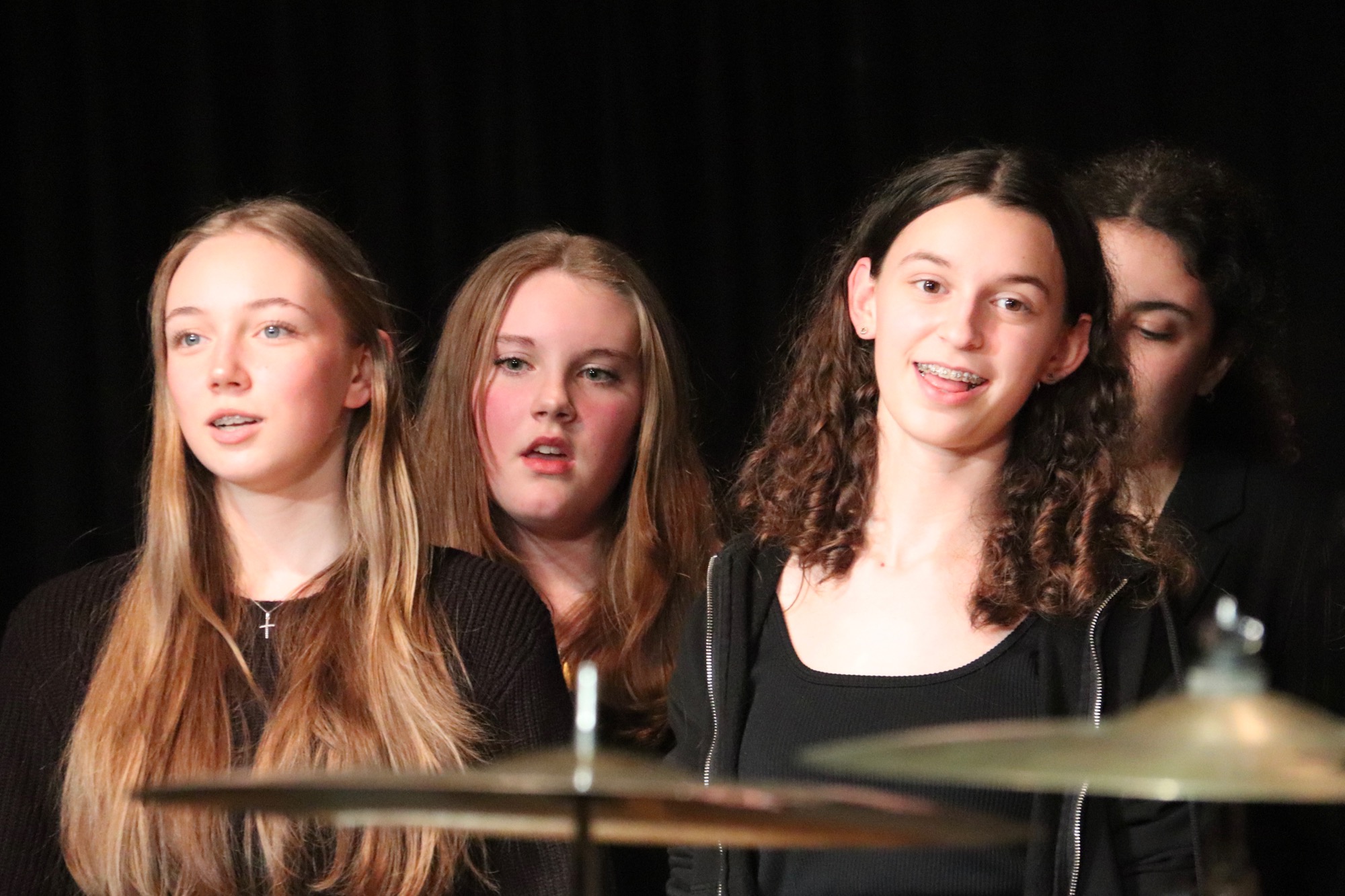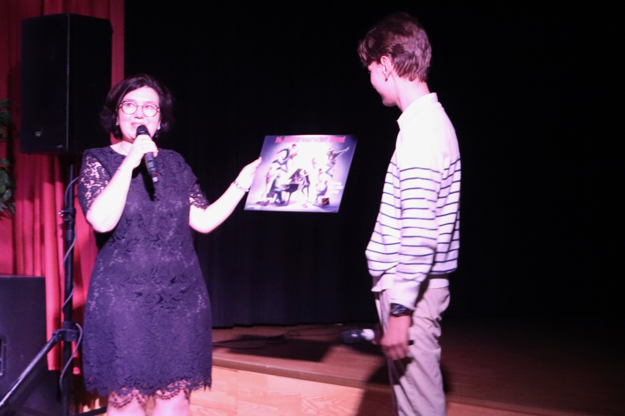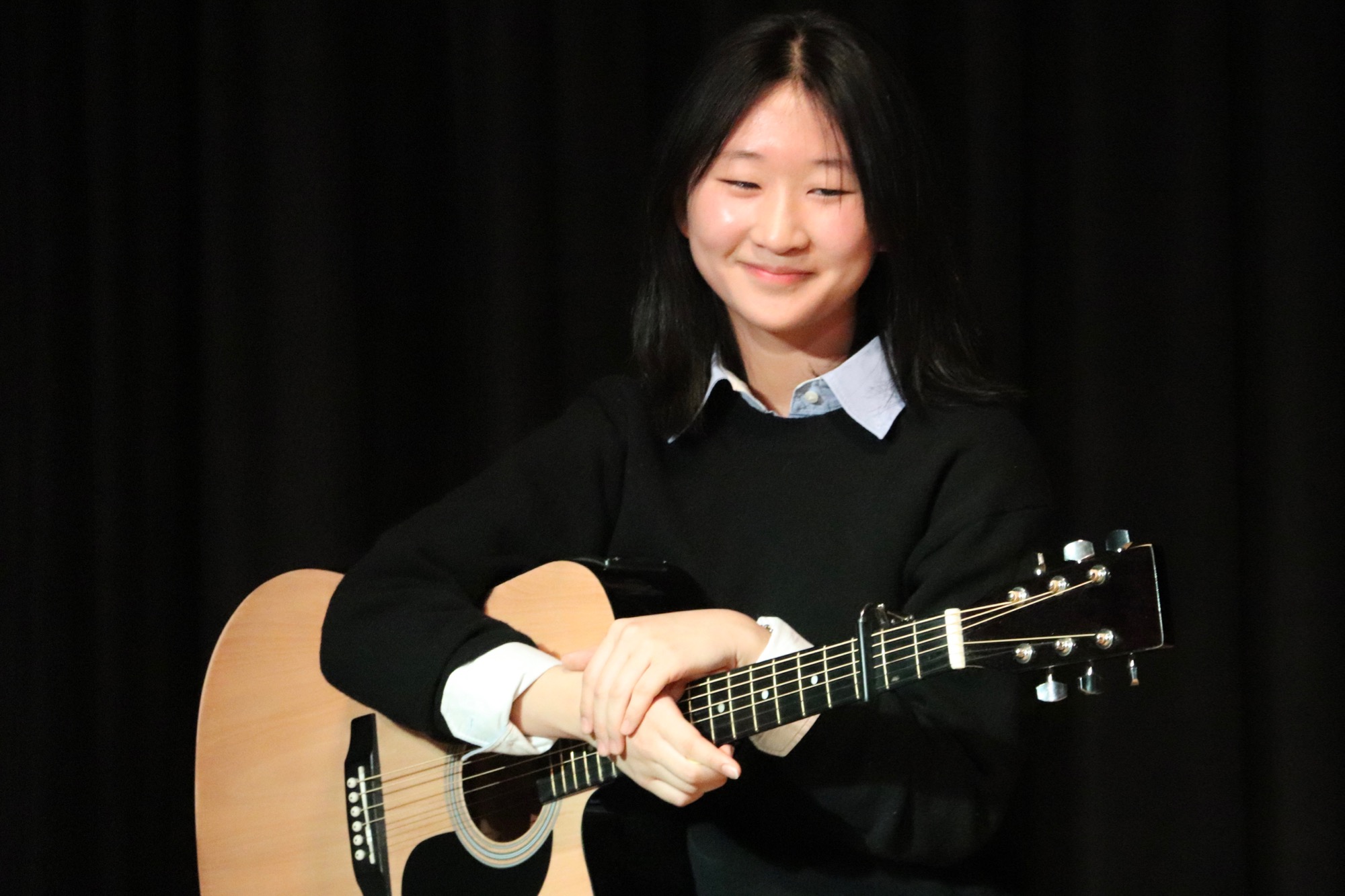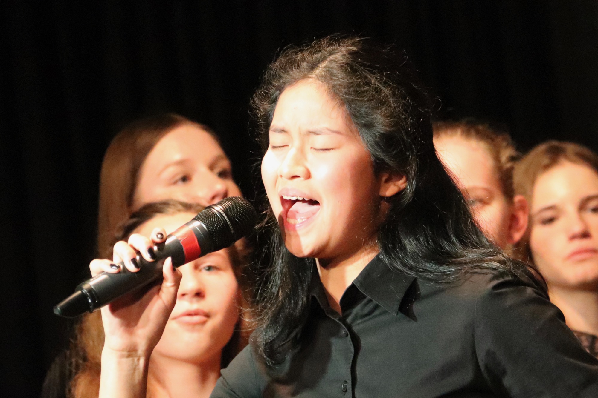 Die Schulband, geleitet von Frau Strecker, brachte den Song „Lose Control“ zu Gehör. Die brillante Sängerin der Band, Soraya Wingenter (8f), überzeugte einmal mehr mit ihrer imposanten Stimme; begleitet wurde sie dabei druckvoll von Linus Fujita (7d) am Schlagzeug, Michael Berenbaum (Q2) am Flügel, Zhe Cheng (E2) am E-Bass sowie Joo Eun (9d) an der E-Gitarre.