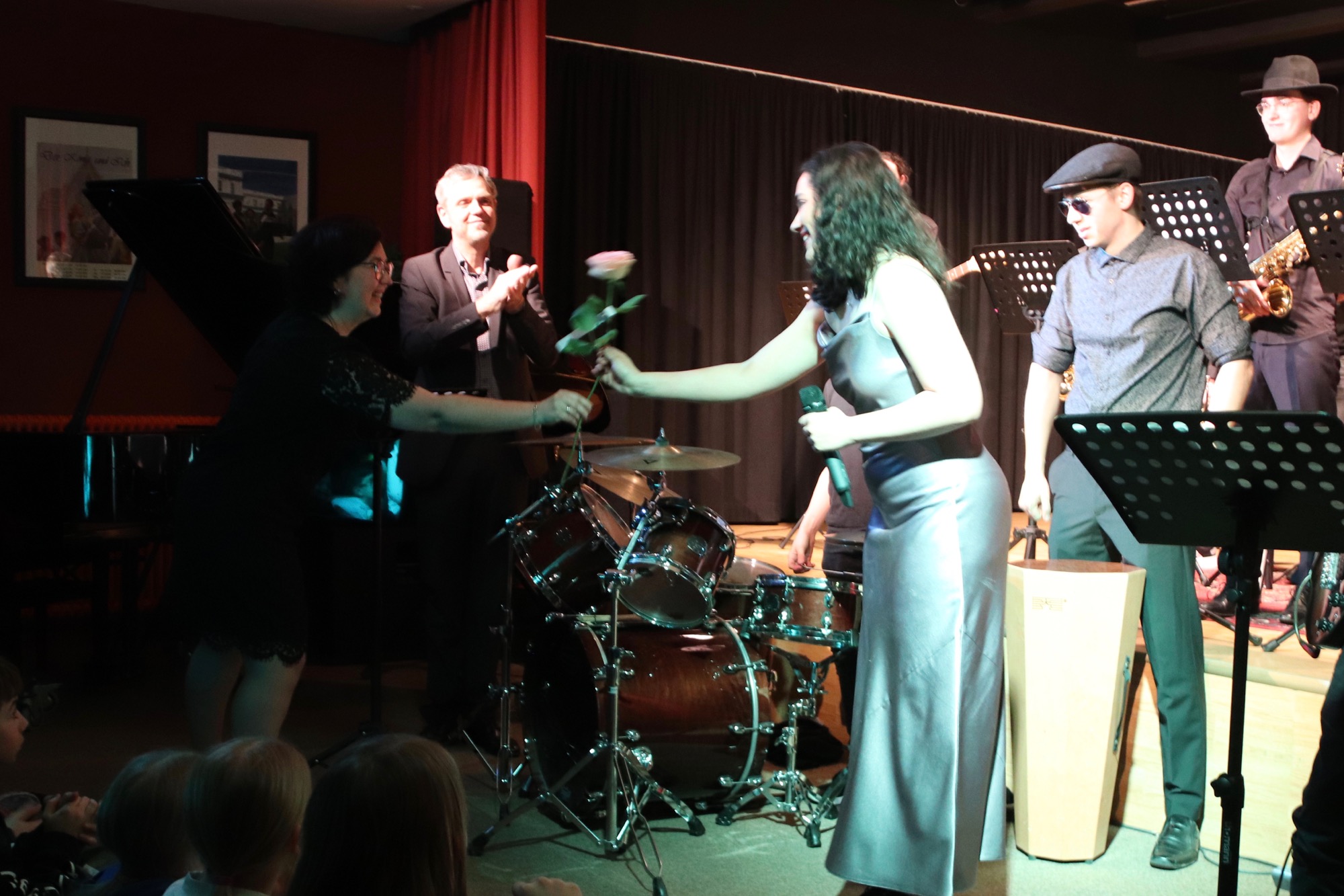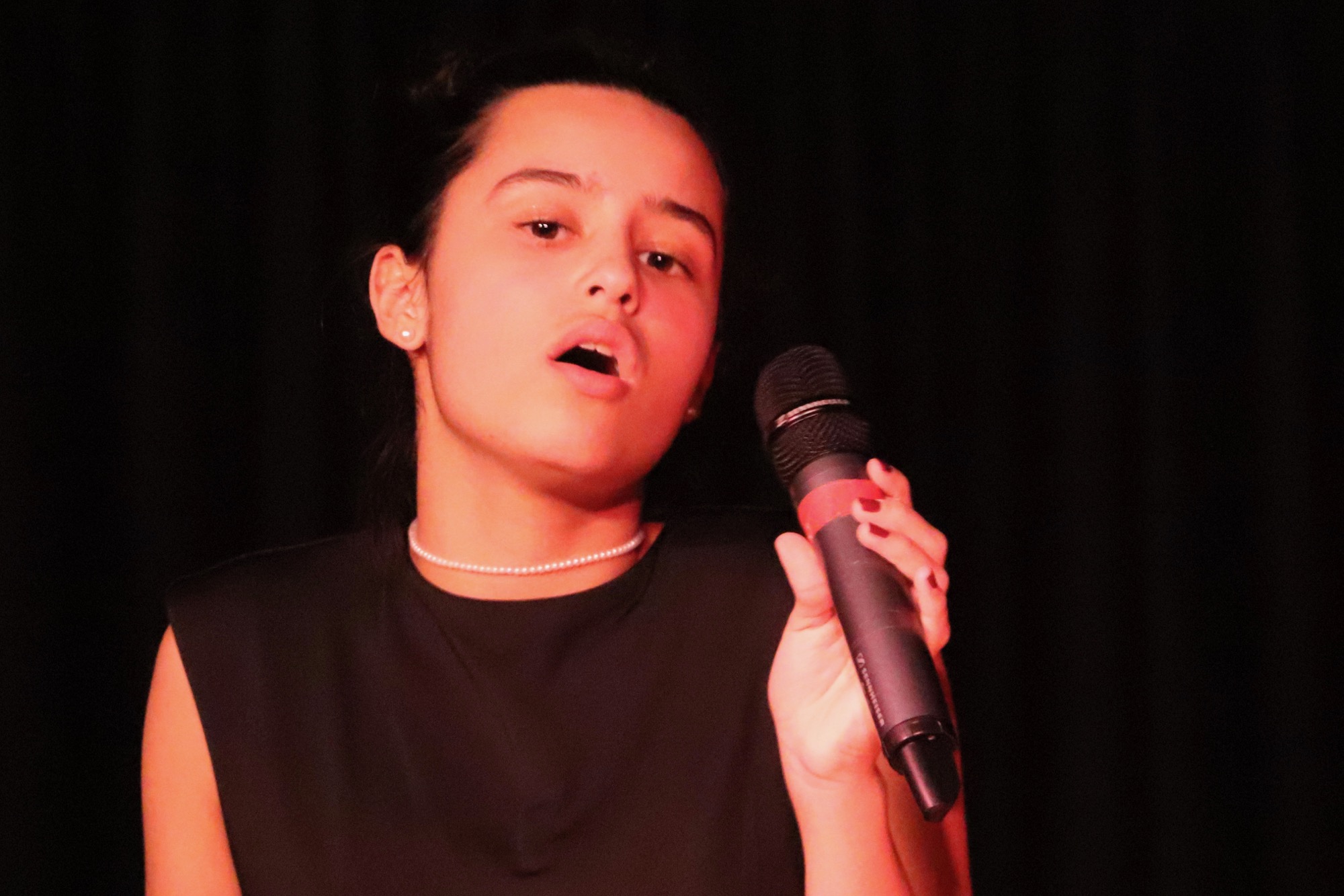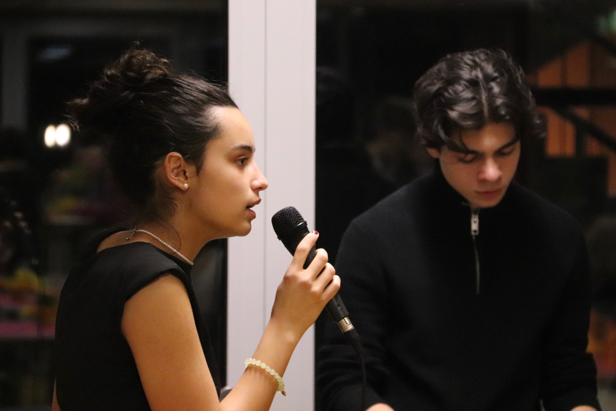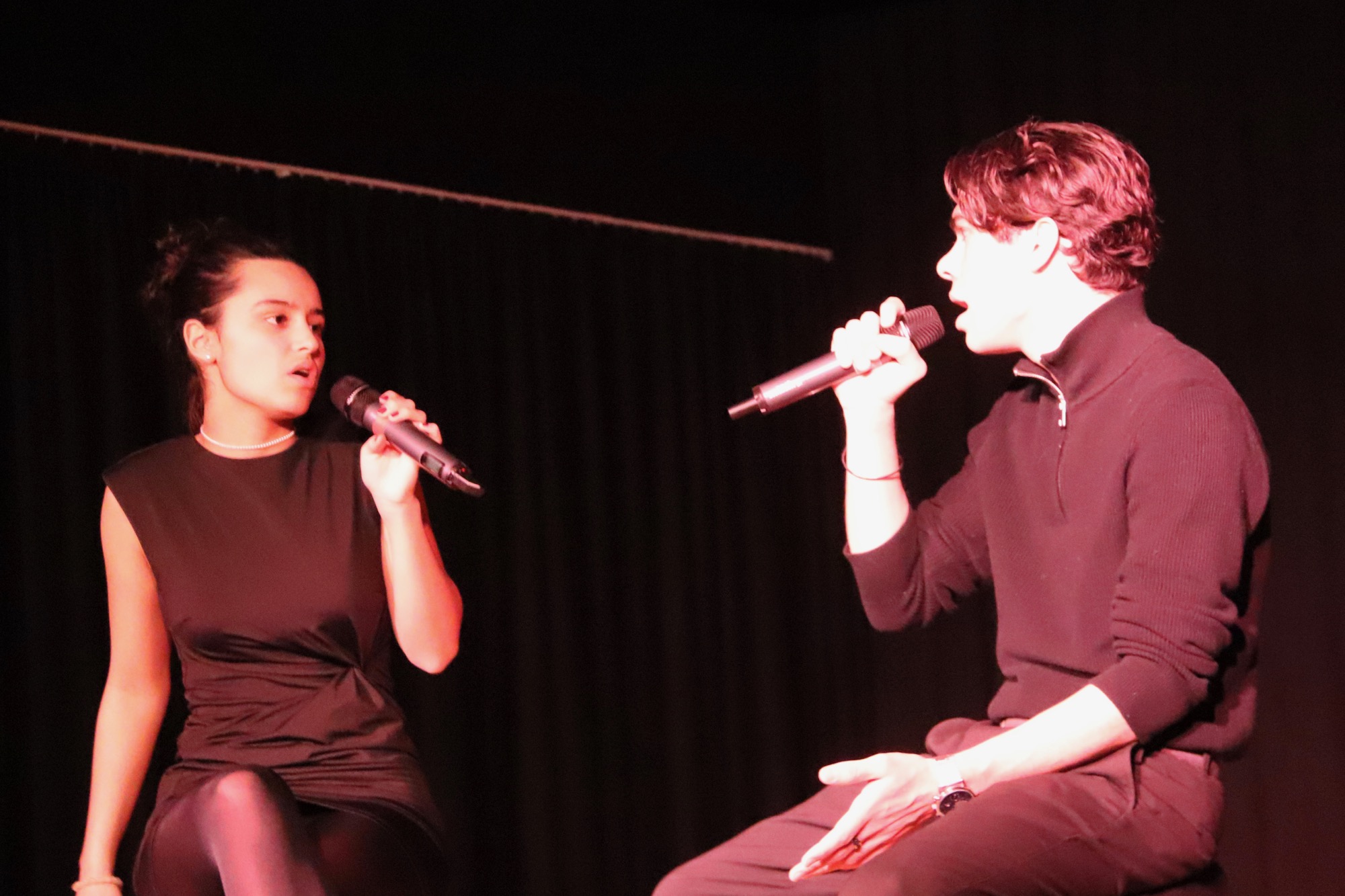 Soraya Wingenter (8f) und Lucio Ramírez del Prado Vetter (Q2) kehrten auf die Bühne zurück und boten eine ganz neue, dramaturgisch und gesanglich hinreißende Version des Klassikers „Hit The Road, Jack“ von Ray Charles dar; auch hier begleitete gekonnt Elias Leemüller am Flügel.