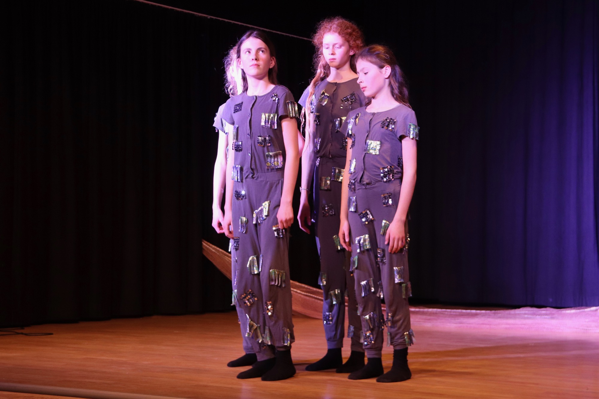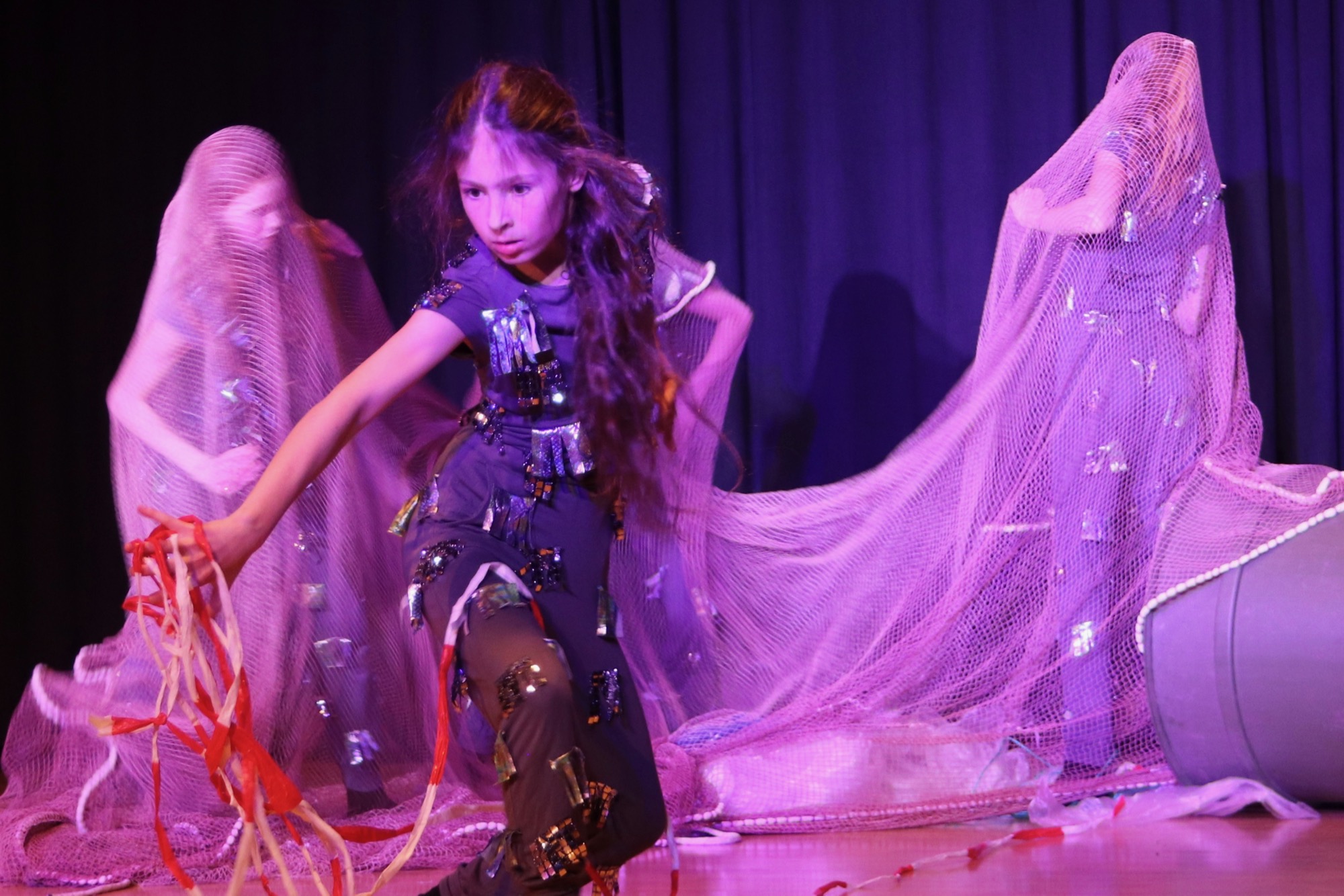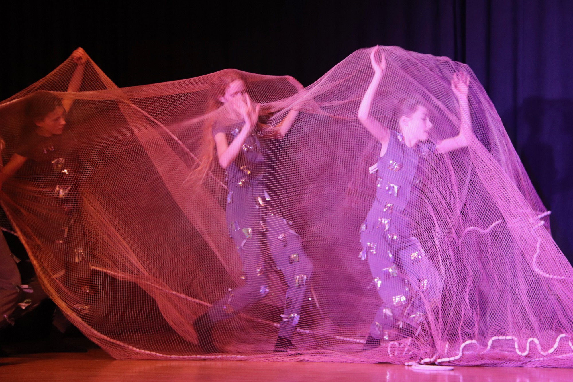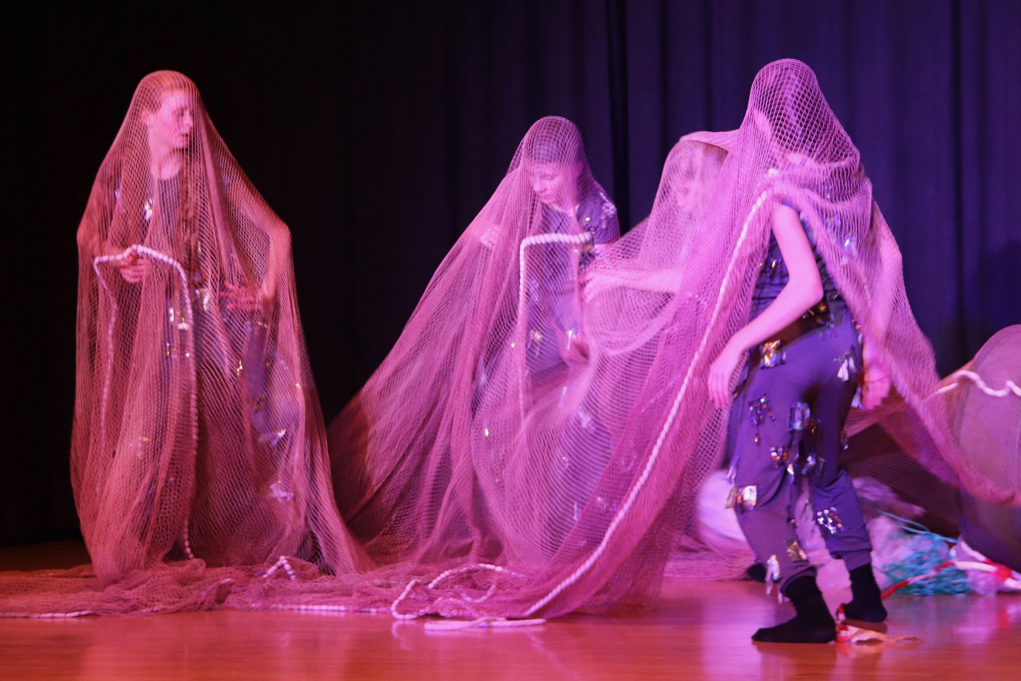 Ein weiterer Höhepunkt folgte nun von jungen Tänzerinnen, die schon zu alten Bekannten auf der „Kulti“-Bühne geworden sind: Hannah Diedrich, Anna und Kira Milke (alle 7d) sowie Nanni Diedrich (5e), die bereits auf den letzten Kul(tur)inarischen Abenden mit künstlerisch anspruchsvollen Choreographien überzeugt hatten, boten nun mit „Schwarmintelligenz“ ihr Meisterstück dar. Besonders beeindruckend: Die vier Tänzerinnen improvisierten die Bewegungen, die trotzdem synchron und koordiniert wirkten. Als Fischschwarm verhedderten sie sich in Plastikmüll und einem riesigen Fischernetz – und brachten das Publikum damit zum Nachdenken. Ein zugleich aufrüttelnder als auch tänzerisch begeisternder Beitrag.