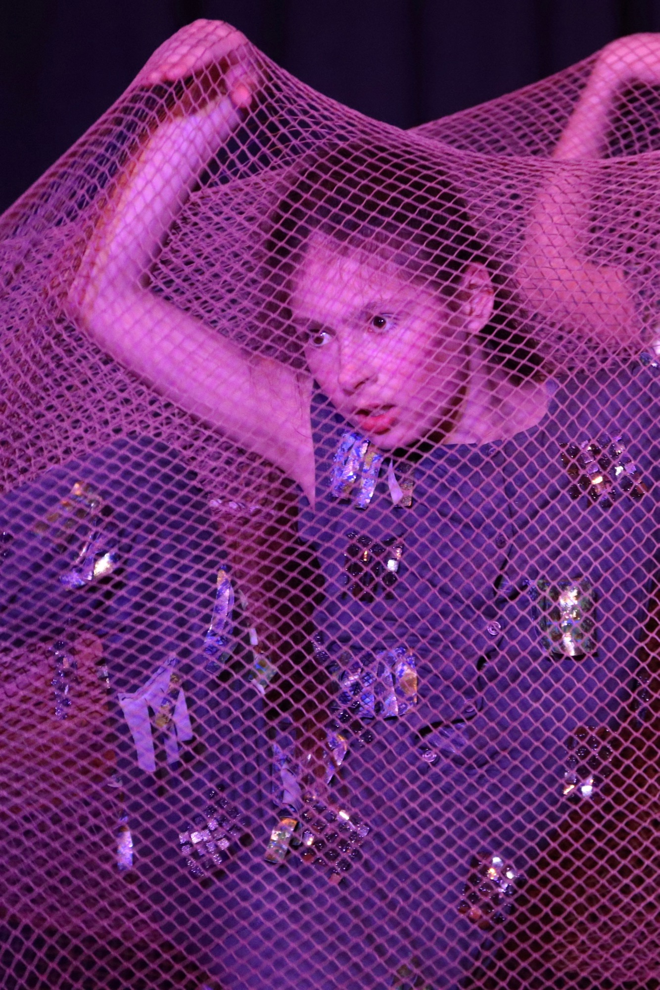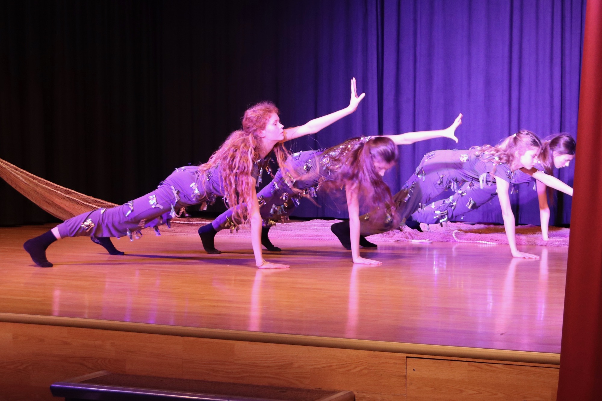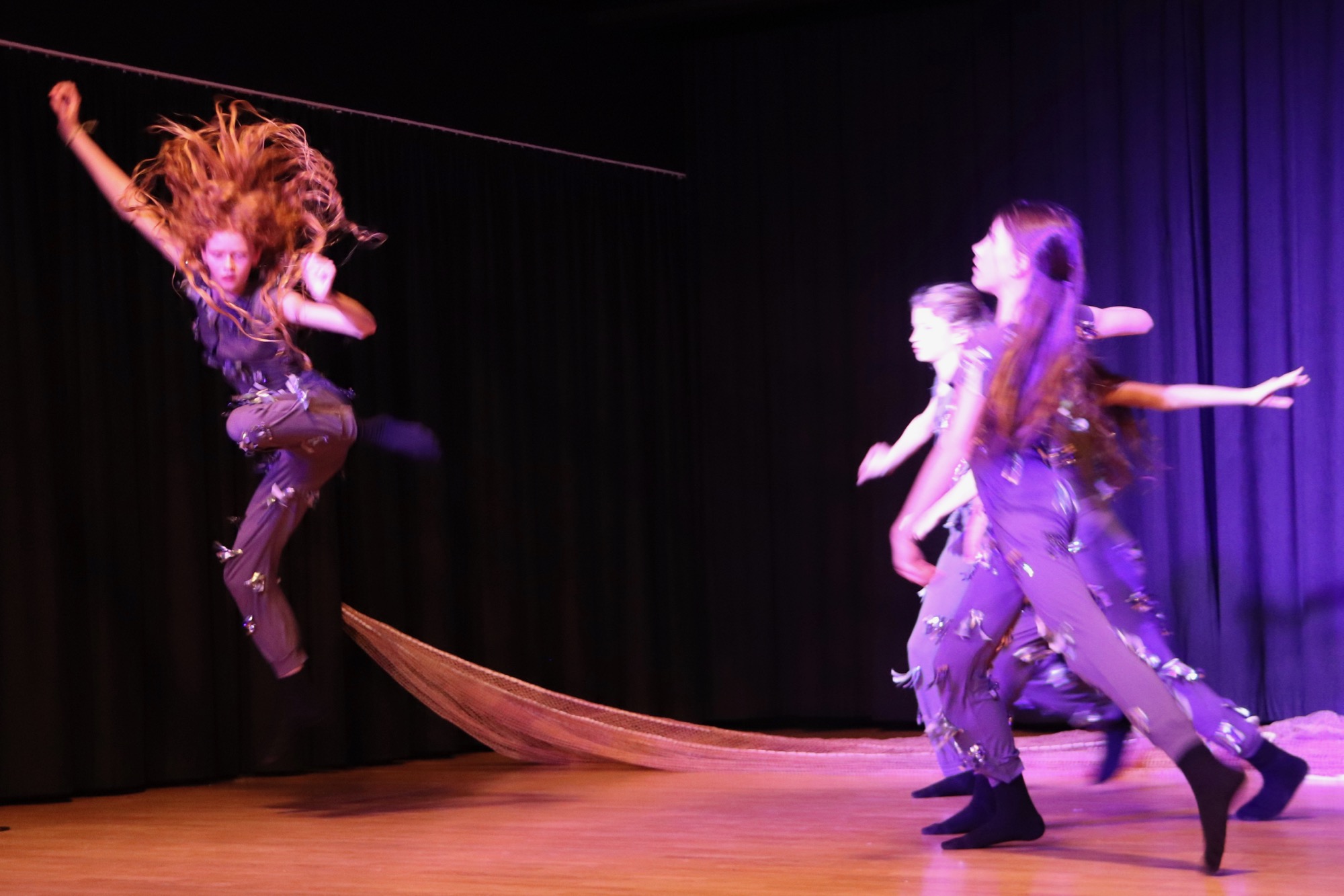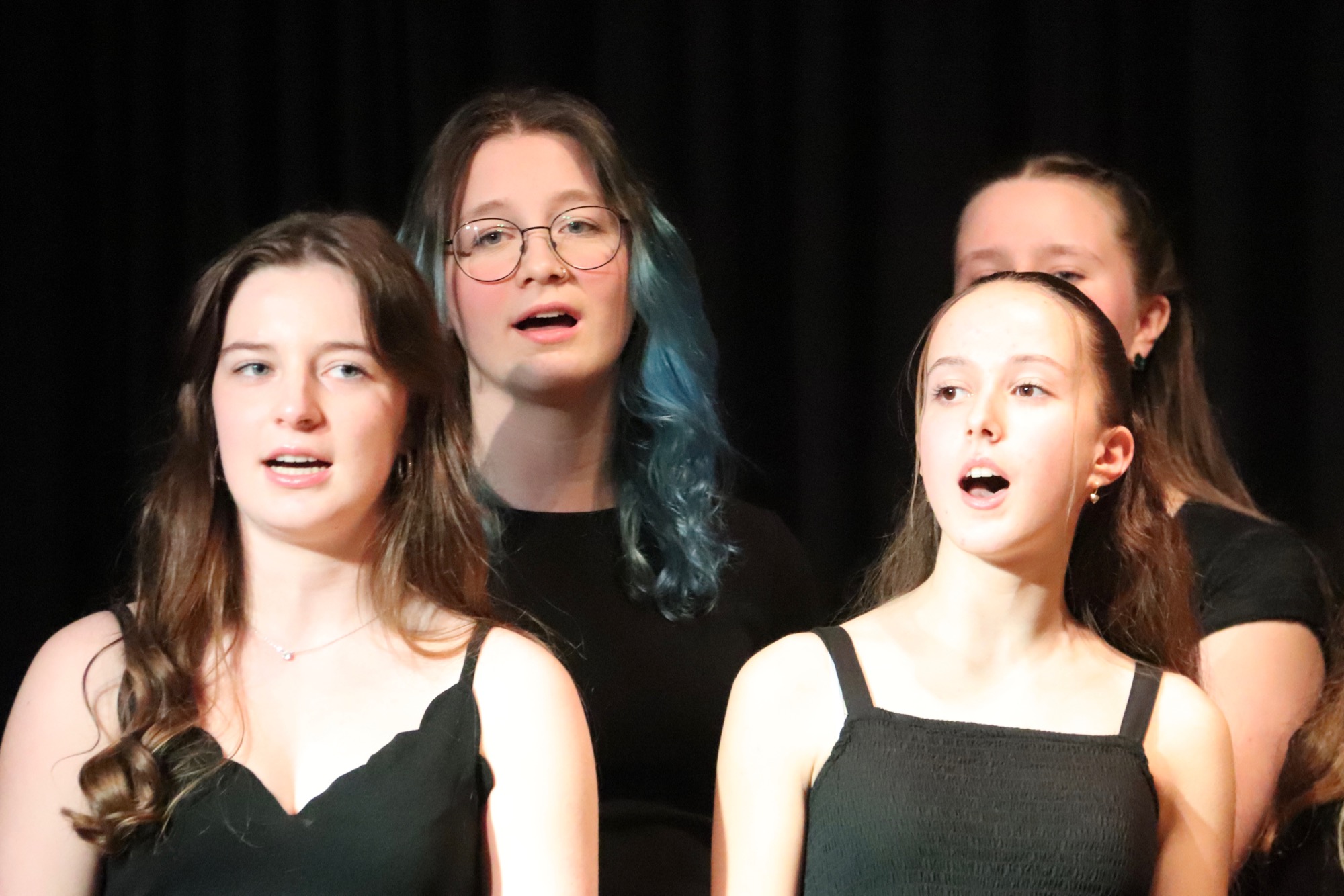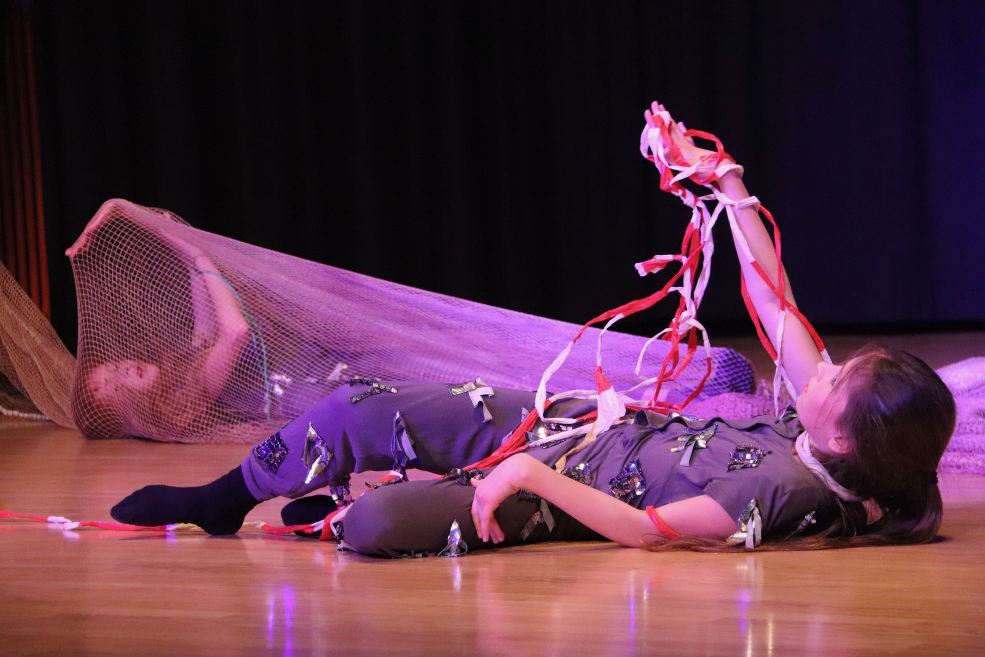 Ein weiterer Höhepunkt folgte nun von jungen Tänzerinnen, die schon zu alten Bekannten auf der „Kulti“-Bühne geworden sind: Hannah Diedrich, Anna und Kira Milke (alle 7d) sowie Nanni Diedrich (5e), die bereits auf den letzten Kul(tur)inarischen Abenden mit künstlerisch anspruchsvollen Choreographien überzeugt hatten, boten nun mit „Schwarmintelligenz“ ihr Meisterstück dar. Besonders beeindruckend: Die vier Tänzerinnen improvisierten die Bewegungen, die trotzdem synchron und koordiniert wirkten. Als Fischschwarm verhedderten sie sich in Plastikmüll und einem riesigen Fischernetz – und brachten das Publikum damit zum Nachdenken. Ein zugleich aufrüttelnder als auch tänzerisch begeisternder Beitrag.