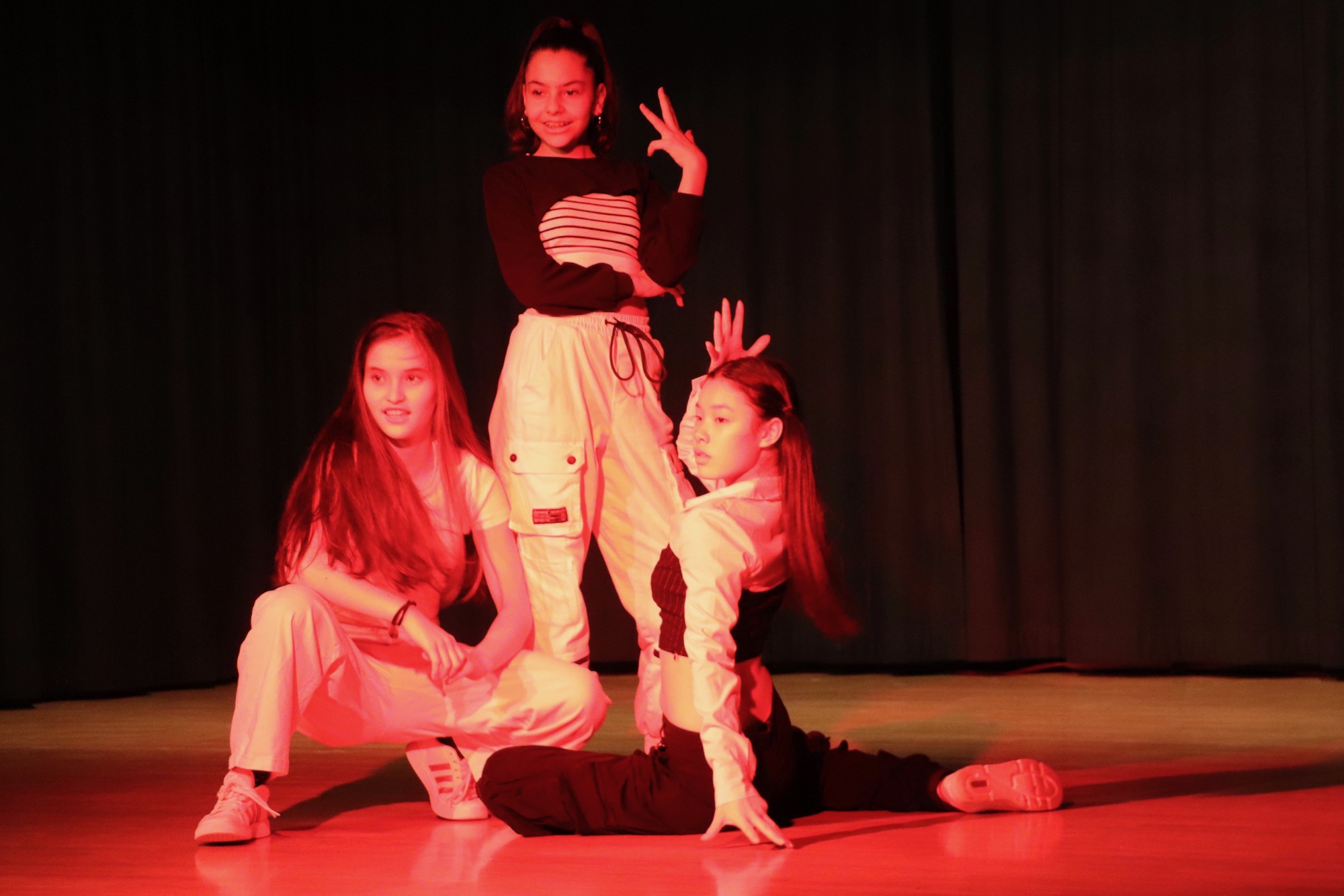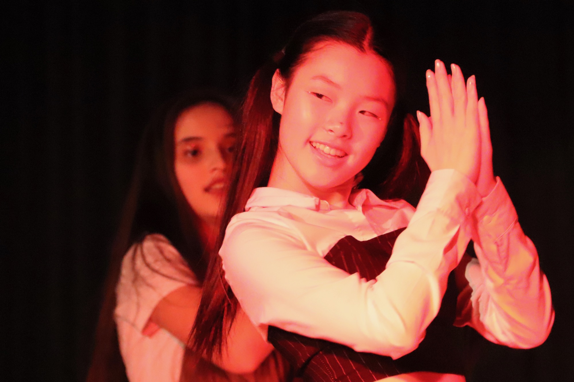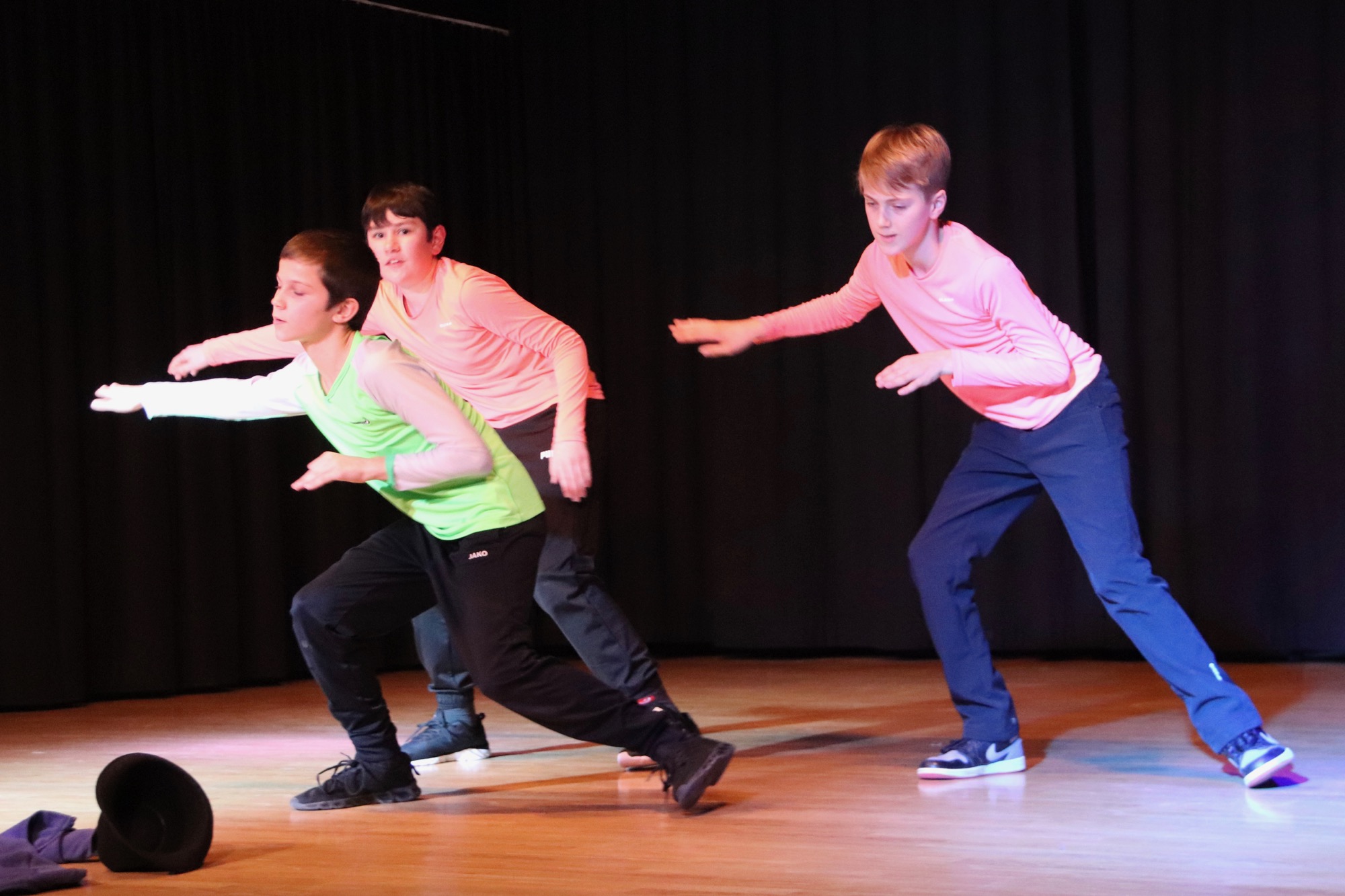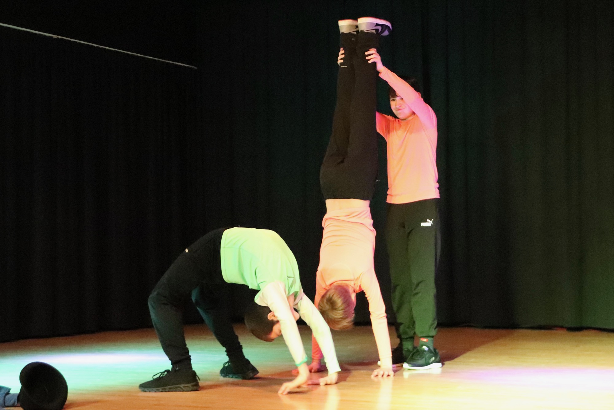 Die Kunstform Tanz stellt seit jeher eine wichtige Säule des Kul(tur)inarischen Abends dar – und auch dieses Jahr gab es davon eine große Bandbreite zu genießen. Denn unterschiedlicher konnten die Tanzstile der nun folgenden Künstler*innen kaum sein: Von Latin über Hip-Hop und Ballett bis hin zu Contemporary Dance entfaltete sich die Vielfalt dieser Kunstform auf der Bühne des Theaterraums. Die Geschwister Raphael Jähnig (6e) und Victoria Jähnig (als Gast) zeigten ihr hohes Niveau im Showtanz Latein – von der Körperspannung über die Choreographie bis hin zu den Kostümen eine professionell anmutende Darbietung. Mit den drei nun folgenden Tanzgruppen konnten die Zuschauer etwas Après-Ski-Luft schnuppern: Die Siebtklässler*innen zeigten ihre tänzerischen Darbietungen, mit denen sie bei der Schneesport-Woche in Wolkenstein angetreten waren – mit Hip-Hop-Moves brachten Felix Dölken, Felix Küls und Konstantin Sattler (alle 7a) Stimmung in den Saal; Dorothee Becker und Larissa Künne (beide 7f) bezauberten mit einer anmutigen zeitgenössischen Choregraphie – und Hanna Jang, Naelle Kim und Alisa Sarkisyan (alle 7f) zeigten ihren lässigen Videoclip-Dance. Das Publikum klatschte eifrig mit.