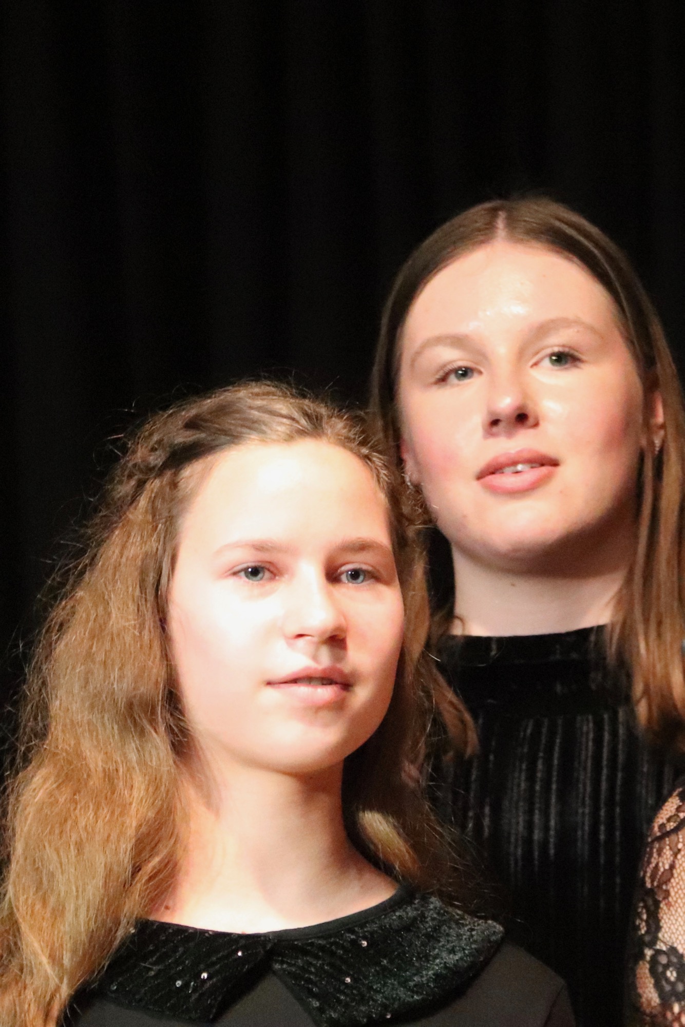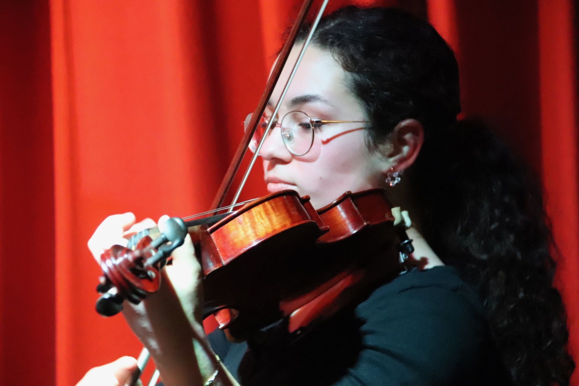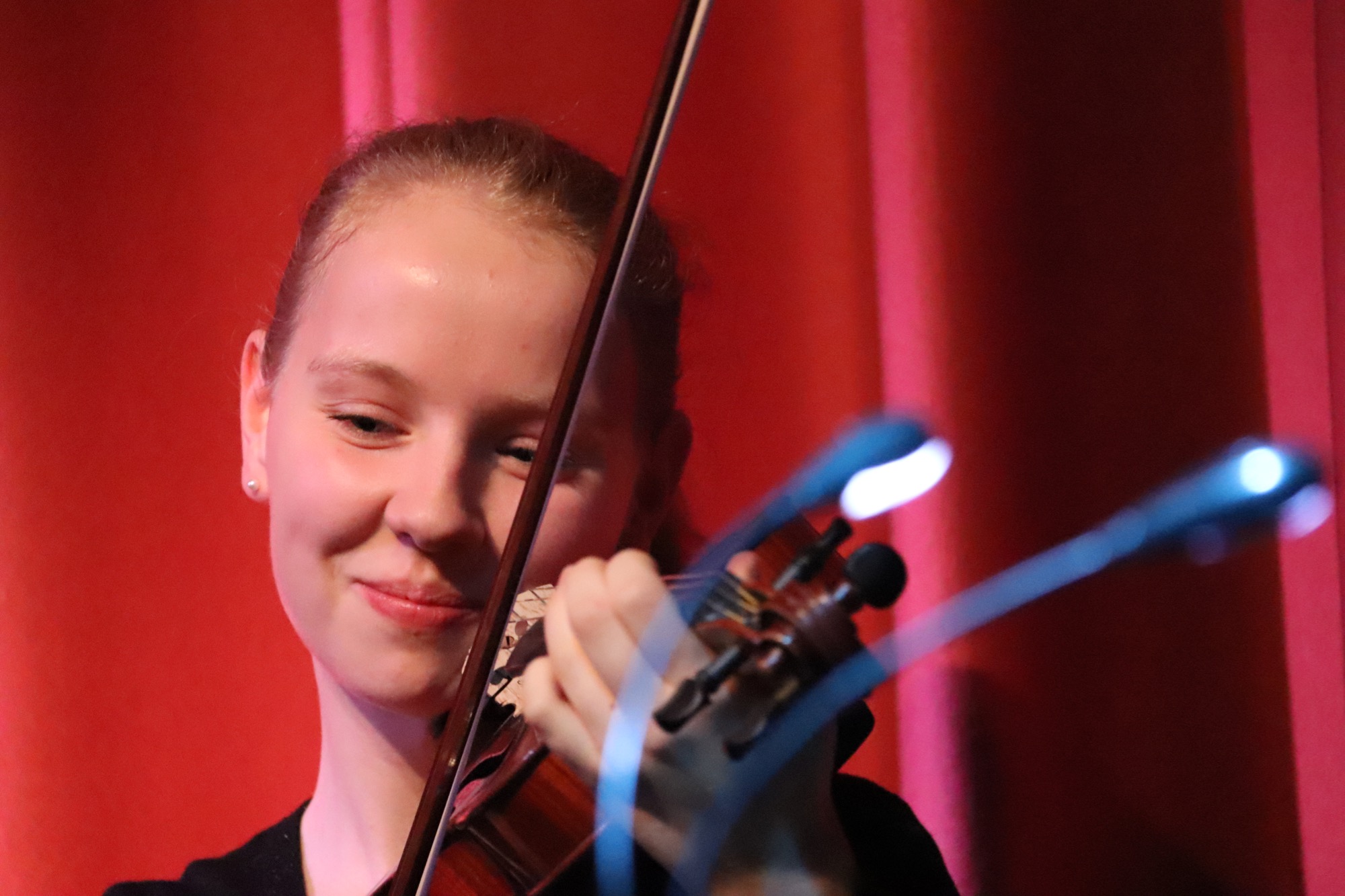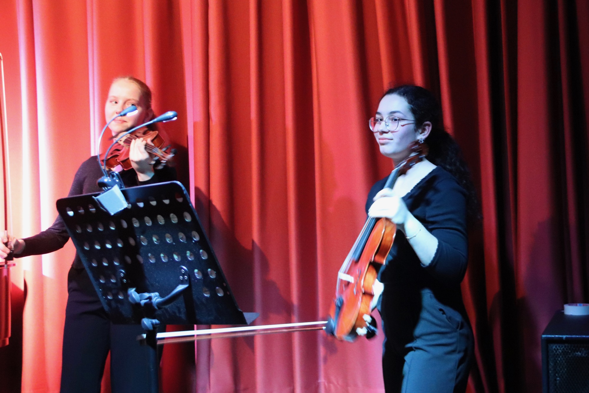 Catarina von Hoffmeister (6e) verzauberte das Publikum mit den „Variationen über ein Thema von Paganini“ von Isaak Berkowitsch am Flügel. Anschließend beeindruckten Tara Grimm (E2) an der Violine, Carlotta Hembach (als Gast) ebenfalls an der Violine und Frau Dr. Eden am Flügel mit dem anspruchsvollen 1. Satz aus dem Doppelkonzert für zwei Violinen und Klavier (BWV 1043) von Johann Sebastian Bach.