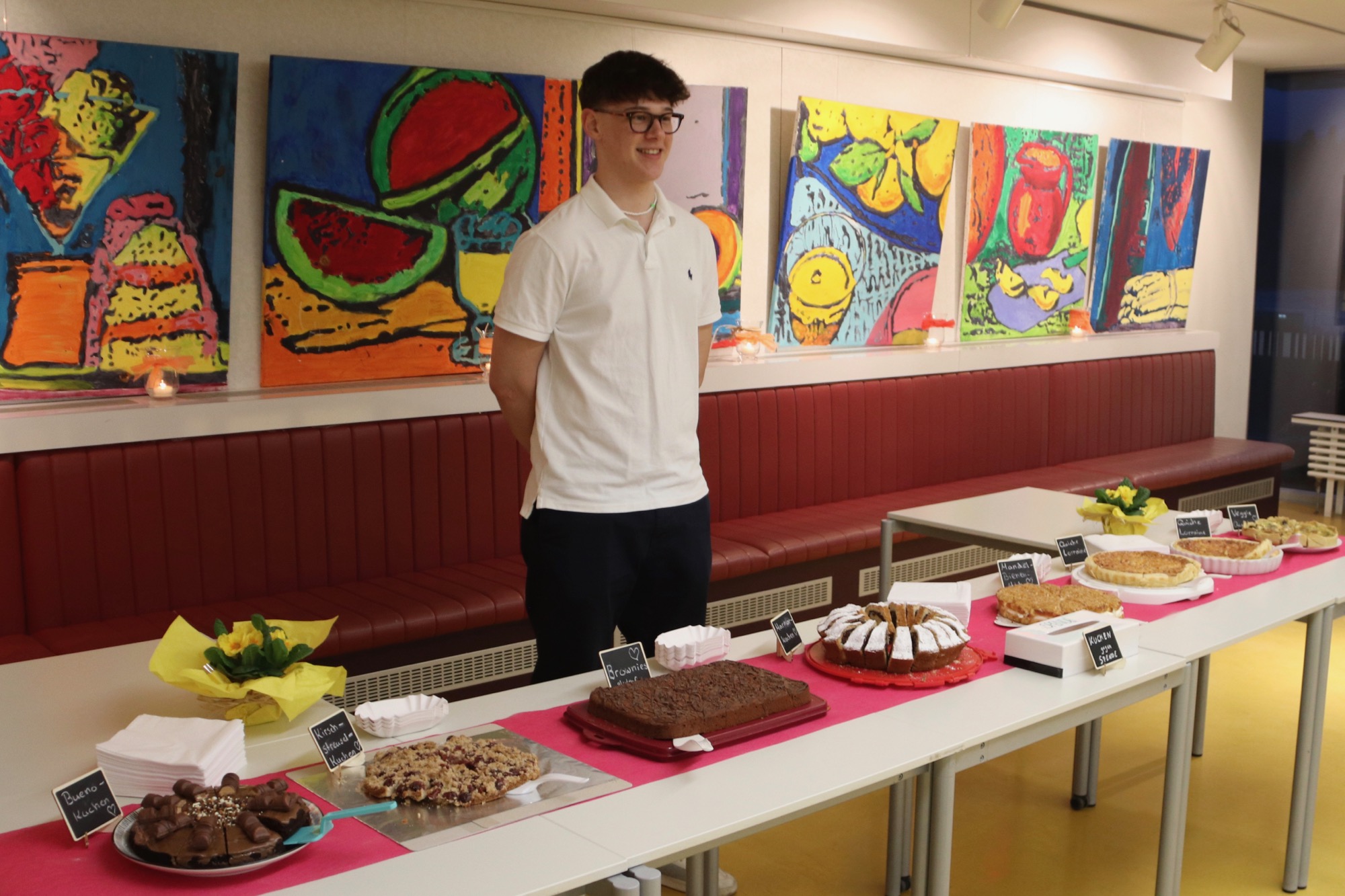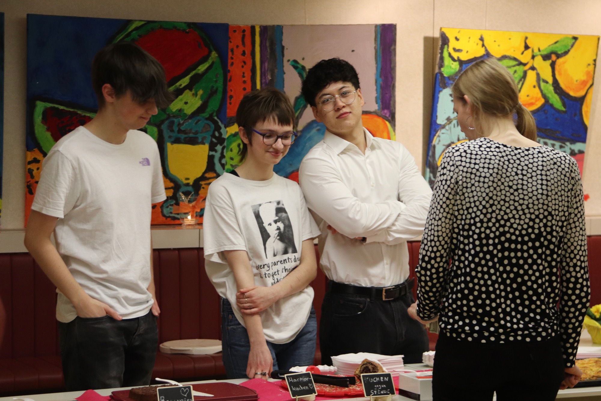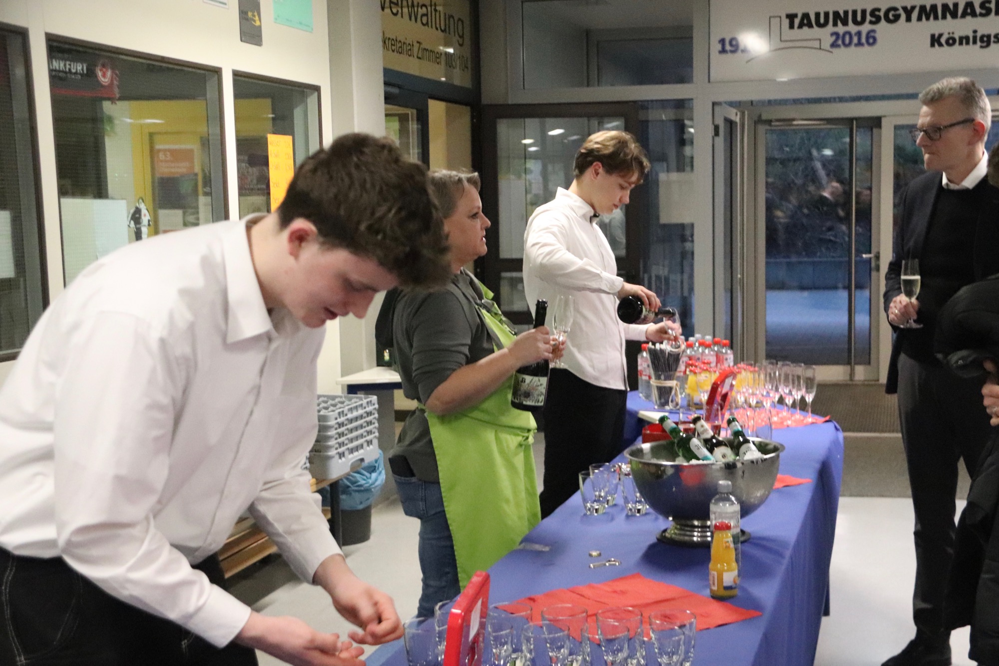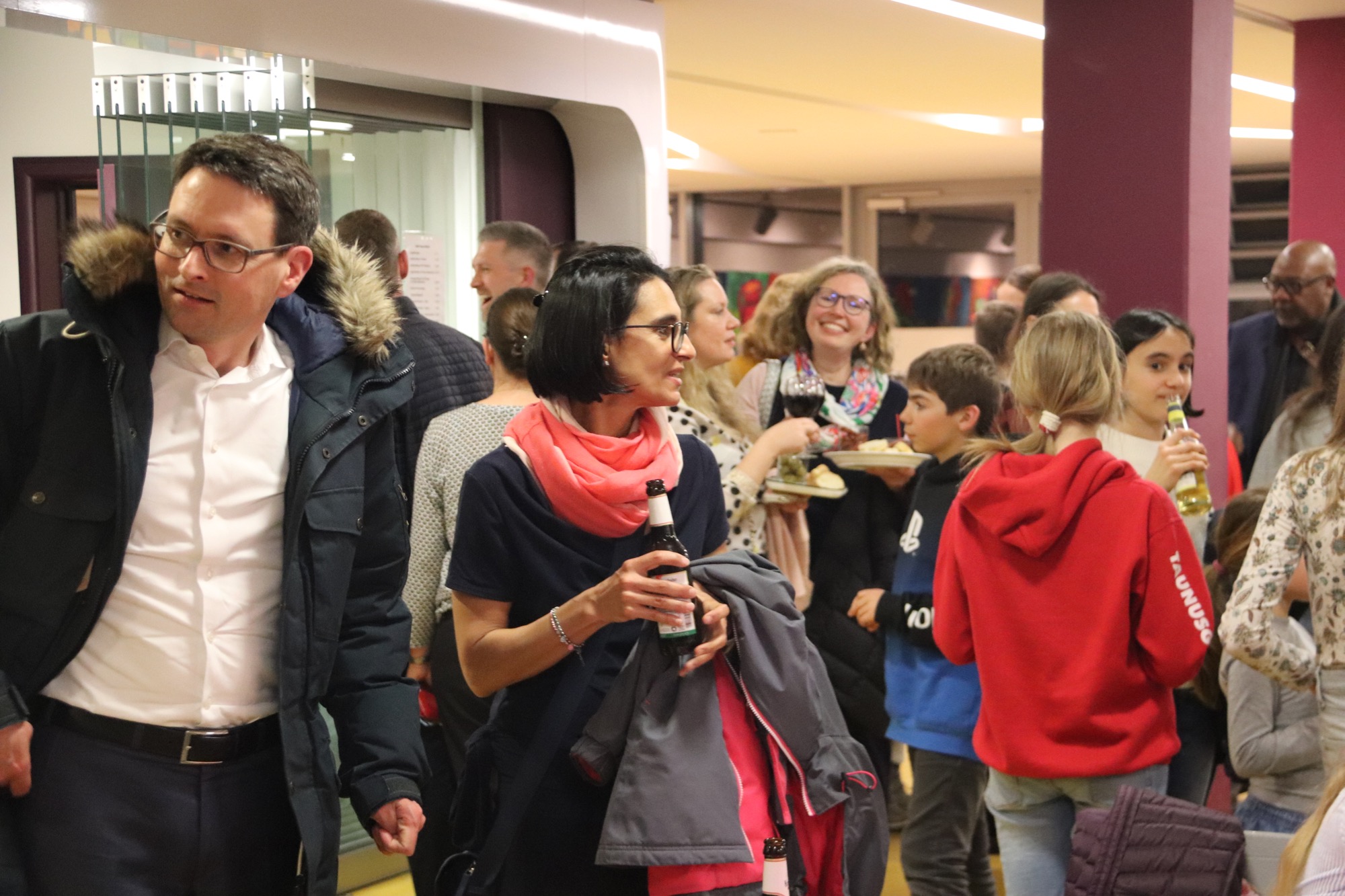 Nachdem die stellvertretende Schulleiterin Frau Koch den beiden Organisatoren Frau Antony und Herrn Rauschmayer für den gelungenen und umsichtig geplanten Abend gedankt hatte und den beiden zusammen mit Herrn Linke riesige Blumensträuße überreicht hatte, ging es ein Stockwerk tiefer in der Cafeteria weiter: Der kulinarische Teil des Abends konnte beginnen. Frau Hellbach, Frau Milke, Frau Stahl-Nessler, Frau Draheim und zahlreiche Helfer*innen aus dem WoB-Team sowie aus dem Abiturjahrgang 2025 hatten leckere Antipasti-Teller vorbereitet, die zu einer feinen Getränke-Auswahl genossen wurden. Gegen Spenden konnten auch Kuchen und Quiches genossen werden. Und so wurde in stimmungsvoller Atmosphäre noch lange über die zahlreichen Talente geplaudert, die das Taunusgymnasium immer wieder hervorbringt, und die oft erstmals am Kul(tur)inarischen Abend zum Vorschein kommen. (Rmy)