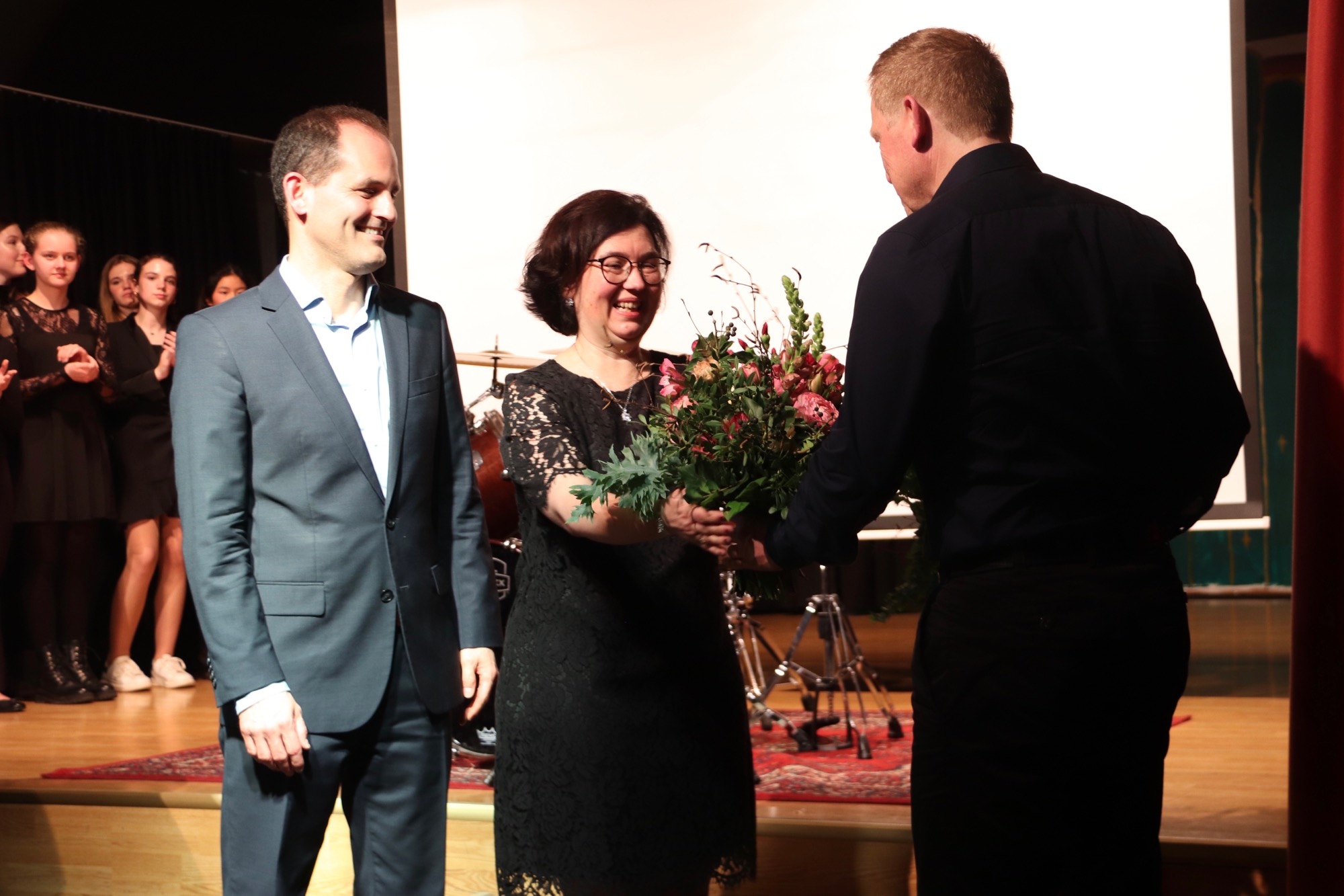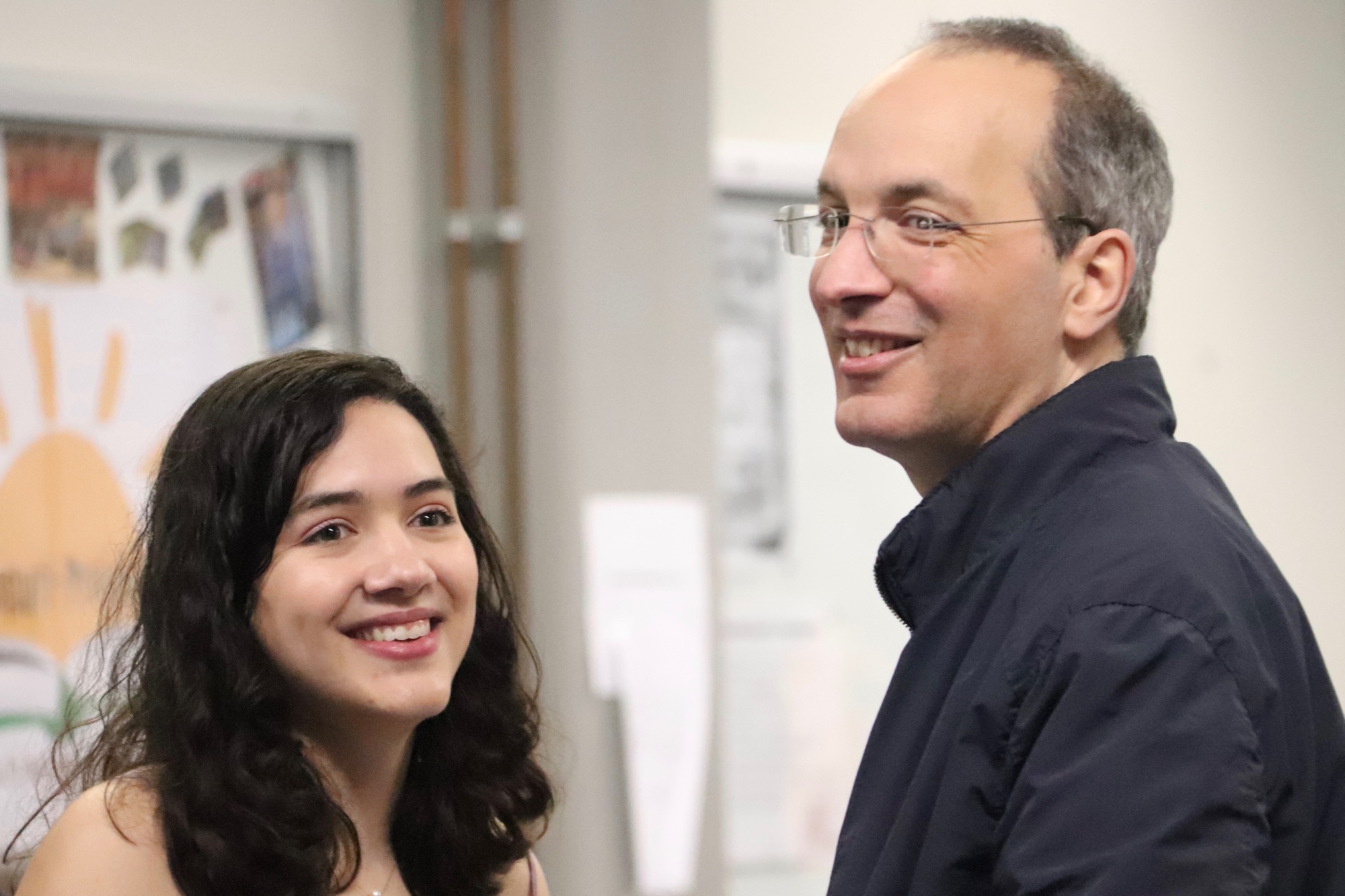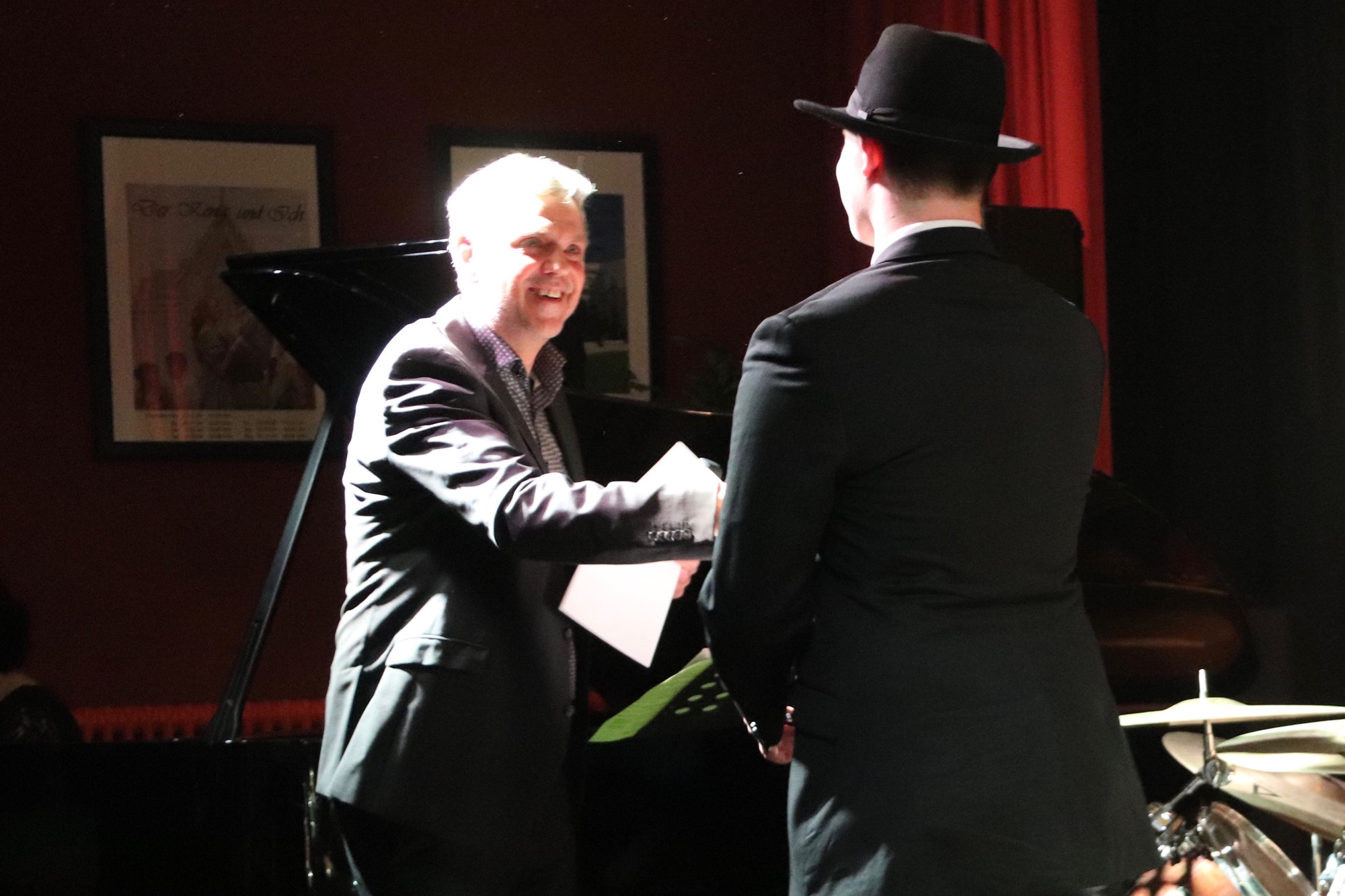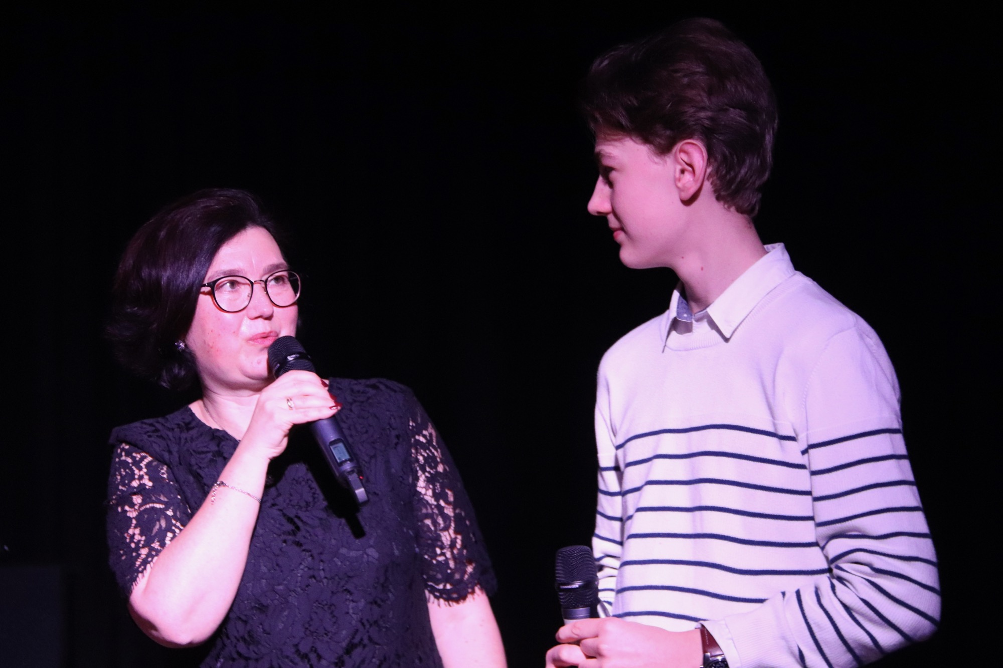 Frau Antony kündigte einen ungewöhnlichen Beitrag an: den Kurzfilm „Amour Fou“, der im Zusatzkurs „Filmmusik“ der E-Phase unter Leitung von Herrn Hublow komplett neu vertont worden war. Michael Berenbaum und Elias Leemüller (beide Q2) stellten das Gemeinschaftswerk stellvertretend vor, und das Publikum war beeindruckt ob der äußerst stimmigen Tonspur, die dem temporeichen Animationsfilm an Professionalität in nichts nachstand.