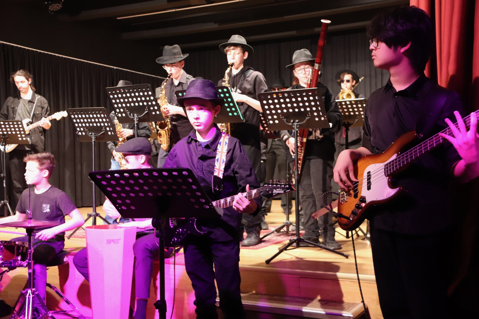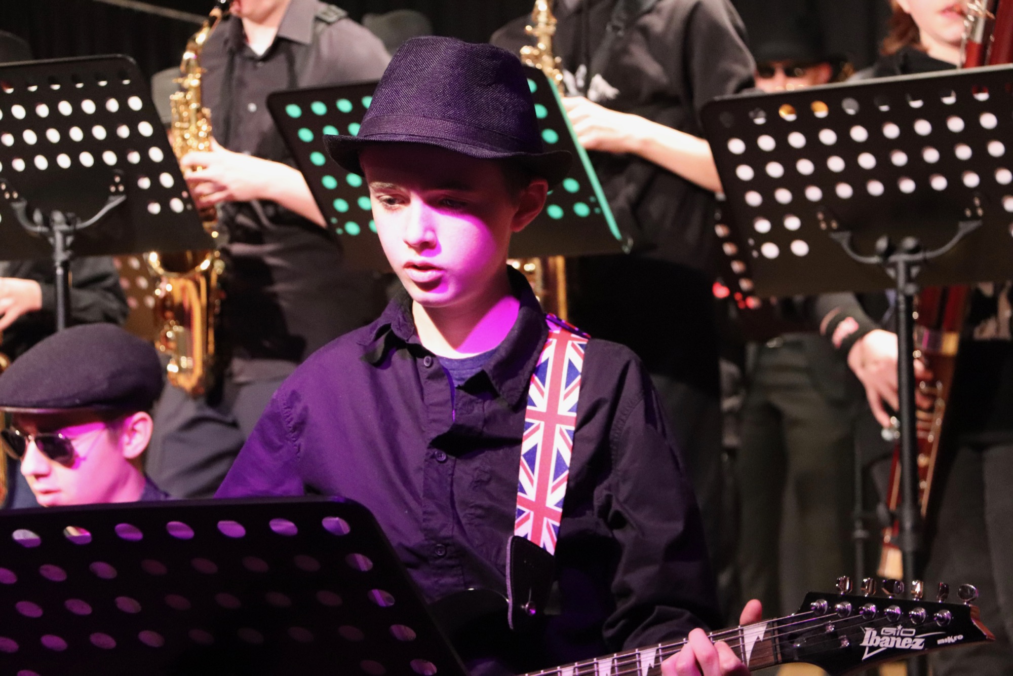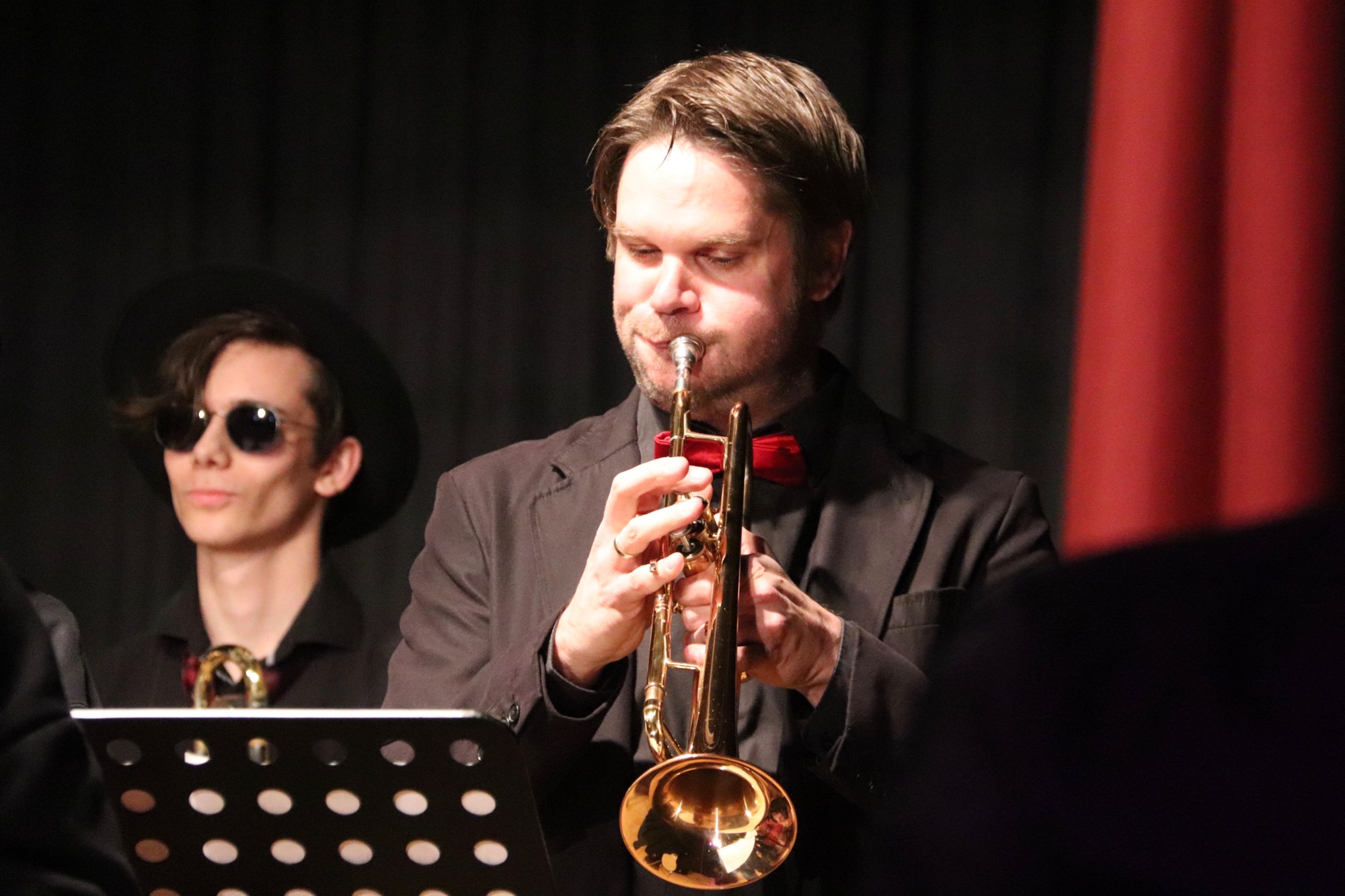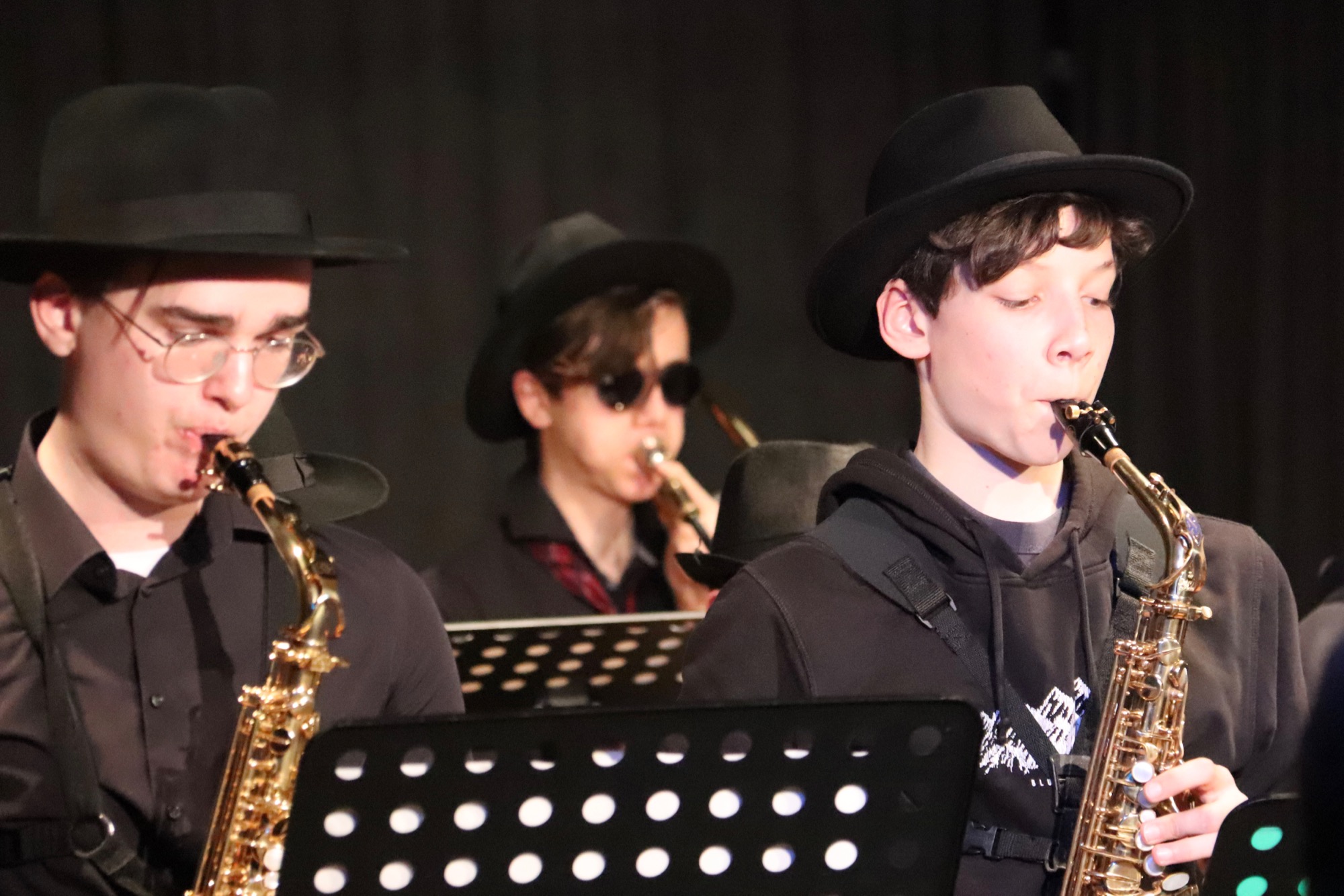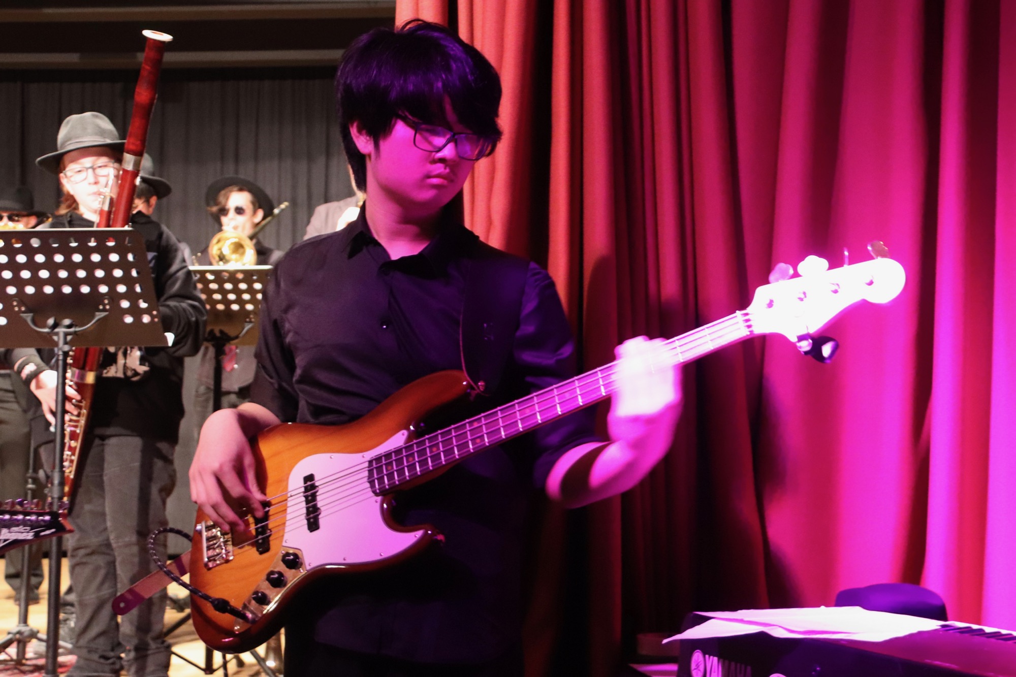 Der Tradition folgend, startete die TGK-BigBand unter der Leitung von Herrn Kriegeskotte und Herrn Hublow mit den mitreißenden Stücken „The Pink Panther“ und „Walk On By“, letzteres gefühlvoll gesanglich unterstützt von der ehemaligen Schülerin Lea Klein. An den Klarinetten spielten Felix Dölken (7a) und Johannes Hogg (7c), am Horn Darius Cleppien (7a), an den Saxophonen Lugh Dittmer (Q4), Denis Reznichenko (7f) und Luca Straßberger (8f), am Fagott David Wagner (8a), an den Trompeten Woo June Kang (7a) und Herr Kriegeskotte, an den Posaunen Johann Behling (10b), Roman Klein (7e), Richard Michels (Q4) und Felix Weiland (Q4), an der Tuba Robert Michels (10b); die Rhythmusgruppe bestand aus Philipp Dützmann (Gitarre, 7a), dem ehemaligen Taunusgymnasiasten Alex Poppe (Gitarre), Zhe Cheng (E-Bass, E2), Elias Leemüller (Piano, Q2), Linus Fujita (Schlagzeug, 7d) sowie dem ehamligen Schüler Lukas Kieslich (Schlagzeug/Perkussion).