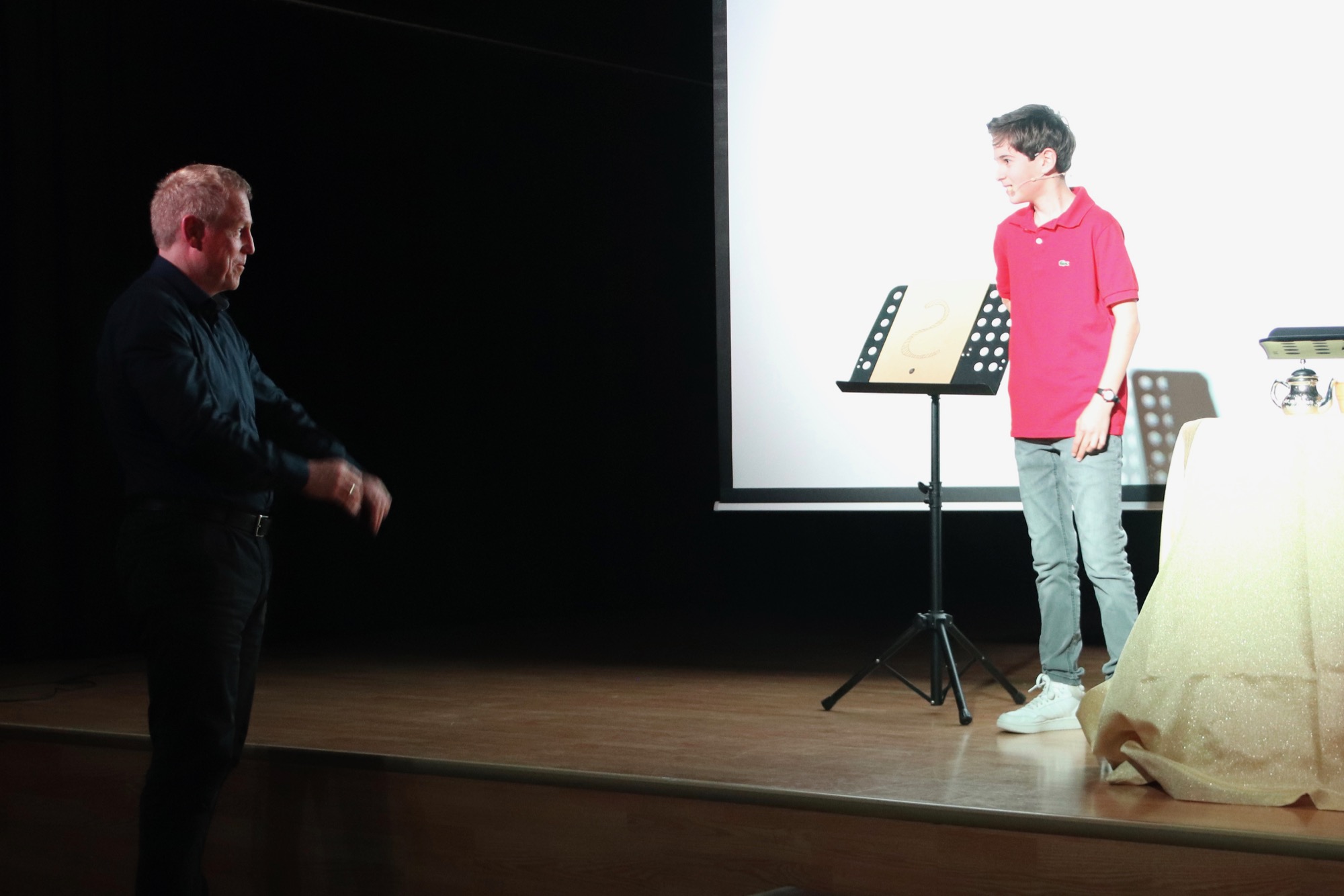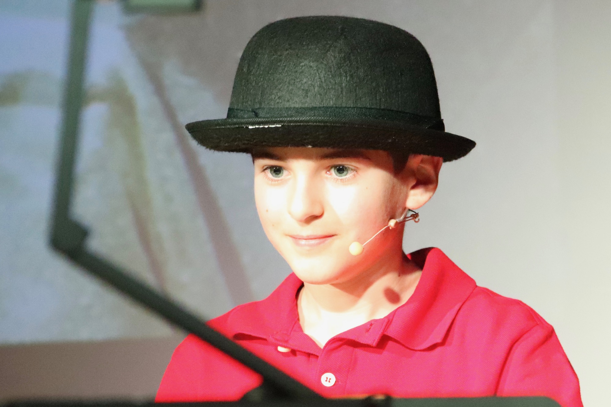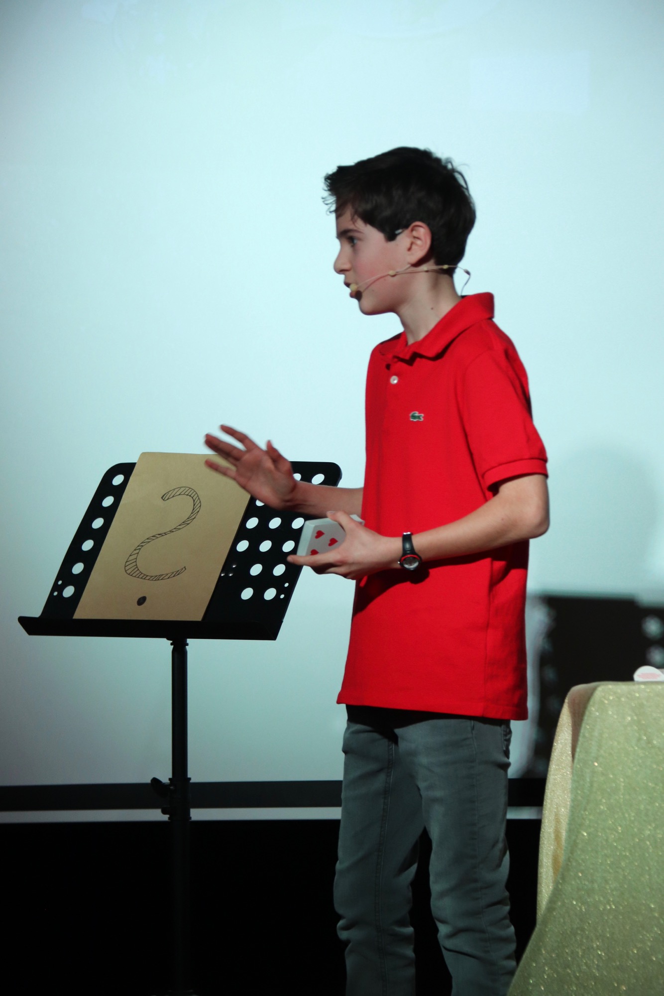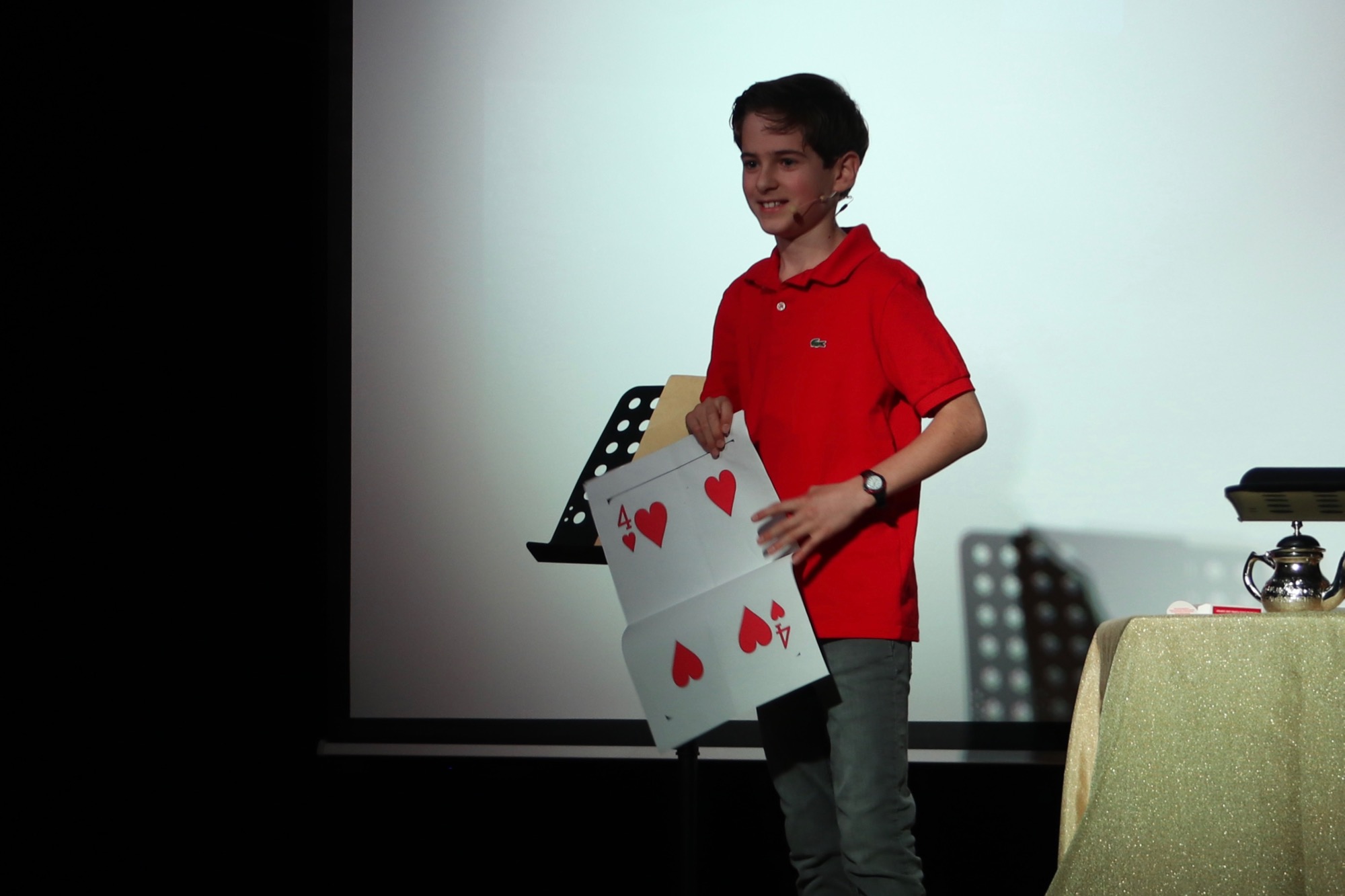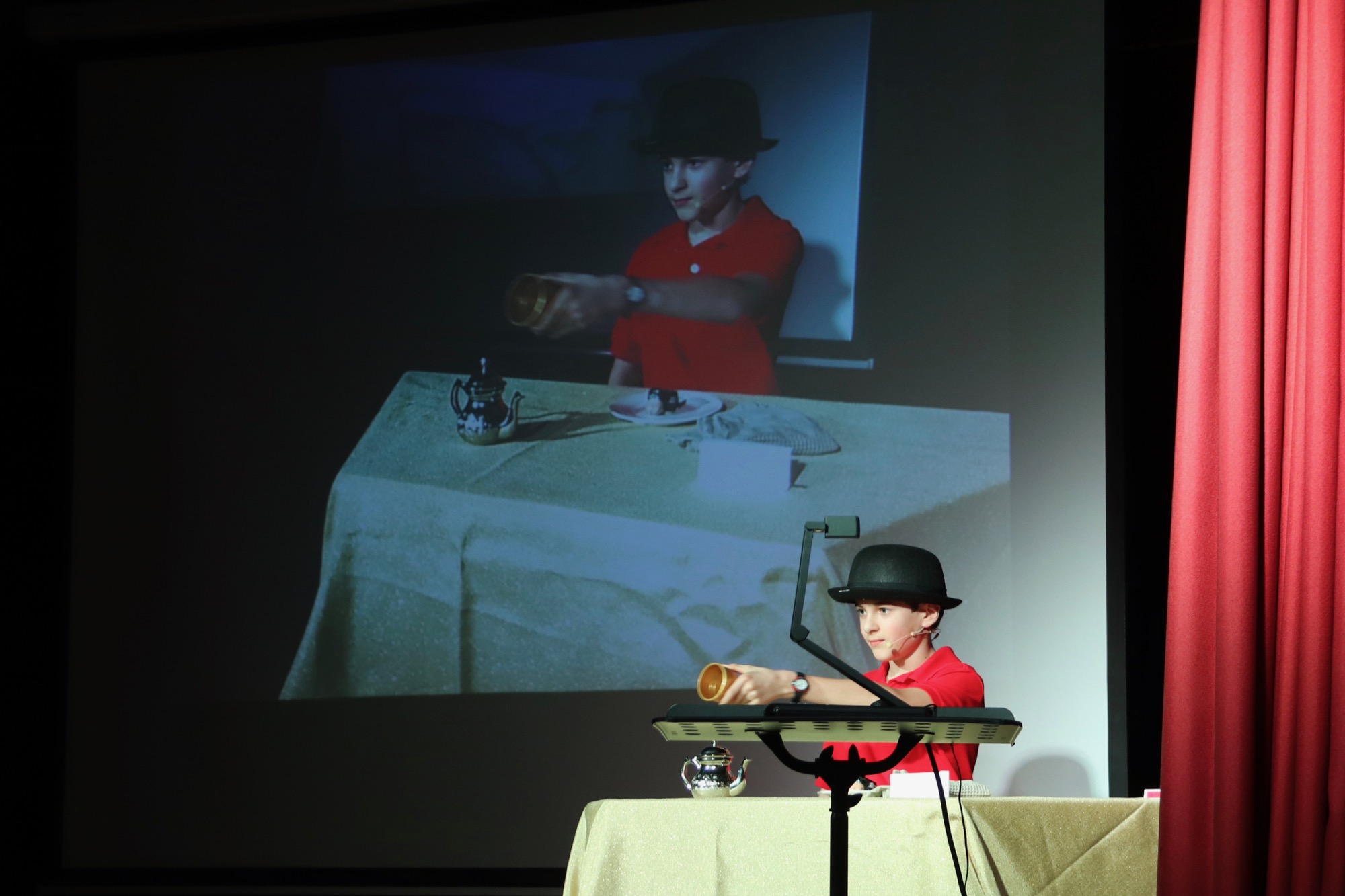 Mit seiner sympathischen Art und seiner versierten Zauberkunst gewann auch Sami Körner (6d) das Publikum für sich. Er zeigte – mit Herrn Linke als special guest – zunächst verblüffende Kartentricks und zauberte dann an seinem Frühstückstisch Eier und Salz aus dem Nichts hervor.