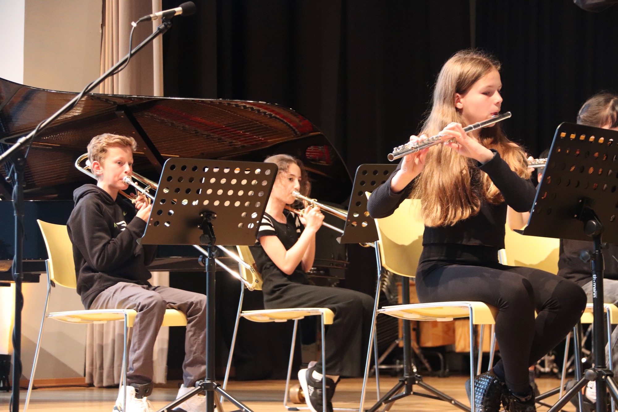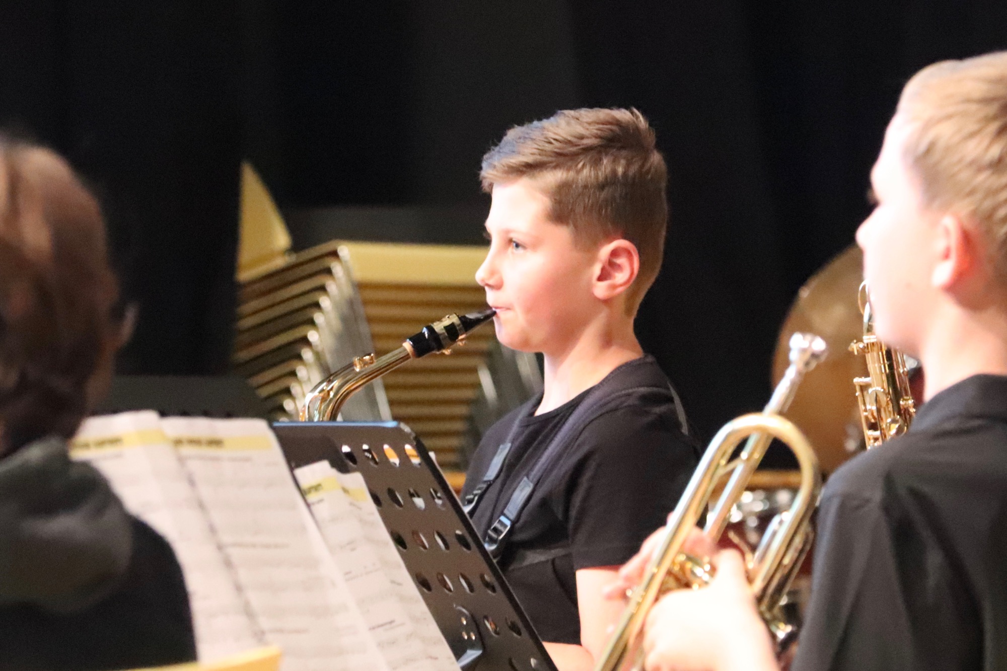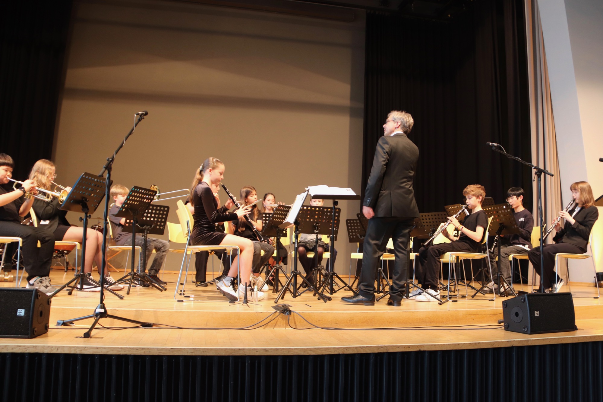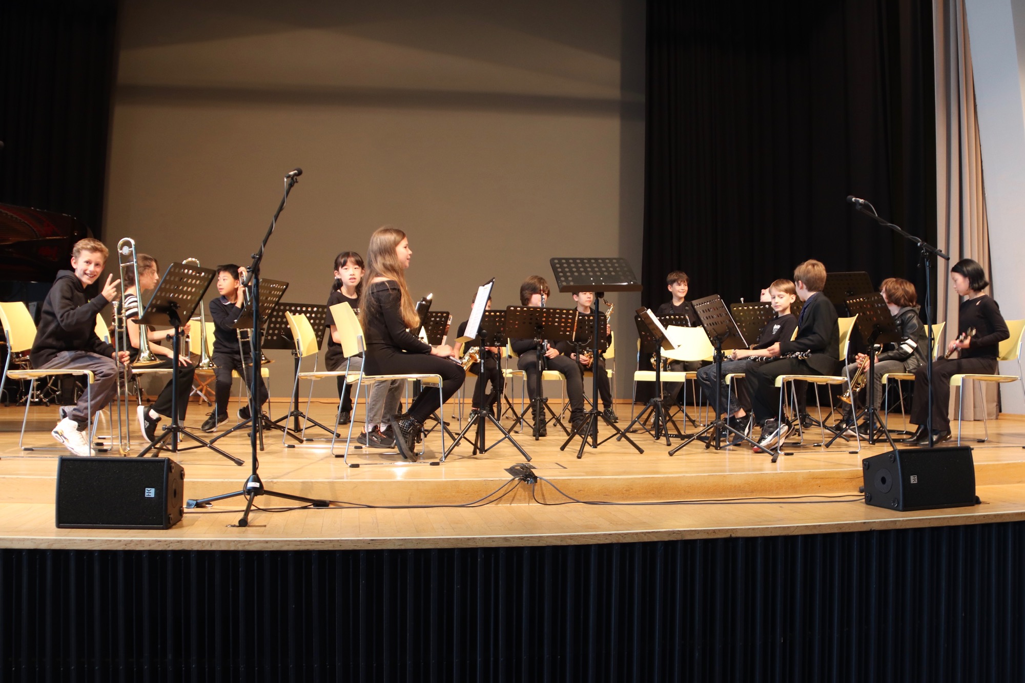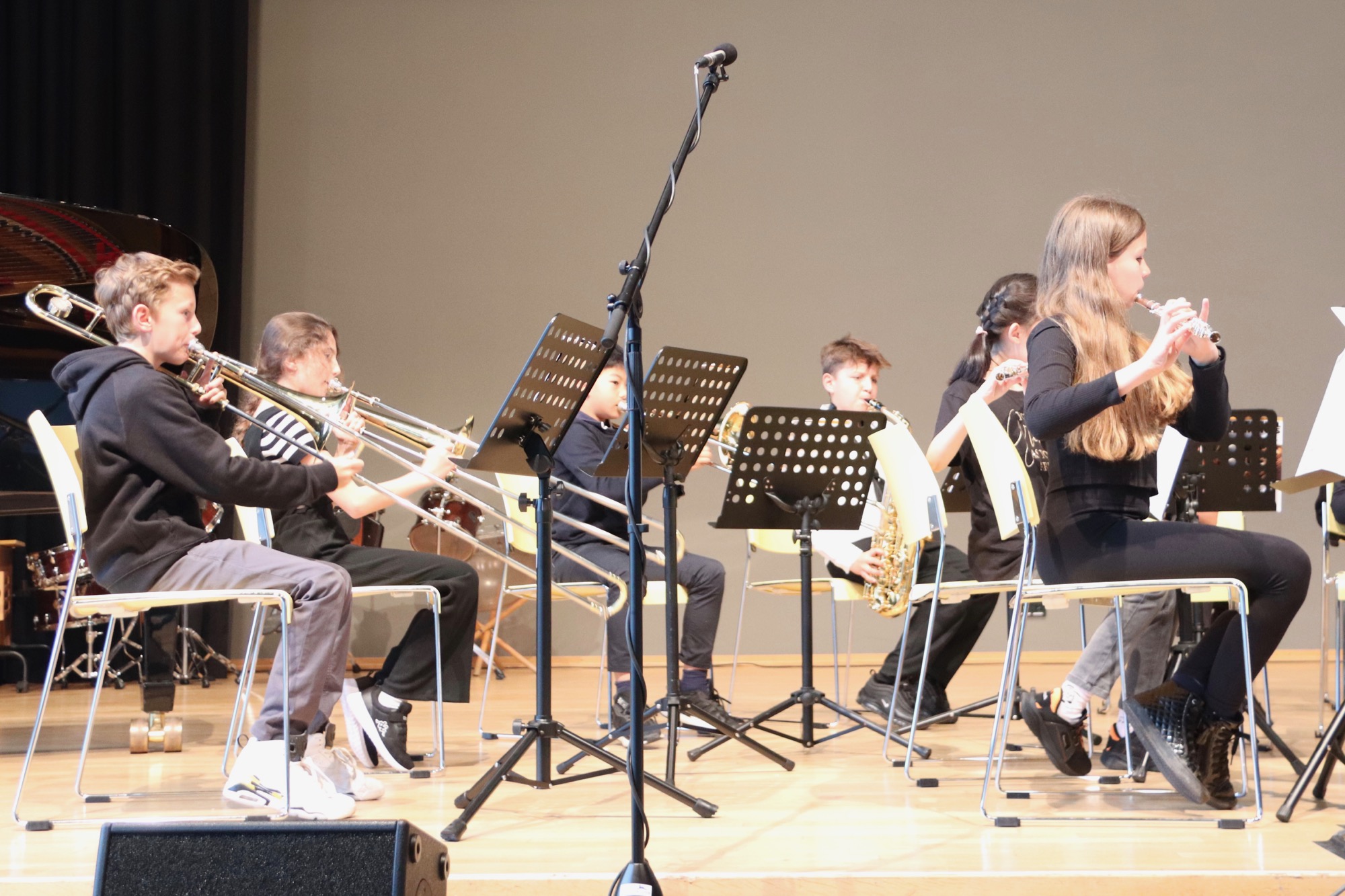 Das erste Konzert war den Musik-Schwerpunktklassen der Jahrgangsstufen 5 und 6 vorbehalten. Die Bläsergruppe der Klasse 5 machte mit dem traditionellen Stück „When The Saints Go Marching In“ den Auftakt, es folgte „Hard Rock Blues“ von John Higgins in einem Arrangement von Herrn Hublow – letzterer leitete die Bläsergruppe auch.
