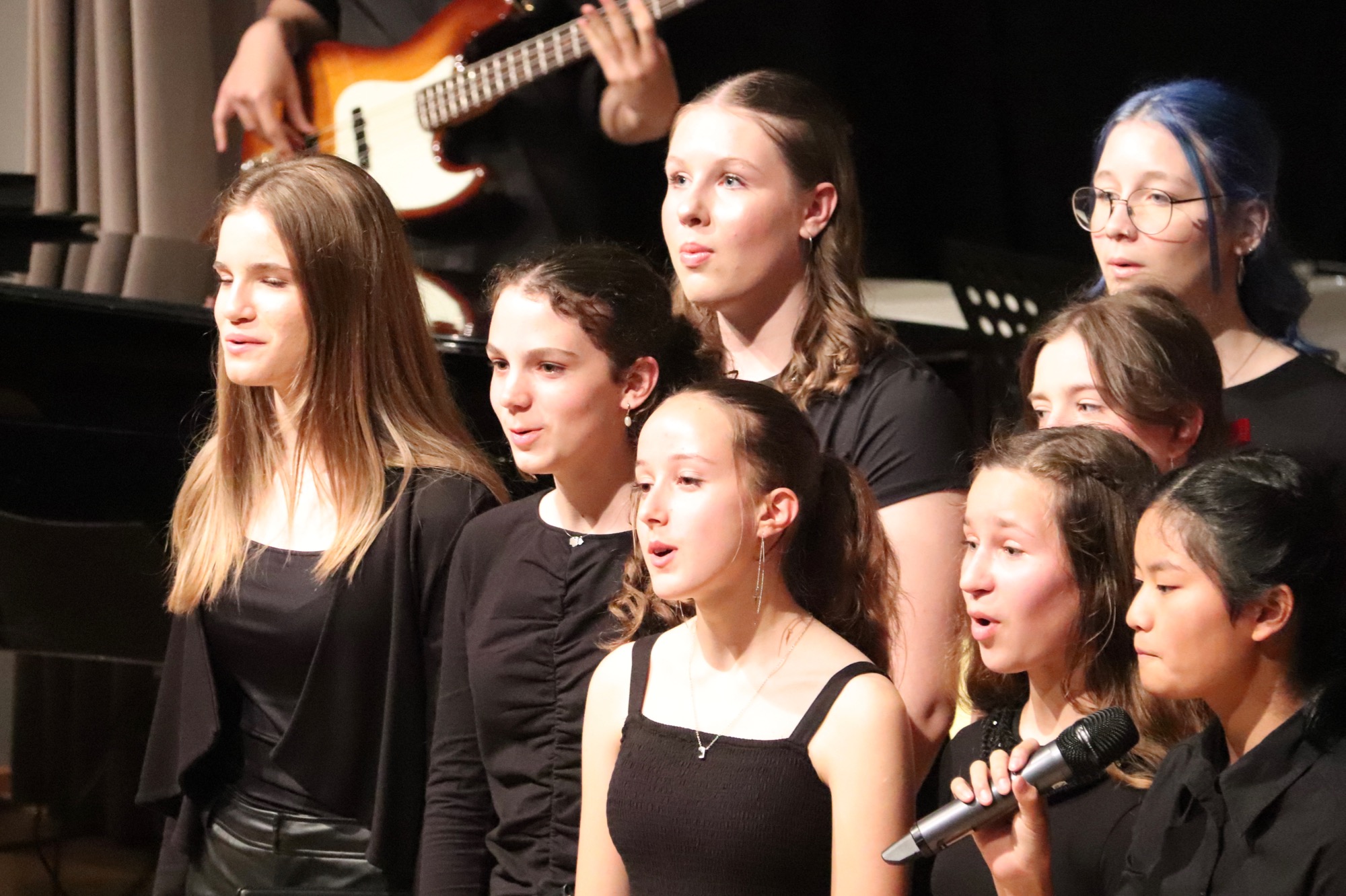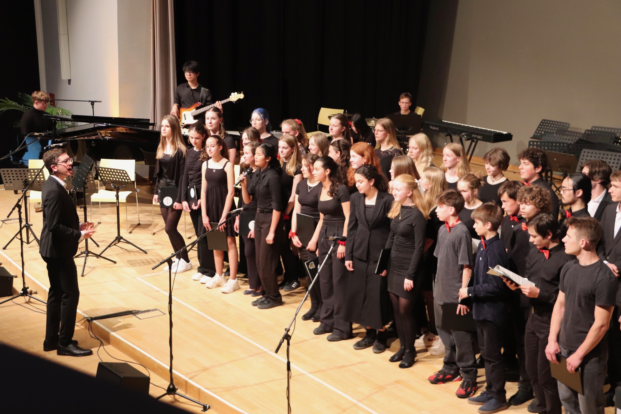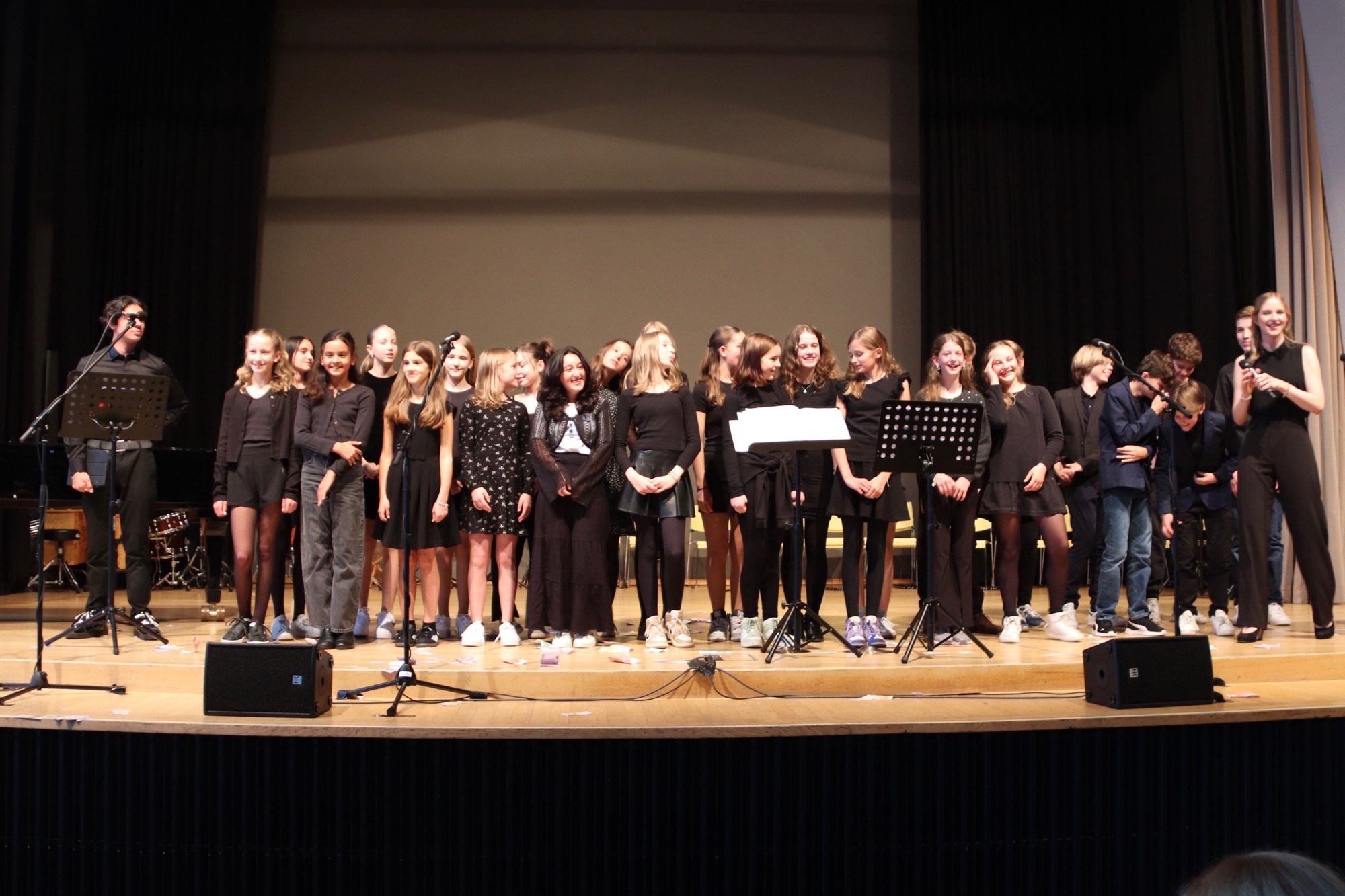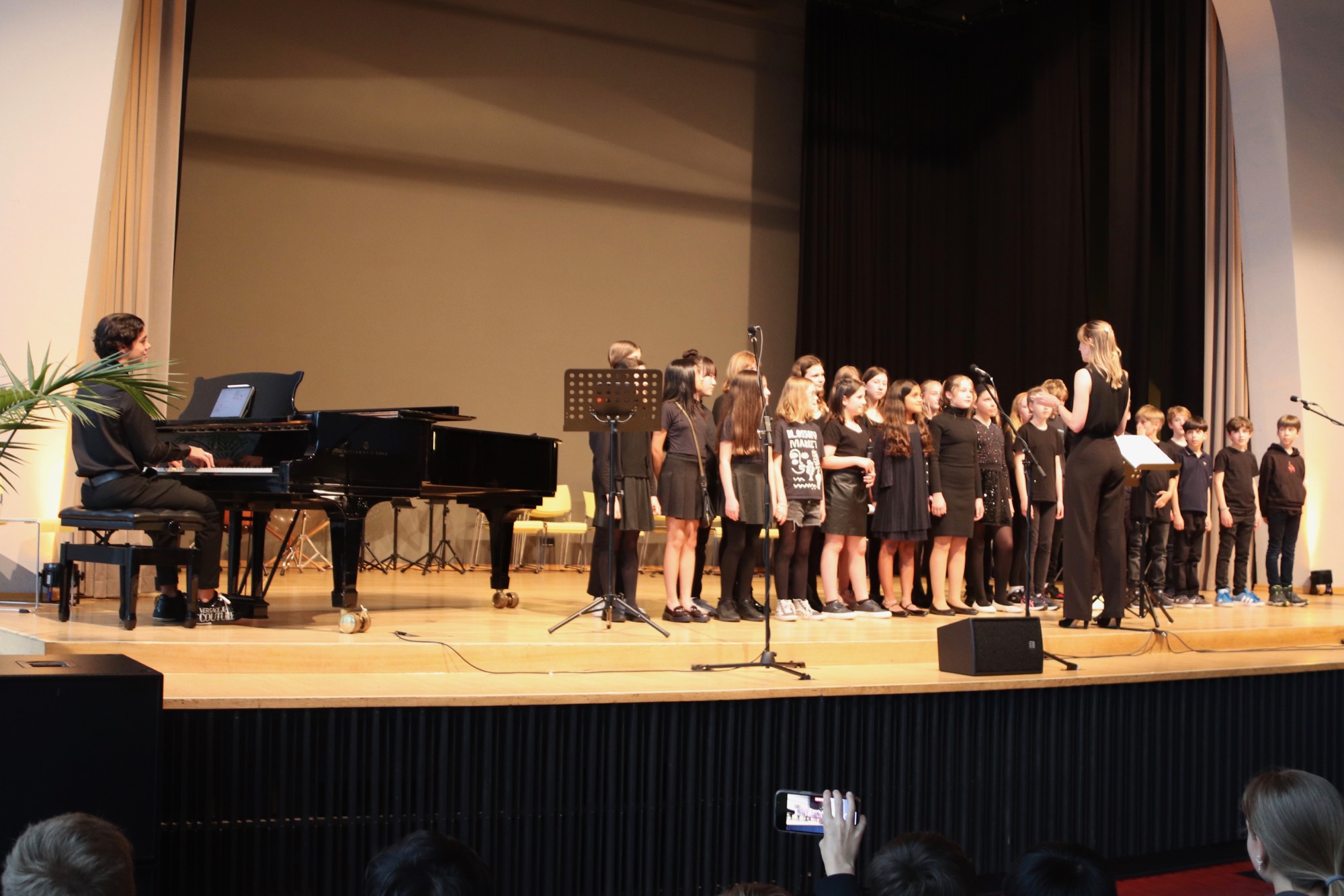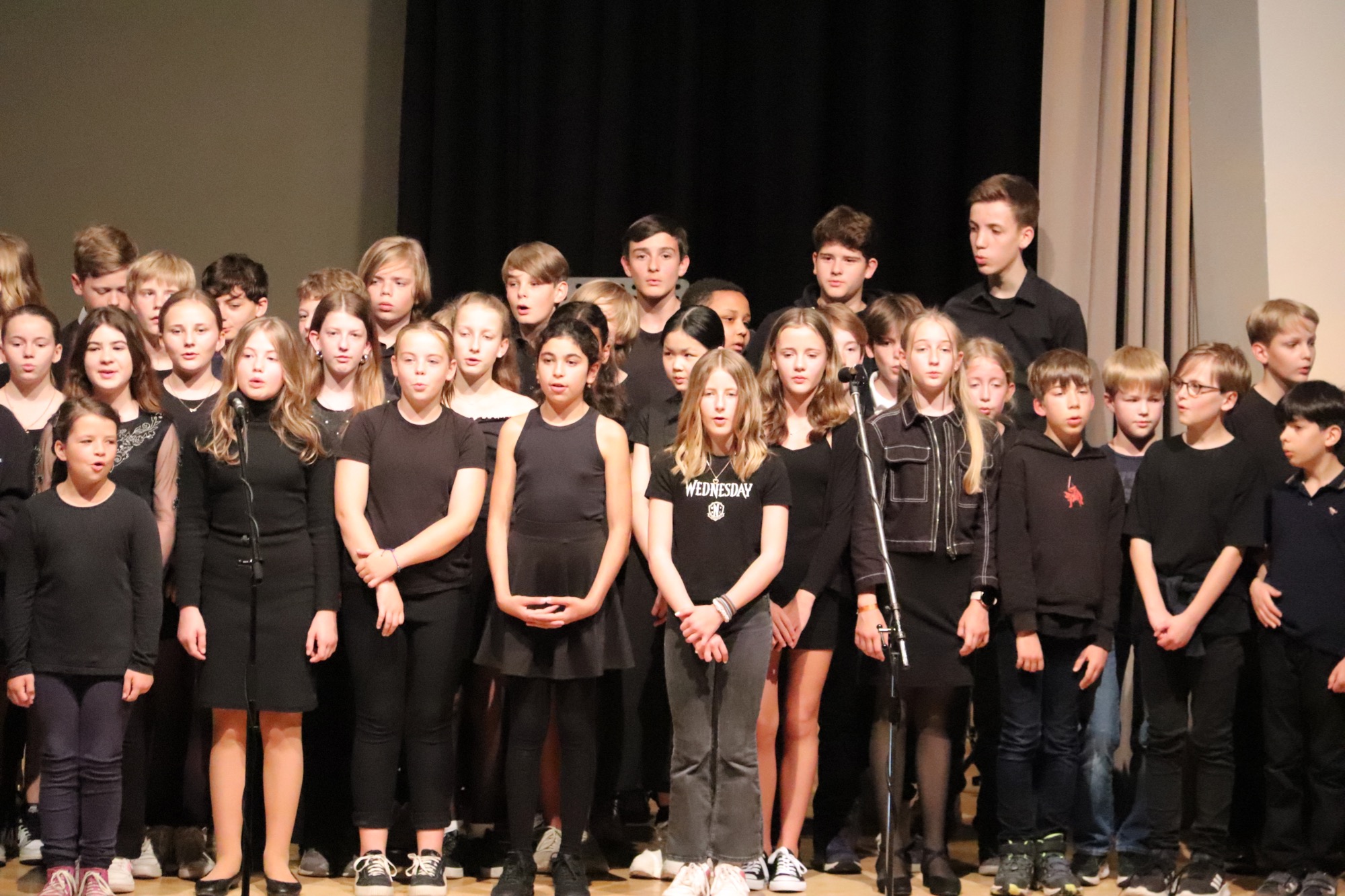 Die etwas größeren Sängerinnen und Sänger formieren mittlerweile einen eigenen Chor, genannt „ChorUs“, der sich auf begeisternde Art verschiedenen Pop-Genres widmet. Der Hit „I want it that way“ von den Backstreet Boys, „Pompeii“ von Bastille – mit einem Gesangs-Solo von Lucio Ramírez del Prado Vetter (Q2) – und der beliebte Abba-Song „Mamma Mia“ – mit Solo-Einlagen von Kira Milke (7b) und Hanna Jang (7f) – brachten den Saal zum Beben.