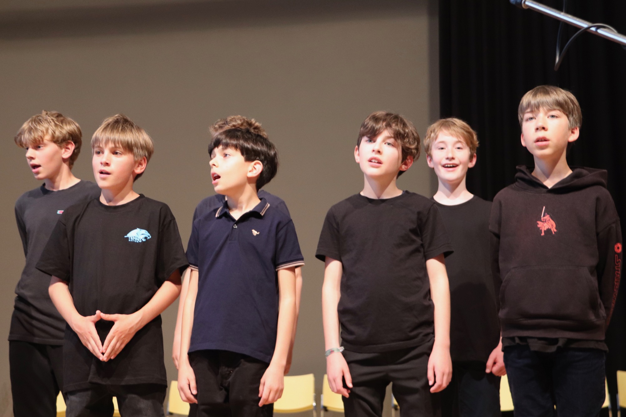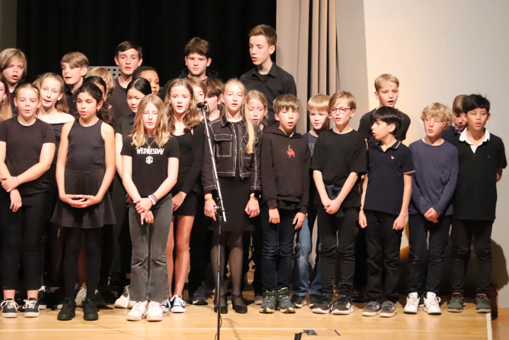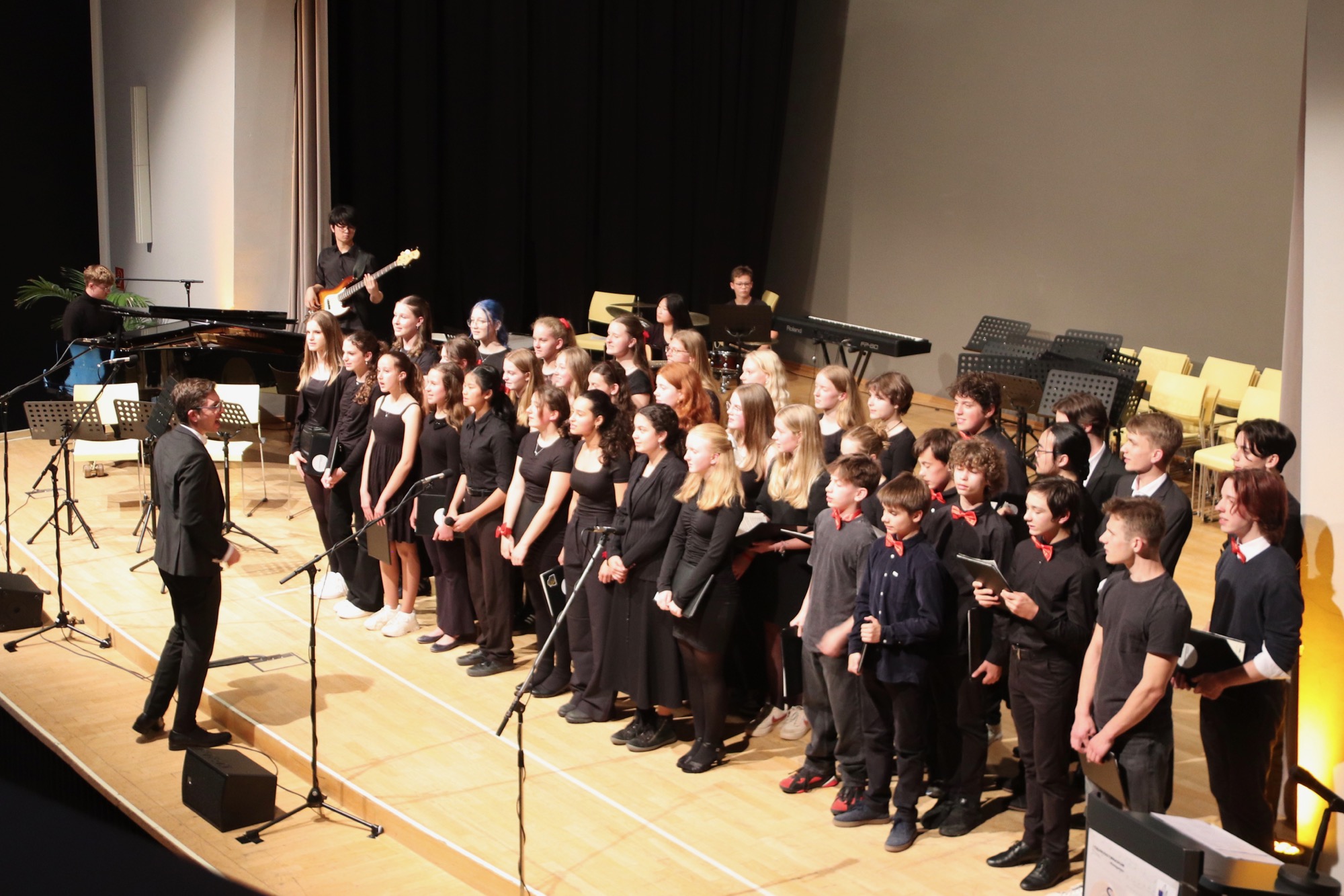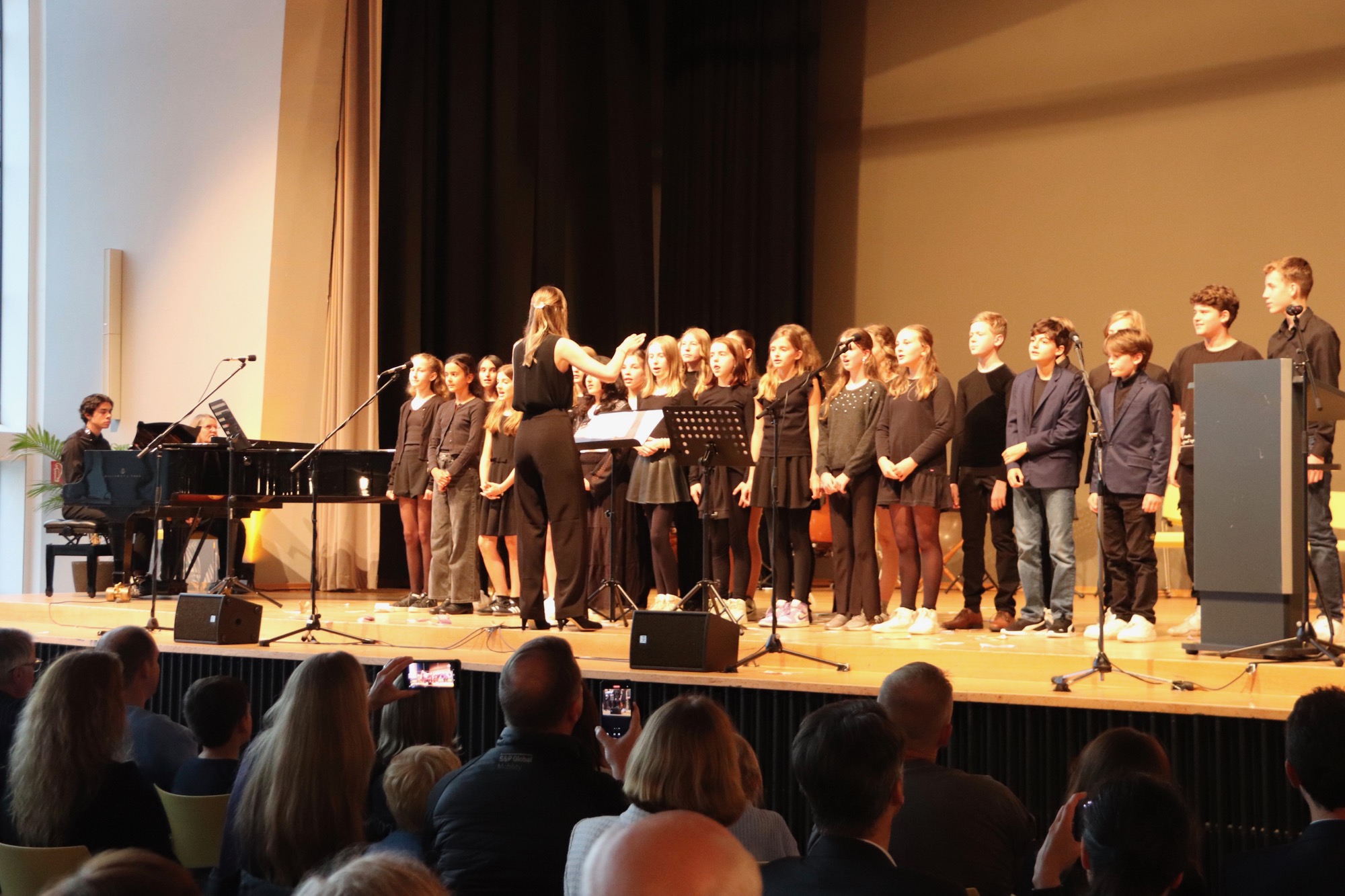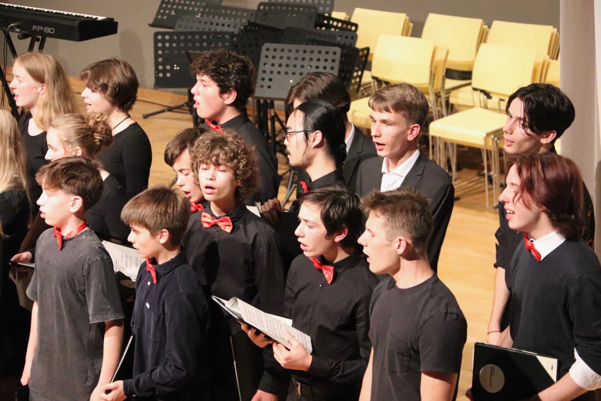 Der kleine Chor brachte auf mitreißende Art den Hit „Count on Me“ von Bruno Mars, den Rock-Klassiker „Another Brick in the Wall“ von Pink Floyd, den frechen Song „Junge“ der deutschen Band Die Ärzte – bei dem der Text von den Chor-Mitgliedern an moderne Zusammenhänge angepasst worden war – und den Evergreen „Country Roads“ von John Denver zu Gehör. Die Leitung hatte Frau Büttner inne, am Flügel begleitete Lucio Ramírez del Prado Vetter (Q2).