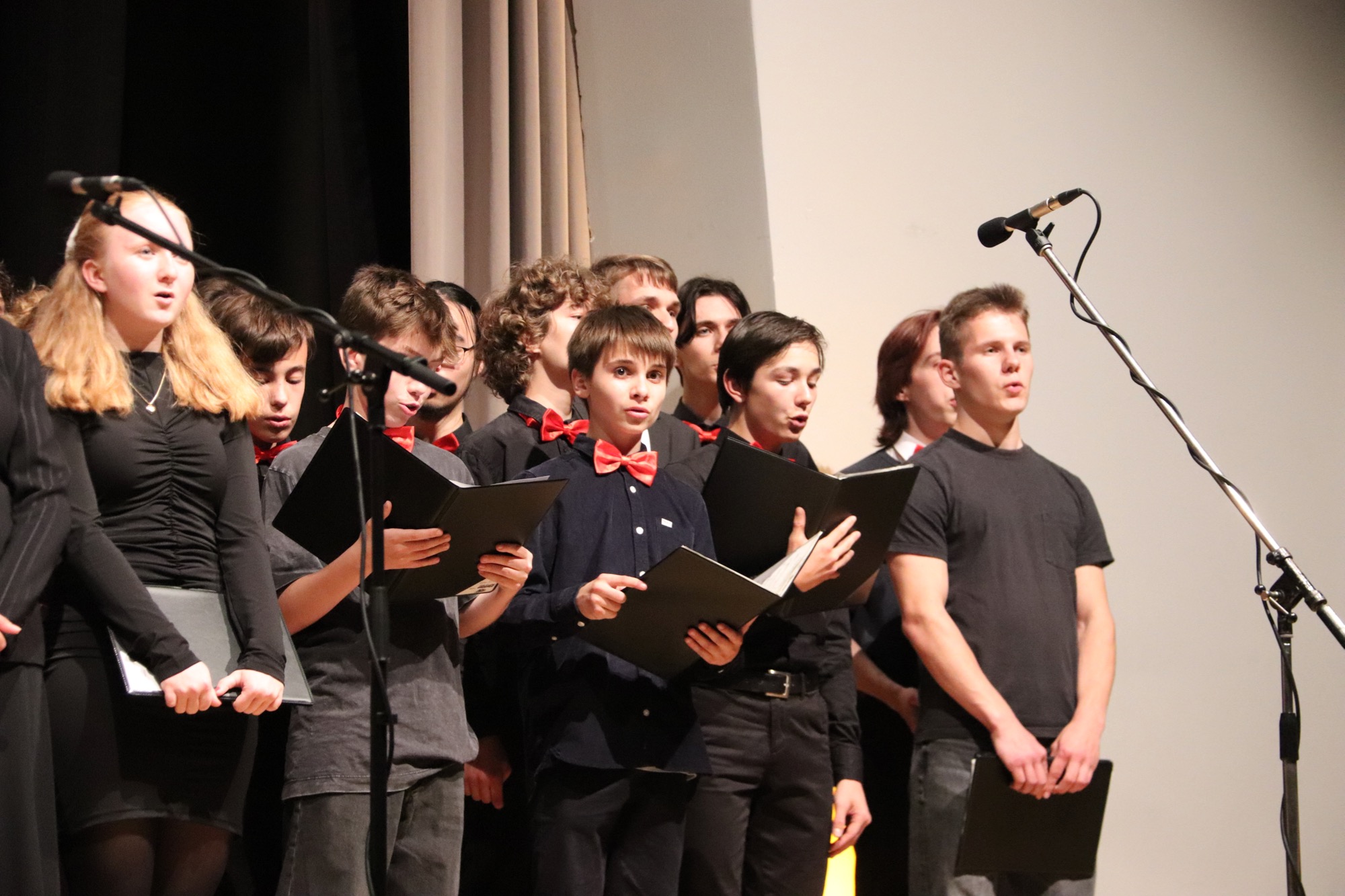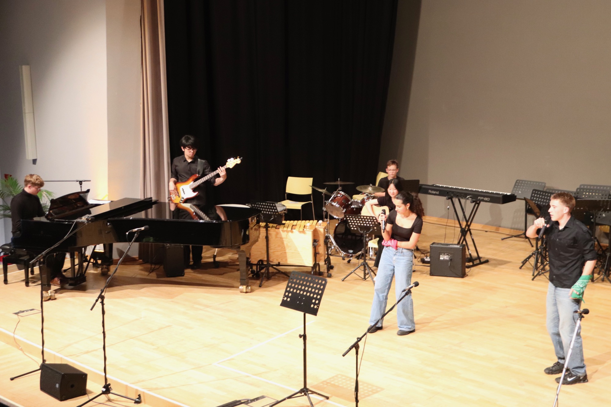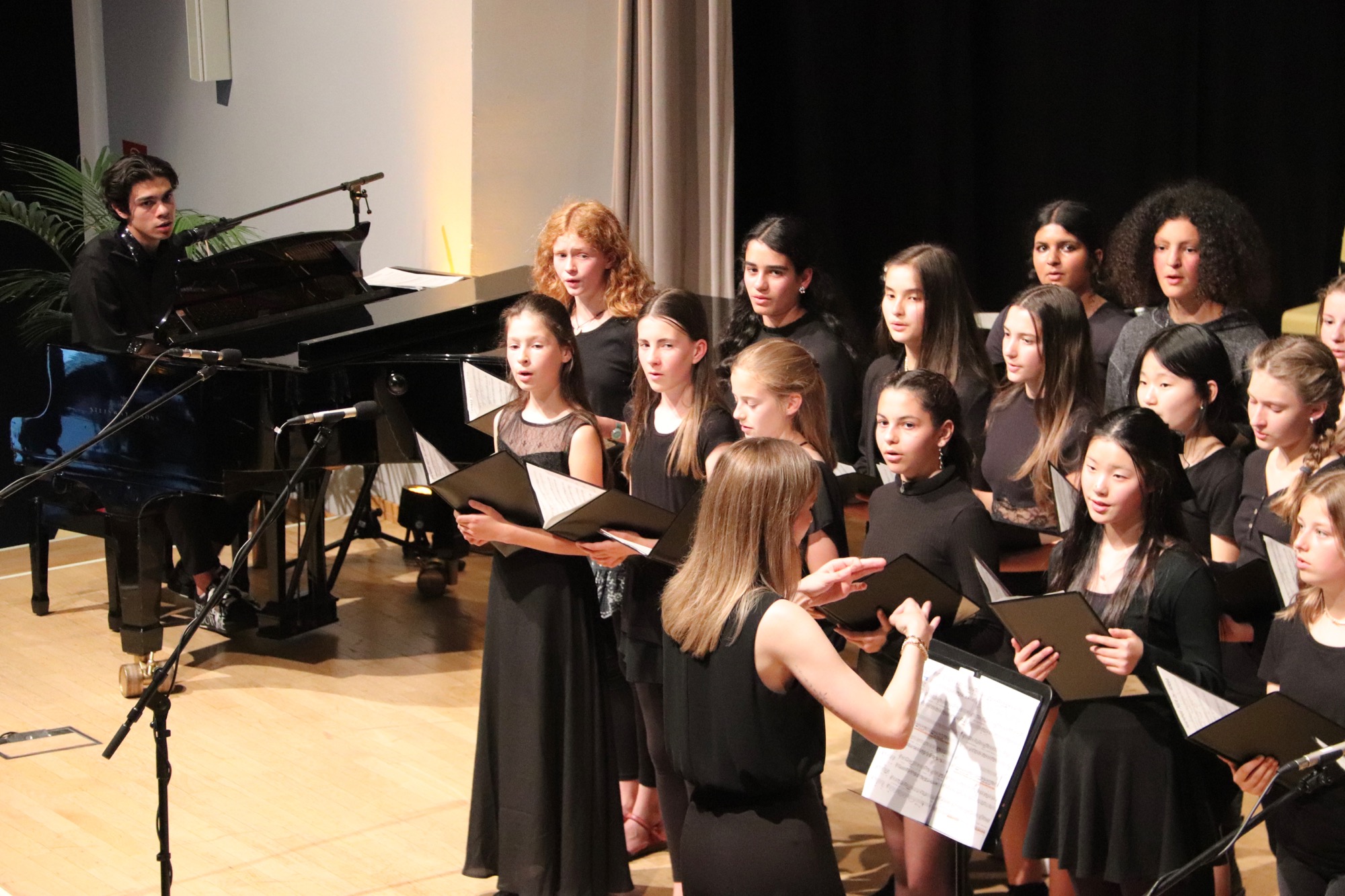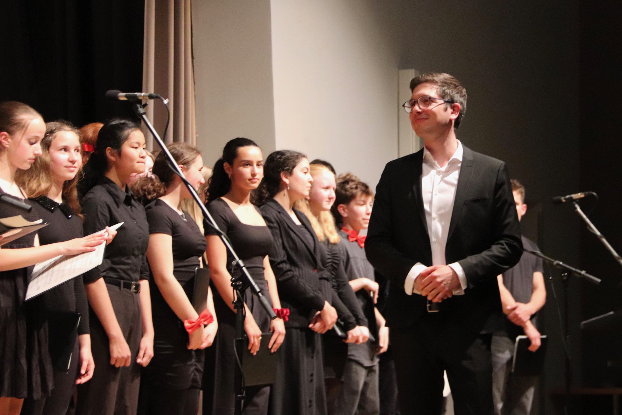 Der kleine Chor brachte auf mitreißende Art den Hit „Count on Me“ von Bruno Mars, den Rock-Klassiker „Another Brick in the Wall“ von Pink Floyd, den frechen Song „Junge“ der deutschen Band Die Ärzte – bei dem der Text von den Chor-Mitgliedern an moderne Zusammenhänge angepasst worden war – und den Evergreen „Country Roads“ von John Denver zu Gehör. Die Leitung hatte Frau Büttner inne, am Flügel begleitete Lucio Ramírez del Prado Vetter (Q2).
