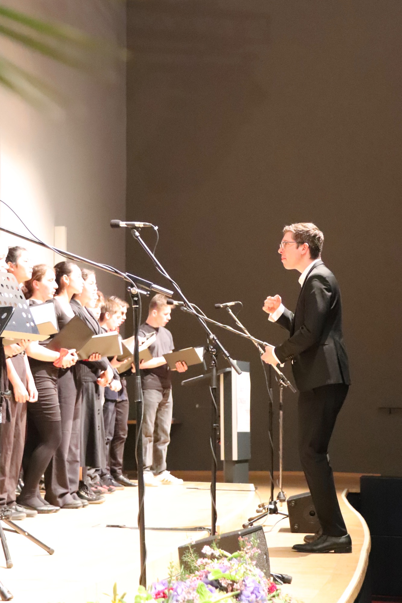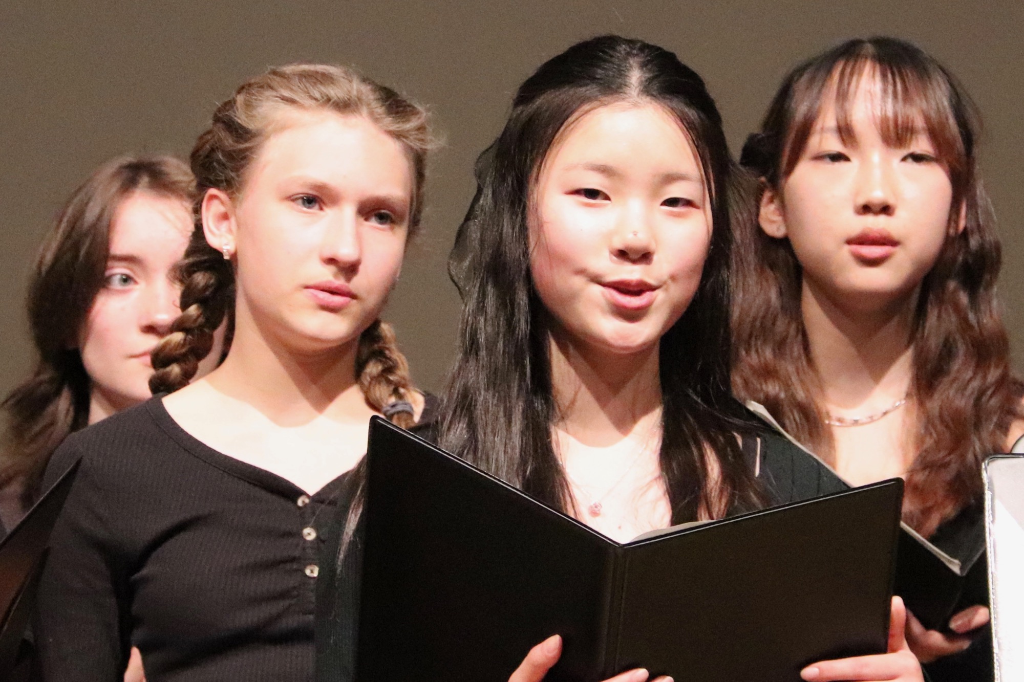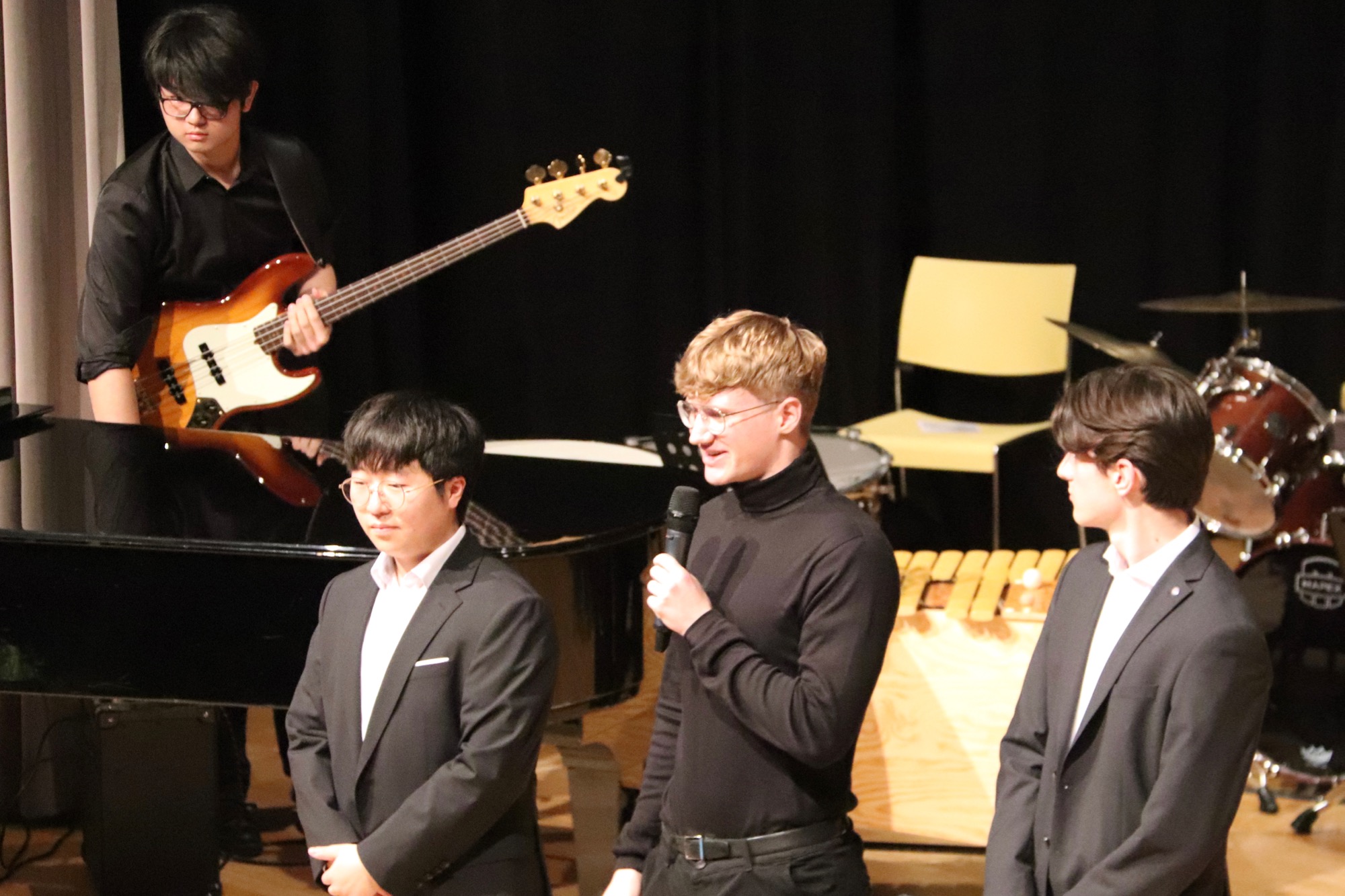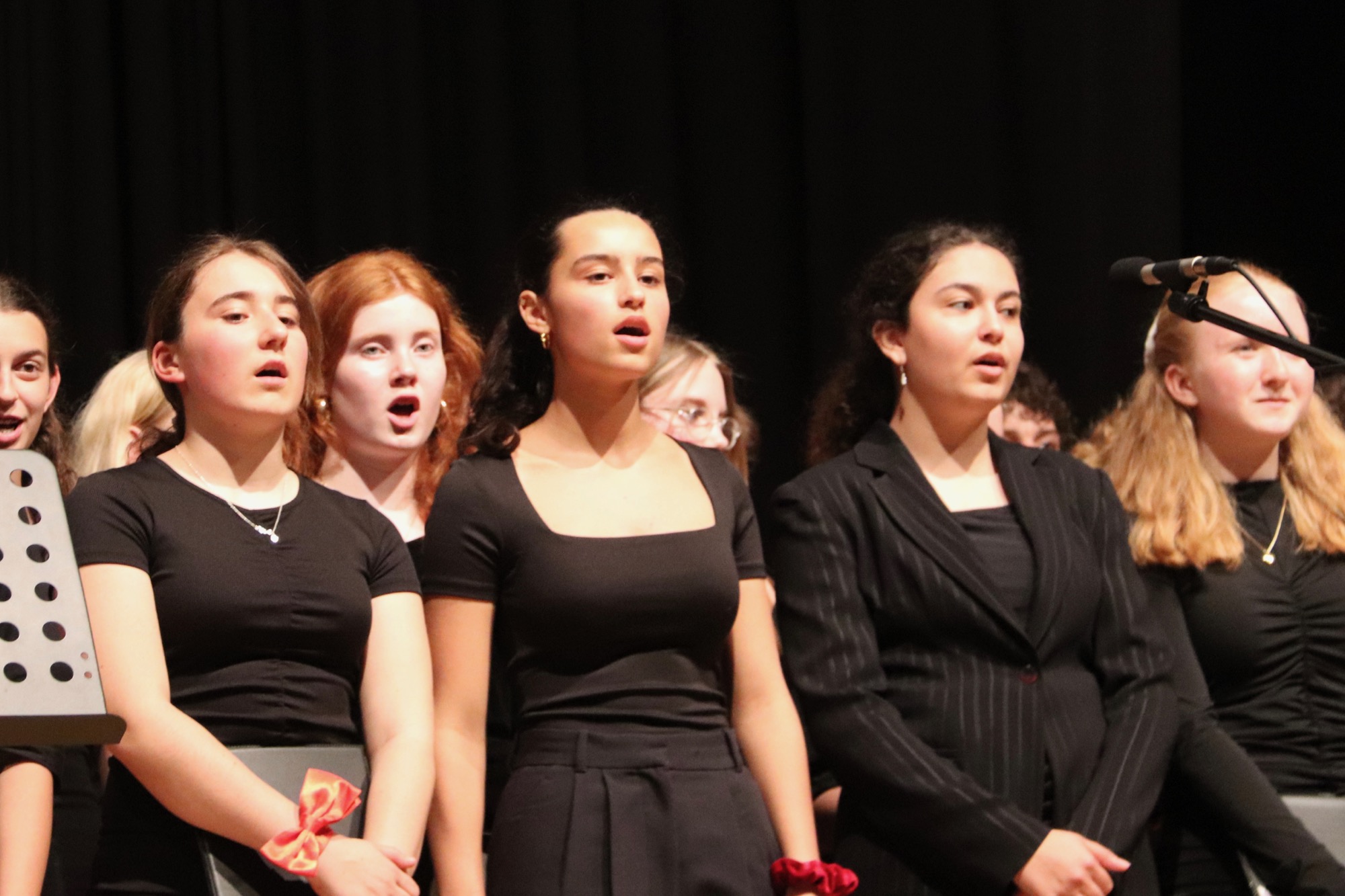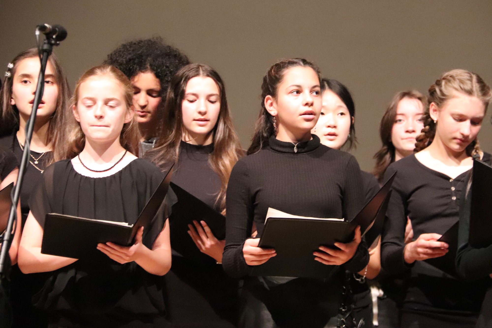 Der kleine Chor brachte auf mitreißende Art den Hit „Count on Me“ von Bruno Mars, den Rock-Klassiker „Another Brick in the Wall“ von Pink Floyd, den frechen Song „Junge“ der deutschen Band Die Ärzte – bei dem der Text von den Chor-Mitgliedern an moderne Zusammenhänge angepasst worden war – und den Evergreen „Country Roads“ von John Denver zu Gehör. Die Leitung hatte Frau Büttner inne, am Flügel begleitete Lucio Ramírez del Prado Vetter (Q2).
