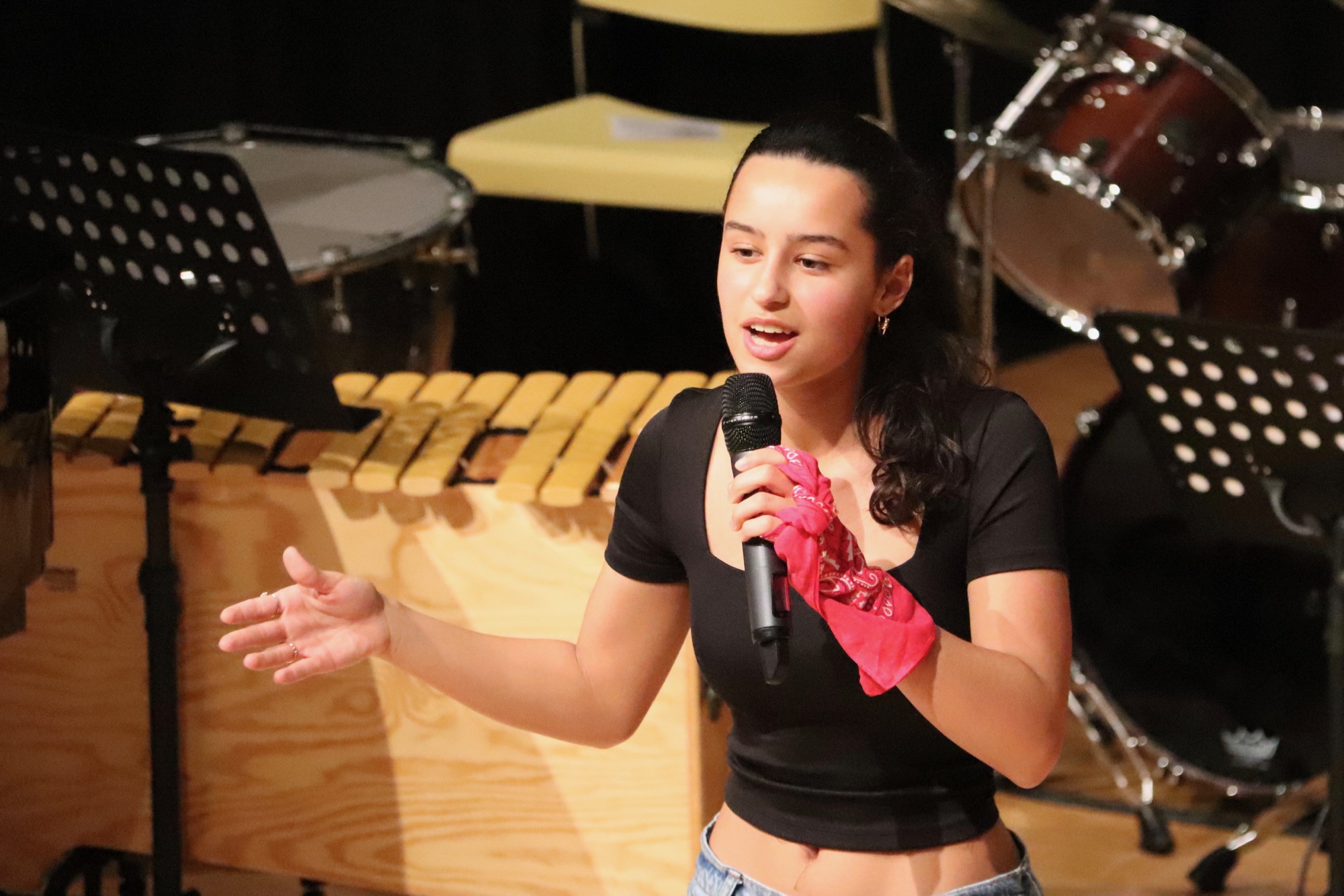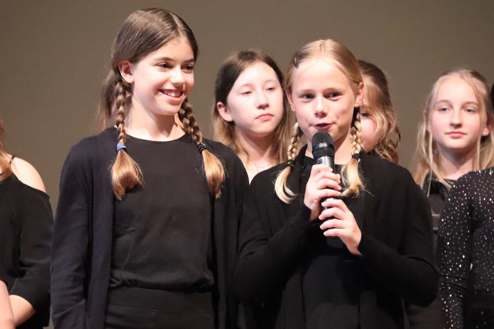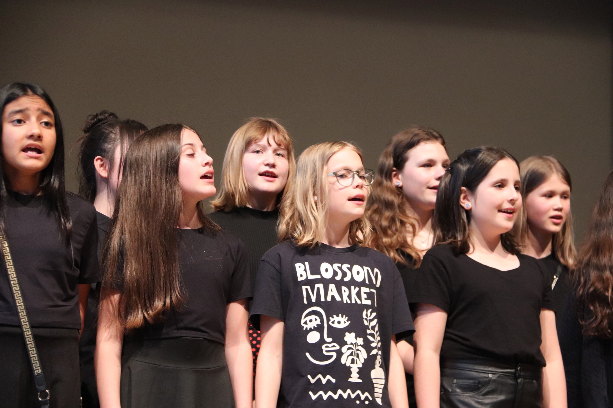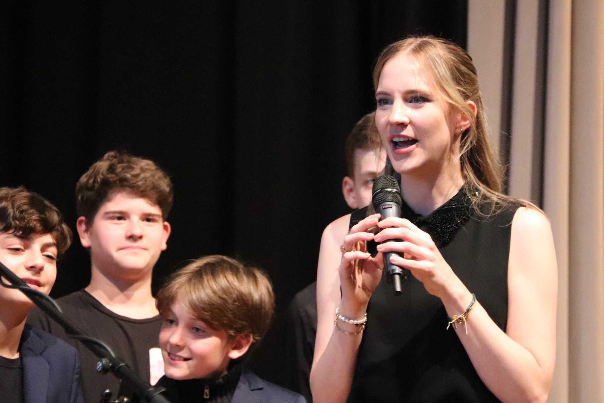 Die Gesangsgruppe der Klasse 5 brachte den Saal mit „Lemon Tree“ der deutschen Band Fools Garden zum Mitwippen, stimmte anschließend das Volkslied „Die Gedanken sind frei“ an und überraschte dann mit passender Kostümierung bei der Interpretation des Prinzen-Hits „Alles nur geklaut“, bei dem sogar massenweise Geldscheine durch die Luft flogen. Geleitet wurde die Gesangsgruppe von Frau Büttner, am Flügel begleitete Lucio Ramírez del Prado Vetter (Q2) – ebenso wie bei der Gesangsgruppe der Klasse 6. Die fortgeschrittenen Gesangstalente brachten „Für immer Frühling“ von Soffie, „Imagine“ von John Lennon und den Evergreen „California Dreamin’“ von The Mamas and the Papas zum Vortrag. Und die Mamas, Papas, Freunde, Großeltern und Lehrkräfte waren begeistert, was sie mit einem donnernden Applaus zum Ausdruck brachten.